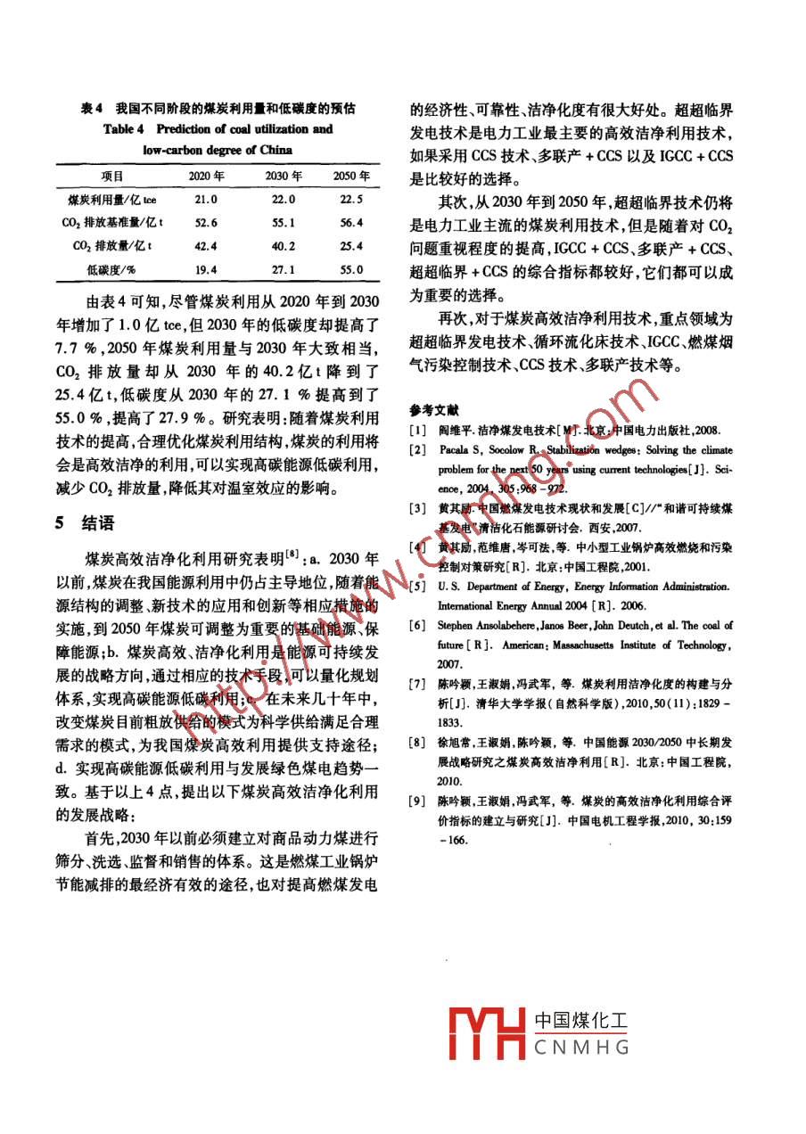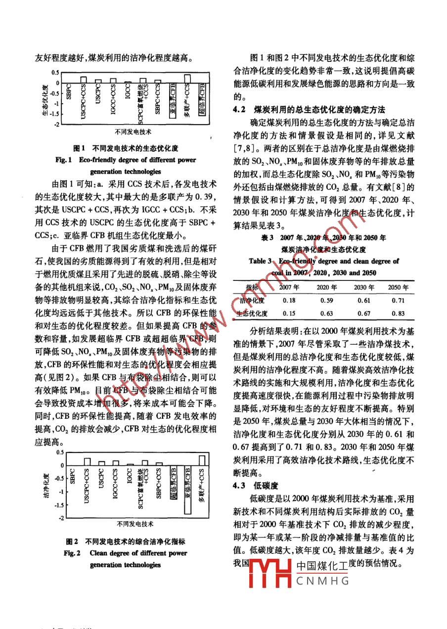煤炭高效潔凈化利用的研究陳吟穎,王淑娟,陳昌和,徐旭常(清華大學(xué)熱能系熱科學(xué)與動(dòng)力工程教育部重點(diǎn)實(shí)驗(yàn)室,北京10084)[摘要]通過(guò)分析我國(guó) 目前煤炭利用的主要方式和存在的問(wèn)題,分析對(duì)比國(guó)內(nèi)外煤炭高效潔凈化利用技術(shù),研究高效潔凈化利用技術(shù)對(duì)環(huán)境的影響程度,建立了煤炭高效潔凈化利用指標(biāo)體系,給出了評(píng)價(jià)煤炭高效潔凈化利用程度的潔凈化度、生態(tài)優(yōu)化度、低碳度的概念并作出了相應(yīng)的定量判據(jù),最后提出了我國(guó)2030年、2050年煤炭高效潔凈化利用的有效途徑和發(fā)展戰(zhàn)略。[關(guān)鍵詞]潔凈煤發(fā)電 ;潔凈化度;能源可持續(xù)發(fā)展綜合指標(biāo);生態(tài)優(yōu)化度;低碳度[中圖分類號(hào)] X38 [文獻(xiàn)標(biāo)識(shí)碼] A [文章編號(hào)] 1009 - 1742(2011)06 -0051 -06.中的主導(dǎo)地位不會(huì)改變)。2009年,能源消費(fèi)總量約1前言為31億tce ,煤炭生產(chǎn)總量為29.65億t,發(fā)電與熱電聯(lián)隨著我國(guó)經(jīng)濟(jì)的持續(xù)快速發(fā)展,環(huán)境保護(hù)和資源產(chǎn)用煤總量約為15.47億t。的壓力日益增大,且已成為我國(guó)經(jīng)濟(jì)發(fā)展的兩大瓶頸。煤炭利用的主要方式有:工業(yè)鍋爐、發(fā)電和煤化燃煤發(fā)電廠逐年增加,截至2010年年底,全國(guó)發(fā)電裝機(jī)工。其中,發(fā)電用煤占煤炭總產(chǎn)量的50 %以上。煤容量達(dá)9.62億kW ,其中有7. 1億kW為火電機(jī)組,火炭利用存在的問(wèn)題有兩方面:- -是效率太低,二是污電裝機(jī)的增長(zhǎng)帶動(dòng)煤炭需求不斷增長(zhǎng)。隨著時(shí)間的推染嚴(yán)重。下面將根據(jù)煤炭利用的不同方式分別論移,超超臨界機(jī)組、整體煤氣化聯(lián)合循環(huán)( integrated述。gasification combined cycle ,IGCC)等先進(jìn)的發(fā)電技術(shù)機(jī)2.1我國(guó)燃煤電站鍋爐目 前存在的主要問(wèn)題組會(huì)逐漸實(shí)現(xiàn)商業(yè)化和規(guī)?;?。這些高參數(shù)、大容量、目前我國(guó)火電廠煤粉鍋爐燃燒主要存在鍋爐燃高自動(dòng)化機(jī)組的使用,會(huì)不斷提高煤炭的利用率,同時(shí)燒不穩(wěn)定 、爐膛結(jié)渣、發(fā)電效率低和環(huán)境污染等問(wèn)也會(huì)不斷增加煤炭的利用量,隨之產(chǎn)生的CO2等溫室題。 特別是燃煤火力發(fā)電裝置排放的污染物對(duì)人類效應(yīng)氣體以及SO2和NO,等污染物排放也會(huì)相應(yīng)增生存環(huán)境及全球環(huán)境構(gòu)成了直接的危害。如現(xiàn)在廣加[2]。因此,深人研究我國(guó)煤炭高效潔凈化利用,開(kāi)泛裝備的靜電除塵設(shè)備均難以除去燃煤排煙中超發(fā)高效、潔凈的燃煤發(fā)電技術(shù),是實(shí)現(xiàn)電力工業(yè)持續(xù)健細(xì)、超輕并易分散的粉塵(5 μm以下)。這種粉塵康快速發(fā)展的必然途徑。隨風(fēng)飄蕩,可以長(zhǎng)期滯留在大氣中,對(duì)人身體存在的2目前煤炭利用的主要方 式及存在的問(wèn)題潛在危害極大。近年來(lái),還發(fā)現(xiàn)微小粉塵攜帶的痕量重金屬等有害化合物(譬如汞、砷、氟等)對(duì)環(huán)境我國(guó)煤炭資源總量約為5.6萬(wàn)億t,其中已探明儲(chǔ)的影響也很大。我國(guó)CO2排放量日漸增加,與燃煤量為1萬(wàn)億t,占世界總儲(chǔ)量的11 %。2008 年煤炭在有 關(guān)的區(qū)域性環(huán)境污染和全球性的氣候變化問(wèn)題已我國(guó)- -次能源生產(chǎn)和消費(fèi)結(jié)構(gòu)中的比例分別為76 %成為我國(guó)電力工業(yè)發(fā)展的一個(gè)主要制約因素。和69 %。今后30 ~50年內(nèi),煤炭在我國(guó)一次能源構(gòu)成隨著電力工業(yè)的不斷發(fā)展,燃煤發(fā)電裝機(jī)容量[收稿日期] 2011-04-01中國(guó)煤化工[基金項(xiàng)目]中國(guó)工程院重點(diǎn)咨詢項(xiàng)目支持[作者簡(jiǎn)介]陳吟穎(1972-) ,女,內(nèi)蒙古烏蘭察布市人,高級(jí)工程師,主要研究方,MYCH.CNMHG發(fā)與利用:E - mail:cyy01016@ 126. com2011年第13卷第6期51增長(zhǎng)迅速,大容量高參數(shù)、高自動(dòng)化機(jī)組增加,對(duì)能業(yè)鍋爐轉(zhuǎn)換效率不高,能量梯級(jí)利用程度不高。源的需求增加迅速,環(huán)境污染嚴(yán)重。據(jù)國(guó)家發(fā)展和目前我國(guó)動(dòng)力用煤篩分、洗選率很低,加工回收改革委員會(huì)能源局2008年統(tǒng)計(jì)資料顯示,我國(guó)優(yōu)質(zhì)率低,人選率不足30 % ,遠(yuǎn)遠(yuǎn)落后于歐美先進(jìn)國(guó)家,資源8漸減少和短缺,煤炭剩余儲(chǔ)量的保證程度不造成大量無(wú)效運(yùn)輸(原煤中含矸量平均為20 %左足100年;石油剩余儲(chǔ)量的保證程度不足15年;天右) ,浪費(fèi)運(yùn)力。我國(guó)燃煤工業(yè)鍋爐熱效率低下、污然氣剩余儲(chǔ)量的保證程度不足30年。若按照2020染嚴(yán)重的原因主要不是由于工業(yè)鍋爐不先進(jìn),而是年我國(guó)的能源需求預(yù)測(cè)量估算,煤炭、石油和天然氣不應(yīng)該燒高灰原煤[41。燃用篩分、洗選煤可明顯減的資源保證程度則分別下降為30年、5年和10年。少大氣中的可吸人顆粒物、SO2和汞等有毒物。硫、這樣的需求總量,將使中國(guó)的能源安全和能源資源汞等大部分存在矸石中,洗煤能去除1/3~1/4,并供應(yīng)面臨嚴(yán)峻的挑戰(zhàn),發(fā)展?jié