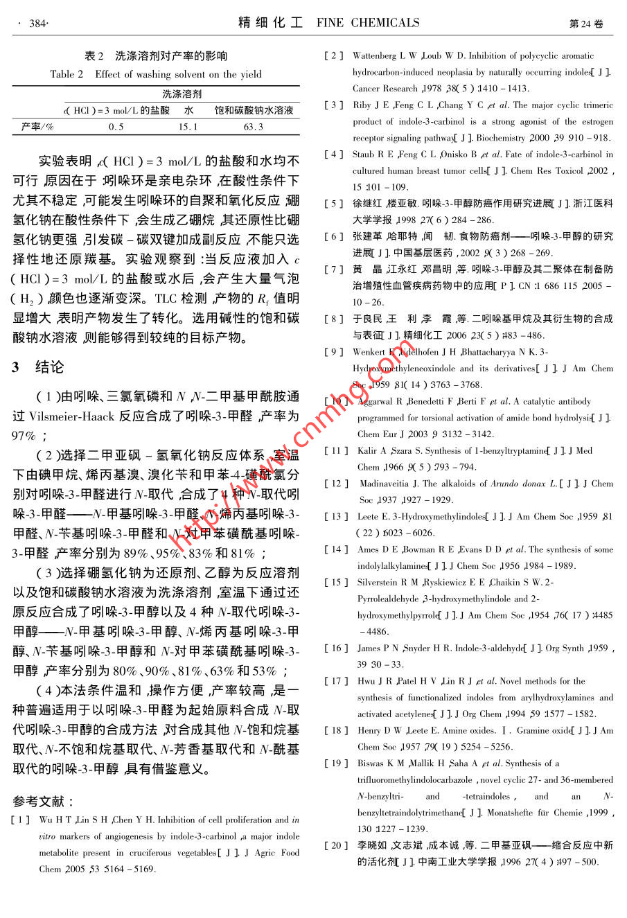 第24卷第4期精細(xì)化工Vol.24 ,No. 4.2007年4月FINE CHEMICALS .Apr. 2007N-取代吲哚-3-甲醇的合成周佳棟,曹飛*李振江安肖韋萍(南京工業(yè)大學(xué)制藥與生命科學(xué)學(xué)院江蘇南京210009 )摘要首先由吲哚、三氯氧磷和N ,N-二甲基甲酰胺通過Vilsmeier-Haack反應(yīng)合成吲哚-3-甲醛產(chǎn)率為97%進(jìn)而選擇二甲亞砜-氫氧化鈉反應(yīng)體系室溫下由碘甲烷、烯丙基溴、溴化芐和甲苯4~磺酰氯分別對(duì)吲哚-3-甲醛進(jìn)行N_取代合成4種N-取代吲哚3~甲醛一N 甲基吲哚~3-甲醛、N烯丙基吲哚3-甲醛、N-芐基吲哚3-甲醛和N_對(duì)甲苯磺?;胚?3-甲醛產(chǎn)率分別為89%, 95%、83%和81% ;最后選擇硼氫化鈉為還原劑室溫下通過還原反應(yīng)合成吲哚-3-甲醇以及4種N_取代吲哚-3-甲醇一N- 甲基吲哚3~甲醇N~烯丙基吲哚3~甲醇、N_芐基吲哚3-甲醇和N-對(duì)甲苯磺酰基吲哚-3~甲醇產(chǎn)率分別為80%、90%、81%、63%和53%。中間產(chǎn)物及終產(chǎn)物的結(jié)構(gòu)經(jīng)由' HMR、IR和元素分析證實(shí)。關(guān)鍵詞吲哚-3-甲醇吲哚3-甲醛;Vilsmeier Haack反應(yīng)棚氫化鈉中圖分類號(hào):0629. 36文獻(xiàn)標(biāo)識(shí)碼:A文章編號(hào):1003 - 5214( 2007 )04 -0380 -05Synthesis of N-Substituted Indole-3-carbinolsZHOU Jia-dong CAO Fei* LI Zhen-jiang AN Xiao ,WEI Ping( College of Life Science and Phrmaceutical Engineering Nanjing University of Technology ,Nanjing 210009 ,Jiangsu China )Abstract :F irstly ,indole-3 -carboxaldehyde was synthesized in 97% yield from indole by Vilsmeier-Haack reaction with phosphorus oxychloride and N ,N-dimethylformamide. Then it reacted separatelywith iodomethane , allyl bromide , benzyl bromide and toluene-4-sulfonyl chloride in dimethylsulphoxide-sodium hydroxide at room temperature to give N-methylindole-3 -carboxaldehyde , N-allylindole-3-carboxaldehyde ,N-benzylindole-3 -carboxaldehyde and N-tosylindole-3-carboxaldehyde inyields of 89% ,95% ,83% and 81% respectively. Finally , indole-3 -carboxaldehyde and four N-substituted indole-3 -carboxaldehyde were reduced at room temperature with sodium borohydride to giveindole-3-carbinol ,N-methylindole-3 -carbinol ,N-allylindole-3-carbinol ,N-benzylindole-3 -carbinol andN-tosylindole-3-carbinol in yields of 80% ,90% ,81% ,63% and 53% respectively. Structures olintermediate products and final products were characterized by' HNMR ,IR spectra and elementaryanalysis.Key words :indole-3 -carbinol ,indole 3 -carboxaldehyde ;V ilsmeier-Haack reaction sodium borohydrideFoundation item :National basic research program of China( 973 program X No.2003CB7160004 )吲哚-3-甲醇( indole-3-carbinol ,I3C )是十字花環(huán)芳烴誘導(dǎo)的大鼠腫瘤以來人們通過不同的動(dòng)物科蔬菜中的主要抗癌活性成分1。自1978年試驗(yàn)研究證實(shí)了吲哚-3-甲醇及其衍生物對(duì)由化學(xué)Wattenberg等2]首次報(bào)道了吲哚-3-甲醇可以抑制多物質(zhì)誘導(dǎo)的或自發(fā)形成的乳腺癌、子宮內(nèi)膜癌、甲狀*收稿日期2006 -09- 16定用日期2006 -12 -08基金項(xiàng)目國(guó)家重點(diǎn)基礎(chǔ)研究發(fā)展計(jì)戈劃973計(jì)劃)資助項(xiàng)目( No. 2003CB7160004 )作者簡(jiǎn)介周佳棟( 1981 - )男江蘇無錫人博士研究生師從韋萍教授和曹飛副教授主要從事有機(jī)合成和酶工程方面的研究電話:025 - 83587699 E - mail swrzjd@ 126. com。.聯(lián)系人:曹飛1975- )男河南洛陽(yáng)人副教授博士主要從事生物化工方面的研究電話025 - 83587699 E - mail xesaofeiw @ eyou.com。第4期周佳棟等:N-取代吲哚-3-甲醇的合成381.腺癌、結(jié)腸癌、胰腺癌和肝癌等癌癥具有抑制作帶來很大不便。用3-8。由于吲哚-3-甲醇來源于食物幾乎無副怍作者首先由吲哚、三氯氧磷和NN-二甲基甲酰用,又具有多方面的抗癌活性,因而具有極大的發(fā)展胺通過Vilsmeier-Haack反應(yīng)合成吲哚-3-甲醛進(jìn)而前途,可望成為新一代食物防癌劑而廣泛應(yīng)用[6],選擇二甲亞砜-氫氧化鈉反應(yīng)體系二甲亞砜作為作為食品添加劑吲哚-3_甲醇已經(jīng)通過了美國(guó)FDA強(qiáng)極性非質(zhì)子偶極型溶劑,能夠有效加快親核取代認(rèn)證7。同時(shí),以吲哚-3_甲醇為母核進(jìn)行結(jié)構(gòu)改的反應(yīng)速率,從而使N_取代反應(yīng)在常溫下即可順利造引入一些不同的取代基團(tuán)有望尋求到療效更高進(jìn)行,由碘甲烷、烯丙基溴、溴化芐和甲苯4-磺酰氯的化學(xué)抗癌劑61。分別對(duì)吲哚-3-甲醛進(jìn)行N-取代合成了4種IN-取代文獻(xiàn)報(bào)道的合成N-取代吲哚-3_甲醇的方法大吲哚-3-甲醛一-N-甲 基吲哚-3-甲醛、N_烯丙基吲都以吲哚-3-甲醛為起始原料,在不同的反應(yīng)體系哚-3-甲醛、N-_芐基吲哚3-甲醛和N_對(duì)甲苯磺?;?氮?dú)獗Wo(hù)下的叔丁醇-鉀體系9]、氬氣保護(hù)下的吲哚-3-甲醛最后選擇硼氫化鈉為還原劑同樣在四氫呋喃-氫化鈉體系0]或二甲基甲酰胺-碳酸室溫下,即可完成還原反應(yīng)合成吲哚-3-甲醇,以及4鉀體系["]等)中與N_取代試劑反應(yīng),通過劇烈攪種N-取代吲哚-3-甲醇一-N-甲 基吲哚-3-甲醇、N-拌、加熱回流得到N-取代吲哚-3~甲醛進(jìn)而通過不烯丙基吲哚-3-甲醇、N-芐基吲哚-3-甲醇和N-對(duì)甲同的還原劑氫氣21、氫化鋰鋁[13]、硼氫化鋰14]或苯磺?;胚?3-甲醇。中間產(chǎn)物及終產(chǎn)物的結(jié)構(gòu)硼氫化鈉13.5]等)加熱或常溫還原N-取代吲哚3-經(jīng)由'HNMR、IR和元素分析證實(shí)。具體合成路線如甲醛得到N-取代吲哚-3-甲醇。.上 述合成方法的不圖1所示。足之處在于:反