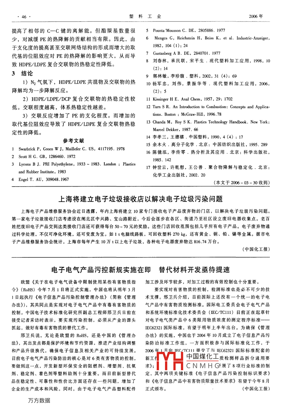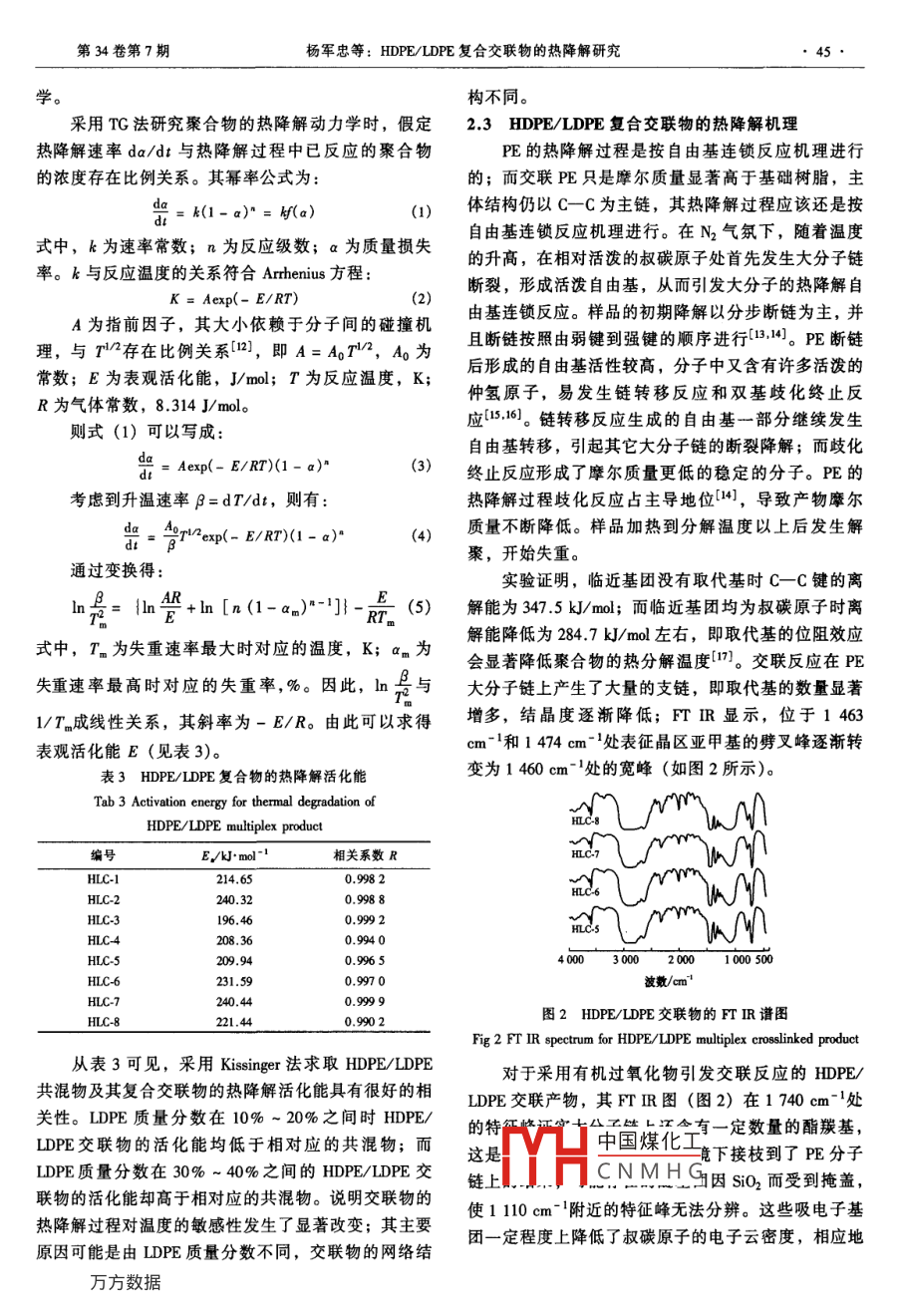 第34卷第7期塑料工業(yè)2006年7月CHINA PLASTICS INDUSTRY43HDPE/LDPE復合交聯(lián)物的熱降解研究楊軍忠,劉偉,景振華,王軍2,王延偉2(1.石油化工科學研究院,北京100863;2.中國石化洛陽分公司,河南洛陽471012)摘要:采用熱重分析儀(TG)考察了高密度聚乙烯(HDE)/低密度聚乙烯(LDPE)復合交聯(lián)物的熱穩(wěn)定性。結(jié)果顯示,HDE/IDPE復合交聯(lián)物的熱穩(wěn)定性低于HDPE/①DPE共混物。rTIR分析證實,交聯(lián)反應使聚乙烯(PE)的支化程度提高,取代基的位阻效應在一定程度上影響了PE的熱降解過程。在N2氣氛下, HDPE/LDPE共混物及交聯(lián)物的熱降解過程均為一步降解反應。 Kissinger法求解HPE/DPE共混物及其復合交聯(lián)物的熱降解活化能發(fā)現(xiàn),LDPE質(zhì)量分數(shù)在20%~30%之間變化時,HDPE/LDPE交聯(lián)物的熱降解過程對溫度的敏感性發(fā)生了突變。關鍵詞:高密度聚乙烯;低密度聚乙烯;復合交聯(lián)物;熱降解中圖分類號:TQ325.1+2文獻標識碼:A文章編號:1005-5770(2006)07-0043-04Study on Thermal Degradation of HDPE/LDPE Crosslinked ProductYANG Jun-zhong, LIU Wei, JING Zhen-hua', WANG Jun, WANG Yan-wei(1. Research Institute of Petrochemical Sci. Beijing 100083, China2. Luoyang Subsidiary Company, SINOPEC, Luoyang 471012, China)Abstract: The thermal stability of HDPE/LDPE crosslinked product was studied by means of thermogravimetrnalysis(TGA). The results showed that the thermal stability of HDPE/LDPE crosslinked product was poorer thanthat of HDPE/LDPE blend. The result of FTIR analysis informed that the branch concentration of the crosslinked PEwas increased significantly by crosslinking reaction, their substituted alkyl groups would subsequently effect thewhole degradation of the crosslinked PE. Furthermore, it was found that the thermal degradation reactions forHDPE/LDPE blend and HDPE/LDPE crosslinked products were much more similar and both belong to one-stepmechanism. It was also noticed that the sensitivity to temperature for the thermal stability of HDPE/LDPEcrosslinked products was changed sharply while the amounts of LDPE changed from 20% to 30% in calculating theactivated energy of the blend in thermal degradation by means of Kissinger methodKeywords: HDPE; LDPE; Multiplex Crosslinked Product; Thermal Degradation自從聚乙烯(PE)工業(yè)化以來,研究人員圍繞過選擇合適的原料配比和合適的交聯(lián)工藝可以獲得微各種牌號PE進行了大量的改性研究和應用開發(fā)。尤觀結(jié)構(gòu)相對完善的網(wǎng)絡交聯(lián)結(jié)構(gòu)0。為全面掌握這其在交聯(lián)PE領域,相繼開發(fā)出了硅烷交聯(lián)工藝121、類交聯(lián)物的性能,本文采用熱重分析儀(TGA)和紅過氧化物交聯(lián)工藝、輻射交聯(lián)工藝3等。由于不需要外分析儀(FTR)研究HDPE/LDPE復合交聯(lián)物的熱特殊且昂貴的加工設施,有機過氧化物交聯(lián)工藝備受降解特性和熱降解動力學,并對HDE復合交聯(lián)物的重視,典型的過氧化物交聯(lián)工藝有 Engel法4]、Poun-熱降解機理進行分析。a' Mousson法、超高頻交聯(lián)技術6以及德國cus-1實驗部分tavsberg公司的Az法。國內(nèi)在有機過氧化物交聯(lián)1.1原料PE方面也開展了一系列研究8。筆者在研究高密度HDPE:5000S,齊魯石化公司;LDPE:TN26,齊聚乙烯(HDPE)交聯(lián)物的制備過程中發(fā)現(xiàn),在魯石化公司;引發(fā)劑:DCP,上海高橋石化公司;氣HDPE/DCP交聯(lián)體系中加入低密度聚乙烯(LDPE),相法中國煤化工可以改善HDPE的交聯(lián)過程和交聯(lián)物的微觀結(jié)構(gòu),通1.2HHaCNMHG聯(lián)系人010-82368254,liuwei4258cn@sina.com作者簡介:楊軍忠,男,高級工程師,博士研究生,主要從事聚烯烴改性研究。44塑料工業(yè)2006年1.2.1實驗方案紅外分析:將各種HDPE/LDPE復合物在壓膜機HDPE/IDPE復合物的配比見表1。其中,HC1上熱壓成薄膜,采用美國PE公司的PE200紅外分析HLC4為共混物,無交聯(lián)劑,而HC5~HLC8加儀測定。人了一定比例的交聯(lián)劑DCP。2結(jié)果討論表1HDPE/LDPE復合物配比(質(zhì)量比)及其凝膠質(zhì)量分數(shù)2,1HDPE/LDPE復合物的熱穩(wěn)定性Tab l Prescriptions of HDPE/LDPE multiplex products從表1可以看出,隨LDPE質(zhì)量分數(shù)的增加and their gel contentHDPE/LDPE/DCP交聯(lián)物凝膠的質(zhì)量分數(shù)增加。這可號HDPE LDPECPSi02凝膠質(zhì)量分數(shù)/%能是由于DPE中含有較多的支鏈,更有利于交聯(lián)的HLC-1HIC28020HLC370300000發(fā)生。圖1為HDPE/LDPE復合物在300~550℃之間以C4604010℃/min的速度升溫時的熱失重和熱失重微分曲線。HLC-5 90HLC-6 80200.31從圖1可以看出,N2氣氛下,樣品的熱失重微分曲HLC-7 700.342,19線均為單峰,說明HDPE/LDPE共混物及交聯(lián)物的熱HLC-80.3降解過程均為一步降解反應;但交聯(lián)物的熱穩(wěn)定性低1.2.2HDPE/DPE復合物的制備于其對應的共混物。HDPE/IDPE復合物的典型熱穩(wěn)各組分經(jīng)SH10型高速混合機混合后,在SUF.定性參數(shù)見表2。35B型雙螺桿擠出機中混煉、水環(huán)切粒,溫度控制范圍170~220℃。13性能測試與分析交聯(lián)度:取一定量擠出切粒樣品W1,裝入銅網(wǎng)中用二甲苯在索氏抽提器中抽提、真空干燥至恒重20HC1HLC-SW2,交聯(lián)度按下式計算:C=(W2/W1)×100%。熱失重分析(TG):采用美國TA公司的TGADTA1500熱重-差熱聯(lián)用儀對各復合物進行熱失重分析,N2流量40mL/min,升溫速率分別為5、10、圖1HDPE/LDPE復合物的熱失重和熱失重微分曲線Fig 1 Thermal degradation curves and differential20、40℃/min,實驗溫度為室溫至60℃。hermal degradation for HDPE multiplex pro