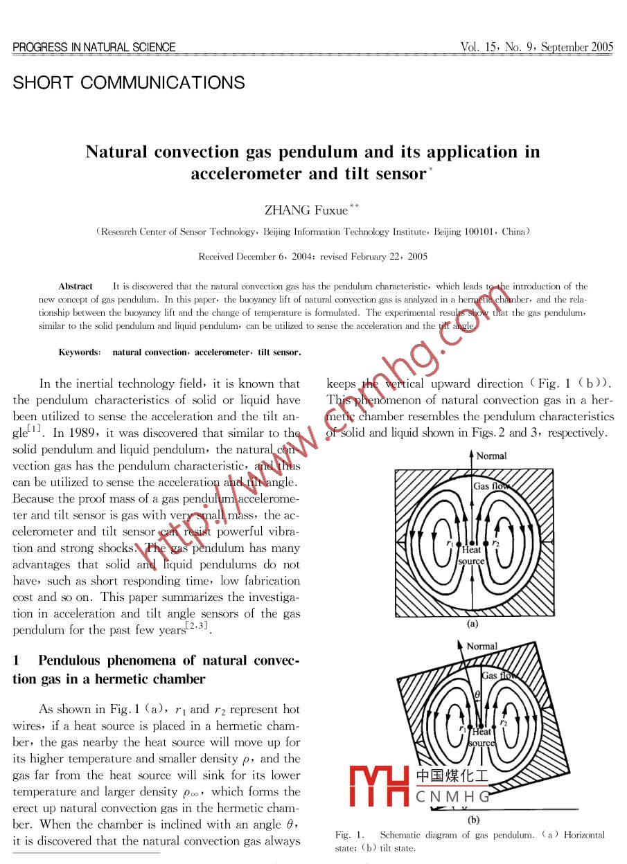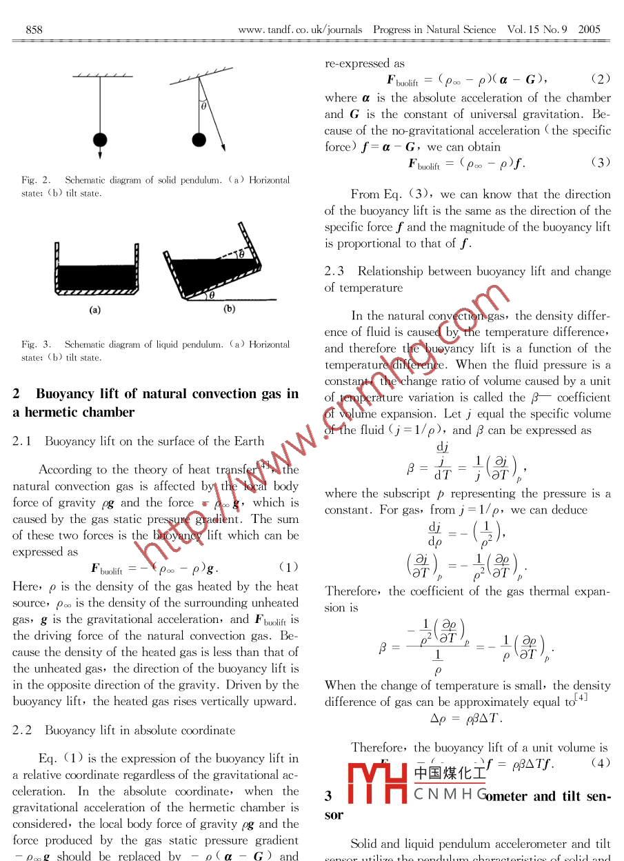 PROGRESS IN NATURAL SCIENCEVol. 15, No 9, September 2005SHORT COMMUNICATIONSNatural convection gas pendulum and its application inaccelerometer and tilt sensorZHANG FuxUeResearch Center of Sensor Technology, Beijing Information Technology Institute, Beijing 100101, China)Received December 6, 2004: revised February 22, 200Abstract It is discovered that the natural convection gas has the peharacteristic, which leads to the introduction of theew concept of gas pendulum. In this paper, the buoyancy lift of naturalon gas is analyzed in a hermetic chamber, and the relaonship between the buoyancy lift and the change of temperature is formulated. The experimental results show that the gas pendulummilar to the solid pendulum and liquid pendulum, can be utilized to sense the acceleration and the tilt angleKeywords: natural convection, accelerometer, tilt sensor.In the inertial technology fieldknown that keeps the vertical upward direction Fig. 1 (b))the pendulum characteristics of solid or liquid have This phenomenon of natural convection gas in a her-been utilized to sense the acceleration and the tilt an- metic chamber resembles the pendulum characteristicsgle. In 1989, it was discovered that similar to the of solid and liquid shown in Figs. 2 and 3, respectivelysolid pendulum and liquid pendulum, the natural con-vection gas has the pendulum characteristic, and thuscan be utilized to sense the acceleration and tilt angleBecause the proof mass of a gas pendulum accelerome-ter and tilt sensor is gas with very small mass, the aclerometer and tilt sensor can resist powerful vibration and strong shocks. The gas pendulum has maradvantages that solid and liquid penduluhave, such as short responding time, low fabricationcost and so on. This paper summarizes the investiga-tion in acceleration and tilt angle sensors of the gasndulum for the past few vears[2,33Pendulous phenomena of natural convection gas in a hermetic chamberAs shown in Fig. 1(a), ri and r2 represent hotwires,if a heat source is placed in a hermetic chamber, the gas nearby the heat source will move up forits higher temperature and smaller density p, and thegas far from the heat source will sink for its lower中國煤化工temperature and larger density poo, which forms theCNMHGerect up natural convection gas in the hermetic chaber. When the chamber is inclined with an angle e(bit is discovered that the natural convection gas alwaysFig. 1. Schematic diagram of gas pendulum. a)Horizontal(b) tiltEP=據(jù)Natural Science Foon of China( grant No. 60272001)(a263. netwww.tandf.co.uk/journalsProgressinNaturalScienceVol.15No.92005re-expressed asFbMt=(p∞-p)(a-G),(2)where a is the absolute acceleration of the chamberand G is the constant of universal gravitation. Because of the no-gravitational acceleration (the specificforce)f=a-G, we can obtainF1(3)Fig. 2. Schematic diagram of solid pendulum. (a)Horizontstate:(b) tilt stateFrom Eg.(3), we can know that the directionof the buoyancy lift is the same as the direction of thespecific force f and the magnitude of the buoyancy liftis proportional to that of f2.3 Relationship between buoyancy lift and changeof temperature(b)In the natural convection gas, the density difference of fluid is caused by the temperature differenceF1hematic diagram of liquid pendulum. ( a)Horizontalstate:(b) tilt stateand therefore the buoyancy lift is a function of thetemperature difference. When the fluid pressure is aconstant, the change ratio of volume caused by a unit2 Buoyancy lift of natural convection gas in of temperature variation is called the B-coefficienta hermetic chamberof volume expansion. Let j equal the specific volumeof the fluid (j=1/p), and B can be expressed as2. 1 Buoyancy lift on the surface of the EarthAccording to the theory of heat transfer 4,thenatural convection gas is affected by the local bodyforce of gravity pg and the force- poog, which iswhere the subscript p representing the pressure is acaused by the gas static pressure gradient. The sumonstant. For gas, from j=1/p, we can deduceof these two forces is the buoyancy lift which can beexpre(p∞-p)gHere,p is the density of the gas heated by the heat Therefore, the coefficient of the gas thermal expan-source,Poo is the density of the surrounding unheatedgas, g is the gravitational acceleration, and Fbuoliftthe driving force of the natural convection gas. Be-1(9cause the density of the heated gas is less than that ofthe unheated gas, the direction of the buoyancy liftin the opposite direction of the gravity. Driven by the When the change of temperature is small, the densitybuoyancy lift, the heated gas rises vertically upward. difference of gas can be approximately equal to 4J△p=p3△T2.2 Buoyancy lift in absolute coordinateTherefore, the buoyancy lift of a unit volume isg. (1) is the expression of the buoyancy lift in中國煤化工N△1(4)a relative coordinate regardless of the gravitational acationIn the absolute coordinate, when theCNMHGometer and tilt sen-gravitational acceleration of the hermetic chamber isconsidered, the local body force of gravity pg and the Sorforce produced by the gas static pressure gradientSolid and liquid pendulum accelerometer and tiltPoog should be replaced by-P(a-g) and sensor utilize the pendulum characteristics of solid andPoo(a-C), elEctively. The buoyancy lift can be liquid respectively in the gravitation operation, andProgressinNaturalScienceVol.15No.92005www.tandf.co.uk/journalsthey can measure the acceleration and tilt angle al- of gas pendulum accelerometer can reach t g andcan use mature tech- the non-linearity is less than 1% FS. Fig. 6 showsnologies such as capacitance, resistance or other the output voltage of a gas pendulum accelerometermethods. Gas pendulum accelerometer and tilt sensor utilize the pendulum characteristic of the buoyancylift generated by natural convection gas( Fig. 1)Two thermal sensing resistors rI and r2, namelyAcceleration SensingOperationalcomponenthotwires, in the hermetic c