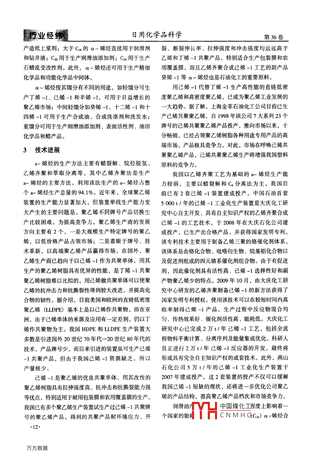 第36卷第4期日用化學(xué)品科學(xué)Vol 36 No 42013年4月detergent cosmeticsApr.2013a-烯烴的技術(shù)進(jìn)展及其市場胡侃,白雪勇(大理學(xué)院藥學(xué)與化學(xué)學(xué)院,云南大理671000摘要:對我國α-烯烴的市場進(jìn)行了分析。介紹了α-烯烴的生產(chǎn)工藝以及用途。對α-烯烴的生產(chǎn)方法以及技術(shù)進(jìn)展進(jìn)行了論述,并對其前景進(jìn)行了展望。關(guān)鍵詞:a-烯烴;市場;技術(shù)進(jìn)展中圖分類號:TQ423.11文獻(xiàn)標(biāo)識碼:A文章編號:1006-7264(2013)04-0011-04α-烯烴是通式為RCH=CH2的端烯烴,其中, Sasol的萃取工藝以及日本出光工藝。R是烷基基團(tuán),R為直鏈烷基的α-烯烴,稱為直鏈2-烯烴的用途α-烯烴LAO)。雖然乙烯和丙烯也屬α-烯烴范疇,但習(xí)慣上α-烯烴是指高碳(C及C4以上)的高碳直αx-烯烴主要用途有以下5大類:①用于聚烯鏈烯烴,a-烯烴是近30年來發(fā)展較為迅速的一種烴(HDPE和LDPE)共聚單體,主要有丁烯-1、重要的有機化工原料,主要用作聚烯烴的共聚單體,已烯1和辛烯-1,40%以上的a-烯烴被作為PE少量用于生產(chǎn)合成酸、環(huán)氧化物、硫醇、聚1-丁的共聚單體使用;②用于洗滌劑和洗滌劑醇,由烯、戊醇、高相對分子質(zhì)量蠟及其他產(chǎn)品。a-烯烴a-烯烴合成的洗滌劑醇具有很好的生物降解性,可的工業(yè)生產(chǎn)中皆聯(lián)產(chǎn)1-丁烯,工業(yè)上制得的a-烯用于生產(chǎn)表面活性劑和中間體(洗滌劑醇類、直鏈烷烴基本上是直鏈端烯烴的混合物,除了分離出1-己基苯、烷基二甲胺、α-烯烴磺酸酯和聯(lián)苯醚二磺酸烯和1-辛烯個別組分外,一般只將其分離為一定范酯);③合成潤滑油、石油添加劑和油田化學(xué)品,圍的碳數(shù)餾分。作為重要的有機原料和中間體產(chǎn)品,聚α-烯烴是優(yōu)質(zhì)的合成潤滑油,主要是癸烯-1和a-烯烴被廣泛應(yīng)用于聚乙烯單體、表面活性劑、潤辛烯-1的齊聚物;④增塑劑用醇,CCo直鏈滑油、增塑劑、聚a-烯烴PAO、助劑和精細(xì)化學(xué)a-烯烴經(jīng)羰基合成制得的增塑劑醇揮發(fā)度低,且具品有很好的光穩(wěn)定性和抗氧化性,可用于生產(chǎn)塑料和聚烯烴彈性體;⑤用于潤滑油添加劑及鉆井液、黏合1生產(chǎn)工藝劑和密封劑等;⑥少量用于生產(chǎn)合成酸、烯基琥珀現(xiàn)有α-烯烴的生產(chǎn)方法有石蠟裂解法及乙烯酸酐、環(huán)氧化物、硫醇、聚丁烯-1、戊醇、高分子齊聚法。前一種方法所得是奇、偶數(shù)碳的混合烯烴,蠟、金屬工作液及其他產(chǎn)品(如聚癸烯可用于個人護(hù)產(chǎn)品雜質(zhì)多、質(zhì)量差。20世紀(jì)80年代中期,國外已理品和皮革化學(xué)品)幾乎全部停產(chǎn),目前中國仍在生產(chǎn);后一種方法所α-烯烴按其碳鏈長度有不同的應(yīng)用,較低碳鏈得產(chǎn)品全是偶數(shù)碳,質(zhì)量較好,是國外主要的生產(chǎn)α-烯烴如C4(丁烯-1)、C(已烯-1)和C(辛烯-1)路線。目前,國外采用的主要技術(shù)路線有 Chevron的用作HDPE和 LLDPE生產(chǎn)用共聚單體,占總消費量步乙烯低聚工藝、 Amoco的二步乙烯低聚工藝、的50%以上。C和Ca用作聚α-烯烴(PAO)生Shel的較高烯烴法(SHOP)、 Phillips的己烯-1工藝、產(chǎn)潤滑油; Cpr-C16用于生產(chǎn)洗滌劑;CoC用于生中國煤化工收稿日期:2013-03-19作者簡介:胡侃(1983-),男,浙江人,助理實驗師。CNMHG.11.斯業(yè)經(jīng)L日用化學(xué)品科學(xué)第36卷產(chǎn)造紙上漿劑;大于C的a-烯烴直接用于潤滑劑裂、斷裂伸長率、拉伸強度和沖擊強度均遠(yuǎn)遠(yuǎn)高于和鉆井液;Cx用于生產(chǎn)潤滑油添加劑;Ca用于生產(chǎn)乙烯和丁烯-1共聚產(chǎn)品,特別適合生產(chǎn)包裝膜和農(nóng)石蠟流變改性劑。此外,α-烯烴還可用于生產(chǎn)精細(xì)用覆蓋膜,而且乙烯齊聚合成己烯-1工藝的副產(chǎn)品化學(xué)品和功能化學(xué)品中間體。癸烯-1等α-烯烴也是石油化工的重要原料。α-烯烴按其餾分有不同的用途,如輕餾分可生用己烯-1代替丁烯-1生產(chǎn)高性能的直鏈低密產(chǎn)丁烯-1、已烯-1和辛烯-1,可用于日益增長的度聚乙烯和高密度聚乙烯,已成為聚乙烯工業(yè)發(fā)展的聚乙烯市場;中間輕餾分如癸烯-1、十二烯-1和十一大趨勢。據(jù)了解,上海金菲石油化工公司目前已生四烯-1可用于生產(chǎn)合成油、合成洗滌劑和洗發(fā)水;產(chǎn)己烯共聚聚乙烯,自1998年該公司7大系列23個重餾分可用于生產(chǎn)潤滑油添加劑、表面活性劑、油田牌號的己烯共聚聚乙烯產(chǎn)品投產(chǎn),推向市場以來,十化學(xué)品和蠟產(chǎn)品。分暢銷,已經(jīng)占領(lǐng)聚乙烯樹脂各種用途專用產(chǎn)品的高端市場,產(chǎn)品極具競爭力。對此,市場在呼喚已烯共3技術(shù)進(jìn)展聚聚乙烯產(chǎn)品,己烯共聚聚乙烯生產(chǎn)將增強我國塑料a-烯烴的生產(chǎn)方法主要有蠟裂解、烷烴脫氫、原料的競爭力。乙烯齊聚和萃取分離等,其中乙烯齊聚法是生產(chǎn)我國以乙烯齊聚工藝為基礎(chǔ)的a-烯烴生產(chǎn)能a-烯烴的主要方法。利用該法生產(chǎn)的a-烯烴占整力較弱,主要以蠟裂解和C4分離法為主。我國目個a-烯烴生產(chǎn)總量的941%。近年來,全球聚乙烯前已有2套已烯-1裝置建成投產(chǎn)。中國石油首套裝置的生產(chǎn)能力顯著加大,但裝置單線生產(chǎn)能力變500t/年的己烯-1工業(yè)化生產(chǎn)裝置是大慶化工研大產(chǎn)生