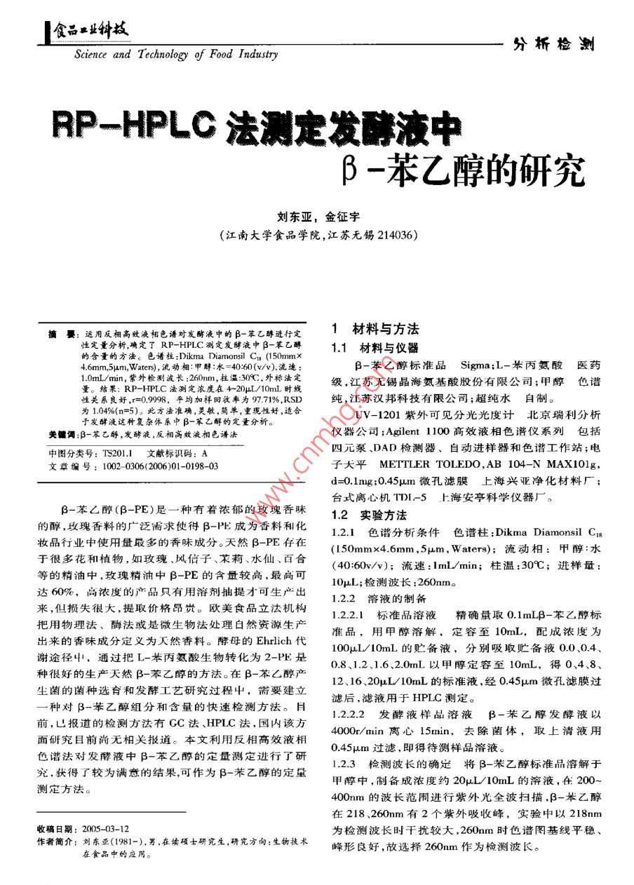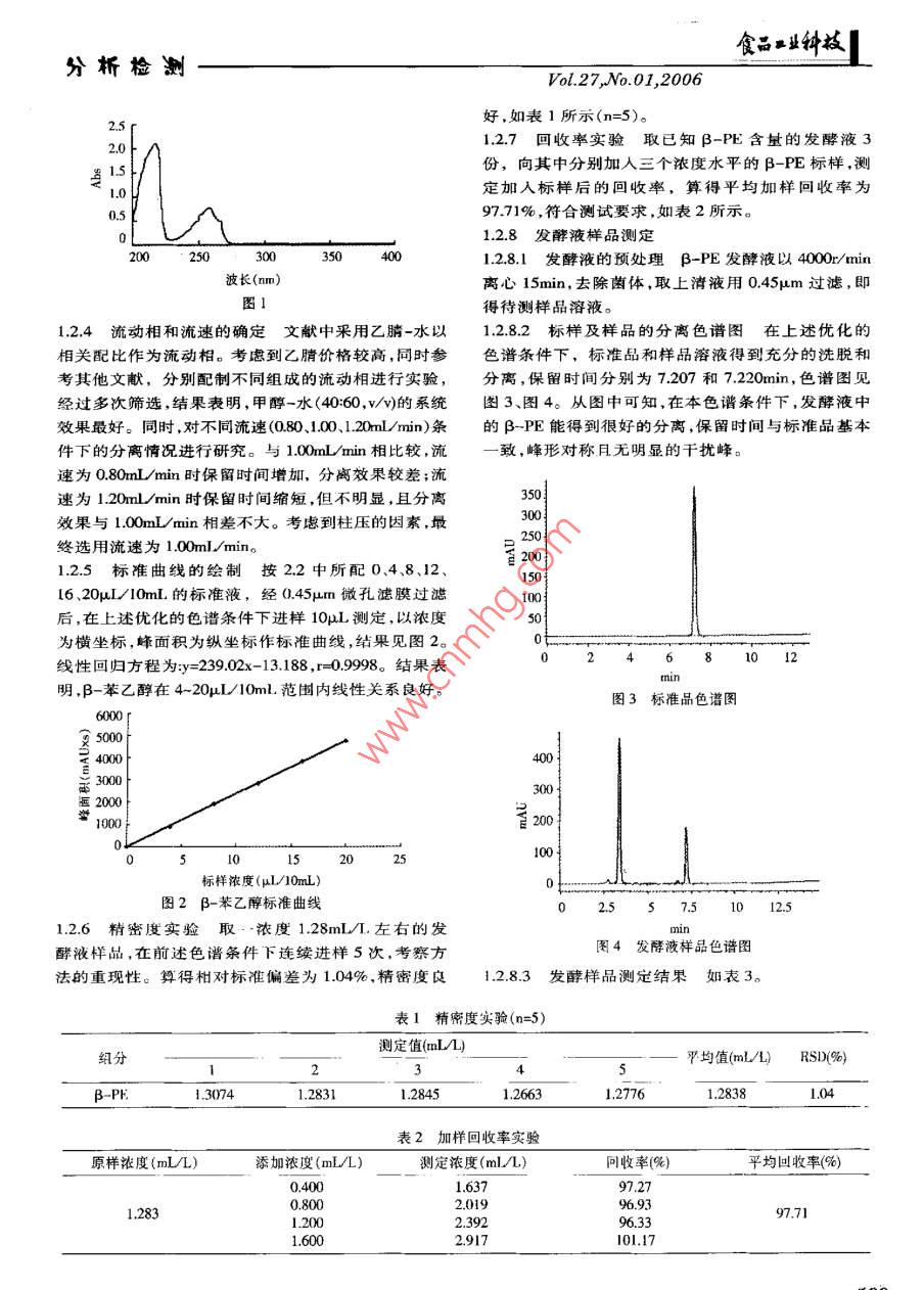 食…分桁檢測(cè)Science and Technology of Food IndustryRP-HPLc法測(cè)定發(fā)前液中β-苯乙醇的研究劉東亞,金征宇(江南大學(xué)食品學(xué)院,江蘇無(wú)錫214036)饔:運(yùn)用反相高效液相色譜對(duì)發(fā)酵液中的β-蘋(píng)乙醇進(jìn)行定1材料與方法性定量分析確定了RP-HPLC測(cè)定發(fā)酵液中β-苯乙醇1.1材料與儀器的含量的方法。色譜柱: Dikma Diamonsil C1(150m46mm,5μm, Waters),流動(dòng)相:甲醇:水=40:60(w/),流速B-苯乙醇標(biāo)準(zhǔn)品 sigma;L-舉丙氨酸1.0mL/min,紫外檢測(cè)波長(zhǎng):260nm,拄溫:30℃,外標(biāo)法定色結(jié)果:RP-HPLC法測(cè)定濃度在420L/10m時(shí)線(xiàn)級(jí),江蘇無(wú)錫晶海氨基酸股份有限公司;甲醇性關(guān)系良好,r=0998,平均加樣回收率為叨71%,RSD純,江蘇漢邦科技有限公司;超純水自制。為1.04%(n=5)。此方法準(zhǔn)確,靈敏,簡(jiǎn)單,重現(xiàn)性好,適合于發(fā)酵液這種復(fù)雜體系中β一萃乙醇的定量分析。UV-1201紫外可見(jiàn)分光光度計(jì)北京瑞利分析美鑣調(diào):β-苯乙醉,發(fā)酵液,反相高效液相色譜法儀器公司; Agilent Il00高效液相色譜儀系列包括中圖分類(lèi)號(hào):TS201.1文獻(xiàn)標(biāo)識(shí)碼:A四元泵、DAD檢測(cè)器、自動(dòng)進(jìn)樣器和色譜工作站;電文章編號(hào):1002-0306(2006)01-0198-03子天平 METTLER TOLEDO,AB104- N MAXIO1g,d=0.lmg;045m微孔濾膜上海興亞凈化材料廠(chǎng)臺(tái)式離心機(jī)TD-5上海安亭科學(xué)儀器廠(chǎng)。B-苯∠醉(B-PE)足一種有著濃郁的玫塊香味12實(shí)驗(yàn)方法的醇,玫瑰香料的廣泛需求使得B-PE成為香料和化1.2.1色譜分析條件色譜柱: Dikma Diamonsil CI妝品行業(yè)中使用量最多的香味成分。天然β-PE存在(150mm×4.6mm,5μm, Waters);流動(dòng)相:甲醇:水于很多花和植物,如玫瑰、風(fēng)信子、某莉、水仙、百合(40:60/v);流速:lm/min;柱溫:30℃;進(jìn)樣量等的精油中,玫瑰精油中β-PE的含量較高,最高可達(dá)60%,向濃度的產(chǎn)品只有用溶劑抽提才可生產(chǎn)出10uL;檢測(cè)波長(zhǎng):260nm。122溶液的制備來(lái),但損失很大,提取價(jià)格昂貲。歐美食品立法機(jī)構(gòu)把用物理法、酶法或是微生物法處理自然資源生產(chǎn)122.1標(biāo)準(zhǔn)品溶液精確量取01mLB-苯乙醇標(biāo)出來(lái)的香味成分定義為天然香料。酵母的 Ehrlich代準(zhǔn)品,用甲醇溶解,定容至10mL,配成濃度為謝途徑屮,通過(guò)把L-舉丙氨酸生物轉(zhuǎn)化為2-PE是100μL/10mL的貯備液,分別吸取貯備液0.0、0.40.8、1.2、1.6、20mL以甲醇定容至10mL,得0、4、8種很好的生產(chǎn)天然阝-苯乙醇的方法。在β-苯乙醇產(chǎn)生菌的菌種選育和發(fā)酵工藝研究過(guò)程屮,需要建立12、16、20μL10mL的標(biāo)準(zhǔn)液,經(jīng)045μm微孔濾膜過(guò)種對(duì)阝-苯乙醇組分和含量的快速檢測(cè)方法。日濾后,濾液用于HPIC測(cè)定1.2.2.2發(fā)酵液樣品溶液苯乙醇發(fā)酵液以前,已報(bào)道的檢測(cè)方法有GC法、HPLC法,國(guó)內(nèi)該方4000r/min離心15min,去除菌體,取上清液用面研究目前尚無(wú)相關(guān)報(bào)道。本文利用反相高效液相045μm過(guò)濾,即得待測(cè)樣品溶液。色譜法對(duì)發(fā)酵液中β-苯乙醇的定量測(cè)定進(jìn)行了研檢測(cè)波長(zhǎng)的確定將β-苯乙醇標(biāo)準(zhǔn)品溶解于究,狄得了較為滿(mǎn)意的結(jié)果可作為β-苯乙醇的定量甲醇中,制備成濃度約20μL/10mL的溶液,在200-測(cè)定方法。400mm的波長(zhǎng)范圍進(jìn)行紫外光全波掃描,β-苯乙醇在218、260m有2個(gè)紫外吸收峰,實(shí)驗(yàn)中以218nm收稿日期:2005-03-12為檢測(cè)波長(zhǎng)時(shí)干擾較大,260mm時(shí)色譜圖基線(xiàn)平穩(wěn)作者簡(jiǎn)介;劉東亞(1981-),男,在讀碩士研究生,研究方向:生物技術(shù)在食品中的應(yīng)用。峰形良好,故選擇260mm作為檢測(cè)波長(zhǎng)食品業(yè)鐘核分析檢測(cè)ol.27,No.O1,2006好,如表1所示(n=5)。1.27回收率實(shí)驗(yàn)取已知β-PE含量的發(fā)酵液315份,向其中分別加入三個(gè)濃度水平的B-PE標(biāo)樣,測(cè)定加入標(biāo)樣后的回收率,算得平均加樣回收率為9771%,符合測(cè)試要求,如表2所示。01.2.8發(fā)酵液樣品測(cè)定12.8.1發(fā)酵液的預(yù)處理β-PE發(fā)酵液以4000r/mi波長(zhǎng)(m)離心15min,去除菌體,取上清液用0.45μm過(guò)濾,即圖1得待測(cè)樣品溶液。124流動(dòng)相和流速的確定文獻(xiàn)中采用乙腈-水以1.28.2標(biāo)樣及樣品的分離色譜圖在上述優(yōu)化的相關(guān)配比作為流動(dòng)相??紤]到乙腈價(jià)格較高,同時(shí)參色譜條件下,標(biāo)準(zhǔn)品和樣品溶液得到充分的洗脫和考其他文獻(xiàn),分別配制不同組成的流動(dòng)相進(jìn)行實(shí)驗(yàn),分離,保留時(shí)間分別為7207和7220min,色譜圖見(jiàn)經(jīng)過(guò)多次篩選,結(jié)果表明,甲醇-水(40:60,vv的系統(tǒng)圖3、圖4。從圖中可知,在本色譜條件下,發(fā)酵液中效果最好。同時(shí),對(duì)不同流速(080、100、120ml/min)條的β-PE能得到很好的分離,保留時(shí)間與標(biāo)準(zhǔn)品基本件下的分離情況進(jìn)行研究。與1.00 ml min相比較,流致,峰形對(duì)稱(chēng)且無(wú)明顯的干擾峰。速為080mL/min時(shí)保留時(shí)間增加,分離效果較差;流速為L(zhǎng)20ml/min時(shí)保留時(shí)間縮短,但不明顯,且分離效果與100mL/min相差不大。考慮到柱壓的因素,最終選用流速為100mmin。1.25標(biā