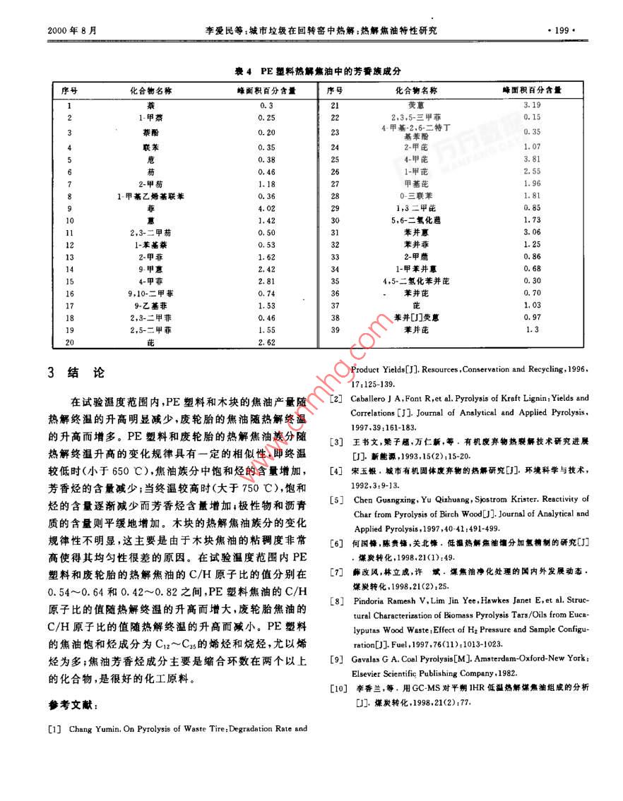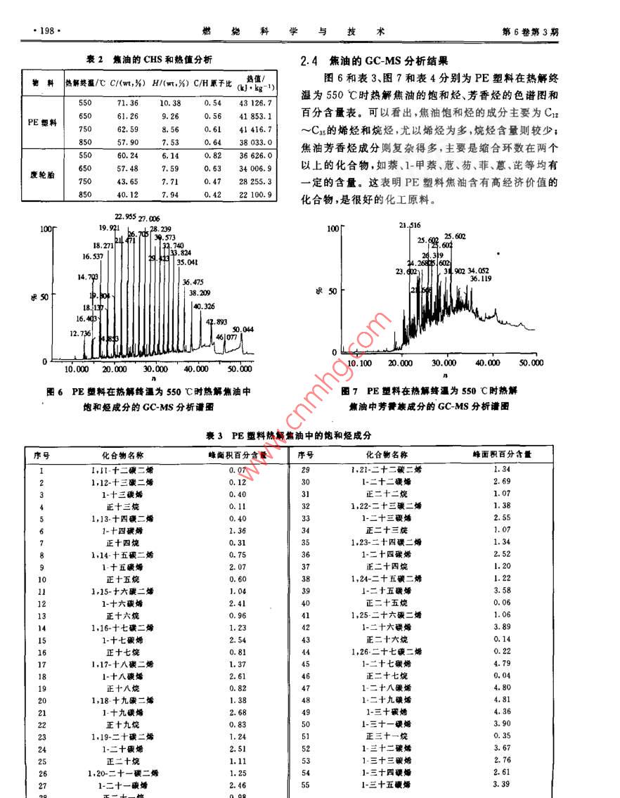 第6卷(2000)第3期燃燒科學(xué)與技術(shù)JOURNAL OF COMBUSTION SCIENCE AND TECHNOLOGYVol.6(2000)No,3城市垃圾在回轉(zhuǎn)窯中熱解:熱解焦油特性研究李愛民,嚴(yán)建華,李水清,谷月玲,李曉東,任遠(yuǎn),池涌,岑可法漸江大學(xué)熱能工程研究所,杭州310027)摘要1利用自行設(shè)計(jì)制造的外熱式回轉(zhuǎn)窯以PE塑料、廢輪胎和木塊為試驗(yàn)物料進(jìn)行了一系列熱解試驗(yàn)。對熱解焦油進(jìn)行了族分分析、元素分析和GCMS分析??疾炝藷峤饨K溫對焦油產(chǎn)量、焦油族分及C、H等元素的含量的影響,并對PE塑料的熱解焦油的化合物組成進(jìn)行了分析,研究表明:在試驗(yàn)溫度范圍內(nèi),熱解終溫對試驗(yàn)物料的焦油產(chǎn)量和焦油族分有明顯影響;PE塑料和廢輪胎焦油的C/H原子比為0.42~0.82,具有較好的加工性能;PE塑料焦油含有高經(jīng)濟(jì)價(jià)值的化合物,是很好的化工原料關(guān)鍵詞:回轉(zhuǎn)窯;垃圾熱解;焦油;族分rC/H原子比;GCMS中圖分英號:TK16文獻(xiàn)標(biāo)識碼:A章編號:1006-8740(2000)030195-05Pyrolysis of Municipal Solid Waste in Rotary Kiln:Studies on Characteristics of Pyrolytic TarLI Ai-min, YAN Jian-hua, LI Shui-qing, GU Yue-ling, LI Xiao-dongREN Yuan, CHI Yong, CEN Ke-fa(Zhejiang University, Hangzhou 310027, China)Abstract: A series of trials with varying raw materials and operational conditions were performed on a laboratoryscale, externally heated rotary-kiln pyrolyser. The analyses of groups, elements, and GC-MS on tar products arepresented in the paper. Impacts of the final pyrolysis temperature on both yields and chemical characteristics of tarwere studied. The results indicate that tar is highly aromatized at the highest final temperature, the atomic ratio ofC/H for Pe and waste tire tar is between 0. 42 and 0. 82, and the high valuable compounds are identified in tar.Keywords: rotary kiln; pyrolysis of solid waste tar igroup compound atomic ratio of C/H; GC-MS廢棄物的熱解處理技術(shù)越來越受到國內(nèi)外專家的關(guān)固體廢棄物熱解焦油的研究則較少見3-10。關(guān)注,具有很好的發(fā)展前途。廢棄物熱解處理后產(chǎn)生氣回轉(zhuǎn)窯以其廣泛的物料(各種尺寸及形狀的固體體、焦油和半焦等產(chǎn)物。氣體可直接用作燃料;焦油可和液體、氣體廢棄物)適應(yīng)性及操作簡單、控制方便等加工成燃燒油或化工原料1;半焦則可用作活性炭系列優(yōu)點(diǎn)已成為各種廢棄物熱解的主要爐型之或進(jìn)一步氣化制造煤氣。焦油是垃圾熱解的主要產(chǎn)本文以城市垃圾中典型有機(jī)物組分:PE鏨料、廢輪胎物之一。焦油是寶貴的化學(xué)原料,從中可以提取酚、萘、和木塊為物料,在自行設(shè)計(jì)制造的外熱式回轉(zhuǎn)窯熱解蒽等,生產(chǎn)洗油粘結(jié)劑、防腐劑,催化加氫生產(chǎn)汽油、裝置上進(jìn)行了一系列熱解試驗(yàn),對垃圾在外熱式回轉(zhuǎn)柴油等。所以研究焦油的析出成分、析出量具有非常重窯中不同熱解終溫下焦油的產(chǎn)率和性質(zhì)進(jìn)行了研究。要的意義6。雖然對煤焦油的研究較為成熟,但是有收稿日荊:19981211修回日期:199903-11金項(xiàng)目:國家教育家自然科學(xué)基金重點(diǎn)資助項(xiàng)目(59836210196·燃燒科學(xué)與技術(shù)第6卷第3期為550℃、650℃、750℃和850℃。試驗(yàn)采用慢加熱方1試驗(yàn)研究式,即先將回轉(zhuǎn)窯放在電爐外,待電爐溫度升至預(yù)定溫度后再將已裝好物料的回轉(zhuǎn)窯放入電爐內(nèi)。1.1垃圾熱解裝置加熱方法1.2試驗(yàn)物料圖1為試驗(yàn)裝置系統(tǒng)的示意圖。通過布置在回轉(zhuǎn)試驗(yàn)以城市垃圾中典型的有機(jī)物組分:木塊(代表窯出口處的蛇形管式間接冷凝器,對熱解后的揮發(fā)產(chǎn)生物質(zhì)類,主要成分為木質(zhì)素、纖維素及半纖維素)廢物進(jìn)行冷卻并將冷凝的焦油收集到焦油收集器內(nèi)。試塑料和廢輪胎(代表塑膠類)等作為試驗(yàn)物料,這些物驗(yàn)時(shí),回轉(zhuǎn)窯轉(zhuǎn)速定為3r/min;熱解最終溫度分別選料的工業(yè)分析與元素分析示于表1。且1w引1.數(shù)字式溫度計(jì)2,軸承3.鏈輪傳動機(jī)構(gòu)4.管式電爐5回轉(zhuǎn)密筒體6溫度控制儀7.密封8蛇形管式冷凝器9.過濾器10.累積流量計(jì)11.計(jì)算機(jī)12,氣體采樣裝量13.焦油收集器14給料口15,無級變速電機(jī)圖1試驗(yàn)裝置系統(tǒng)示意圖衰1試驗(yàn)物料的工業(yè)分析及元素分析工業(yè)分析元素分析物料名稱M/%Ad/% vd/% FC/% Qd/(g-1) Cu/% Hd/% Nd/% Su/% O d/%14.839.4112.8215855.540.324.680.180.0636.99PE塑料0.170.0699.770.0037575.213.66廢輪胎19.0862.4917.4430011.71.3焦油的族分分析方法280℃并保持10min。流量為1.2mL/min;分流比為焦油的族分采用石油部頒發(fā)的SY5119-86標(biāo)16:1.2;進(jìn)樣量為1μL。準(zhǔn):巖石中可溶有機(jī)物及原油族分組成的分析方法。其MS條件:電離方式EI,電子轟擊能量70eV,充原理為:用正已烷沉淀瀝青質(zhì),以硅膠和三氧化二鋁為電倍增管電壓500V掃描質(zhì)量范圍50~500u,掃描吸附劑,由于吸附劑對不同類型有機(jī)物質(zhì)的吸附性能時(shí)間1s的不同以及各種沖洗劑的極性不同,當(dāng)樣品及沖洗劑定性采用nist公學(xué)工作站譜庫檢索與部分標(biāo)樣流經(jīng)吸附劑時(shí),樣品中的飽和烴、芳香烴和極性物依次相結(jié)合的方法,定量采用歸一化面積校正法被分離出來。1.4焦油的GCMS分析2結(jié)果與討論GC-MS的工作原理是:一