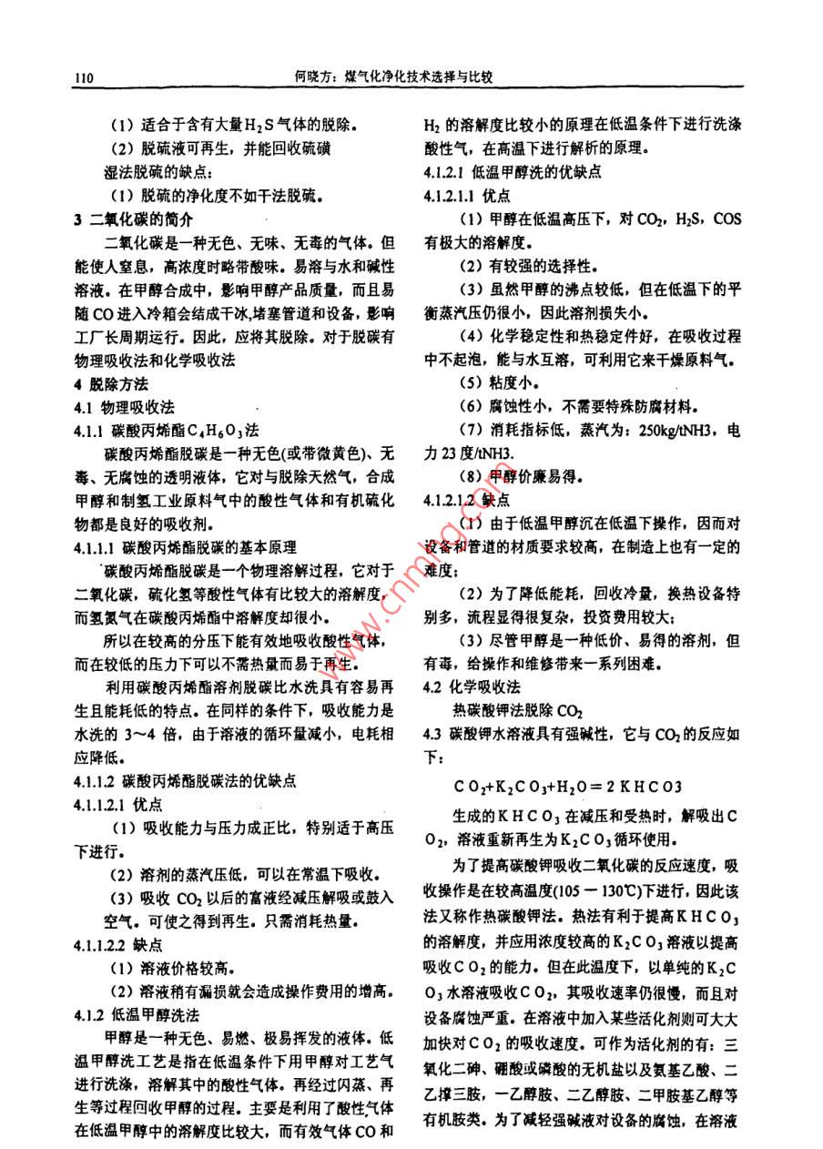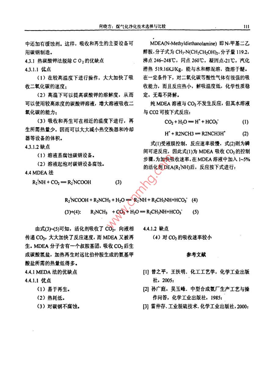 化學(xué)工程與裝備2009年108Chenical Engineering Equip ment2009年1月煤氣化凈化技術(shù)選擇與比較何曉方,王瑞學(xué)(寧波萬華聚氨酯有限公司,浙江寧波315812)摘要:煤氣化凈化技術(shù)種類很多,各有特點(diǎn)。文章就常見的煤氣化凈化技術(shù)進(jìn)行了簡單的介紹和對關(guān)鍵詞;脫硫;脫碳;碳酸丙烯酯;低溫甲醇洗;碳酸鉀: MDEA煤化工是以煤為原料經(jīng)化學(xué)加工使煤轉(zhuǎn)化為(1)硫化氫能與堿作用生成鹽。因此,可用其他化學(xué)產(chǎn)品的過程。從煤氣化工段的工藝氣中發(fā)賊性溶液來吸收氣體中的硫化氫?,F(xiàn),除了含有生產(chǎn)甲醇和其他下游產(chǎn)品所需的co, .(2)硫化氫有很強(qiáng)的還原能力。在酸性或堿H2和CO2外,還含有大量多余的CO2及少量H2S,性溶液內(nèi)硫化氫可作為還原劑,而本身被氧化成為COS, SO2 等成分,這些碳的氧化物和硫化物是生硫磺而沉淀出來。產(chǎn)甲醇或其他化學(xué)品所不需要的,必須將這些雜質(zhì)(3)硫化氫較容易與金屬,金屬氧化物或金除去。另外,硫化物通過克勞斯工藝生產(chǎn)硫磺,CO2屬的鹽類作用生成金屬的硫化物,這就是硫化氫能可以回收送往尿素廠合成尿素,提高經(jīng)濟(jì)效益變廢使各種催化劑中毒的根本原因。為寶.2硫化物的脫除有干法脫硫和濕法脫硫.以天然氣或石腦油為原料,采用蒸汽轉(zhuǎn)化法造2.1 干法脫硫氣,變換氣中CO2的含量約在15-23mol%左右。以2.1.1 活性炭吸附法重油域煤原料,采用部分氧化法制氣時,變換氣中活性炭脫硫技術(shù)在消除S 02污染的同時可回CO2的含量高達(dá)35moi%以上.H2S及有機(jī)硫的含量收硫資源,在較低溫度下將S O2氧化成S 0;并在則與原料含硫量有關(guān),約在100ppm和1000ppm同- -設(shè)備將S 0z轉(zhuǎn)化成硫酸,因而是一種防治污之間。通過凈化,使硫化物含量小于0.2-0.5ppm,染與資源回收利用相結(jié)合的有吸引力的技術(shù)。CO2小于loppm.其脫硫機(jī)理為:1硫化物簡介SO2(g)-→S 02*吸附硫化物中主要是硫化氫,約占硫化物總量的02(g)→2 0*90%,另外還含有少量的有機(jī)硫化物,主要是二硫化碳,二硫化碳,硫醇,硫醚,硫吩等。H20(g)- +H20*1.1硫化氫的物理性質(zhì)S02*+0*-→SOz*氧化硫化氫是一-種無色氣體,有類似腐蛋的臭味,SOj*+H20*- +H2SO+水和有毒比空氣重,易凝為液體,能溶于水,在0個時1體積水可吸收4.65體積的硫化氫,溶解熱為4.52H2S 0p*+nH20*→(H2S 0:nH2O)●千卡/克分子。溶有硫化氫的水溶液呈弱酸性,生產(chǎn)稀釋的硫化氫極易造成設(shè)備的腐蝕。注:嚷示吸附態(tài)。1.2硫化氫的化學(xué)性質(zhì)何曉方:煤氣化凈化技術(shù)選擇與比較109 ,吸附過的活性炭(焦)經(jīng)再生可以獲得硫酸、液氨導(dǎo)入洗滌系統(tǒng)發(fā)生下列反應(yīng):體二氧化硫、單質(zhì)硫等產(chǎn)品?;钚蕴?焦)吸附變換NHy+H2O+SO2=NHgHSOz氣中二氧化硫工藝中的吸附裝置主要有兩種形式:固定床與移動床。其再生方法也主要有兩種,即水2NH;+H20+S02= (NH4) 2SO3洗再生法與加熱再生法。亞硫酸銨對S 02有更好的吸收能力,它是氨2.1.2鈷-鉬加氫法法中的主要吸收劑鈷-鉬加氫轉(zhuǎn)化是一種有效脫除含氫原料氣中有(NH4) 2S0j+S 0z+H20= 2NHgHS O3機(jī)硫的預(yù)處理措施。有機(jī)硫化物脫除較難,但將其加氫轉(zhuǎn)化成硫比氫后再加以脫除就容易得多了。該氨法實(shí)質(zhì)上是以循環(huán)的(NH4) 2S03, NH方法能將氣體中的硫化氫脫除到2x10*V%以下.HSs03水溶液吸收S02的過程。隨著亞硫酸氫氨在鈷-鉬催化劑的作用下,有機(jī)硫加氫轉(zhuǎn)化成比例的增大,吸收能力降低,須補(bǔ)充氨水將亞硫酸氫銨轉(zhuǎn)化成亞硫酸氨。硫化氫的反應(yīng)如下:NH.HSOz+NHz= (NHs) 2SO3CS2+4 H2=2H2S+CH .另一部分含亞硫酸氫銨量高的溶液,可從洗滌C0S+H2=C0+H2S系統(tǒng)排出,以各種方法再生S O2或者生產(chǎn)某種產(chǎn)RCH2SH+H2=RCH3=H2S品。2.2.2 ADA法C.H,S+4 H2= C.Hro+H=2SADA是蒽醌二磺酸(Anthraquinone鈷-鉬催化劑系以氧化鋁為載體,由氧比鉬和氧Disulphonic Acid)的英文縮寫.它含有2, 6-或2,化鈷組成。氧化態(tài)的鈷和鉬加氫活性不大,須經(jīng)硫7~蒽酲二磺酸酸鈉的一一種混合體?;蟛啪哂邢喈?dāng)?shù)幕钚浴A蚧蠡钚越M分主要是M此法(ADA法)脫硫由于析硫過程緩慢,生成硫代硫酸鹽較多,在該溶液中加入偏釩酸鈉后,可使oS2和CoqSg.干法脫硫的優(yōu)點(diǎn)是脫硫凈化度高。缺點(diǎn)為難以析流通度大為加快,稱為改良ADA法脫琉。反應(yīng)或不能再生:間歇操作,設(shè)備龐大:不適合硫含量歷程為:在脫硫塔中,以pH值為8.5~9.2的稀堿液吸較高的場合。收硫化氫:2.2濕法脫硫NaCOz+H2S=NaHS+NaHCO32.2.1氨法氨法即是以(NH) 2S03, NH,HS 03溶硫氫化物與偏釩酸鈉反應(yīng)生成元素硫:液來吸收低濃度S 03,然后處理吸收液,獲得產(chǎn)品的過程。2NaHS+4 NaV 0j+H20=NaV,Og+4NaOH+2S↓氧化態(tài)A D A氧化焦釩酸鈉為偏釩酸鈉:NaV40g+2A D A(氧化態(tài))+ 2NaOH+H20=4NaV0;十2ADA (還原態(tài))在再生塔中,還原態(tài)ADA被空氣中的氧氧化的作用在于穩(wěn)定溶液中的釩,防止生成“釩-氧一成氧化態(tài):硫”復(fù)合物沉淀:加入三氯化鐵,可加速還原態(tài)ADA2ADA(還原態(tài))十O2= 2ADA(氧化態(tài))+ 2H2O的氧化速度;而整合劑EDTA的加入,可防止Fe'*生成Fe(OH)3沉淀,EDTA的加入量至少應(yīng)與Fe3+經(jīng)再生后的溶液可送入吸收塔循環(huán)使用等摩爾數(shù)。改良ADA法脫硫液中.還加有灑石酸鉀鈉,濕
