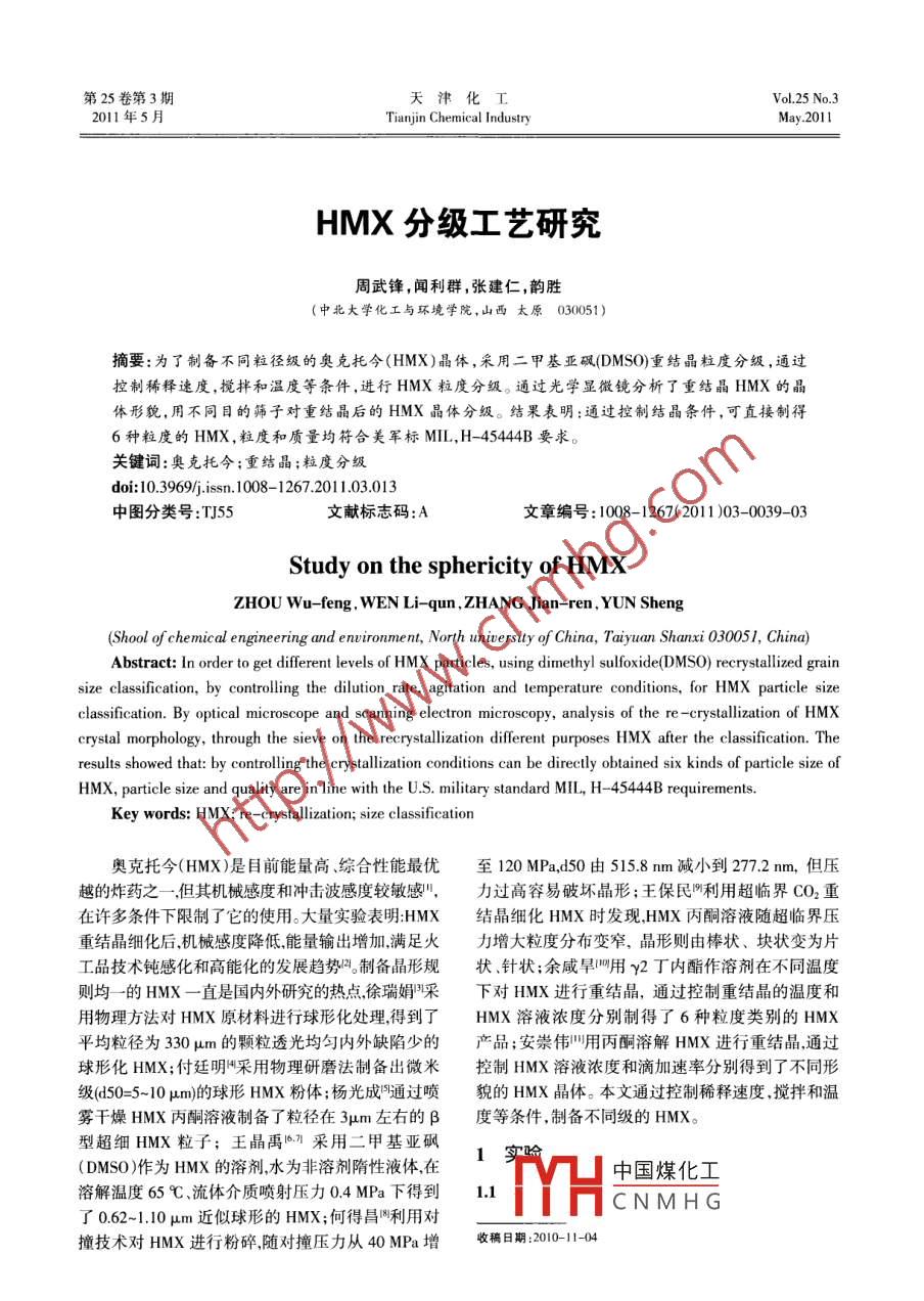 第25卷第3期天津化工Vol 25 No. 32011年5月Tianjin Chemical IndustryHMX分級工藝研究周武鋒,聞利群,張建仁,韻勝(中北大學(xué)化工與環(huán)境學(xué)院,山西太原030051)摘要:為了制備不同粒徑級的奧克托今(HMX)晶體,采用二甲基亞砜(DMSO)重結(jié)晶粒度分級,通過控制稀釋速度,攪拌和溫度等條件,進行HMX粒度分級。通過光學(xué)顯微鏡分析了重結(jié)晶HMX的晶體形貌,用不同目的篩子對重結(jié)晶后的HMX晶體分級。結(jié)果表明:通過控制結(jié)晶條件,可直接制得6種粒度的HMX,粒度和質(zhì)量均符合美軍標MIL,H-45444B要求。關(guān)鍵詞:奧克托今;重結(jié)晶;粒度分級doi:10.3969/issn.1008-1267.2011.03013中圖分類號:TJ55文獻標志碼:A文章編號:1008-1267(2011)03-0039-03Study on the sphericity of HMXZHoU Wu-feng, WEN Li-qun, ZHANG Jian-ren, YUN Sheng(Shool of chemical engineering and environment, North university of China, Taiyuan Shanxi 030051, China)Abstract: In order to get different levels of HMX particles, using dimethyl sulfoxide(DMSO)recrystallized grsize classification, by controlling the dilution rate, agitation and temperature conditions, for HMX particle sizeclassification. By optical microscope and scanning electron microscopy, analysis of the re-crystallization of HMXcrystal morphology, through the sieve on the recrystallization different purposes HMX after the classification. Theresults showed that: by controlling the crystallization conditions can be directly obtained six kinds of particle size ofHMX, particle size and quality are in line with the U.S. military standard MIL, H-45444B requirementsKey words: HMX; re-crystallization; size classification奧克托今(HMX)是目前能量高、綜合性能最優(yōu)至120MPa,d50由5158mm減小到272mm,但壓越的炸藥之一,但其機械感度和沖擊波感度較敏感,力過高容易破壞晶形;王保民門利用超臨界CO2重在許多條件下限制了它的使用。大量實驗表明HMX結(jié)晶細化HMX時發(fā)現(xiàn),HMX丙酮溶液隨超臨界壓重結(jié)晶細化后機械感度降低,能量輸岀増加,滿足火力增大粒度分布變窄,晶形則由棒狀、塊狀變?yōu)槠て芳夹g(shù)鈍感化和高能化的發(fā)展趨勢。制備晶形規(guī)狀、針狀;余咸旱用γ2丁內(nèi)酯作溶劑在不同溫度則均一的HMX一直是國內(nèi)外研究的熱點徐瑞娟采下對HMX進行重結(jié)晶,通過控制重結(jié)晶的溫度和用物理方法對HMX原材料進行球形化處理得到了HMX溶液濃度分別制得了6種粒度類別的HMX平均粒徑為330μm的顆粒透光均勻內(nèi)外缺陷少的產(chǎn)品;安崇偉"用丙酮溶解HMX進行重結(jié)晶通過球形化HMX;付廷明采用物理研磨法制備出微米控制HMX溶液濃度和滴加速率分別得到了不同形級(d50=5-10μm)的球形HMX粉體;楊光成通過噴貌的HMX晶體。本文通過控制稀釋速度,攪拌和溫霧干燥HMX丙酮溶液制備了粒徑在3μm左右的β度等條件,制備不同級的HMX型超細HMX粒子;王晶禹η采用二甲基亞砜(DMSO作為HMX的溶劑水為非溶劑隋性液體在1實階中國煤化工溶解溫度65℃、流體介質(zhì)噴射壓力04MPa下得到1.1CNMHG了062-1.10μm近似球形的HMX;何得昌利用對撞技術(shù)對HMX進行粉碎,隨對撞壓力從40MPa增收稿日期:2010114天津化T2011年5月將一定量的HMX溶于二甲亞砜(DMSO)中,使稀釋劑濃度最大均為52%,1、2級濃度為48%。之達到或接近飽和濃度,然后加入非溶劑(稀釋劑)2.2.2加料速度的影響進行稀釋,使DMSO濃度下降逐漸析出HMX結(jié)晶稀釋劑加入速度影響溶液的狀態(tài),加人速度緩?fù)ㄟ^控制稀釋速度,攪拌和溫度等條件,制備不同慢,使溶液狀態(tài)維持在第一介穩(wěn)區(qū),利于晶核長大,級的HMX晶體易于得到3、4級HMX;若加入速度較快,使溶液狀1.2工藝流程(見圖1)態(tài)處于不穩(wěn)區(qū),利于生成晶核,則能形成大小比較HMxX□DMso[Ho均勻的細小結(jié)晶2、5級HMX;1、6級相近,但6級粒度略小于1級,因此在制備工藝中,6級加入稀釋劑的速度應(yīng)大于A級HMX溶液稀釋劑2.23加晶種的影響在工業(yè)結(jié)晶過程中為了控制晶體的數(shù)目和大結(jié)品一過濾及洗滌小,普通習(xí)慣是結(jié)晶前在溶液中加入溶質(zhì)的不同大小的顆粒作為晶種,對溶液此后的結(jié)晶將發(fā)生感染作用,在制各大顆粒結(jié)晶時,加入晶種的作用尤為明顯。制4級HMX時,需加入一定量的晶種,晶種2結(jié)果與分析為3級產(chǎn)品中35~60目之間的HMX,不能直接以3級產(chǎn)品作晶種,以免結(jié)晶大小相差懸殊,不能獲得21實驗結(jié)果合格4級HMX。HMX的6種粒度(見表1沖中,3、4級較大,較相2.24洗滌液的影響近,2、5級較小也較接近,1、6級同屬于中等粒度除4級外,其它各級均為水洗滌過濾后的結(jié)相近兩級粒度盡量采用相同的工藝條件,即采用相晶,水洗以洗凈母液為目的。為節(jié)約溶劑回收費用,近的稀釋劑用量和濃度,通過改變稀釋劑加入速不必用過量水洗滌。如用水直接洗滌4級,相當于度,控制溶液的狀態(tài),若狀態(tài)維持在第一介穩(wěn)區(qū),則用水稀釋,會使母液中溶解的HMX形成細結(jié)晶析制出3、4級HMX,如狀態(tài)在第二介穩(wěn)區(qū)可得到1、6出。應(yīng)先用含DMSO和水的DMsO溶液洗滌,然后級HMX,狀態(tài)在不穩(wěn)區(qū),其粒度為2、5級HMX。以水洗凈DMSO即可。表HMX粒度2.25攪拌速度的影響美國標各級通過/%制取大粒度HMX時的攪拌速度較小,制備中準篩號等粒度HMX,采用適中的轉(zhuǎn)速100~150r/min,制細(目)256小粒度HMX時,攪拌速度較大,以利于稀釋劑迅速分散形成細小結(jié)晶99~100