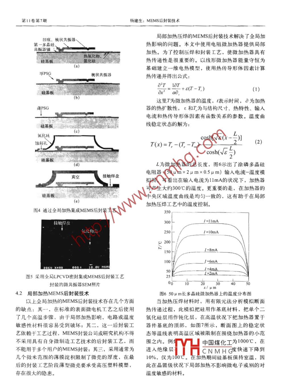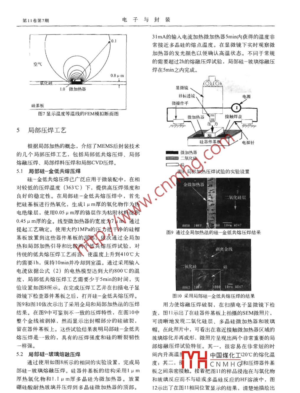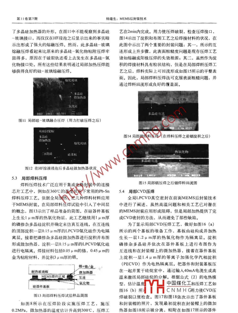 第11卷,第7期電子與封裝總第99期Vol.11,No. 7ELECTRONICS & PACKAGING2011年7月MEMS后封裝技術(shù)楊建生(天水華天科技股份有限公司,甘肅天水741000)摘要:通過(guò)對(duì)局部加熱與壓焊技術(shù)的研討,介紹了微系統(tǒng)后封裝技術(shù),微系統(tǒng)封裝技術(shù)在微電機(jī)系統(tǒng)(MEMS)蓬勃興起的領(lǐng)域已成為主要的研究課題。構(gòu)建多應(yīng)用后封裝工藝不僅推動(dòng)了此領(lǐng)域的發(fā)展,而且加速了產(chǎn)品的商業(yè)化進(jìn)程。文章概述了通過(guò)局部加熱和壓焊技術(shù)形成創(chuàng)新型后封裝的方法,闡明了目前MEMS封裝技術(shù)和晶片壓焊工藝技術(shù)的工程基礎(chǔ)。重點(diǎn)陳述了通過(guò)選擇性密封工藝過(guò)程,包括集成低壓力化學(xué)汽相淀積(LPCVD)密封工藝、局部硅-玻璃熔融壓焊、局部焊料壓焊和局部CVD (化學(xué)汽相淀積)壓焊工藝過(guò)程。關(guān)鍵詞:化學(xué)汽相淀積壓焊;低共熔壓焊;融合壓焊; MEMS封裝;焊料壓焊中圖分類號(hào): TN305.94文獻(xiàn)標(biāo)識(shí)碼: A文章編號(hào): 1681-1070 ( 2011 ) 07-0002-07MEMS Post PackagingYANG Jian-sheng(Tianshui Huatian Technology Co., Ltd., Tianshui 741000,China)Abstract: This work addresses important post-packaging issues for Microsystems and rcommemds specificresearch directions by localized heating and bonding. Micropackaging has become a major subject for bothscientific research and industrial applications in the emerging field of microelectromechanical systems(MEMS). Establishing a versatile post-packaging process not only advances the field but also speeds up theproduct commercialization cycle. A review of engineering bases describing current technologies of MEMSpackaging approach by localized heating and bonding. Proces s demonstrations by selective encapsulationare presented, including an integrated low pressure chemical vapor deposition (LPCVD) sealing process.Localized silicon-gold eutectic bonding, localized silicon-glass fusion bonding, localized solder bonding andlocalized CVD bonding process.Key words: CVD bonding; eutectic bonding; fusion bonding; MEMS packaging; solder bond工藝過(guò)程的- -部分融合在器件制造階段,雖然此方法1引言解決了單個(gè)器件的封裝需要,但是它不能解決多個(gè)微系統(tǒng)的封裝需要,特別是由芯片制造公司制造的很多隨著微封裝作為器件商業(yè)化的瓶頸出現(xiàn),微電機(jī)MEMS器件以及對(duì)軍用產(chǎn)品封裝工藝的需要。系統(tǒng)(MEMS)正在縮小傳感器和驅(qū)動(dòng)器使之進(jìn)入微MEMS后封裝工藝必須滿足幾個(gè)方面的要求:封納米規(guī)模。在傳統(tǒng)的集成電路制造中,封裝成本大約裝既不能損壞裝配制造前的MEMS微結(jié)構(gòu),也不能損占制造成本的三分之- -。MEMS封裝要求嚴(yán)格,原因傷微電子學(xué)方面的狀況:封裝應(yīng)適用于很多應(yīng)用領(lǐng)在于易損的微型結(jié)構(gòu)以及通常要考慮的MEMS制造中域的不同中國(guó)煤化工采用比較成熟的技最昂貴的工藝步驟。建議應(yīng)把MEMS封裝作為微電機(jī)術(shù)以節(jié)省YHC N M H G件要求真空密封,收稿日期: 2011-04-11-2-第11卷第7期楊建生: MEMS后封裝技術(shù)有的要求低溫封裝,為了達(dá)到這些要求,應(yīng)重視幾“內(nèi)部接觸”把兩個(gè)分離的表面結(jié)合在一起,“溫項(xiàng)關(guān)鍵要素:保護(hù)MEMS器件的封帽,不透氣密封度”提供壓焊能量。研究粗糙表面對(duì)陽(yáng)極壓焊工藝強(qiáng)壓焊,較低制造成本的晶圓級(jí)與成批處理,防止過(guò)程的影響可得出結(jié)論,表面有瑕疵會(huì)影響壓焊的MEMS器件受損的低溫處理。MEMS封裝工藝技術(shù)包參數(shù)包括溫度、時(shí)間和應(yīng)力。雖然回流焊或機(jī)械拋括對(duì)封裝及壓焊技術(shù)的研討,以及采用局部加熱和光工藝能夠提高表面平直度,然而這些工藝過(guò)程并壓焊的MEMS封裝技術(shù)的創(chuàng)新方法。不方便適用于大部分MEMS制造工藝。在溫度方面,很多平常使用的壓焊方法諸如熔融和陽(yáng)極壓焊會(huì)損2 MEMS封裝技術(shù)壞器件并因高溫而導(dǎo)致熱應(yīng)力問(wèn)題。另一方面為了獲得良好壓焊,提高加工溫度是不可避免的。多年來(lái),人們對(duì)傳感器微電機(jī)及微封裝方面涉以前在MEMS器件中多采用硅壓焊技術(shù),諸如及的MEMS封裝技術(shù)問(wèn)題以及微系統(tǒng)的封裝技術(shù)和壓力傳感器、微泵、生物醫(yī)學(xué)傳感器或化學(xué)傳感器分隔技術(shù)問(wèn)題進(jìn)行了研討,對(duì)化學(xué)傳感器采用環(huán)氧等,要求在基板上壓焊機(jī)械互連。通常在溫度大約樹脂焊接玻璃和硅、采用環(huán)氧樹脂研發(fā)多芯片模塊為300C ~ 450C的狀況下,把玻璃作為壓焊材料進(jìn)(MCM)型封裝技術(shù)工藝和不同的壓焊及互連材料行陽(yáng)極壓焊。在超過(guò)1000C的超高溫度狀況下,采也進(jìn)行了討論。涉及到封裝微化學(xué)傳感器的專用工用 不同種類的硅熔融壓焊和Si-SiO2壓焊工藝,把低藝,研發(fā)了用于MEMS封裝技術(shù)的專用工藝,如微電共熔壓焊用于不同的應(yīng)用中。機(jī)封裝技術(shù)、生物化學(xué)系統(tǒng)封裝技術(shù)及航空系統(tǒng)封硅熔融壓焊大部分用于絕緣體上硅(SOI) 技術(shù)裝技術(shù)。這些器件型封裝理論主要針對(duì)于單系統(tǒng),中,諸如Si-SiO,壓焊和Si-Si壓焊。理論證明其壓焊還沒(méi)有取得作為通用的后封裝技術(shù)工藝?yán)碚