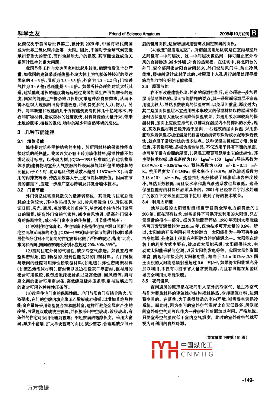 科學(xué)之友Friend of Science Amateur200年41月(2B對建筑節(jié)能的看法王玉娥(山西省勘察設(shè)計(jì)研究院,山西太原030013)摘要:文章從資源回收利用、新能源開發(fā)利用、紙建筑3個(gè)方面說明了建筑節(jié)能的重要性,介紹了建筑能耗的基本情況,并論逑了墻體節(jié)能、門窗節(jié)能、屋面節(jié)能、利用太陽能、夜間通風(fēng)5種節(jié)能的途徑關(guān)鍵詞:新能源;墻體節(jié)能;屋面節(jié)能中圖分類號:TU11228文獻(xiàn)標(biāo)識(shí)碼:A文章編號:1000-8136(2008)29-0148-03隨著技術(shù)的日新月異能源短缺已不容忽視節(jié)約能源已受戶由太陽來加熱夜間則通過隔熱材料和灰沙磚墻來加熱。到世界性的普遍關(guān)注,在我國亦不例外。全世界有近30%的能源13紙建筑消耗在建筑物上,長此以往將嚴(yán)重影響世界的可持續(xù)發(fā)展。因用紙做結(jié)構(gòu)材料不僅可以減小建筑物的重量,加快施丁速此能源將成為本世紀(jì)的熱門話題我們必須從可持續(xù)發(fā)展的戰(zhàn)度降低成本;而且建筑物拆除后紙可以重復(fù)利用對節(jié)約資源略出發(fā),使建筑盡可能少地消耗不可再生資源,降低對外界環(huán)境環(huán)境保護(hù)亦有好處。世界上目前已有一些用紙結(jié)構(gòu)建造的臨時(shí)的污染,并為使用者提供健康舒適與和諧的工作及生活空間性和半臨時(shí)性的建筑。位于瑞士某地的紙塔是輕型建筑中一個(gè)有意義的例子,該紙塔外徑13m,高33m,1992年建成已成為1國外節(jié)能已成風(fēng)尚瑞士當(dāng)?shù)氐臉?biāo)志性建筑物。整個(gè)塔所用的材料紙板占7926%,木11資源回收利用材占20.22%,鋼材占052%。為建筑使用可降解性材料開辟了美國一家大學(xué)曾設(shè)計(jì)建造了一種四居室的生態(tài)房。它的熱能條“綠色通道因此它們被人們譽(yù)為綠色建筑”典范。2000年來源于人工散熱陽光及使用家電設(shè)備所產(chǎn)生的熱量用電依靠世博會(huì),日本館是一座世博會(huì)期間使用的臨時(shí)性紙建筑會(huì)后其風(fēng)力發(fā)電機(jī)和太陽能電池;用水是從屋檐流下來經(jīng)過處理的雨大部分材料可以回收利用。它以材料和結(jié)構(gòu)的特性為主題關(guān)注水;糞便和污水則流入一個(gè)堆肥坑里經(jīng)發(fā)酵后供花園施肥用。美資源和環(huán)保問題。它采用回收加工的紙建成拱筒形的結(jié)構(gòu),由國一家建筑公司用回收的垃圾建筑房屋墻壁是用回收的輪胎和125cm粗的紙管網(wǎng)狀交叉而成,弧形屋面和墻身材料也是織物鋁合金廢料建造的屋架所用的大部分鋼料是從建筑工地上回收和紙膜。該館長72m,寬32m,最高處達(dá)155m,面積3600m2來的;所用的板材為鋸末和碎木料加上20%的聚乙烯制成而舊白天,自然光經(jīng)過半透明紙窗的過濾構(gòu)成柔和、宜人的室內(nèi)光環(huán)報(bào)紙、紙板箱則成了屋面的主要原料,并作為墻面的絕緣體。美國境夜晚紙窗又是神奇光影的“屏幕”。在世博會(huì)展館里,自然光國立資源保護(hù)委員會(huì)總部則是以廢舊回收物品的再生材料為主透過防水的織物和紙膜構(gòu)成的屋頂照射到室內(nèi),造成一片富有日要材料建筑的綠色辦公室。它的墻壁由麥秸稈壓制并經(jīng)過高加工本風(fēng)情的空間環(huán)境。日本館反映了日本人普遍具有的生態(tài)與環(huán)而成地板由廢玻璃制成辦公桌由廢舊報(bào)紙與黃豆渣制成。另外,境意識(shí)這種紙品構(gòu)筑物的意義不僅僅在于環(huán)保、節(jié)能,更重要的它還設(shè)有很大的窗戶,這樣辦公室內(nèi)非常明亮,從而可節(jié)約電力是為解決人類居住問題提供了一條快捷的途徑30%。日本1997年建成了一棟實(shí)驗(yàn)型“健康住宅”了整個(gè)住宅盡可能選對人體無害的建筑材料外,墻體2中國建筑能耗基本情況被設(shè)計(jì)成雙重結(jié)構(gòu),每個(gè)房間建有通風(fēng)口,整個(gè)房屋系統(tǒng)的空氣我國的建筑能耗量約占全國總用能量的14,居耗能首位采用全熱交換器和除濕機(jī)進(jìn)行循環(huán)。全熱交換器能夠有效地回近年來我國建筑業(yè)得到了快速的發(fā)展需要大量的建造和運(yùn)行使收熱量并加以再次利用,其過濾器可有效地收集空氣中細(xì)小的用能源尤其是建筑的采暖和空調(diào)耗能。據(jù)統(tǒng)計(jì),1994年全國僅塵埃從而能夠抑制霉菌等過敏生物繁殖。這種資源的回收利用,住宅建筑能耗在基本上不供熱水的情況下為154x108標(biāo)準(zhǔn)不僅變廢為寶,而且減少了環(huán)境污源,節(jié)約了能源煤,占當(dāng)年全能源消耗總量1227×109標(biāo)準(zhǔn)煤的126%。目前每12新能源開發(fā)利用年城鎮(zhèn)建筑僅釆暖一項(xiàng)需要耗能13×108標(biāo)準(zhǔn)煤,占全國能源德國建筑師塞多特霍爾斯建造了一座能跟蹤陽光的太陽消費(fèi)總觸的115%左右,占采暖區(qū)全社會(huì)能源消費(fèi)的20%以上,房屋。房屋被安裝在一個(gè)圓盤底座上由一個(gè)小型太陽能電動(dòng)機(jī)在一些嚴(yán)寒地區(qū),城鎮(zhèn)建筑能耗高達(dá)當(dāng)?shù)厣鐣?huì)能源消費(fèi)的50%帶動(dòng)一組齒輪。房屋底座在環(huán)形軌道上以3 cm/min的速度隨太左右。與此同時(shí),由于建筑供暖燃用大量煤炭等礦物能源使周陽旋轉(zhuǎn)。當(dāng)太陽落山以后該房屋便反向轉(zhuǎn)動(dòng)回到起點(diǎn)位置。