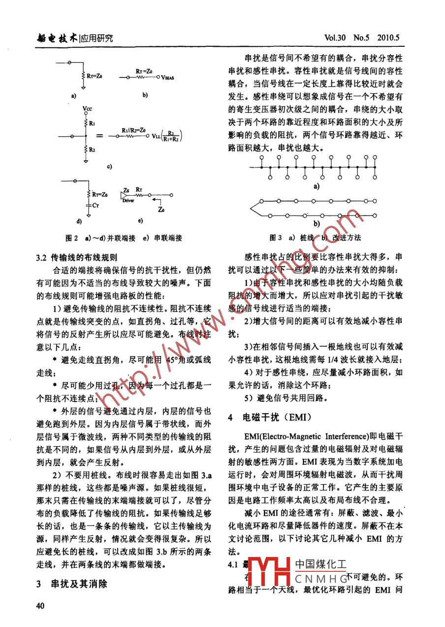 船電技術(shù)|應(yīng)用研究VoL.30 No.5 2010.5高速PCB設(shè)計(jì)技術(shù)李鵬飛(海軍工程大學(xué),武漢430033)摘要:在高速系統(tǒng)中,噪聲的產(chǎn)生是-一個(gè)最值得關(guān)注的焦點(diǎn),高頻信號(hào)很容易由于輻射而產(chǎn)生干擾,本文針對(duì)PCB設(shè)計(jì)介紹了幾種高速電路設(shè)計(jì)技術(shù),通過(guò)這些設(shè)計(jì)技術(shù),可以消除高頻噪聲.關(guān)鍵詞:高速PCB端接串?dāng)_EMI中國(guó)分類(lèi)號(hào): TP334.7文獻(xiàn)標(biāo)志碼: A.文章編號(hào): 1003-4862(2010)05-0038-04High Speed PCB Design TechnologyLi Pengfei(Naval Univ. of Engineering , Wuhan 430033, China)Abstract: In high speed system, the existence of noise is a focal point deserved to be pay attention to. Highfrequency signal is easy to produce interference due t0 radiation. For PCB design, several high speed circuitdesign technology are recommended in this paper through which can eliminate high frequency noise.Key words: high speed; PCB,; termination; crosstalk; EMI在高速電路板設(shè)計(jì)中最重要的考慮就是電源1引言的分配網(wǎng)絡(luò)。電源分配網(wǎng)絡(luò)必須為低噪聲的電路隨著系統(tǒng)設(shè)計(jì)復(fù)雜性和集成度的大規(guī)模提板.上各部分的電路,提供-一個(gè)低噪聲的電源。電高,電子系統(tǒng)設(shè)計(jì)師們正在從事100 MHz以上的源分配網(wǎng)絡(luò)同時(shí)還得為電路板上所有產(chǎn)生或接收電路設(shè)計(jì),總線(xiàn)的工作頻率也已經(jīng)達(dá)到或者超過(guò)信號(hào)提供一個(gè)信號(hào)回路。50MHz,有的甚至超過(guò)100MHz.目前約50%時(shí)2.1電源分配網(wǎng)絡(luò)作為電源鐘的設(shè)計(jì)頻率超過(guò)50 MHz,將近20%的設(shè)計(jì)主實(shí)際電源具有一定的阻抗,如圖1所示,圖頻超過(guò)120 MHz。在高速系統(tǒng)中,噪聲的產(chǎn)生是中以電阻、電感、電容網(wǎng)絡(luò)的形式表示。事實(shí)上,-一個(gè)最值得關(guān)注的焦點(diǎn),高頻信號(hào)很容易由于輻阻抗是分布在整個(gè)電源分配網(wǎng)絡(luò)中,因此,噪聲射而產(chǎn)生干擾,高速變化的數(shù)字信號(hào)會(huì)導(dǎo)致振鈴、將疊加在電源上。設(shè)計(jì)的目標(biāo)是要盡可能的減小反射、串?dāng)_等,除非使用高速電路設(shè)計(jì)技術(shù),否電源分配網(wǎng)絡(luò)的阻抗。則基于傳統(tǒng)方法設(shè)計(jì)的PCB將無(wú)法工作。oVcc因此,高速電路設(shè)計(jì)技術(shù)已經(jīng)成為電子系統(tǒng)設(shè)計(jì)師必須采取的設(shè)計(jì)手段。只有通過(guò)使用高速↓電路設(shè)計(jì)師的設(shè)計(jì)技術(shù),才能實(shí)現(xiàn)設(shè)計(jì)過(guò)程的可↓↓控性。圖1實(shí)際電源特 性圖.2電源 分配網(wǎng)絡(luò)及其影響電源分配網(wǎng)絡(luò)的形式可分為總線(xiàn)式和電源層式。早期的設(shè)計(jì),由于PCB加工工藝機(jī)成本的制約,中國(guó)煤化工.電源總線(xiàn)與信收稿日期: 2010-02-08號(hào)線(xiàn)M.HCNMH G件提供電源,同作者簡(jiǎn)介:李鵬飛(1978-), 男,工程碩士,研究方時(shí)還待為舊號(hào)線(xiàn)擁中工間,所以電源線(xiàn)總是趨于向:導(dǎo)航、制導(dǎo)與控制。38V.l.30 No.5 2010.5船電技術(shù)|應(yīng)用研究長(zhǎng)且細(xì)的帶狀線(xiàn)。這就相當(dāng)于電源線(xiàn)上串有一個(gè)小。如果傳輸線(xiàn)和負(fù)載端的阻抗不匹配,那么輸小電阻,盡管這個(gè)電阻很小,但它的影響卻很大。出的電流信號(hào)和信號(hào)最終的穩(wěn)定狀態(tài)將不同,這而對(duì)于電源層式的電源分配方案由于電源通過(guò)整就引起信號(hào)在接收端產(chǎn)生反射,這個(gè)反射信號(hào)將個(gè)層的金屬來(lái)分配電源,其電源阻抗會(huì)小得多,傳回信號(hào)發(fā)射端并再次反射回來(lái)。隨著能量的減所以電源噪聲也會(huì)比總線(xiàn)式的小得多。弱反射信號(hào)的幅度將減小,直到信號(hào)的電壓和電單電源層并不能消除電源的線(xiàn)路噪聲,因?yàn)榱鬟_(dá)到穩(wěn)定。.所有的系統(tǒng)產(chǎn)生足夠引起問(wèn)題的噪聲,不管采用3.1端接哪種電源分配方案,電源線(xiàn)路都需要抑制噪聲的傳輸線(xiàn)產(chǎn)生反射,導(dǎo)致信號(hào)失真,在負(fù)載端濾波。通常使用去藕電容來(lái)濾波,一般的,放置產(chǎn)生振鈴,使系統(tǒng)速度變慢,,所以需要-種技術(shù)一個(gè)1~10μF的去藕電容在電源接入電路板處,來(lái)消除,至少減小這個(gè)反射。由于反射在Zo=Zi濾除低頻噪聲;放置-一個(gè)0.01~0.1 μF的去藕電時(shí),才能消除,所以可以通過(guò)在負(fù)載端并聯(lián)- -個(gè)容在板上每- -個(gè)有源器件的電源管腳處,濾除高電阻來(lái)減小負(fù)載阻抗到Zr= Zo以消除第一次反射頻噪聲。一這種方 法稱(chēng)為并聯(lián)端接。也可以通過(guò)在輸出2.2電源分配網(wǎng)絡(luò)作為信號(hào)回路端串聯(lián)一個(gè)電阻來(lái)增加源阻抗到Zs= Zo以消除第信號(hào)開(kāi)關(guān)時(shí)能量的產(chǎn)生是高速電路中產(chǎn)生噪二次反射一-這種方法稱(chēng)為 串聯(lián)端接。聲的根源。任一信號(hào)的開(kāi)關(guān),都產(chǎn)生一個(gè)交流電并聯(lián)端接如圖2.a所示,由于輸入阻抗往往流,而電流需要一個(gè)回路,信號(hào)的回路可由VCC都很高,所以通常使R-=Zo,這種方法有一個(gè)缺或地提供。信號(hào)線(xiàn)與信號(hào)回路構