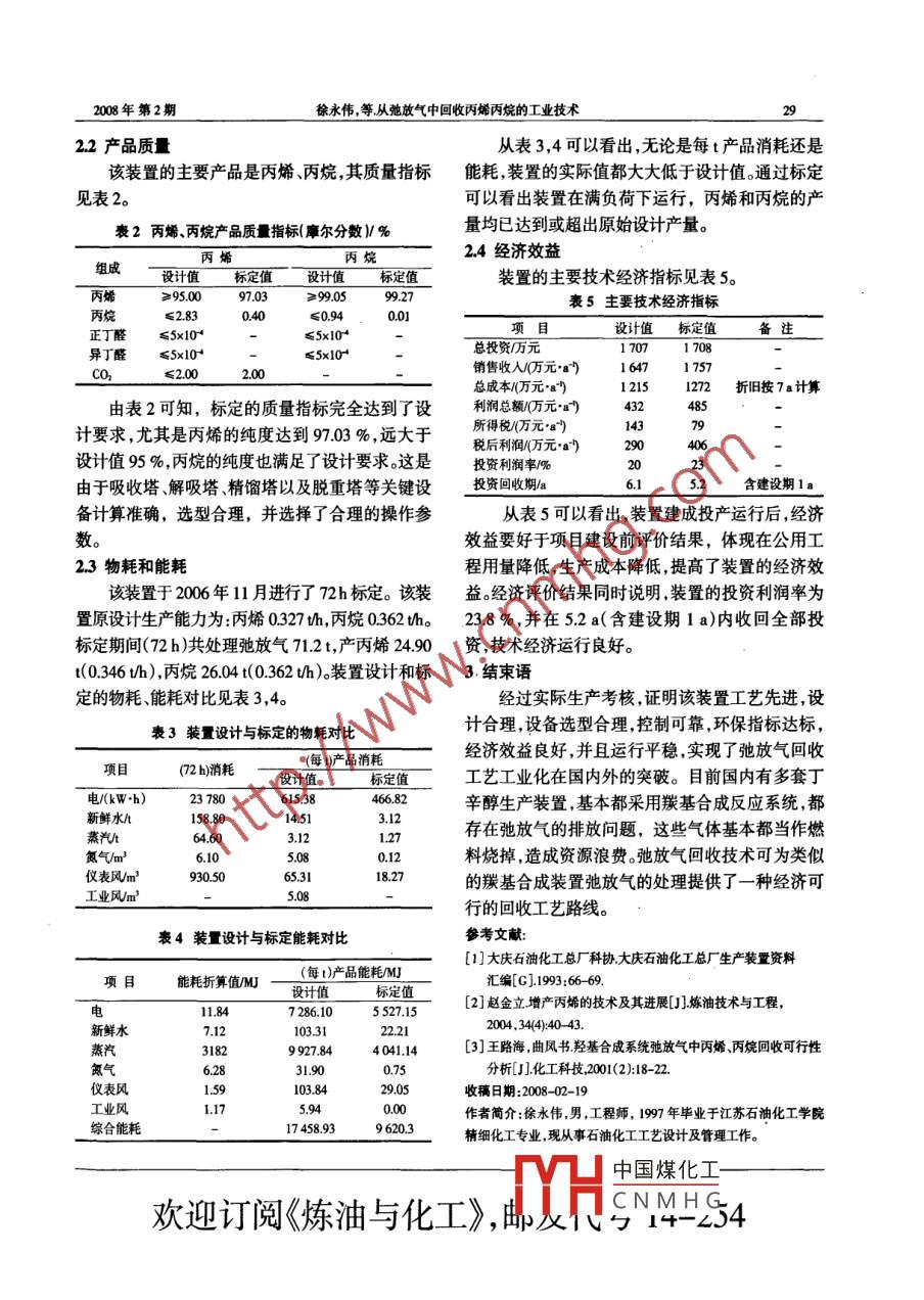 煉油與化工2008年第2期REFINING AND CHEMICAL INDUSTRY從弛放氣中回收丙烯丙烷的工業(yè)技術(shù)徐永偉,黃小科(大慶石化工程有限公司,黑龍江大慶163714)摘要:在實(shí)驗(yàn)室回收丙烯丙烷技術(shù)的基礎(chǔ)上,進(jìn)行了工業(yè)化實(shí)踐通過吸收解吸和精餾等工藝過程,冋收丁辛醇裝置弛放氣中的丙烷丙烯減少資源浪費(fèi)實(shí)現(xiàn)了資源的合理利用。關(guān)鍵詞:弛放氣;回收;丙烯;丙烷中圖分類號:TQ22文獻(xiàn)標(biāo)識碼:B文章編號:1671-4962(20080-0027-03大慶石化公司化工二廠丁辛醇裝置采用低壓驗(yàn)室回收技術(shù)試驗(yàn)結(jié)果的基礎(chǔ)上,進(jìn)行了弛放氣羰基合成技術(shù)生產(chǎn)丁辛醇。技術(shù)工藝是以丙烯和回收裝置的工業(yè)化設(shè)計(jì)。裝置弛放氣設(shè)計(jì)處理能力合成氣為原料反應(yīng)生成正、異丁醛,在此過程中有為68ka,回收丙烯和丙烷量為55ka,操作時(shí)少量的丙烯轉(zhuǎn)化為丙烷叫為了防止丙烷等惰性組間為8000ha分的積累,需要將一部分的氣體(簡稱弛放氣)從弛放氣回收工藝在國內(nèi)外還沒有相同或類似系統(tǒng)循環(huán)回路中連續(xù)排出。弛放氣中含有大量的的工業(yè)應(yīng)用,尚屬首例丙烷和丙烯(分別占3891%和4581%)由于弛1生產(chǎn)方法與工藝路線放氣組分復(fù)雜,難以處理,過去處理弛放氣的方法11生產(chǎn)方法是直接排入燃料氣管網(wǎng)作為燃料燒掉,造成了資源該工藝采用吸收、解吸、精餾技術(shù)回收弛放氣的浪費(fèi)。為回收丙烷、丙烯,在大慶化工研究中心實(shí)中的丙烯丙烷,從而得到丙烯丙烷等產(chǎn)品。表2脫硫前后柴油的烴類組成分析結(jié)果/%4結(jié)論分析項(xiàng)目脫硫前結(jié)果脫硫后結(jié)果超聲氧化脫硫方法,實(shí)質(zhì)上是利用氧化劑上鏈烷烴氧原子對含硫化合物中硫原子的親電加成而生成520317亞砜類或砜類。從超聲氧化脫硫?qū)嶒?yàn)過程看,油品環(huán)烷烴脫硫效果比較好。硫含量、總芳烴含量降低很多;二環(huán)烷烴飽和烴增加,超聲氧化脫硫產(chǎn)品性質(zhì)有明顯的改235善。是實(shí)現(xiàn)清潔汽、柴油生產(chǎn)的有效方法之一,具單環(huán)芳烴134有一定的現(xiàn)實(shí)意義和應(yīng)用價(jià)值。理論上,超聲輔助烷基苯茚滿或四氫萘類柴油深度氧化-萃取脫硫工藝與加氫脫硫工藝相茚類比,投資和操作費(fèi)用低、操作條件緩和、不需要?dú)潆p環(huán)芳烴9308源、能耗很低、能生產(chǎn)超低硫油品,具有很好的前茶類景。成本僅為加氫成本的1/10,具有很好的研究開苊類5發(fā)價(jià)值。苊烯類參考文獻(xiàn)品的餾程沒有大的變化飽和烴增加總芳烴含量3)0最三環(huán)芳烴0.7[]馬伯文清潔燃料生產(chǎn)技術(shù)[M]北京中國石化出版社2004:2從表1,2可以看出,柴油經(jīng)超聲氧化萃取脫2】荊國華,李偉施耀柴油生物脫硫技術(shù)研究進(jìn)展1化學(xué)工程硫后,柴油密度降低、硫含量降低很多、原料與產(chǎn)等用H,有機(jī)酸氧化脫出柴油中的有中國煤化工337降低很多。是因?yàn)椴裼椭薪^大部分大分子的苯并收稿日CNMHG噻吩類硫化合物被脫除的緣故。超聲氧化脫硫后作者簡H9研咒生,4平平業(yè)于遼寧石油化工大產(chǎn)品性質(zhì)有明顯的改善。學(xué)化學(xué)工藝專業(yè),現(xiàn)從事煉油生產(chǎn)工藝研究工作煉油與化工REFINING AND CHEMICAL INDUSTRY第19卷12工藝路線重的吸收劑再補(bǔ)進(jìn)循環(huán)吸收劑中使用。另一部分來自丁辛醇裝置的弛放氣經(jīng)緩沖罐進(jìn)行氣液再經(jīng)過冷卻器冷卻到一定溫度后返回吸收塔,作分離后進(jìn)入吸收塔塔底,吸收劑從塔頂進(jìn)入,將弛為吸收劑循環(huán)使用。放氣中的丙烯和丙烷吸收下來并從塔底流出,塔由解吸塔頂解吸出的丙烯和丙烷經(jīng)壓縮機(jī)升頂氣排至燃料氣管網(wǎng)。吸收塔塔底物料經(jīng)換熱器壓后,進(jìn)入精餾塔進(jìn)行精餾分離。精餾塔塔頂產(chǎn)出換熱升溫后,進(jìn)入解吸塔進(jìn)行解吸解吸后的吸收丙烯,塔釜產(chǎn)出丙烷。丙烯、丙烷再分別進(jìn)入產(chǎn)品劑從解吸塔底分出,經(jīng)過與吸收塔塔底物料換熱罐作為產(chǎn)品出廠。降溫后,其中一部分送至脫重塔脫重,經(jīng)脫重塔脫弛放氣回收工藝流程見圖1。尾氣去燃料氣管網(wǎng)馳放氣來自化二丙烯去外網(wǎng)@1琴T3VI丙烷去裝車重組分出裝置圖1弛放氣回收工藝流程弛放氣裝置操作具有5個(gè)特點(diǎn)吸收塔、精餾塔和脫重塔采用天津大學(xué)開發(fā)的高(1)工藝簡單,操作方便,產(chǎn)品收率高。采用低效填料精餾塔采用格里奇公司的高效塔盤,有效溫吸收、低壓升溫解吸、分段精餾工藝技術(shù),生產(chǎn)保證分離效果。全部設(shè)備和材料均可在國內(nèi)生產(chǎn)過程容易控制丙烯和丙烷收率大于90%。制造,工程費(fèi)用比較低。(2)吸收劑來源方便,易于回收處理。選用吸2投產(chǎn)后的效果對比分析收劑為丁辛醇生產(chǎn)過程的中間產(chǎn)品丁醛,所回收21弛放氣原料的溶劑可以返回丁辛醇裝置使用或作為產(chǎn)品出弛放氣原料組分見表1。售,有利于資源綜合利用。表1設(shè)計(jì)與標(biāo)定原料組分摩爾分?jǐn)?shù)%(3)工程設(shè)計(jì)中優(yōu)化流程采取有效的節(jié)能措組分設(shè)計(jì)原料標(biāo)定原料施,降低裝置的物耗和能耗。充分利