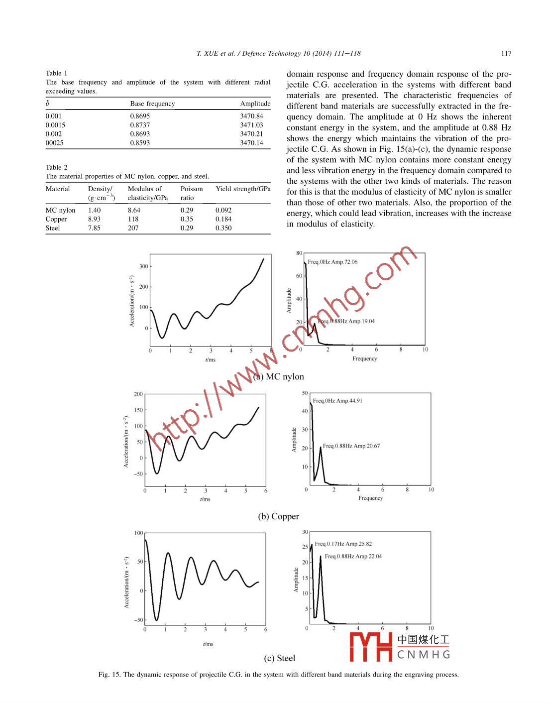 Available online at www.sciencedirect.comDefenceTechnologyScienceDirectCrossMark中國(guó)兵工學(xué)會(huì)Defence Technology 10 (2014) 11-118www.elsevier.com/locate/dtDynamic analysis of a guided projectile during engraving processTao XUE a, Xiao-bing ZHANG a.*, Dong-hua cUIba School of Energy and Power Engineering, Nanjing University of Science and Technology Nanjing 210094, Chinab Navy Academy of Armament, Beijing 100061, ChinaReceived 10 December 2013; revised 14 March 2014; accepted 7 May 2014Available online 20 May 2014AbstractThe reliability of the electronic components inside a guided projectile is highly affected by the launch dynamics of guided projectile. Thengraving process plays a crucial role on determining the ballistic performance and projectile stability. This paper analyzes the dynamic responseof a guided projectile during the engraving process. By considering the projectile center of gravity moving during thengravingprocess, adynamics model is established with the coupling of interior bllistic equations. The results detail the stress situation of a guided projectile bandduring its engraving process. Meanwhile, the axial dynamic response of projectile in the several milliseconds following the engraving process isalso researched. To further explore how the different performance of the engraving band can affect the dynamics of guided projectile, this paperfocuses on these two aspects: (a) the effects caused by the different band geometry; and (b) the effects caused by different band materials. Thetime domain and frequency domain responses show that the dynamics of the projectile are quite sensitive to the engraving band width. Amaterial with a small modulus of elasticity is more stable than one with a high modulus of elasticity.Copyright◎2014, China Ordnance Society. Production and hosting by Elsevier B.V. All rights reserved.1. Introductionguided projectile. Jiang and Guo [3] dealt with the linear dy-namic response of a gun, including the effects of projectileGuided projectile is meant to be a precision location strikegravity and acceleration. Wang and Zhang [5] established thesystem and have the excellent accuracy of impact due to thedynamics model of projectile in consideration of the actualdelicate design of the inner electronic components. But if themovement of the projectile and inertial breech. Also, Chu andelectronic components do not work well in the projectile, itsZu [6] and Cordes et al. [7] analyzed various reasons whichaccuracy will be impaired. The dynamics of a guided projec-cause the unexpected projectile vibration, such as the masstile have been observed to cause a large number of electronicsbias, static unbalance and dynamic unbalance.failures in projectile, such as the impact and the separationFrom these researches, it can be known the vibration of theamong electronic components, which are described in Ref. [1].projectile frequently takes place in the barrel. However, theThere have been previous studies about the dynamics of thevibration which could cause the failure of inner electroniccomponents may take place at the moment when the projectileis experiencing loads, especially in a strong transient situation[3-7]. During the engraving process, the band is squeezedE-mail address: zhangxb680504@ 163.com (X B. ZHANG)into the gun bore by the high-pressure propellant gas. BecausePeer review under responsibility of China Ordnance Societyof the stringent requirement of preventing the propellant gasleakage, the diameter of the band around the projectile islarger than the inner diameter of barrel, which is called theLSEVIER Production and hosting by EIsevierradial exceeding中國(guó)煤化工has to overcomeMHCNMH Ghtp://dx. doi.org/10 1016/j.dt.2014.05.0032214-9147/Copyright◎2014, China Ordnance Society. Production and hosting by EIsevier B.V. All rights reserved.12T. XUE et al. / Defence Technology 10 (2014) 11-118the resistance R() when it is pushed into the gun bore by thepropellant gas, as shown in Fig. 1. The radial exceeding valueis shown in Fig. 2.pd(). RO.According to the experiments in Refs. [8] and [9], the timeof the engraving process is only about a few milliseconds, theresistance R(t) reaches 123 kN [9], but it drops to slidingfriction instantaneously at the end of the engraving process.The transient resistance is changed to be about 120 kN.However, Jin [8,9] focused on the deformation of the band andneglected the dynamic response of the projectile in theexperiment. Therefore, it is important to investigate the dy-namic response of the guided projectile during the engravingprocess. Meanwhile, since the resistance disappears abruptlyafter the band completely enters the gun bore, it is quiteFig. 2. Partially enlarged drawing of touch between band and barrel.necessary to explore the dynamic response of the guidedprojectile in the milliseconds following the engraving process.engraving dynamic model. Since the pressure on the base ofHence, the purpose of this paper is to study the axial dy-the projectile is generated by propellant gas, the engravingnamics characteristics of the guided projectile during thedynamic model must include the equation of propellantengraving process. The underlying idea for the guided pro-jectile is analogous to the analytic method in Refs. [2], inburning rate and the equation of propellant shape. And thewhich the projectile center of gravity (C.G.) moves backwardvelocity equation and the energy conservation equation shouldbe considered to form the interior ballistic equations.when the projectile is compressed by gas pressure. Jin's one-A lumped parameter model [8] is a simple but useful rep-dimensional engraving model which was established byresentation of the interior ballistic cycle, embodying such as-coupling with the interior ballistic equations was used to gainthe axial engraving resistance. The dynamic response of thesumptions as uniform and simultaneous ignition of the entireguided projectile in the severa