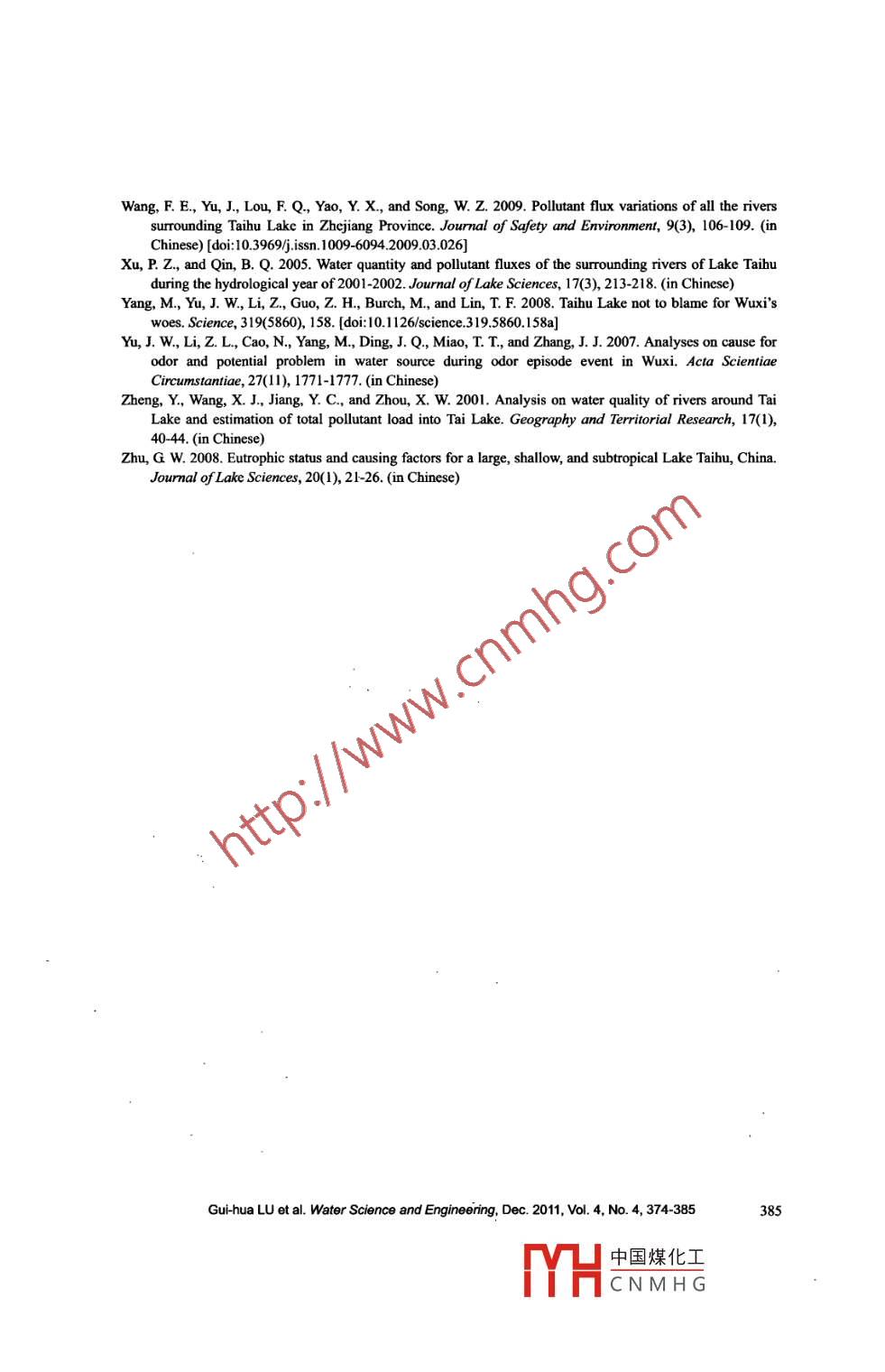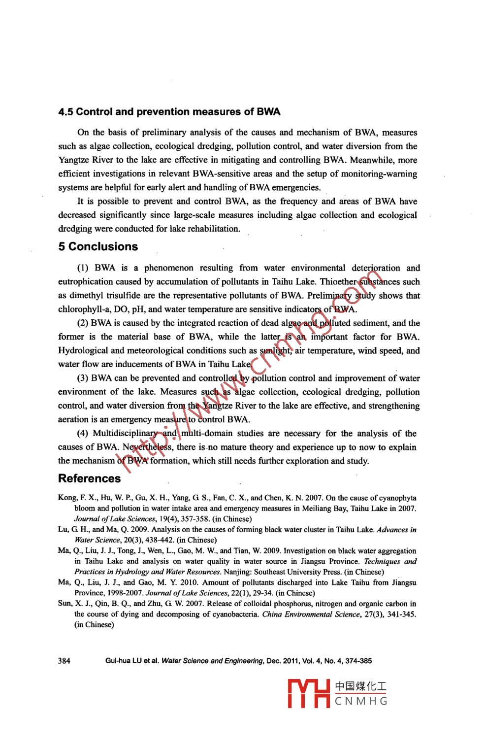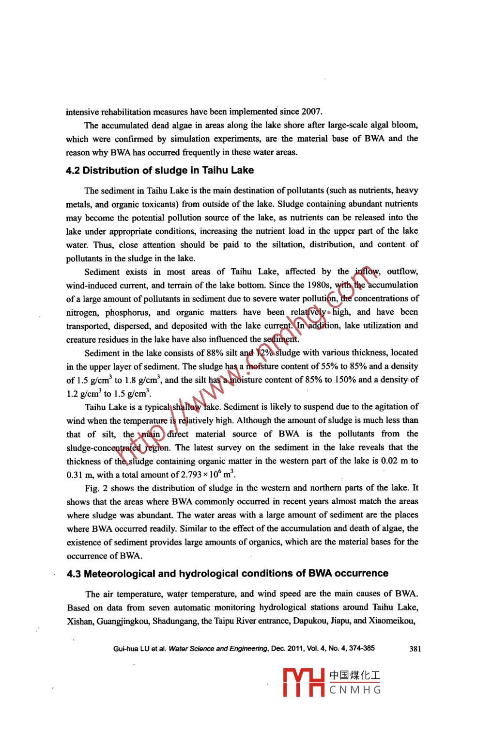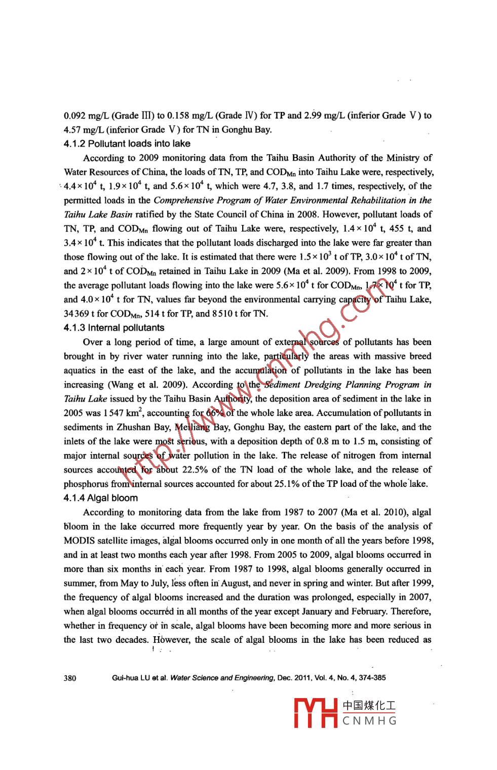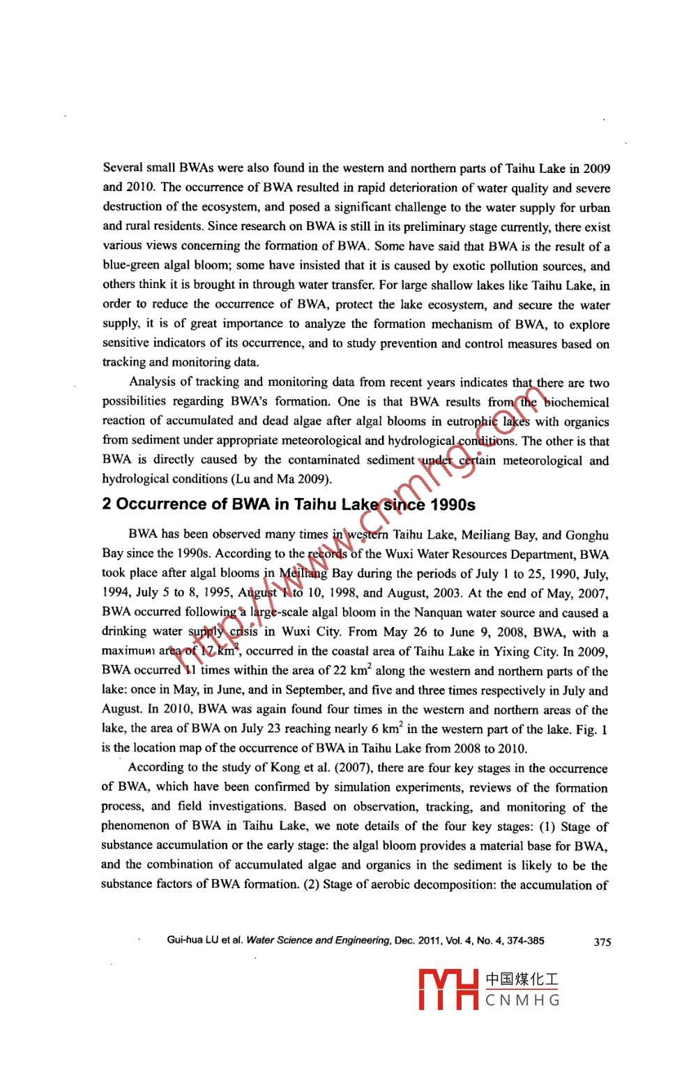 Water Science and Engineering, 2011, 4(4): 374-385doi:10.3882/jissn. 1674-2370.2011.04.002htp:/www.waterjourmal.cne-mail: wse2008@vip.163.comAnalysis of black water aggregation in Taihu LakeGui-hua LU*", Qian MA2, Jian-hua ZHANG'1. National Engineering Research Center of Water Resources Effcient Utilization and Engineering Safety,Hohai University, Nanjing 210098. P. R. China2. Hydrology and Water Resources Investigation Bureau ofJiangsu Province, Nanjing 210029, P. R. China.3. Water Resources Department of Jiangsu Province, Nanjing 210029, P R. ChinaAbstract: Black water aggregation (BWA) in Taibu Lake is a disaster for the lake environment. Itisa phenomenon resulting from water environmental deterioration and eutrophication caused byaccumulation of pollutants in the lake, according to research on the water quality, pollutants of BWA,and occurrence mechanisms of BWA. Dead algae arc the material basc of BWA, the pollutedsediment is an important factor for ithe formation of BWA, and hydrological and meteorologicalconditions such as sun light, air temperature, wind speed, and water flow are the other factors thatmay lead to the formation of BWA. Thioether substances such as dimethyl trisulfide are therepresentative pollutants of BWA. Parameters such as chlorophyll-a, DO, pH, and water temperatureare sensitive indicators of BWA. Measures such as algac collection, ecological dredging, pollutioncontrol, and water diversion from the Yangtze River to the lake, are effective, and strengtheningaeration is an emergency measure to control BWA.Key words: black water aggregation; water quality indicator; control measure; Taihu Lake1 IntroductionBeing one of the five largest freshwater lakes in China, Taihu Lake is of vital importancein regional flood control and water supply. Accounting for about 0.4% of the land area and3.5% of the population in China, the Taihu Lake Basin creates more than 11% of the nationalgross domestic product (GDP) and 20% of the national fiscal revenue. With the mostcentralized urban areas, a highly developed economy, and the greatest social productivity, thebasin plays a large role in the socio- economic development as one of the core areas in China.Black water aggregation (BWA) appeared at the Nanquan water source in Gonghu Bay inthe northerm part of Taihu Lake at the end of May in 2007. The drinking water supply formillions of people in Wuxi City near the lake had to be cut off because the water was sopolluted and cannot be purified to the required standard, causing a water supply crisis thatshocked the world. BWA appeared again in the coastal areas of Zhoutie Town and Dapu Townin Yixing City in Taihu Lake at the end of May in 2008, with a maximum area of up to 17 km2.It was scattered over the area and took a week to disappear gradually with the wind waves.This work was supported by the National Water Project of China (Grant No. 2008ZX07101-011).*Corresponding author (e-mail: lugh@hhu.edu.cn)Received May 31, 2011; accepted Oct.16, 2011中國(guó)煤化工YHCNMHG.Several small BWAs were also found in the western and northern parts of Taihu Lake in 2009and 2010. The occurrence of BWA resulted in rapid deterioration of water quality and severedestruction of the ecosystem, and posed a significant challenge to the water supply for urbanand rural residents. Since research on BWA is still in its preliminary stage currently, there existvarious views concerming the formation of BWA. Some have said that BWA is the result of ablue-green algal bloom; some have insisted that it is caused by exotic pollution sources, andothers think it is brought in through water transfer. For large shallow lakes like Taihu Lake, inorder to reduce the occurrence of BWA, protect the lake ecosystem, and secure the watersupply, it is of great importance to analyze the formation mechanism of BWA, to exploresensitive indicators of its occurrence, and to study prevention and control measures based ontracking and monitoring data.Analysis of tracking and monitoring data from recent years indicates that there are twopossibilities regarding BWA's formation. One is that BWA results from the biochemicalreaction of accumulated and dead algae after algal blooms in eutrophic lakes with organicsfom sediment under appropriate meteorological and hydrological conditions. The other is thatBWA is directly caused by the contaminated sediment under certain meteorological andhydrological conditions (Lu and Ma 2009).2 Occurrence of BWA in Taihu Lake since 1990sBWA has been observed many times in westerm Taihu Lake, Meiliang Bay, and GonghuBay since the 1990s. According to the records of the Wuxi Water Resources Department, BWAtook place after algal blooms in Meiliang Bay during the periods of July 1 to 25, 1990, July,1994, July 5 to8, 1995, August 1 to 10, 1998, and August, 2003. At the end of May, 2007,BWA occurred following a large-scale algal bloom in the Nanquan water source and caused adrinking water supply crisis in Wuxi City. From May 26 to June 9, 2008, BWA, with amaximunn area of 17 km', occurred in the coastal area of Taihu Lake in Yixing City. In 2009,BWA occured 11 times within the area of 22 km2 along the western and northem parts of thelake: once in May, in June, and in Septermber, and five and three times respectively in July andAugust. In 2010, BWA was again found four times in the western and norther areas of thelake, the area of BWA on July 23 reaching nearly 6 km2 in the westerm part of the lake. Fig. 1is the location map of the occurrence of BWA in Taihu Lake from 2008 to 2010.According to the study of Kong et al. (2007), there are four key stages in the occurrenceof BWA, which have been confirmed by simulation experiments, reviews of the formationprocess, and field investigations. Based on observation, tracking, and monitoring of thephenomenon of BWA in Taihu Lake, we note details of the four key stages: (1) Stage ofsubstance accumulation or the early stage: the algal bloom provides a material base for BWA,