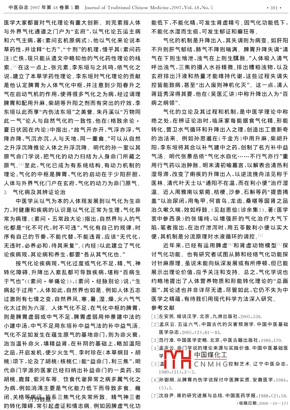 中醫(yī)雜志2007年第48卷第5期 Journal of Traditional Chinese Medicine,2007,Vol.48,No.5389·理論探討·論氣化學(xué)說孟慶云(中國中醫(yī)科學(xué)院基礎(chǔ)理論研究所,北京市東直門內(nèi)南小街16號,100700摘要]氣化學(xué)說是以氣的運動變化來闡述人體代謝和精氣神轉(zhuǎn)化的理論。自《內(nèi)經(jīng)》確立氣化概念并以升降出入為基本機制以后,劉完素以氣化論病機和藥性,張元素發(fā)揮為氣化藥性論,李東垣以脾胃為氣化中樞,繼后孫一奎把氣化原動力歸于命門,遂使氣化理論逐漸完善。氣化學(xué)說不僅是辨證論治的指規(guī),也是構(gòu)建中藥藥理學(xué)的理論資源。關(guān)鍵詞]氣化學(xué)說;中醫(yī)理論;氣化病氣化學(xué)說是以氣的運動變化來論述人體生命過程據(jù)之一,以后進一步發(fā)揮為氣化感應(yīng)論,之后的氣一元的理論。自從《內(nèi)經(jīng)》構(gòu)建其基本理論以來,后世不斷發(fā)論認(rèn)為,人與自然皆由氣構(gòu)成的同一性,可以由天地之展補充。在晚期匯入《內(nèi)經(jīng)》的“七篇大論”中,氣化概念氣應(yīng)象人體。古人觀測到天地之運動是“天左旋,地右更為寬泛,認(rèn)為宇宙萬物“各從其氣化也”(《素問·氣動”(《春秋緯·元命苞》),《內(nèi)經(jīng)》又以左升右降為宇宙交變大論》),以氣化為一切自然現(xiàn)象的根本特征,升降氣化的一般規(guī)律,《素問·陰陽應(yīng)象大論》所謂“左右出入為基本機制;金元時代的劉河間,以氣化論病機和者,陰陽之道路也”論臟腑氣化升發(fā)則是“肝生于左,肺藥性,張元素也提出了氣化藥性論,李東垣以脾胃為人藏于右”(《素問·刺禁論》),自然界之升降是“清陽為體氣化中樞,以少陽之氣為啟動氣化之先機,創(chuàng)立脾胃天,濁陰為地”,人體則是“清陽出上竅,濁陰出下竅論,為一些疾病的治療提供了新思路、新方法;明代孫《內(nèi)經(jīng)》中還有重要的定則,把《素問·六微旨大論》提奎把人身氣化的原動力歸于命門,創(chuàng)動氣命門學(xué)說。出的“亢害承制論”,作為人體自我調(diào)節(jié)機制,并非來自由是而使氣化學(xué)說日趨系統(tǒng)完善,成為指導(dǎo)辨證論治人體實驗,而是從氣象的氣化規(guī)律推演到人體的。的重要理論。觀念可以開發(fā)知覺,古人在氣化意識的觀察中積1氣化學(xué)說的理論淵源累了自然與生命的氣化現(xiàn)象,例如在一年四季中,人和《內(nèi)經(jīng)》氣化理論有三個來源:一是關(guān)于先秦氣論動植物都有生、長、化、收、藏之化之變。除在歸納中發(fā)的哲學(xué)思想;二是天人相應(yīng)的觀念;三是在此二者理念現(xiàn)聯(lián)系之外,又從外而推測其內(nèi),從內(nèi)而推遠(yuǎn)外,即《靈下對觀察和實踐資料的整理提升。樞·外揣》之“若是則內(nèi)外相襲,若鼓之應(yīng)桴,響之應(yīng)氣是中國古代哲學(xué)的一個重要概念。先秦諸子百聲,影之似形。故遠(yuǎn)者司外揣內(nèi),近者司內(nèi)揣外?!庇梢约医匝詺狻!蹲髠鳌氛摗傲鶜狻?《國語》言天地陰陽之氣,此建立了氣化理論的研究方法。氣已經(jīng)是一個涵蓋自然、社會和人生的普遍概念。《管由上述理路、觀念和方法論構(gòu)建起來的氣化學(xué)說,子》的精氣根源論,《鹖冠子》的元氣自然論,皆以氣為也必與之相因,氣化學(xué)說的特色有四:一是重視時間因人和萬物之本體。自稱老子弟子的文子在所著《文子·素,氣化是一個過程漸變?yōu)榛?劇化為變,在生命世界下德》篇說:“陰陽陶也萬物乘一氣而生?!薄肚f子·知中,氣化的生命過程是不可逆的,故《內(nèi)經(jīng)》兩次論及北游》以氣的變化論生命的發(fā)生:“雜乎芒芴之間而有“神轉(zhuǎn)不回”;二是氣化規(guī)律的普適性,認(rèn)為天人一體皆氣,氣變而有形,形變而有生?!薄盾髯印酚诌M一步發(fā)展從氣化,例如《素問·陰陽應(yīng)象大論》所論的“形歸氣為:“人有氣,有生,有知,亦有義,故為天下貴也。”說人氣歸精,精歸化”既是食物、藥物在人體氣化的規(guī)律,也的生命就是由于氣而生發(fā),由構(gòu)成論發(fā)展為生成論。是人的高級生命活動生長發(fā)育的規(guī)律,乃至自然界的人與天地相應(yīng)是氣化理論的意象依據(jù),也是氣化規(guī)律中國煤化工時征,氣化理論不是來自學(xué)說闡述的規(guī)律之一。遠(yuǎn)古以降從事農(nóng)牧業(yè)的先民們,解剖CNMHG方式推揣而來;四是觀觀察作物及人的生長,和一年春夏秋冬時序的關(guān)系,萌察推理始終賈穿看動態(tài)觀忿,以此“氣化流行,生生不育了“貴時”觀念?!兑讉鳌は蟆す?jié)卦》有“天地節(jié)而四時息”。這也與《易傳·系辭》“以動尚其變和《易緯》“元成”之論,以人與天地同步的生命現(xiàn)象為天人相應(yīng)的論氣變異”的思想相一致。聯(lián)系方式2人體氣化的過程機制(010)64745015早在《內(nèi)經(jīng)》即已論述了人體氣化有“食氣化精”和390中醫(yī)雜志2007年第48卷第5期 Journal of Traditional Chinese Medicine,2007,Vol.48,No.5形能轉(zhuǎn)化”兩種形式。食氣化精是人體與外界環(huán)境的氣化的另一種形式是“形能(讀作tai)轉(zhuǎn)化”,即物質(zhì)交換,包括飲食的消化、吸收、排泄和氣體交換。食精、氣、神三者之間的轉(zhuǎn)化,是生命活動的高級形式。物氣化過程如《素問·經(jīng)脈別論》所述:“