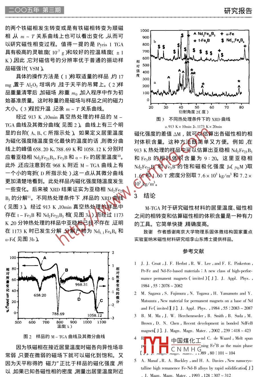 現(xiàn)代儀器○O五年第三期」熱重分析儀TGA測(cè)定磁性材料的相轉(zhuǎn)變?cè)@如*戴慶平(南京大學(xué)現(xiàn)代分析中心南京21093)摘要本文利用帶有磁場(chǎng)的熱重分析儀M-TGA對(duì)Fe3B合金中加入元素Nd造成的合金相轉(zhuǎn)變和各相含量等進(jìn)行研究。研究發(fā)現(xiàn)在FeB合金中加入適量的稀土元素Nd將導(dǎo)致合金相組成由四角FeH(t-FeB)為t-Fe3B和亞穩(wěn)相Nd2Fe23B3。與常規(guī)熱分析儀器DA相比高靈敏的M-TA可以更加凊楚地觀察到具有鐵磁性轉(zhuǎn)變的磁性材料相變過(guò)程。關(guān)鍵詞熱重分析相轉(zhuǎn)變磁性材料引言NdFeB合金以其優(yōu)異的綜合磁性能將永磁材料321發(fā)展推向高潮-9。研究NFeB三元合金的成分與相組成是得到高性能的關(guān)鍵。但是,NFeB三元合金相圖十分復(fù)雜而且對(duì)成分非常敏感。本文利用帶有磁場(chǎng)的熱重分析儀M-TGA研究含Nd的Fe3B765三元合金的相組成及其隨熱處理溫度的變化4321實(shí)驗(yàn)方法1000在真空電弧熔煉爐內(nèi)將成分為(FeNd4.)3B溫度(k)的合金反復(fù)熔煉5次以保證成分均勻化。將合金圖1樣品的DA曲線(升溫速率為10K/min)鑄錠在真空快淬爐內(nèi)以36m/s的速度快淬成絲狀?質(zhì)處于梯度磁場(chǎng)中時(shí)其自身被磁場(chǎng)的磁仳產(chǎn)生與非晶條帶。其熱行為和磁性相變由用 Perkin elmer磁場(chǎng)相吸的作用。相互作用力F表示為DA7型差熱分析儀和帶有磁場(chǎng)的 Pyris 1 TGA熱重F(1)分析儀表征。微結(jié)構(gòu)變化通過(guò)ⅹ射線衍射來(lái)分析。2結(jié)果與討論這里為真空磁導(dǎo)率,。廠是樣品處的磁場(chǎng)梯度。M和γ分別是樣品的磁化強(qiáng)度和體積。磁場(chǎng)在36ms的轉(zhuǎn)速下合金帶為完全非晶狀態(tài)。是由四根均勻分布在圓周上的NdeB圓柱形磁鐵為研究非晶帶的晶化過(guò)程,首先用DA對(duì)其熱行為組成。樣品放置在磁鐵圓環(huán)的軸線上這樣樣品處進(jìn)行研究。加熱速度為10K/min溫度范圍為373K的磁場(chǎng)梯度垂直向下。因?yàn)闃悠肺恢煤蜆悠诽幫鈭?chǎng)到1123K。該樣品的DA曲線(見(jiàn)圖1)由圖1可梯度大小不變所以從1試式可得出相互作用力F的知該樣品DTA曲線似乎有三個(gè)放熱峰但后兩個(gè)大小正比于樣品的磁化強(qiáng)度M。即天平稱得的磁十分不明顯灘以確定。力″與樣品的磁化強(qiáng)度M成正比。為進(jìn)一步證實(shí)第一峰后面是否存在某些變化如果鐵磁材料放在熱重分析儀的天平托盤上稱對(duì)樣品進(jìn)行M-TGA測(cè)量。這里首先介紹一下M-重就會(huì)表現(xiàn)出增重的特點(diǎn)。如果樣品被加熱到TcTA的工作原理里。鐵磁性材料都存在一個(gè)磁有序溫以中國(guó)煤化工重的特點(diǎn)。這樣測(cè)量度即居里溫度T當(dāng)溫度低于Tc的時(shí)候材料表的天CNMHG關(guān)系實(shí)際上是間接反現(xiàn)出鐵磁性的特點(diǎn)。當(dāng)溫度高于它的T時(shí)原來(lái)是映出樣品內(nèi)磁化強(qiáng)度M與溫度T的關(guān)系鐵磁性的材料表現(xiàn)岀順磁性的特點(diǎn)。當(dāng)鐵磁性的物除此之外如果樣品內(nèi)部有飽和磁化強(qiáng)度不同作者通信袁鉆如 e-mail : ziyuan01@16336二OO五年第三期」研究報(bào)告的兩個(gè)鐵磁相發(fā)生轉(zhuǎn)變或是有鐵磁相轉(zhuǎn)變?yōu)轫槾?0相從m~T關(guān)系曲線上也可以看出變化隊(duì)而可A N, FexB, a-Fe以研究磁性相變過(guò)程。值得一提的是Pyis1TGAs Nd,, Fe Be具有極高的靈敏度(10g)和較好的控溫精度(±1K)因此它對(duì)磁信號(hào)的分辨率優(yōu)于普通的振動(dòng)樣相600品磁強(qiáng)計(jì)VSM強(qiáng)400具體的操作方法是(1稱取適量的樣品約17度3\mg置于Al2O3坩堝內(nèi)掛于天平的吊臂上。(2樣品重量清零后加磁場(chǎng)稱重mo加入程序中作為初始基準(zhǔn)質(zhì)量。這時(shí)稱量的是磁場(chǎng)與樣品之間的磁力大小。(3程控升溫記錄m~T關(guān)系曲線。行射角度2度)經(jīng)過(guò)913K0min真空熱處理的樣品的M-圖3不同熱處理?xiàng)l件下的XRD曲線TGA曲線及其微分曲線見(jiàn)圖2)曲線上有三個(gè)明913K×10minb.1173K×20min顯的臺(tái)階(AB、C所指示處)如果定義居里溫度磁化強(qiáng)度的差值△M,就可以估算出各磁性相的相為磁化強(qiáng)度隨溫度變化最快的溫度的話則微分曲對(duì)體積含量。這種方法既簡(jiǎn)單又方便。例如,在線上的峰值658.20K、7869K和1058.12K分別對(duì)913K熱處理的樣品中可以估算出亞穩(wěn)相Nd2Fe23B3應(yīng)著亞穩(wěn)相 Nd2 Fey2B3、Fe2B和a-Fe的居里溫度。和Fe2B的相對(duì)體積含量為9:20。這里亞穩(wěn)相此外還應(yīng)注意到在968K附近M-TGA曲線上有Nd2Fe23B3和FeB的飽和磁極化強(qiáng)度J(M)取個(gè)小的彎折D所指示處)這一點(diǎn)從其微分曲線1.61和1.60T密度分別取7.6×10k/m和7.2更加清楚地看到。此處樣品內(nèi)磁化強(qiáng)度隨溫度發(fā)生10 kg/m些變化。后來(lái)被XRD結(jié)果證實(shí)為亞穩(wěn)相Nd2Fe2B3的分解。不同熱處理?xiàng)l件下樣品的XRD曲線3結(jié)論見(jiàn)圖3)經(jīng)過(guò)913KA0min真空熱處理的樣品中MTGA對(duì)于研究磁性材料的居里溫度、磁性相存在t-FeB和NdFe3B3見(jiàn)圖3a)而經(jīng)過(guò)113之間的相轉(zhuǎn)變和估算磁性相的體積含量是一種有力K20分鐘熱處理的樣品中亞穩(wěn)相已經(jīng)不存在證明的工具。它簡(jiǎn)單快捷精確度高。在1173K時(shí)已發