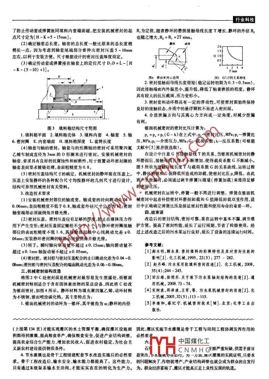 行業(yè)科技污水泵密封的改造◆陳煒明(福建省泉州市排水管理中心)[摘要]本文分析了污水泵常見(jiàn)密封形式及影響密封的因素,對(duì)污滑動(dòng),從而防止流體泄漏。水泵填料式密封進(jìn)行機(jī)械密封改造,給出改造方法及改造技術(shù)要污水泵中常用的機(jī)械密封結(jié)構(gòu)有兩種形式:一種方案是在潛求。文中對(duì)機(jī)械式密封做出進(jìn)一步改進(jìn),并應(yīng)用到了排水管理中心水污水泵的油室 里安裝-套雙端面機(jī)械密封(見(jiàn)圖2);另一種方的現(xiàn)有設(shè)備中,取得了良好的密封效果及經(jīng)濟(jì)效益。案是在污水泵油室里設(shè)置- -套單端面機(jī)械密封,而另一套設(shè)置在[關(guān)鍵詞]污水泵填料密封 機(jī)械密封改造泵腔,使用在所抽送的污水介質(zhì)中。污水處理工程是環(huán)境保護(hù)的重要項(xiàng)目,而污水泵作為污水處理工程的主要配套設(shè)備被廣泛應(yīng)用于城市排污、礦山、冶金電力以及石化等污水處理作業(yè),發(fā)展前景廣闊。污水泵產(chǎn)品除了要求技術(shù)性能好之外,密封是污水泵的關(guān)鍵,必須可靠性高,污水泵無(wú)故障運(yùn)行時(shí)間長(zhǎng)。污水泵在工作中,密封- -旦失效,外部介質(zhì)或油室中的油便會(huì)進(jìn)人電機(jī)腔,引起潛水電機(jī)缺相、短路、漏電燒壞電機(jī),甚至影響人身安全。因此,為了進(jìn)一-步 提高污水泵使用的安全圖2機(jī)械密封的結(jié)構(gòu)示意圖性、運(yùn)行可靠性以及提高污水泵無(wú)故障運(yùn)行時(shí)間,有必要對(duì)污水泵1-軸套;2- -動(dòng)環(huán)輔助密封圈;3-動(dòng)環(huán);4 -密封墊片;5一靜通常使用的機(jī)械密封進(jìn)行結(jié)構(gòu)分析,實(shí)行改進(jìn)。環(huán);6一靜環(huán)輔助密封圈圖機(jī)械密封通常由動(dòng)環(huán)、靜環(huán)、壓緊元件和-、常用的密封形式及不足目前,污水泵產(chǎn)品常用的密封形式有兩種:填料密封和機(jī)械密密封元件組成。其中動(dòng)環(huán)和靜環(huán)的端面組成- - 對(duì)摩擦副,動(dòng)環(huán)靠封。填料密封,如圖1所示,是最古老的一種密封結(jié)構(gòu),發(fā)源于工密封室中液體的壓力使其端面壓緊在靜環(huán)端面上,并在兩環(huán)端面業(yè)革命之前的傳統(tǒng)密封裝置,有著100年的材料工藝、潤(rùn)滑劑系統(tǒng)上產(chǎn)生適當(dāng)?shù)谋葔汉捅3?-層極薄的液體膜而達(dá)到密封的目的。和制造方法,并保持持續(xù)進(jìn)步,目前很多的應(yīng)用場(chǎng)合。經(jīng)分析,該壓緊元件產(chǎn)生壓力,可使泵在不運(yùn)轉(zhuǎn)狀態(tài)下,也保持端面貼合,保證密封介質(zhì)不外漏并防止雜質(zhì)進(jìn)入密封端面。圖2所示為雙端軟填料密封結(jié)構(gòu)存在如下缺陷:面機(jī)械密封,水泵側(cè)與電機(jī)側(cè)兩道密封端面都是靠彈性構(gòu)件-彈月月P簧和密封介質(zhì)的壓力在旋轉(zhuǎn)的動(dòng)環(huán)和靜環(huán)的接觸表面上產(chǎn)生適當(dāng)?shù)膲壕o力,使這兩個(gè)密封端面緊密貼合端面間維持-層極薄的液體膜而達(dá)到密封的目的。其中水泵側(cè)密封端面與電機(jī)側(cè)密封端面敏鎮(zhèn)料結(jié)合處B,是密封點(diǎn),防止所抽介質(zhì)進(jìn)人油腔,防止油腔內(nèi)的油進(jìn)人電機(jī)腔;6為靜環(huán)與壓蓋端面之間密封點(diǎn), A處是動(dòng)環(huán)與軸配合面之間的密封點(diǎn),C是箱體間的密封。圖1填料密封的結(jié)構(gòu)示意圖圖2中,A、B、C所示結(jié)構(gòu)機(jī)械密封最容易出現(xiàn)泄露現(xiàn)象,由于1.密封介質(zhì)含有的雜質(zhì)嚴(yán)重影響密封性能。雜質(zhì)進(jìn)人軟填料使 用介質(zhì)的復(fù)雜性,易使抱軸橡膠老化,一旦出現(xiàn)老化就直接影響密封內(nèi)部,進(jìn)-步增大了填料密封和軸套之間的摩擦、磨損。雖然彈簧傳 動(dòng)而使得密封失效,同時(shí),兩端面密封都得靠同一個(gè)彈簧產(chǎn)材料耐磨性較好但是使用效果仍然不佳,泄漏頻繁。另外由于沒(méi)生壓力,若其中- -邊端面接觸失效,整套密封也就失效。因此,這有采用封液對(duì)填料密封進(jìn)行潤(rùn)滑冷卻,也加劇了填料與軸套之間種機(jī)械密封一直存 在失效快返修率高的不足之處,直接影響到泵的磨損。使用壽命。2.工作狀態(tài)不穩(wěn)定需頻繁調(diào)整和更換填料。由于軟填料自身機(jī)械密封在實(shí)際運(yùn)行中不是一一個(gè)孤立的部件,它是與泵的其具有的粘彈特性,在工作狀態(tài)F會(huì)出現(xiàn)明顯的應(yīng)力松弛。為保持它零部件- -起組 合起來(lái)運(yùn)行的,同時(shí)通過(guò)其基本原理可以看出,機(jī)其正常的密封功能,需不斷地通過(guò)壓緊壓蓋來(lái)增大填料與軸的徑械密封的正常運(yùn)行是有條件的,例如:泵軸的竄量不能太大,否則向接觸力,同時(shí)也增大了軟填料與軸的磨損,因此不得不經(jīng)常更換摩擦副端面不能形成正常要求的比壓;機(jī)械密封處的泵軸不能有(或添加)填料,維修工作量和費(fèi)用大大增加。太大的撓度,否則端面比壓會(huì)不均勻等等。只有滿足類(lèi)似這樣的3.磨損嚴(yán)重致使能耗量大。根據(jù)軟填料密封的工作機(jī)理,填外部條件,再加上良好的機(jī)械密封自身性能,才能達(dá)到理想的密封料密封與軸(或軸套)之間必須保持較大的徑