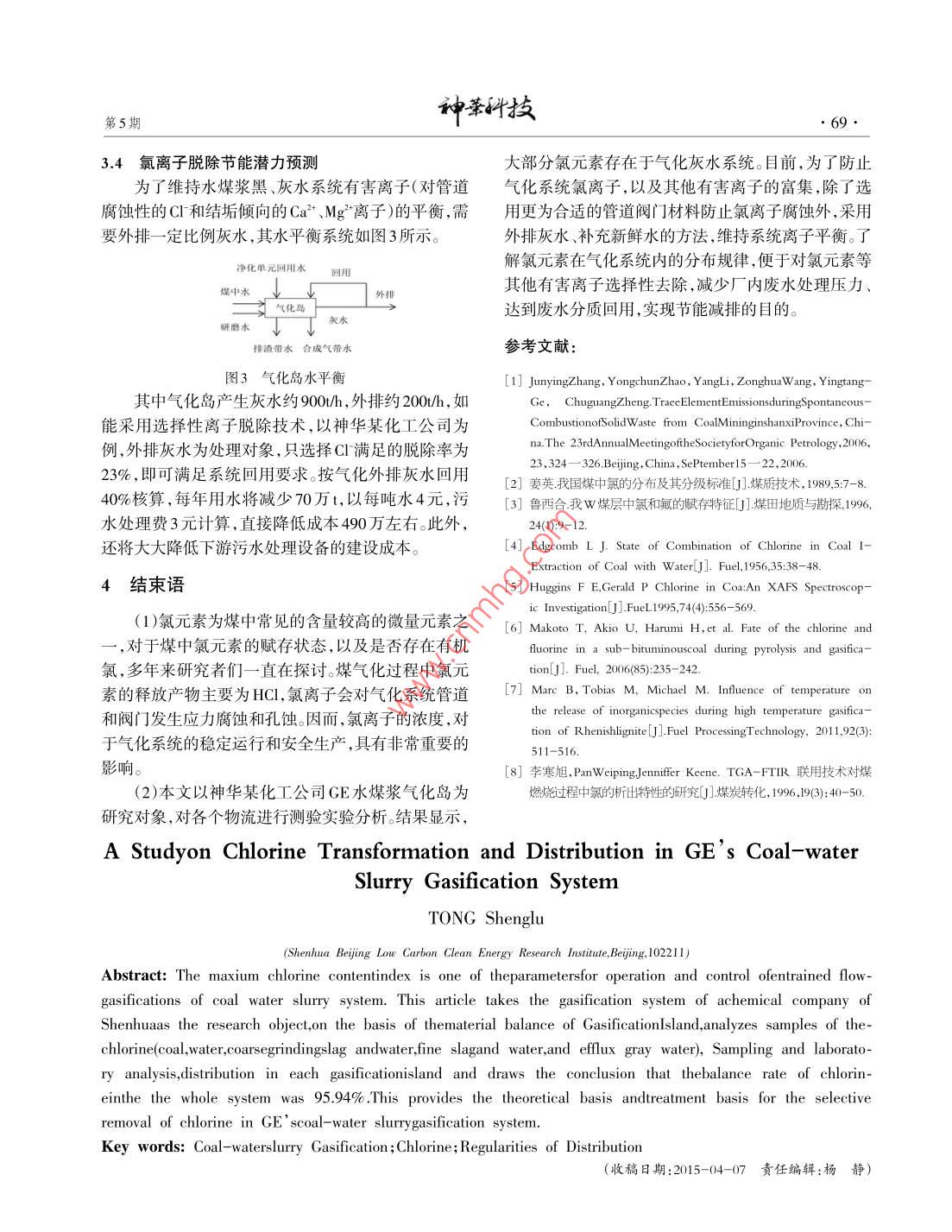 第13卷第5期神舉胡技2015年9月OL. 13 NO5GE水煤漿氣化系統(tǒng)氯元素轉(zhuǎn)化及分布規(guī)律研究仝勝錄神華集團(tuán)北京低碳清潔能源硏究所,北京,10221)摘要:氯元素含量上限指標(biāo)是氣流床水煤漿氣化系統(tǒng)運(yùn)行控制的參數(shù)之一,本文以神華某化工公司氣化系統(tǒng)為研究對象,在整個氣化島物料平衡的基礎(chǔ)上,對含氯物流(煤、研磨水、粗渣與細(xì)渣及含水、和外排灰水)取樣并化驗分析,得出了該公司氣化島各個物流氯元素含量及分布規(guī)律,并最終得出氯元素在整個系統(tǒng)的平衡率為95.94%‰。以此為基礎(chǔ),為G水煤漿氣化灰水氯元素選擇性脫除增加系統(tǒng)外排灰水回用技術(shù)開發(fā),提供理論基礎(chǔ)和處理依據(jù)。關(guān)鍵詞:水煤漿氣化氯元素分布規(guī)律中圖分類號:TO1文獻(xiàn)標(biāo)識碼:A文章編號:1674-8492(2015)05-067-03引言象,對氯元素在系統(tǒng)內(nèi)的分布和遷移規(guī)律進(jìn)行匯總分析,為生產(chǎn)操作以及氣化島廢水減排,提供理論依據(jù)缺油少氣、相對富煤”的資源稟賦特點,決定了煤炭是我國中長期的主要能源,也決定了煤化工特別煤中氯元素的含量、賦存形式與釋放特性是煤制油氣,是我國“能源安全戰(zhàn)略”的重要組成部分。在成煤過程中伴生了很多如硫、磷、氟、氯、汞煤是一種成分復(fù)雜的化合物,組成成分非常復(fù)砷、鈹、鎘、鉛、鉻、錳、鈾、鎳等。其中氯元素為煤中易雜,煤中能找到元素周期表中幾乎所有的元素。其中,揮發(fā)的有害元素之一,是制約煤氣化系統(tǒng)安全穩(wěn)定運(yùn)除了部分可利用的有益元素外,大概有幾十種潛在或行的關(guān)鍵數(shù)據(jù)參數(shù)。直接有害的微量元素,這些元素在煤的燃燒、氣化和據(jù)分析統(tǒng)計,國內(nèi)煤中氯元素的含量平均為其他清潔利用的過程中釋放,以不同的形式對生態(tài)環(huán)220ppm(wt),含量范圍分布為50~550ppm(wt),小部分境造成了嚴(yán)重的污染破壞,已經(jīng)成為制約我國經(jīng)濟(jì)和在500~1500pm23。研究者們對氯元素在煤中的賦社會可持續(xù)發(fā)展的主要影響因素。存狀態(tài)目前尚無定論,分歧焦點主要為有機(jī)態(tài)氯元素目前煤的微量元素污染物控制技術(shù)發(fā)展較快,但的存在與否和存在條件下的結(jié)合形式。但在氯元素有技術(shù)研究與開發(fā)的重點,主要集中在燃煤煙氣的排放些存在形態(tài)認(rèn)識是一致的,如 Edgcomb等、 Huggins領(lǐng)域,對于熱解和氣化過程中微量元素釋放規(guī)律和控等都認(rèn)為大部分氯元素以離子交換的形態(tài)存在與煤制技術(shù)比較缺乏υ煤氣化技術(shù)是煤清潔化利用及轉(zhuǎn)中孔隙水溶液,少部分以堿金屬氯化物的形態(tài)存在?;凝堫^技術(shù),為了預(yù)測和控制氣化過程中煤中有害由于對氯元素其賦存狀態(tài)認(rèn)識的不足,導(dǎo)致對煤微量元素的危害,需了解其遷移和分布規(guī)律,為安全中氯元素釋放規(guī)律結(jié)論的不一致,但通過大量的實驗生產(chǎn)和污染控制墊定理論基礎(chǔ)表明,釋放產(chǎn)物主要是HC6和NaCl、KCl8(高溫條氣流床煤氣化技術(shù),是國際上先進(jìn)煤氣化技術(shù)發(fā)件)。這些生成的氣相和液相氯化物不僅污染空氣,對展的主要方向之一,大量的氯元素在熱解氣化過程中生產(chǎn)設(shè)備和管道有很強(qiáng)的腐蝕性。釋放,系統(tǒng)管道閥門的腐蝕、穿孔、斷裂均與釋放出的富集氯離子的濃度是水煤漿氣化島黑水、灰水系氯離子有關(guān),給安全生產(chǎn)帶來了極大的困擾。本文以統(tǒng)控制的一個重要指標(biāo)。臨界氯離子濃度指標(biāo)對于化神華集團(tuán)某化工公司CE水煤漿氣化技術(shù)為研究對系統(tǒng)不銹鋼設(shè)備和管道的應(yīng)力腐蝕受溫度、水質(zhì)①2014年神華集團(tuán)科技創(chuàng)新項目:ST930014SH07水煤漿氣化黑灰水處理技術(shù)開發(fā)(ST930014SH07)作者簡介:仝勝錄(1981-),男,工程師,204年畢業(yè)于中國礦業(yè)大學(xué)(北京),現(xiàn)就職于神華集團(tuán)北京低碳清潔能源研究所,從事煤化工節(jié)能減排方面技術(shù)研發(fā)工作。Tel:13810706093,E-mail:tongshenglut@nicenergy.com仝勝錄:GE水煤漿氣化系統(tǒng)氯元素轉(zhuǎn)化及分布規(guī)律研究第5期流速,以及微生物等各種因素的影響,至今沒有針對性的對其脫除,對企業(yè)的運(yùn)行成本控制、環(huán)境保護(hù)和的國內(nèi)國際標(biāo)準(zhǔn)。美國合成氨工業(yè)為了避免316不銹生產(chǎn)的穩(wěn)定長周期運(yùn)行,有著現(xiàn)實的意義。鋼管道孔蝕和應(yīng)力腐蝕開裂(SC),確定將氯離子上限3氣流床水煤漿氣化系統(tǒng)氯元素的分布規(guī)律濃度定于500mg/;而同樣是美國一些煉油廠氯離子濃度在500~1000mg/運(yùn)行時幾乎沒有問題,在國內(nèi)研究實際運(yùn)行經(jīng)驗,設(shè)計在運(yùn)行狀態(tài)合理情況下,氯離子濃3.1工藝與物料平衡度500~700mg/對于304/316材料是可以接受的。氣流床水煤漿氣化煤中氯元素氣化后,集中分布研水于氣化黑水、灰水和氣化殘渣中。影響氯元素的濃度合成氣淡滌凈化變換和分布的主要元素,主要有煤種、氯元素的賦存狀態(tài)、斗除閃燕系統(tǒng)溫度、壓力等。氯元素在煤氣化系統(tǒng)的富集程度,直接灰水外排灰水循環(huán)系統(tǒng)一影響了外排