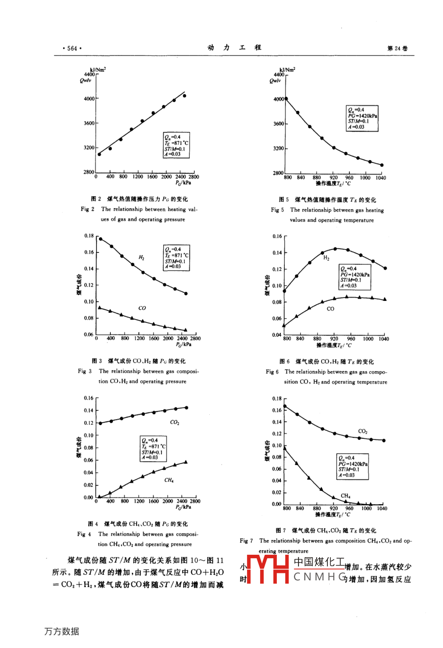 第24卷第4期動力工程Vol. 24 No. 42004年8月POWER ENGINEERINGAug. 2004文章編號:1000-6761 (2004)04- 0560-07部分煤氣化爐的熱力學(xué)數(shù)學(xué)模型余廷芳',蔡寧生2(1.江西省電力試驗研究院,南昌330006; 2. 清華大學(xué)熱能工程系,北京100084)摘要:在考慮部分煤氣化爐操作條件、氣化劑、脫硫劑影響的基礎(chǔ)上,引入了部分煤氣化爐能量轉(zhuǎn)化系數(shù)(而不是碳轉(zhuǎn)化率)的概念,運用能量平衡、質(zhì)量平衡、化學(xué)平衡方程建立了通用的與爐型無關(guān)的部分氣化爐熱力學(xué)數(shù)學(xué)模型,用于預(yù)測部分氣化爐出口的煤氣成份、產(chǎn)量、熱值和所需氣化劑的量。模型計算結(jié)果與實際數(shù)據(jù)相符,滿足實際工程精度需要,并利用該模型計算分析了不同操作條件對部分氣化爐產(chǎn)物的影響,模型計算的煤氣成分及熱值變化與實際及理論相一致。圍14表3參7關(guān)鍵詞:動力機械工程;部分煤氣化爐;熱力學(xué)數(shù)學(xué)模型;性能分析;煤氣成分預(yù)測中團分類號: TK229. 8文獻標識碼: AThermodynamic Mathematical Model of Coal Partial GasifierYU Ting fang', CAI Ning-sheng(1. Jiangxi Electric Power Testing and Research Institute , Nanchang 330006 , China;2. Dept. of Thermal Engineering , Tsinghua University, BeiJing 100084, China)Abstract: In this thesis , a thermodynamic mathematical model for partial gasifier was set u with respectto the influence of operation conditions ,agent for gasification and sorbent; The conservation principle ofenergy and mass,the thermodynamic equilibrium equation of chemical reaction were used in the model es-tablishing process, this model is generic and can be used in most kind of coal partial gaifier. The percent-age of gas composition , heating values of gas and the agent for gasification needed can be predicted by thismodel, the calculated results are very close to the actual data, it is also satisfied with the need of actual en-gineering. With the model ,The performance of partial gasifier under different operation conditions werealso carried out in this paper, the calculated results are consistent with the theory analysis. Figs 14 ,tables3and refs 7. .Key words: power and mechnical engineering ;coal partial gasifier ; thermodynamic mathematical model;performance analysis; prediction of gas composition部分煤氣化爐是部分煤氣化發(fā)電系統(tǒng)的關(guān)鍵設(shè)化發(fā)電系統(tǒng)方案設(shè)計及性能計算分析影響很大。目備之一,部分氣化爐模塊模型的準確性對部分煤氣前,全氣化爐的數(shù)學(xué)模型研究較多[1.2],但多為數(shù)值模擬,針對爐型,且不適合煤氣化發(fā)電系統(tǒng)的計算與收稿日期:2003-08-22分析,部分氣化爐研究則很少見?;痦椖?國家重點基礎(chǔ)研究發(fā)展項目(199902210533)0作者簡介:余廷芳(1974-),男,江西樂平人,江西省電力試驗研中國煤化工爐更為復(fù)雜,其產(chǎn)物兗院工程師,現(xiàn)為東南大學(xué)博士生。目前,主要進行先進燃煤發(fā)CN MHG溫度下還有煤焦油電技術(shù)和火電廠熱力系統(tǒng)經(jīng)濟性等方面的研究。等,且保焦細和半焦的成份復(fù)雜.本文在借鑒參考文第4期余廷芳,等:部分煤氣化爐的熱力學(xué)敷學(xué)模型●561●獻[3]建模思想的基礎(chǔ)上,根據(jù)部分氣化爐自身特炭 的質(zhì)量為M. =Q:/Qowc(kg),因而轉(zhuǎn)人煤氣中的點,提出了部分氣化爐能量轉(zhuǎn)化系數(shù)的概念,在考慮碳元素量為:氣化爐共有的規(guī)律的同時,充分考慮了操作條件、氣N0= C,- M.XC.- M.XC.(kmol)12.016化劑、脫硫劑等的影響,建立了通用的與爐型無關(guān)的部分氣化爐熱力學(xué)模型,能在已知煤種、氣化劑量、由碳平衡得:能量轉(zhuǎn)化系數(shù)及操作溫度TE壓力Pc的情況下,確Nc0= N。(Xco + Xco, + XcH, + X.a) (kmol)定氣化爐出口的煤氣成份、產(chǎn)量、熱值,模型計算結(jié)2)果與實測數(shù)據(jù)吻合,并就不同操作參數(shù)對部分氣化Xco. XxXcg.XcH. Xxs,Xns Xcos.HaXxonNg(bmo)煤氣爐產(chǎn)物的影響進行了計算分析,結(jié)果與實際相符。該氣化氣M(kg).十焦炭Mc(kg)模型在第二代PFBC-CC中試電站初步方案確定及蒸汽S(kg)十灰渣Mnx(kg)性能分析中得到了較好的應(yīng)用。+煤焦油M(kg)1能量轉(zhuǎn)化系數(shù)Q,圖1部分氣化爐物流平衡圖鑒于部分氣化爐的產(chǎn)物的復(fù)雜性,常用的炭轉(zhuǎn)Fig 1 Material flow balance of coal partial gasifier化率X。表示煤氣化程度并不適合部分氣化爐產(chǎn)物2.1.2氧元素平衡轉(zhuǎn)人煤氣中 的氧來源有:①人預(yù)測模型中的計算,為此我們引人部分氣化爐的能爐煤中的O,;②氣化氣(空氣或氧氣)中的O{(含氧量轉(zhuǎn)化系數(shù)Q.概念:率為β);③水蒸汽中的氧元素,但煤焦油和焦炭中Q,=1- M. GOWC(1)也含有一定的0,因而轉(zhuǎn)入煤氣中氧量為:Vo,0 :O,-M.XO.- M.XO, t其意義是煤氣化反應(yīng)中除半焦所含能量以外的32.0所有能量占氣化爐進口煤所含能量的份額。式中M.MXE+ W. S(kmol)32. 036. 032為1kg人爐煤在經(jīng)部分氣化爐后產(chǎn)生的半焦質(zhì)量由氧平衡有:(kg);Qnwc為半焦低位熱值(kJ/kg);Qvw為人爐煤No,0= N。(0. 5Xco + 0. 5X.. +低位熱值(kJ/kg)。由上述可見:Q.更能反映部分氣Xoo + 0. 5Xng,o) (kmol)(3)化爐實際能量轉(zhuǎn)換的程度。2.1.3氫元素平衡 煤氣中氫的來 源有:1)煤中2部分氣化爐數(shù)學(xué)模型H,2)水蒸汽中含氫,因而煤氣中氫總量為,由氫平部分氣化爐建模目的是:在給定入爐煤種成份衡得:(C、H,O,、S.N,、A,. W,)及低位熱值Qbw(kJ/Ne20= N,(XH, + 2Xar,