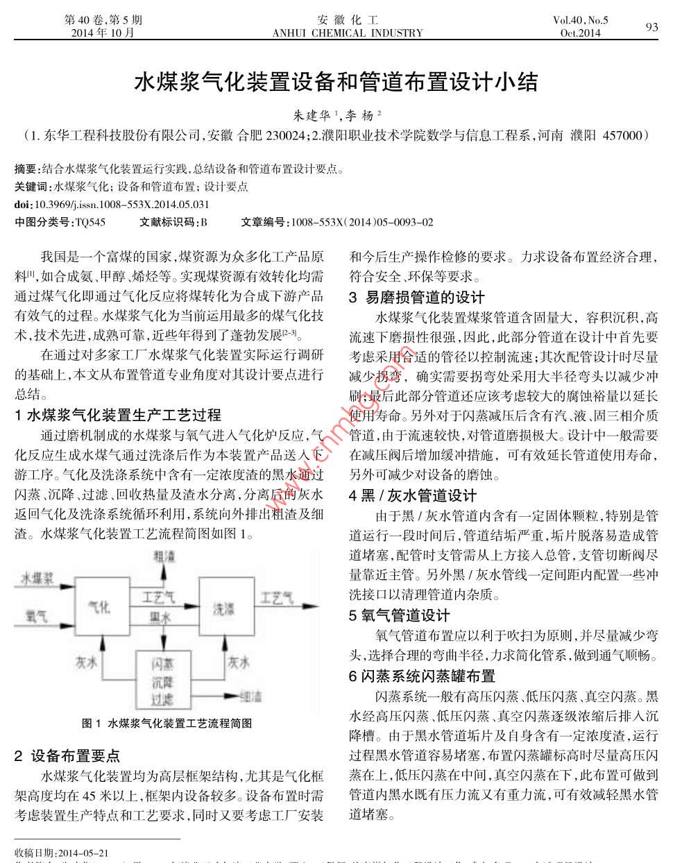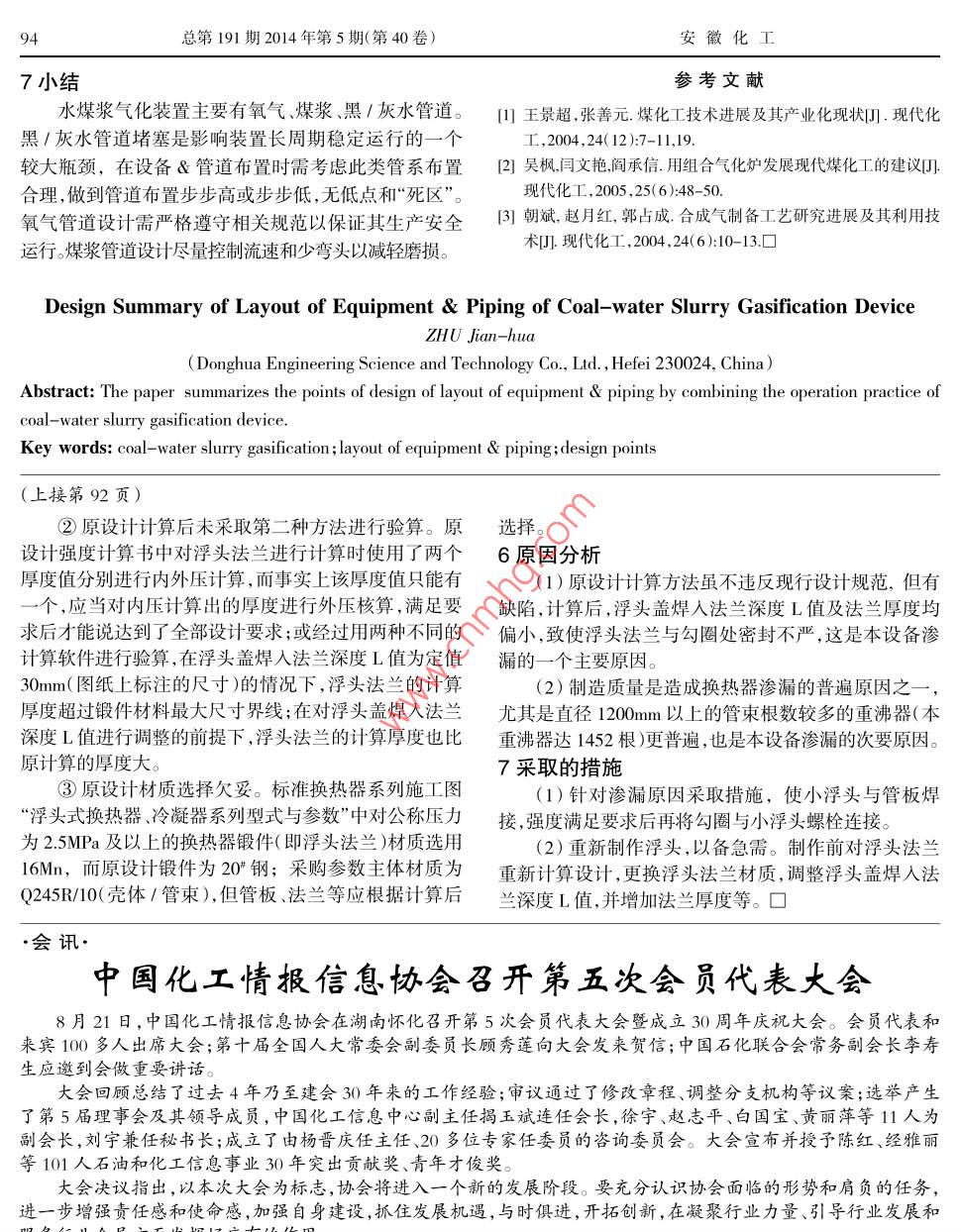 第40卷,第5期安徽化工Ⅴol.40,No.5年10月ANHUI CHEMICAL INDUSTRYOct.2014水煤漿氣化裝置設(shè)備和管道布置設(shè)計(jì)小結(jié)朱建華1,李楊2(1.東華工程科技股份有限公司,安徽合肥230024;2濮陽(yáng)職業(yè)技術(shù)學(xué)院數(shù)學(xué)與信息工程系,河南濮陽(yáng)457000摘要:結(jié)合水煤漿氣化裝置運(yùn)行實(shí)踐,總結(jié)設(shè)備和管道布置設(shè)計(jì)要點(diǎn)。關(guān)鍵詞:水煤漿氣化;設(shè)備和管道布置;設(shè)計(jì)要點(diǎn)doi:10.3969/isn.1008-553X201405.03中圖分類(lèi)號(hào):TQ545文獻(xiàn)標(biāo)識(shí)碼:B文章編號(hào):1008-553X(2014)05-0093-02我國(guó)是一個(gè)富煤的國(guó)家,煤資源為眾多化工產(chǎn)品原和今后生產(chǎn)操作檢修的要求。力求設(shè)備布置經(jīng)濟(jì)合理料,如合成氨、甲醇、烯烴等。實(shí)現(xiàn)煤資源有效轉(zhuǎn)化均需符合安全、環(huán)保等要求通過(guò)煤氣化即通過(guò)氣化反應(yīng)將煤轉(zhuǎn)化為合成下游產(chǎn)品3易磨損管道的設(shè)計(jì)有效氣的過(guò)程。水煤漿氣化為當(dāng)前運(yùn)用最多的煤氣化技水煤漿氣化裝置煤漿管道含固量大,容積沉積,高術(shù),技術(shù)先進(jìn),成熟可靠,近些年得到了蓬勃發(fā)展23。流速下磨損性很強(qiáng),因此,此部分管道在設(shè)計(jì)中首先要在通過(guò)對(duì)多家工廠水煤漿氣化裝置實(shí)際運(yùn)行調(diào)研考慮采用合適的管徑以控制流速;其次配管設(shè)計(jì)時(shí)盡量的基礎(chǔ)上,本文從布置管道專(zhuān)業(yè)角度對(duì)其設(shè)計(jì)要點(diǎn)進(jìn)行減少拐彎,確實(shí)需要拐彎處采用大半徑彎頭以減少?zèng)_總結(jié)刷;最后此部分管道還應(yīng)該考慮較大的腐蝕裕量以延長(zhǎng)1水煤漿氣化裝置生產(chǎn)工藝過(guò)程使用壽命。另外對(duì)于閃蒸減壓后含有汽、液、固三相介質(zhì)通過(guò)磨機(jī)制成的水煤漿與氧氣進(jìn)入氣化爐反應(yīng),氣管道,由于流速較快,對(duì)管道磨損極大。設(shè)計(jì)中一般需要化反應(yīng)生成水煤氣通過(guò)洗滌后作為本裝置產(chǎn)品送人下在減壓閥后增加緩沖措施,可有效延長(zhǎng)管道使用壽命,游工序。氣化及洗滌系統(tǒng)中含有一定濃度渣的黑水通過(guò)另外可減少對(duì)設(shè)備的磨蝕。閃蒸、沉降、過(guò)濾、回收熱量及渣水分離,分離后的灰水4黑/灰水管道設(shè)計(jì)返回氣化及洗滌系統(tǒng)循環(huán)利用,系統(tǒng)向外排岀粗渣及細(xì)由于黑/灰水管道內(nèi)含有一定固體顆粒,特別是管渣。水煤漿氣化裝置工藝流程簡(jiǎn)圖如圖1。道運(yùn)行一段時(shí)間后,管道結(jié)垢嚴(yán)重,垢片脫落易造成管粗渣道堵塞,配管時(shí)支管需從上方接入總管,支管切斷閥盡水爆菜量靠近主管。另外黑/灰水管線一定間距內(nèi)配置一些沖工藝氣洗接口以清理管道內(nèi)雜質(zhì)。置氣氣化溫水工藝氣5氧氣管道設(shè)計(jì)氧氣管道布置應(yīng)以利于吹掃為原則,并盡量減少?gòu)濋W蒸灰水頭,選擇合理的彎曲半徑,力求簡(jiǎn)化管系,做到通氣順暢。沉降6閃蒸系統(tǒng)閃蒸罐布置過(guò)慮閃蒸系統(tǒng)一般有高壓閃蒸、低壓閃蒸、真空閃蒸。黑圖1水煤漿氣化裝置工藝流程簡(jiǎn)圖水經(jīng)高壓閃蒸、低壓閃蒸、真空閃蒸逐級(jí)濃縮后排入沉降槽。由于黑水管道垢片及自身含有一定濃度渣,運(yùn)行2設(shè)備布置要點(diǎn)過(guò)程黑水管道容易堵塞,布置閃蒸罐標(biāo)高時(shí)盡量高壓閃水煤漿氣化裝置均為高層框架結(jié)構(gòu),尤其是氣化框蒸在上,低壓閃蒸在中間,真空閃蒸在下,此布置可做到架高度均在45米以上,框架內(nèi)設(shè)備較多。設(shè)備布置時(shí)需管道內(nèi)黑水既有壓力流又有重力流,可有效減輕黑水管考慮裝置生產(chǎn)特點(diǎn)和工藝要求,同時(shí)又要考慮工廠安裝道堵塞收稿日期:2014-05-21總第191期2014年第5期(第40卷)安徽化工7小結(jié)參考文獻(xiàn)水煤漿氣化裝置主要有氧氣、煤漿、黑/灰水管道。王景超,張善元煤化工技術(shù)進(jìn)展及其產(chǎn)業(yè)化現(xiàn)狀門(mén)現(xiàn)代化黑/灰水管道堵塞是影響裝置長(zhǎng)周期穩(wěn)定運(yùn)行的一個(gè)工,2004,24(12):7-1119較大瓶頸,在設(shè)備&管道布置時(shí)需考慮此類(lèi)管系布置2]吳楓閆文艷閻承信用組合氣化爐發(fā)展現(xiàn)代煤化工的建議合理,做到管道布置步步高或步步低,無(wú)低點(diǎn)和“死區(qū)現(xiàn)代化工,2005,25(6)48-50氧氣管道設(shè)計(jì)需嚴(yán)格遵守相關(guān)規(guī)范以保證其生產(chǎn)安全3]朝斌,趙月紅郭占成合成氣制備工藝研究進(jìn)展及其利用技運(yùn)行。煤漿管道設(shè)計(jì)盡量控制流速和少?gòu)濐^以減輕磨損。術(shù)現(xiàn)代化工,2004,24(6):10-13口Design Summary of Layout of equipment Piping of Coal-water Slurry Gasification DeviceZHU Jian-huaDonghua Engineering Science and Technology Co. Ltd, Hefei 230024. ChinaAbstract: The paper summarizes the points of design of layout of equipment piping by combining the operation practice ofcoal-water slurry gasification deviceKey words: coal-water slurry gasification layout of equipment piping: design points(上接第92頁(yè))②原設(shè)計(jì)計(jì)算后未采取第二種方法進(jìn)行驗(yàn)算。原選擇設(shè)計(jì)強(qiáng)度計(jì)算書(shū)中對(duì)浮頭法蘭進(jìn)行計(jì)算時(shí)使用