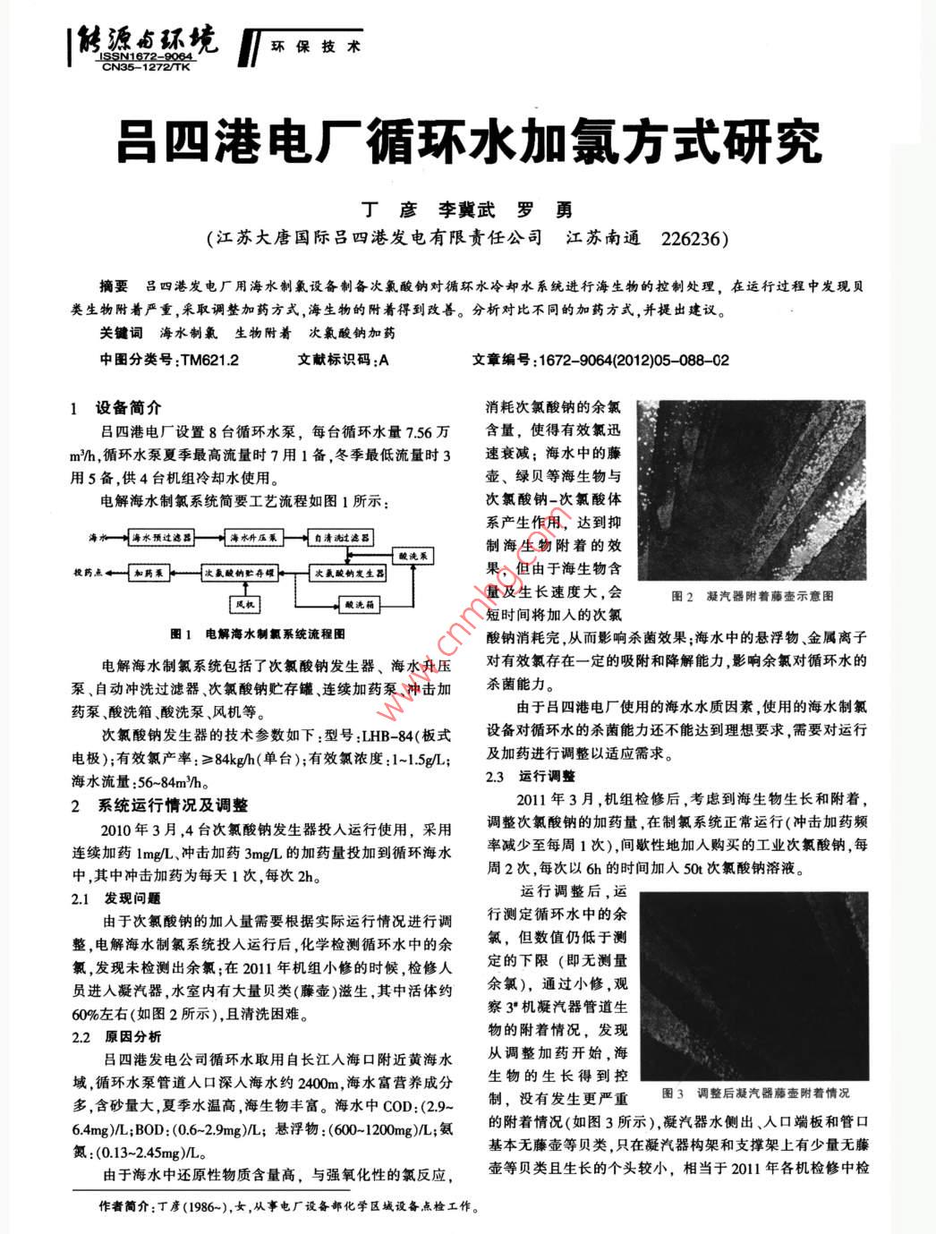 |能源鹵環(huán)境技CN35 1272/TK呂四港電廠循環(huán)水加氯方式研究,丁彥李冀武羅勇(江蘇大唐國際呂四港發(fā)電有限責任公司江蘇南通 226236)摘要呂四港發(fā)電廠用海水制氯設(shè)備制備次氯酸鈉對循環(huán)水冷卻水系統(tǒng)進行海生物的控制處理,在運行過程中發(fā)現(xiàn)貝類生物附著嚴重,采取調(diào)整加藥方式,海生物的附著得到改善。分析對比不同的加藥方式,并提出建議。關(guān)鍵詞海水制氯生物附著次氯酸 鈉加藥中圖分類號:TM621.2文獻標識碼:A文章編號:1672 -9064(2012)05. -088 -021設(shè)備簡介消耗次氯酸鈉的余氯呂四港電廠設(shè)置8臺循環(huán)水泵,每臺循環(huán)水量7.56萬含量,使得有效氯迅m?h,循環(huán)水泵夏季最高流量時7用1備,冬季最低流量時3速衰減;海水中的藤用5備,供4臺機組冷卻水使用。壺、綠貝等海生物與電解海水制氯系統(tǒng)簡要工藝流程如圖1所示:次氯酸鈉-次氯酸體系產(chǎn)生作用,達到抑海水一海水預(yù)過濾路一川海水升壓系 自清流過濾昌制海生物附著的效粳藥點←和藥策一次氨酸納貯存明T次氨酸的發(fā)生司果,但由于海生物含量及生長速度大,會團2凝汽器附蓍藤壼示意 圖短時間將加入的次氯圖1電解海水制氯系統(tǒng)流程圉酸鈉消耗完,從而影響殺菌效果;海水中的懸浮物、金屬離子電解海水制氯系統(tǒng)包括了次氯酸鈉發(fā)生器、海水升壓對有效氯存在--定的吸附和降解能力,影響余氯對循環(huán)水的泵、自動沖洗過濾器次氯酸鈉貯存罐連續(xù)加藥泵、沖擊加殺菌能力。藥泵、酸洗箱、酸洗泵、風(fēng)機等。由于呂四港電廠使用的海水水質(zhì)因素,使用的海水制氯次氯酸鈉發(fā)生器的技術(shù)參數(shù)如下:型號:LHB-84(板式設(shè)備對循環(huán)水的殺菌能力還不能達到理想要求,需要對運行電極);有效氯產(chǎn)率:≥84kgh(單臺);有效氯濃度:1~1.5g/L;及加藥進行調(diào)整以適應(yīng)需求。海水流量:56~84m/h。2.3運行調(diào)整2011年3月,機組檢修后,考慮到海生物生長和附著,2系統(tǒng)運行情 況及調(diào)整2010年3月,4臺次氯酸鈉發(fā)生器投人運行使用,采用調(diào)整次氯酸鈉的加藥量,在制氯系統(tǒng)正常運行(沖擊加藥頻連續(xù)加藥lmg/L、沖擊加藥3mg/L的加藥量投加到循環(huán)海水率減少至每周1次),間歇性地加入購買的工業(yè)次氯酸鈉,每周2次,每次以6h的時間加入50t次氯酸鈉溶液。中,其中沖擊加藥為每天1次,每次2h。2.1發(fā)現(xiàn)問題運行調(diào)整后,運由于次氯酸鈉的加人量需要根據(jù)實際運行情況進行調(diào)行測定循環(huán)水中的余整,電解海水制氯系統(tǒng)投人運行后,化學(xué)檢測循環(huán)水中的余氯,但數(shù)值仍低于測氯,發(fā)現(xiàn)未檢測出余氯;在2011年機組小修的時候,檢修人定的下限(即無測量員進入凝汽器,水室內(nèi)有大量貝類(藤壺)滋生,其中活體約余氯),通過小修,觀60%左右(如圖2所示),且清洗困難。察3*機凝汽器管道生2.2 原 因分析物的附著情況,發(fā)現(xiàn)呂四港發(fā)電公司循環(huán)水取用自長江人??诟浇S海水從調(diào)整加藥開始,海域循環(huán)水泵管道入口深人海水約2400m,海水富營養(yǎng)成分生物的生長得到控多,含砂量大,夏季水溫高,海生物豐富。海水中COD:(2.9~制,沒有發(fā)生更嚴重圖3調(diào)整后凝汽器藤壺附著情況6.4mg)/L;BOD: (0.6-2.9mg)/L;懸浮物:(600~ 1200mg)L;氨的附著情況(如圖3所示),凝汽器水側(cè)出、人口端板和管口基本無藤壺等貝類,只在凝汽器構(gòu)架和支撐架上有少量無藤氮:(0.13~2.45mg)/L。由于海水中還原性物質(zhì)含量高,與強氧化性的氯反應(yīng),壺等貝類且生長的個頭較小,相當于2011年各機檢修中檢作者簡介:丁彥(1986-),女,從事電廠設(shè)備部化學(xué)區(qū)域設(shè)備點檢工作。環(huán)保技術(shù)T能源鹵環(huán)境|查藤壺大小的約1/5,且基本沒有貝類存活,絕大多數(shù)為貝類表1海水加氯方式對比分析表空殼。這說明增加加藥可以控制藤壺的附著量的發(fā)展。加藥方式海水制氯加藥成品次氯酸鈉加藥3不同運行方式對比加藥量連續(xù)加藥lmg/L沖擊加藥3mg/L綜合考慮海水制氯系統(tǒng)、成品次氯酸鈉的成本,結(jié)合運行實際,對循環(huán)水加氯殺菌的運行方式進行調(diào)整,以尋求最加藥頻率每天1次,每次2h每天2次,每次6h優(yōu)加藥方式。殺菌效果海生物大量附著有效抑制海生物生長3.1成品次 氯酸鈉加藥方式缺陷殺菌效果不佳、系統(tǒng)穩(wěn)次氯酸鈉購買,不宜長定性低需增加制氯設(shè)備時間存放需建立加藥系從2011年3月開始,呂四港電廠就間歌性地添加成品統(tǒng)次氯酸鈉,對藤壺海生物的生長與附著起到了抑制的作用。影響因素電流海水流量、海水水海水水質(zhì)、循環(huán)水量但是加藥間歇時間較長,次氯酸鈉在循環(huán)海水中降解速度較運行成本不包括基建沉運行成本 包括加藥系統(tǒng)快,使得余氯的停留時間變短,需要建立加藥流程裝置,調(diào)整備注砂池且不考慮增加制氯基建折算費用、運行維.加藥間隔及加藥量,存在基建費用和運行費用的增加。設(shè)備護費3.2 海水制氯系統(tǒng)呂四港電廠電解海水制氯設(shè)備從2010年開始運行,檢海生物藤壺的大量附著生長,循環(huán)水中無余氯測出。修時發(fā)現(xiàn)藤壺海生物附著嚴重,次氯酸鈉加藥量達不到要(2)調(diào)整運行,在3套電解海水