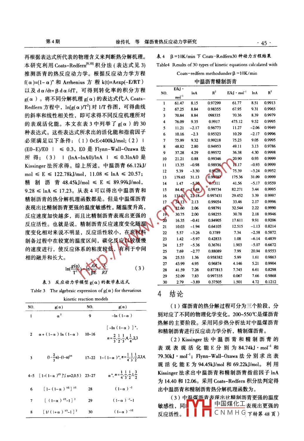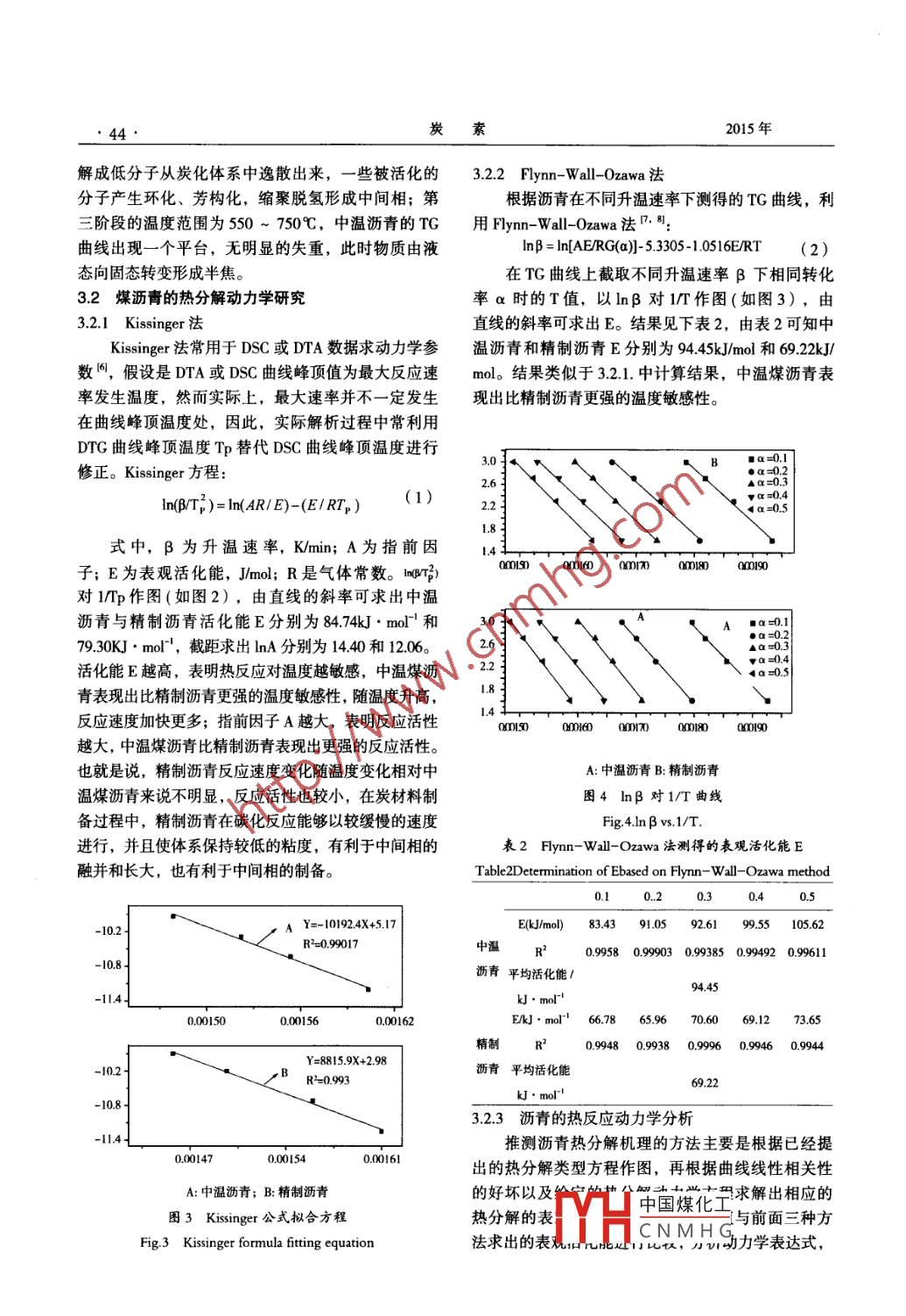 炭素2015年第4期42CARBON總第165期文章編號(hào):1001-8948(2015)04-0042-05煤瀝青熱反應(yīng)動(dòng)力學(xué)研究徐傳禮,程相林,王留成,趙建宏,王建設(shè),宋成盈(鄭州大學(xué)化工與能源學(xué)院,河南鄭州450003)摘要:對(duì)煤瀝青在升溫速率分別為5℃/min、10℃/min、15℃/min和20℃/min條件下進(jìn)行熱重分析,探究了中溫瀝青與精制瀝青熱分解過(guò)程。利用 Kissinger法、Fymn-Wal-Oawa法、 Friedman法分別求出了中溫瀝青與精制瀝青的表觀活化能E,利用 Kissinger法求出指前因子lnA,采用Coas- Redfern積分法判定得出熱分解過(guò)程反應(yīng)機(jī)理函教積分式。結(jié)果表明,中溫煤瀝青表現(xiàn)出比精制瀝青更強(qiáng)的溫度敏感性,中溫煤瀝青比精制瀝青表現(xiàn)出更強(qiáng)的反應(yīng)活性。關(guān)鍵詞:煤瀝青;熱分析;動(dòng)力學(xué)doi:103969/;isn1001-8948.201504008中圖分類號(hào):TQ52265文獻(xiàn)標(biāo)識(shí)碼:AKinetics research on coal tar pitch and itsextractionXU Chuan-li, CHENG Xiang-lin, WANG Liu-cheng, ZHAO Jian-hong,WANG Jian-she, SoNG Cheng-ying(Zhengzhou University, School of Chemical Engineering and Energy Zhengzhou 450003, China)Abstract: The kinetics of pyrolysis characteristics of coal tar pitch were investigated by thermogravimetric analysis at heating ratesof 5, 10, 15, 20C/min, respectively. The results show that pyrolysis process of coal tar pitch includes three stages. The apparentactivation energy was studied by the model of Kissinger, Flynn-Wall-Ozawa and Friedman, respectively. The pre-exponential factorInA was investigated by the method of Kissinger. With Coats-Redfern model, the reaction mechanism function of pyrolysis processcould be determined The coal tar pitch shows more significant temperature susceptibility and higher reactivityKey words: coal tar pitch; thermogravimetric analysis; kinetics1引言作為制取瀝青焦、延遲焦及改質(zhì)瀝青的原料,還可用作炭素電極,電解鋁陽(yáng)極的粘合劑,生產(chǎn)電池和我國(guó)是煤焦化產(chǎn)業(yè)大國(guó)。2014年焦炭產(chǎn)量477作耐火材料的粘結(jié)劑。但現(xiàn)有加工利用方式附加值億噸,焦化副產(chǎn)物煤焦油的年產(chǎn)量達(dá)2200萬(wàn)噸以上。低、污染嚴(yán)重,并且這些利用方式市場(chǎng)容量有限焦油蒸餾過(guò)程中塔底產(chǎn)生的副產(chǎn)物——中溫煤瀝青目前生產(chǎn)中溫煤瀝青的企業(yè)均面臨著尋找中溫煤瀝約占焦油量的54%-60%。目前中溫瀝青不但用于青加工出路的共同難題。中溫煤瀝青含有大量?jī)?yōu)質(zhì)制油氈、建筑物防水層、髙級(jí)瀝青漆等,而且可以縮合芳香烴類,如何高效利用中溫煤瀝青中優(yōu)質(zhì)縮收稿日期:2015-12-0基金項(xiàng)目:中國(guó)石油科技創(chuàng)新基金資助2015D-5006-0408);鄭州大學(xué)優(yōu)秀青年發(fā)展基中國(guó)煤化工通訊作者:程相林,男,博士,主要從事煤炭轉(zhuǎn)化和新型炭材料研究, E-Mail:ex8817@163.conCNMHG作者簡(jiǎn)介:徐傳禮(1989-),碩士研究生第4期傳禮等煤瀝青熱反應(yīng)動(dòng)力學(xué)研究43合芳香烴資源成為亟需解決的、關(guān)乎傳統(tǒng)煤化工發(fā)3結(jié)果與討論展的重大課題。對(duì)中溫煤瀝青進(jìn)行高附加值、深加工也是傳統(tǒng)煤焦化行業(yè)升級(jí)轉(zhuǎn)型需求3.1煤瀝青的熱解特性煤瀝青是一個(gè)組成十分復(fù)雜的體系,含有大量中溫瀝青和精制瀝青的TG-DTG曲線圖基本的縮合芳香環(huán)類有機(jī)化合物,據(jù)估計(jì)煤瀝青中有超致,見圖1、圖2。過(guò)10000種不同化學(xué)組成和結(jié)構(gòu)的物質(zhì)。大量是由2-6環(huán)組成的縮合芳香環(huán)類物質(zhì),可以通過(guò)溶劑萃取精制作為針狀焦、中間相瀝青基炭纖維、泡沫炭、5℃/min10200℃hmin05浸漬劑劑瀝青、炭微球等高性能炭材料的原料。但是由于缺乏對(duì)瀝青基礎(chǔ)特性方面的研究和了解,沒有成熟的原料預(yù)處理工藝,致使我國(guó)高性能炭材料0.100.15和其它高附加值方面的研究和產(chǎn)業(yè)化長(zhǎng)期進(jìn)展緩慢。熱分析是研究物質(zhì)在加熱和冷卻過(guò)程中物理變0.25化和化學(xué)變化的一種測(cè)試技術(shù)。通過(guò)熱分析方法可以對(duì)物質(zhì)反應(yīng)動(dòng)力學(xué)進(jìn)行有效研究,測(cè)定熱反應(yīng)級(jí)數(shù)、反應(yīng)速度和反應(yīng)活化能等動(dòng)力學(xué)參數(shù)。熱分析圖1中溫煤瀝青不同升溫速率的TG/DTG曲線同樣被應(yīng)用于煤瀝青的研究中以,以獲得煤瀝青熱Fig1 TG/DTG curves of coal tar pitch at different heating rate反應(yīng)性等基礎(chǔ)性能。本研究在前人研究的基礎(chǔ)上采用經(jīng)典熱重分析100法( Kissinger、Fyn-Wll0zawa法、 Friedman法)對(duì)中溫瀝青和精制瀝青的動(dòng)力學(xué)參數(shù)進(jìn)行分析,研80-0.1究瀝青的熱反應(yīng)基礎(chǔ)參數(shù),為瀝青的精制、改性和65℃tmin0t/min深加工提供技術(shù)指導(dǎo)。5℃/min2實(shí)驗(yàn)部分200.421實(shí)驗(yàn)原料中溫瀝青瀝青由濟(jì)源金馬焦化有限公司所提供。10020030040050600700800中溫瀝青用喹啉精制,喹啉可溶物組分即為精制瀝青。其元素分析如表1。圖2精制瀝青不同升溫速率的TG/DTG曲線表1為瀝青的元素分析g2 TG/DTG curves of refined pitch at differentheating rateTable1 Elemental analysis of coaltarpitch以中溫瀝青TG-DTG曲線為例,由圖1可知,樣品H%oN%oH/C中溫瀝青在不同升溫速率的條件下失重趨勢(shì)相同,失重速率都是先增大