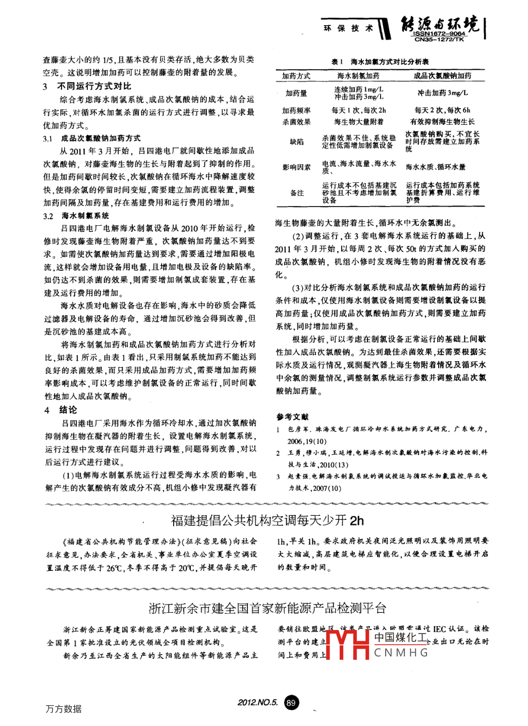 候透點(diǎn)環(huán)統(tǒng)團(tuán)故不呂四港電廠循環(huán)水加氯方式研究丁彥李冀武羅勇(江蘇大唐國(guó)際呂四港發(fā)電有限責(zé)任公司江蘇南通226236摘要呂四港發(fā)電廠用海水制氯設(shè)備制備次氯酸鈉對(duì)循環(huán)水冷卻水系統(tǒng)進(jìn)行海生物的控制處理,在運(yùn)行過(guò)程中發(fā)現(xiàn)貝類生物附著嚴(yán)重,采取調(diào)整加藥方式,海生物的附著得到改善。分析對(duì)比不同的加藥方式,并提出建議。關(guān)鍵詞海水制氯生物附著次氟酸鈉加藥中圖分類號(hào):TM6212文獻(xiàn)標(biāo)識(shí)碼:A文章編號(hào):1672-9064(2012)05-088021設(shè)備簡(jiǎn)介消耗次氯酸鈉的余氯呂四港電廠設(shè)置8臺(tái)循環(huán)水泵,每臺(tái)循環(huán)水量756萬(wàn)含量,使得有效氯迅h,循環(huán)水泵夏季最高流量時(shí)7用1備,冬季最低流量時(shí)3速衰減;海水中的藤用5備,供4臺(tái)機(jī)組冷卻水使用。壺、綠貝等海生物與電解海水制氯系統(tǒng)簡(jiǎn)要工藝流程如圖1所示次氯酸鈉一次氯酸體系產(chǎn)生作用,達(dá)到抑枷水預(yù)過(guò)選圖海水壓果}清減濾圖制海生物附著的效藥表[加果}[酸悄貯存唱[太氯酸物發(fā)生果,但由于海生物含量及生長(zhǎng)速度大,會(huì)酸洗圖2凝汽器附著藤壺示意圖短時(shí)間將加入的次氯圖1電解海水制氯系統(tǒng)流程圖酸鈉消耗完,從而影響殺菌效果;海水中的懸浮物、金屬離子電解海水制氯系統(tǒng)包括了次氯酸鈉發(fā)生器、海水升壓對(duì)有效氯存在一定的吸附和降解能力,影響余氯對(duì)循環(huán)水的泵、自動(dòng)沖洗過(guò)濾器、次氯酸鈉貯存罐、連續(xù)加藥泵、沖擊加殺菌能力。藥泵、酸洗箱、酸洗泵、風(fēng)機(jī)等。由于呂四港電廠使用的海水水質(zhì)因素,使用的海水制氯次氯酸鈉發(fā)生器的技術(shù)參數(shù)如下:型號(hào):LHB-84(板式設(shè)備對(duì)循環(huán)水的殺菌能力還不能達(dá)到理想要求,需要對(duì)運(yùn)行電極);有效氯產(chǎn)率:≥84kgh(單臺(tái));有效氯濃度:1-15gL;及加藥進(jìn)行調(diào)整以適應(yīng)需求海水流量:56-84mh。23運(yùn)行調(diào)整2系統(tǒng)運(yùn)行情況及調(diào)整2011年3月,機(jī)組檢修后,考慮到海生物生長(zhǎng)和附著,2010年3月4臺(tái)次氯酸鈉發(fā)生器投入運(yùn)行使用,采用調(diào)整次氯酸鈉的加藥量在制氯系統(tǒng)正常運(yùn)行(沖擊加藥頻連續(xù)加藥1mgL、沖擊加藥3mg的加藥量投加到循環(huán)海水率減少至每周1次),間歇性地加入購(gòu)買的工業(yè)次氯酸鈉每中,其中沖擊加藥為每天1次,每次2h周2次,每次以6h的時(shí)間加入50t次氯酸鈉溶液2.1發(fā)現(xiàn)問(wèn)題運(yùn)行調(diào)整后,運(yùn)由于次氯酸鈉的加入量需要根據(jù)實(shí)際運(yùn)行情況進(jìn)行調(diào)行測(cè)定循環(huán)水中的余整,電解海水制氯系統(tǒng)投入運(yùn)行后,化學(xué)檢測(cè)循環(huán)水中的余氯,但數(shù)值仍低于測(cè)氯發(fā)現(xiàn)未檢測(cè)出余氯;在2011年機(jī)組小修的時(shí)候,檢修人定的下限(即無(wú)測(cè)量員進(jìn)入凝汽器,水室內(nèi)有大量貝類(藤壺)滋生,其中活體約余氯),通過(guò)小修觀60%左右(如圖2所示),且清洗困難。察3·機(jī)凝汽器管道生2.2原因分析物的附著情況,發(fā)現(xiàn)呂四港發(fā)電公司循環(huán)水取用自長(zhǎng)江入??诟浇S海水從調(diào)整加藥開(kāi)始,海域,循環(huán)水泵管道入口深入海水約240m,海水富營(yíng)養(yǎng)成分生物的生長(zhǎng)得到控多含砂量大,夏季水溫高,海生物豐富。海水中COD:(29制,沒(méi)有發(fā)生更嚴(yán)重圖3調(diào)整后凝汽器藤壺附著情況64mg/L;BOD:(06-29mg)/L;懸浮物:(600-1200mg)/L;氨的附著情況(中國(guó)煤化工人口端板和管口氮:(0.13~2.45mgL?;緹o(wú)藤壺等掌架上有少量無(wú)藤由于海水中還原性物質(zhì)含量高,與強(qiáng)氧化性的氯反應(yīng)壺等貝類且生CNMH年各機(jī)檢修中檢作者簡(jiǎn)介:丁彥(1986~),女,從事電廠設(shè)備部化學(xué)區(qū)城設(shè)備點(diǎn)檢工作。12No5保數(shù)木Ⅳ制源點(diǎn)環(huán)境查藤壺大小的約15,且基本沒(méi)有貝類存活絕大多數(shù)為貝類表1海水加氯方式對(duì)比分析表空殼。這說(shuō)明增加加藥可以控制藤壺的附著量的發(fā)展。加藥方式海水制氯加藥成品次氯酸鈉加藥3不同運(yùn)行方式對(duì)比加藥量連續(xù)加藥1mg/L沖擊加藥3mg/L綜合考慮海水制氯系統(tǒng)、成品次氯酸鈉的成本,結(jié)合運(yùn)沖擊加藥3mg/L行實(shí)際,對(duì)循環(huán)水加氯殺菌的運(yùn)行方式進(jìn)行調(diào)整,以尋求最加藥頻率每天1次,每次2h每天2次,每次6h優(yōu)加藥方式。殺菌效果海生物大量附著有效抑制海生物生長(zhǎng)3.1成品次氯酸鈉加藥方式次氯酸鈉購(gòu)買,不宜殺菌效果不佳、系統(tǒng)穩(wěn)時(shí)間存放需建立加藥從2011年3月開(kāi)始,呂四港電廠就間歇性地添加成品缺陷定性低需增加制氯設(shè)備統(tǒng)次氯酸鈉,對(duì)藤壺海生物的生長(zhǎng)與附著起到了抑制的作用影響因素電流海水流量海水水海水水質(zhì)、循環(huán)水量但是加藥間歇時(shí)間較長(zhǎng),次氯酸鈉在循環(huán)海水中降解速度較快,使得余氯的停留時(shí)間變短需要建立加藥流程裝置,調(diào)整運(yùn)行成本不包括基建沉運(yùn)行成本包括加藥系備注砂池且不