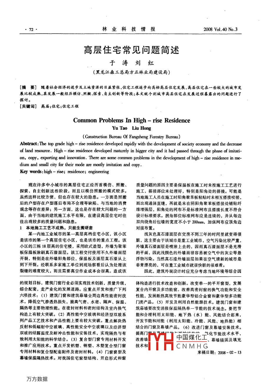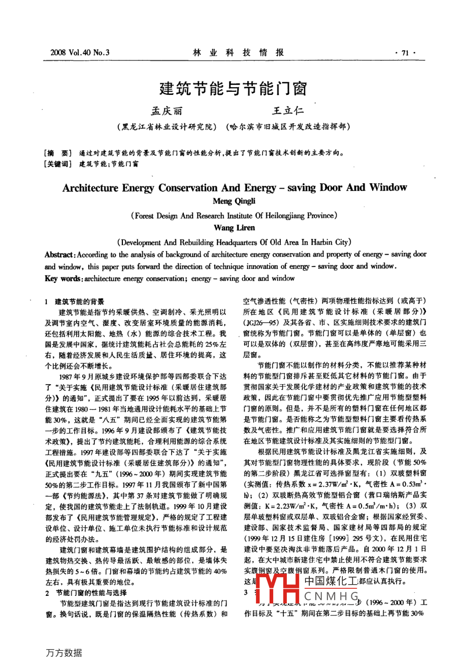 008vol.40No.3林業(yè)科技情報71建筑節(jié)能與節(jié)能門窗孟慶麗王立仁黑龍江省林業(yè)設計研究院)(哈爾濱市舊城區(qū)開發(fā)改造指揮部)[摘要]通過對建筑節(jié)能的背景及節(jié)能門窗的性能分析,提出了節(jié)能門窗技術創(chuàng)新的主要方向[關鍵詞]建筑節(jié)能;節(jié)能門窗Architecture Energy Conservation And Energy-saving Door And windowMeng QingliForest Design And Research Institute Of Heilongjiang Province)Development And Rebuilding Headquarters Of Old Area In Harbin City)Abstract: According to the analysis of background of architecture energy conservation and property of energy-saving dootand window, this paper puts forward the direction of technique innovation of energy- saving door and windowKey words: architecture energy conservation; energy-saving door and window1建筑節(jié)能的背景空氣滲透性能(氣密性)兩項物理性能指標達到(或高于)建筑節(jié)能是指節(jié)約采暖供熱、空調制冷、采光照明以所在地區(qū)《民用建筑節(jié)能設計標準(采暖居部分)及調節(jié)室內空氣、濕度、改變居室環(huán)境質量的能源消耗,(JGJ2695)及其各省、市、區(qū)實施細則技術要求的建筑門還包括利用太陽能、地熱(水)能源的綜合技術工程。我窗統(tǒng)稱為節(jié)能門窗。節(jié)能門窗可以是單體的(單層窗)也國是發(fā)展中國家,據統(tǒng)計建筑能耗占社會總能耗的25%左可以是雙體的(雙層窗),甚至在高緯度嚴寒地可能采用三右,隨著經濟發(fā)展和人民生活質量、居住環(huán)境的提高,這層窗。個比例還會不斷增長節(jié)能門窗不能以制作的材料分類,不能以推薦某種材1987年9月原城鄉(xiāng)建設環(huán)境保護部等四部委聯合下達料的節(jié)能型門窗排斥甚至貶低其它材料的節(jié)能門窗。由于了“關于實施《民用建筑節(jié)能設計標準(采暖居住建筑部貫徹國家關于發(fā)展化學建材的產業(yè)政策和建筑節(jié)能的技術分)》的通知”,正式提出了要在1995年以前達到,采暖居政策,因此在節(jié)能門窗中要貫徹優(yōu)先推廣應用節(jié)能型塑料住建筑在1980-1981年當地通用設計能耗水平的基礎上節(jié)門窗的原則。但是,并不是所有的塑料門窗在任何地區(qū)都能30%,這就是“八五”期間已經全面實現的建筑節(jié)能第是節(jié)能門窗。是否能稱之為節(jié)能型塑料門窗主要看傳熱系步的工作目標。199年9月建設部頒布了《建筑節(jié)能技數及氣密性。推廣和應用建筑節(jié)能門窗就是要選擇符合所術政策》,提出了節(jié)約建筑能耗,合理利用能源的綜合系統(tǒng)在地區(qū)節(jié)能建筑設計標準及其實施細則的節(jié)能型門窗。工程措施。1997年建設部等四部委聯合下達了“關于實施根據民用建筑節(jié)能設計標準及黑龍江省實施細則,及民用建筑節(jié)能設計標準(采暖居住建筑部分)》的通知”,其對節(jié)能型門窗物理性能的具體要求,現階段(節(jié)能50%正式提出要在“九五”(1996~200年)期間實現建筑節(jié)能的第二步階段)黑龍江省可選擇窗型有:(1)雙玻塑料窗50%的第二步工作目標。199年11月我國頒布了新中國第(實測值:傳熱系數x=237W/m2·K,氣密性A=0.53m一部《節(jié)約能源法》,其中第37條對建筑節(jié)能做了明確規(guī)b;(2)雙玻斷熱高效節(jié)能型鋁合窗(營口瑞納斯產品實定,使我國的建筑節(jié)能走上了法制軌道。199年10月建設測值:K=223W/m2K,氣密性A=0.5m3/mh);(3)雙部發(fā)布了《民用建筑節(jié)能管理規(guī)定》,嚴格的規(guī)定了工程建層單玻塑料窗或雙層單、雙玻鋁合金窗;根據國家經貿委設單位、設計單位、施工單位未執(zhí)行節(jié)能標準和設計規(guī)范建設部、國家技術監(jiān)督局、國家建材局等四部局的規(guī)定的經濟處罰辦法。(1999年12月15日建住房[1925號文),在民用住宅建筑門窗和建筑幕墻是建筑圍護結構的組成部分,是建設中要堅決淘汰非節(jié)能落后產品。自200年12月1日建筑物熱交換、熱傳導最活躍、最敏感的部位,是墻體失起,在大中城市新建住宅中禁止使用不符合建筑節(jié)能要求熱損失的5~6倍。門窗和幕墻的節(jié)能約占建筑節(jié)能的40%實腹鋼窗及空腹鋼窗系列。嚴格限制普通木門窗的使用左右,具有極其重要的地位。中國煤化工都應認真執(zhí)行。2節(jié)能門窗的性能與選擇節(jié)能型建筑門窗是指達到現行節(jié)能建筑設計標準的門CNMH(196~2000年)工窗。換句話說,既是門窗的保溫隔熱性能(傳熱系數)和作目標及“十五”期間在第二步目標的基礎上再節(jié)能30%72林業(yè)科技情報2008Vol.40No.3高層住宅常見問題簡述于濤劉紅(黑龍江森工總局方正林業(yè)局建設局)[摘要]隨著社會經濟的進步及土地資源的日益緊張,住宅工程逐步向高檔高層住宅發(fā)展,高層住宅在一些較大的城市發(fā)展比較成熟,其發(fā)展一般經歷模仿、照搬、探索、自主創(chuàng)新等階段;本文就個別城市高層住宅在發(fā)展過程暴露出的問題進行了探討。[關鍵詞]高層;住宅;住宅工程Common Problems In High-rise ResidenceConstruction Bureau Of Fangzheng Forestry Bureau)Abstract: The top grade high-rise residence developed rapidly with the development of society economy and the decreaseof land resource. High-rise residence developed maturely in bigger city and it had passed through the phase of imitaon,copy, exporting and innovation. There are some common problems in the development of high-rise residence in me-dium and sm