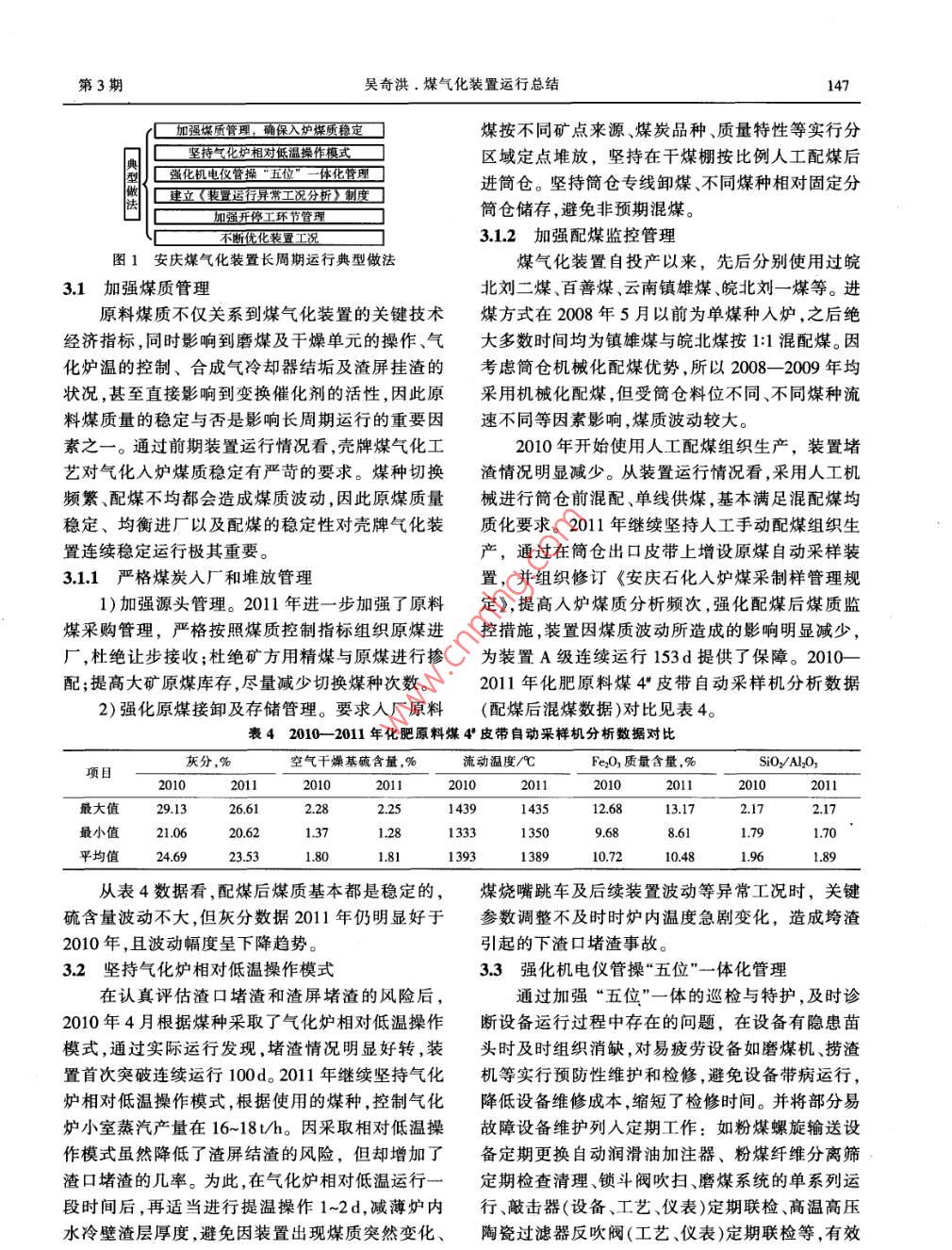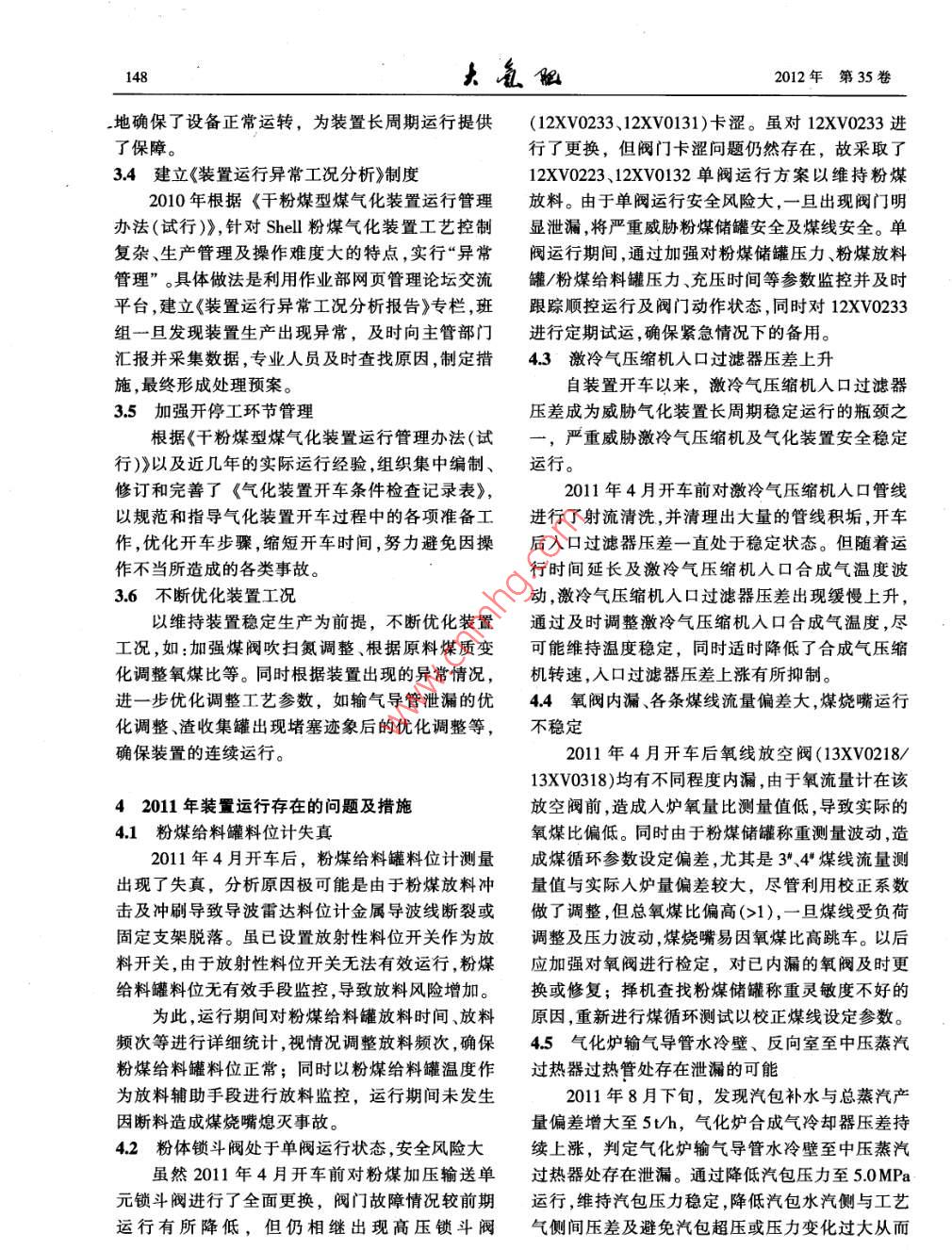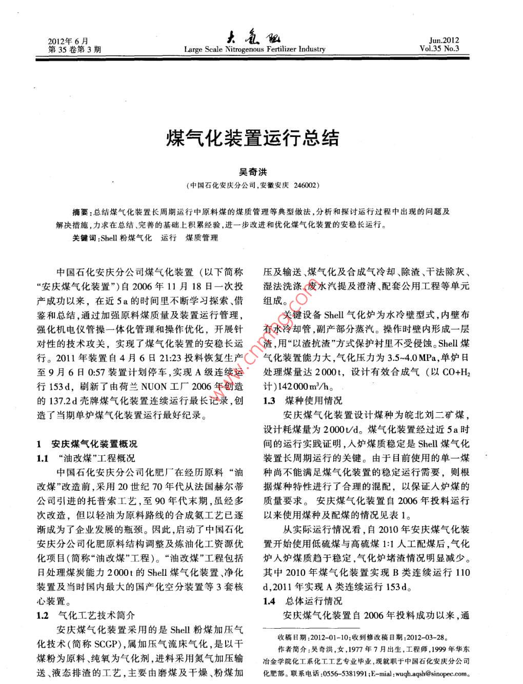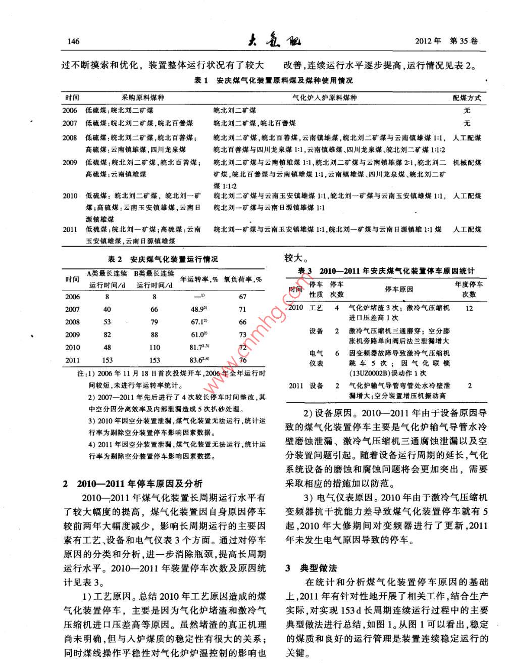 2012年6月大氛限Jun.2012 .第35卷第3期Large Scale Nitrogenous Fertilizer IndustryVol.35 No.3煤氣化裝置運行總結(jié)吳奇洪(中國石化安慶分公司,安徽安慶246002)摘要:總結(jié)煤氣化裝置長周期運行中原料煤的煤質(zhì)管理等典型做法,分析和探討運行過程中出現(xiàn)的問題及解決揩施,力求在總結(jié)、完善的基礎(chǔ)上積累經(jīng)驗,進--步改進和優(yōu)化煤氣化裝置的安穩(wěn)長運行。關(guān)鍵詞:Shell粉煤氣化運行煤質(zhì)管理中國石化安慶分公司煤氣化裝置(以下簡稱壓及輸送、煤氣化及合成氣冷卻、除渣、干法除灰、“安慶煤氣化裝置")自2006年11月18日一次投濕法洗滌、廢水汽提及澄清、配套公用工程等單元產(chǎn)成功以來,在近5a的時間里不斷學(xué)習(xí)探索、借且成。鑒和總結(jié),通過加強原料煤質(zhì)量及裝置運行管理,關(guān)鍵設(shè)備Shell 氣化爐為水冷壁型式,內(nèi)壁布強化機電儀管操一體化管理和操作優(yōu)化,開展針有水冷卻管,副產(chǎn)部分蒸汽。操作時壁內(nèi)形成一層對性的技術(shù)攻關(guān),實現(xiàn)了煤氣化裝置的安穩(wěn)長運渣,用“以渣抗渣”方式保護襯里不受侵蝕。Shell煤行。2011年裝置自4月6日21:23投料恢復(fù)生產(chǎn)氣化裝置能力大,氣化壓力為3.5~4.0MPa,單爐日至9月6日0:57裝置計劃停車,實現(xiàn)A級連續(xù)運處理煤量達2000t,設(shè)計有效合成氣(以CO+H2行153d,刷新了由荷蘭NUON工廠2006 年創(chuàng)造計)142000m2/h。的137.2d殼牌煤氣化裝置連續(xù)運行最長記錄,創(chuàng)1.3煤種 使用情況造了當(dāng)期單爐煤氣化裝置運行最好紀(jì)錄。安慶煤氣化裝置設(shè)計煤種為皖北劉二礦煤,設(shè)計耗煤量為2000t/d.煤氣化裝置經(jīng)過近5a時1安慶煤氣化裝 置概況間的運行實踐證明,人爐煤質(zhì)穩(wěn)定是Shell煤氣化1.1 “油改煤”工程概況裝置長周期運行的關(guān)鍵。由于目前使用的單一煤中國石化安慶分公司化肥廠在經(jīng)歷原料“油種尚不能滿足煤氣化裝置的穩(wěn)定運行需要,則根改煤”改造前,采用20世紀(jì)70年代從法國赫爾蒂據(jù)煤種特性進行了合理的混配,以保證人爐煤的公司引進的托普索工藝,至90年代末期,雖經(jīng)多質(zhì)量要求。安慶煤氣化裝置自2006年投料運行次改造,但以輕油為原料路線的合成氨工藝已逐以來使用煤種及配煤的情況見表1。漸成為了企業(yè)發(fā)展的瓶頸。因此,啟動了中國石化從實際運行情況看,自2010年安慶煤氣化裝安慶分公司化肥原料結(jié)構(gòu)調(diào)整及煉油化工資源優(yōu)置開始使用低硫煤與高硫煤1:1人工配煤后,氣化化項目(簡稱“油改煤”工程)?!坝透拿?工程包括爐人爐煤質(zhì)趨于穩(wěn)定,氣化爐堵渣情況明顯減少。日處理煤炭能力2000t的Shell煤氣化裝置、凈化其中2010 年煤氣化裝置實現(xiàn)B類連續(xù)運行110裝置及當(dāng)時國內(nèi)最大的國產(chǎn)化空分裝置等3套核d,2011年實現(xiàn)A類連續(xù)運行153d。心裝置。1.4 總體運行情況1.2氣化工藝技術(shù)簡介安慶煤氣化裝置自2006年投料成功以來,通安慶煤氣化裝置采用的是Shell粉煤加壓氣收稿日期:2012-01-10;收到修改稿日期:2012-03-28。化技術(shù)(簡稱SCGP),屬加壓氣流床氣化,是以干作者簡介:吳奇洪,女,1977年7月出生,工程師,1999年華東煤粉為原料、純氧為氣化劑,進料采用氮氣加壓輸冶金學(xué)院化I系化工工藝專業(yè)畢業(yè),現(xiàn)就職于中國石化安慶分公司送、液態(tài)排渣的工藝,主要由磨煤及干燥、粉煤加化肥部。聯(lián)系電話:0556-5381991 :E- -mial: wuqh.aqsh@sinopec.com.1462012年第35卷過不斷摸索和優(yōu)化,裝置整體運行狀況有了較大改善,連續(xù)運行水平逐步提高,運行情況見表2。表1安慶煤氣化裝置原料煤及煤種 使用情況時間采購原料煤種氣化爐人爐原料煤種配煤方式2006低硫煤: 皖北劉二礦煤皖北劉二礦煤無2007 低硫煤 :皖北劉二礦煤,皖北百善煤皖北劉二礦煤,皖北百善煤2008低硫煤:皖北劉二礦煤 ,皖北百善煤;皖北劉二礦煤,皖北百善煤,云南鎮(zhèn)雄煤,皖北劉二礦煤與云南鎮(zhèn)雄煤1:1,人工配煤商硫煤:云南鎮(zhèn)雄煤,四川龍泉煤皖北百善煤與四川龍泉煤1:1,云南鎮(zhèn)雄煤、四川龍泉煤、皖北劉二礦煤122009低硫煤 :皖北劉二礦煤,皖北百善煤;皖北劉二礦煤與云南鎮(zhèn)雄煤 1:1,皖北劉二礦煤與云南鎮(zhèn)雄煤2:1 ,皖北劉二機械配煤高硫煤:云南鎮(zhèn)雄煤礦煤,皖北百善煤與云南鎮(zhèn)雄煤1:1,云南鎮(zhèn)雄煤、四川龍泉煤、皖北劉二礦煤1:12010 低硫煤:皖北劉二礦煤,皖北劉一礦皖北劉二礦煤與云南玉安鎮(zhèn)雄煤1:1,皖北劉一礦煤與云南玉安鎮(zhèn)雄煤1:1,人工配煤煤;高硫煤:云南玉安鎮(zhèn)雄煤,云南日皖北劉一礦 煤與云南日源鎮(zhèn)雄煤1:1源鎮(zhèn)雄煤2011 低硫煤 :皖北劉一礦煤;高硫煤:云南皖北劉一礦煤與云南玉安鎮(zhèn)雄煤 1:1,皖北劉- -礦煤與云南日源鎮(zhèn)雄1:煤人工配煤玉安鎮(zhèn)雄煤,云南日源鎮(zhèn)雄煤表2安慶煤氣化裝運行情況較大。A類最長連續(xù)B類最長連續(xù)年運轉(zhuǎn)率,%氧負荷率,%表32010- -2011 年安慶煤氣化裝置停車原因統(tǒng)計運行時間/d_運行時間/d停車停車年度停車200686性質(zhì)次數(shù)停車原因次數(shù)20074(48.92010 工藝4氣化爐堵渣3次;激冷氣壓縮機12進口壓差高1次2008537967.126620098261.02>設(shè)備 2激冷氣壓縮機三通磨穿;空分膨脹機旁