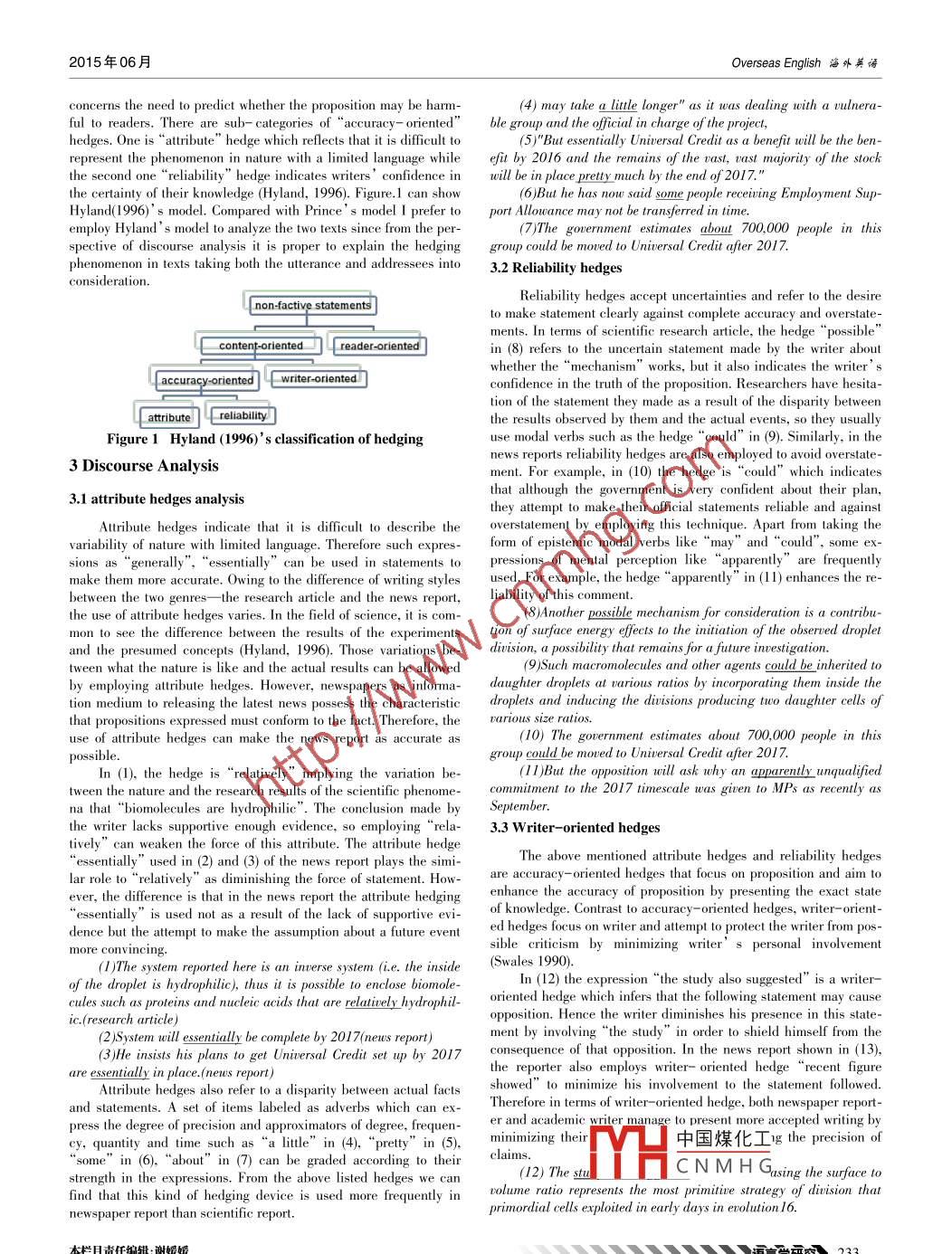 hwsy@overseaen.comISSN 1009- -5039htp://ww.overcaen.comOverseas English海外英語(yǔ)Tel:+86- -551-65690811 65690812Hedging in Discourse AnalysisXIAO Xin(Department of Education, The Universily of York, UK, Y010 5NG)Abstract: In this article an attempt to enhance the awareness of hedging use in discourse analysis and academic writing is madeby analyzing hedges employed in two comparable texts. The discourse analysis is conducted from“content- oriented" hedges and“reader- oriented" hedges. The article suggests that hedging can dampen utterances and statements, weaken the force of what one .says and show politeness to the listeners or readers, which varies from different discourse styles of various genres.Key words:iscourse marker; hedging; research article; news report中圖分類(lèi)號(hào):H0文獻(xiàn)標(biāo)識(shí)碼:A文章編號(hào): 1009- -5039(2015)12- -0232- -031 Introductionto 1965, neither Zadeh nor W einreich used the term“hedging” or“hedges” in their studies. The notion of hedging from the perspec-In recent studies of discourse analysis metadiscourse receivedtive of linguistics was originally introduced by Lakoff (1973) in hisa great deal of attention. The metadiscourse model proposed by Hy-article "Hedges: A Study in Meaning Criteria and the Logic ofland and Tse (2004) divides metadiscourse into two main calego- Fuzzy Concepts". Lakoff (1973, p.458-- 461) labeled hedging asries- interactive and interactional. As one of the interactional me-linguistic expressions that are used to modify the truth of the propo-ta-signaling devices, hedging generally refers to expressions of pos-sition, conveying fuzziness and tentativeness.sibility such as 'likely’ , 'I think’and‘ may' that can minimizeHedging is defined as a means to make utterances or state-force and provide an opinion rather than a fact (takura & Tsui, ments fzzier and less forceful, protecting the 'face ; of the speak-2011). In spite of some previous studies about hedging, compareder. Biber (1988, 240) gives a discourse- oriented definition of hedg-with other meta- signaling devices such as transitions and framees that“hedges are informal, less specific markers of probability ormarkers, the analyses of hedging are somewhat les. Furthemore, uncertainty". Later Hyland(1996, p.433) put forward a definition ofdespite the frequent occurrence and distribution of hedging in re-hedging highlighting its significance of academic writing thatsearch articles, newspapers and conversational discourses, the anal-“hedging is the expression of tentativeness and possibility and it isysis of hedging in comparable discourses received less attention.central to academic writing where the need to present unprovenTherefore, in this article hedging will be discussed with the pur-propositions with caution and precision is essential”.pose of enhancing the awareness of hedging use in discourse analy-W ith respect to the category of hedging, it presents an unfixedsis and academic writing by analyzing the use of hedging in twomodel. From the semantic and pragmatic perspective, Prince, Frad-comparable texts. One of the comparable texts is an extract of a re-er and Bosk(Prince, Frader, & Bosk , 1982) categorized hedging in-search article in the field of Biotechnology from Scientific Reports to “approximanators” and “shields” “Approximators” are expres-(Sato, Y asuhara, Kikuchi, & Sato, 2013). The other is a news reportfrom BBC Neus (Hawkins, 2013). The discourse analysis will becourse fuzzier and highlight the adequacy of discourse content.conducted from“content oriented" and“witer oiented" hedges "Shields" are worls and phrases like "migh”, "I think" and“per-employed from Hyland's classification of hedging (Hyland, 1996). .haps”which are employed to modify the truth of the utterance,2 Literature Reviewshowing that the speakers and writers are not committed to the va-lidity of what they convey.With respect to the origin of hedging, Zadeh (1965) and Wein-Similar with Prince’s model, the classification of hedging pro-eich (1966) as the most important predecessors of hedging re-posed by Hyland (1996) is in his'pragmatic framework", but he di-search should be mentioned. Zadeh( 1965) considered classes suchvided hedging in the context of academic discourse into two catego-as“animal" to own unchanged membership criteria in his“Fuzyries. One is“content-oriented”which refers to the relationship be-Sets", which is the fuzzy set theory. W einreich( 1996) marked hedg-tween what writers propose and what the reality represent concern-ing as‘metalinguistic operators”in his article “On the Semantic .ing the statements’accuracy conditions. The other is“reader- ori-Structure of English". He argued that:ented”which takes the readers’ response of propositions an"for every language 'metalinguistic operators' such as (in) Eng-whether they accept them into consideration. In sum, a hypothesislish true, real, so- called, strictly speaking, and (in) German ei-made by a writer is related to both the nature of reality and thegentlich, and the most powerful extrapolator of all - like - functionceptability to an audience (Hyland, 1996,). “Content- oriented"as instructions for the loose or strict interpretation of designatal"hedges can be further divided into two categories, namely“accura-(1966, p.163). .cy- oriented”and“ writer- oriented' . The first one is an obligationAlthough they argued the phenomenon of hedging dating backto present propositions as accurately as possible while the second中國(guó)煤化工MHCNMHG收稿日期:2015-05-05修回日期:2015-05-25作者簡(jiǎn)介:肖欣(1990-),女,湖北孝感人,英國(guó)約克大學(xué)教育學(xué)院對(duì)外英語(yǔ)教育研究生,研究方向:對(duì)外英語(yǔ)教育。232 /遭孚研酸7 7 2欄目責(zé)任編輯:謝媛媛Overseas English海外英語(yǔ)2015年06月(13) Our results reported herein suggest _tha