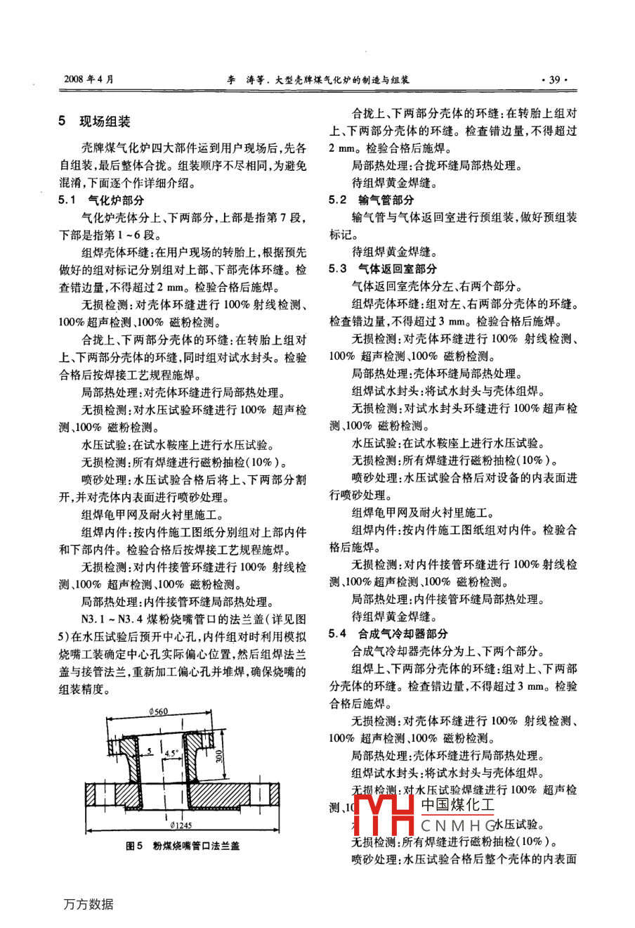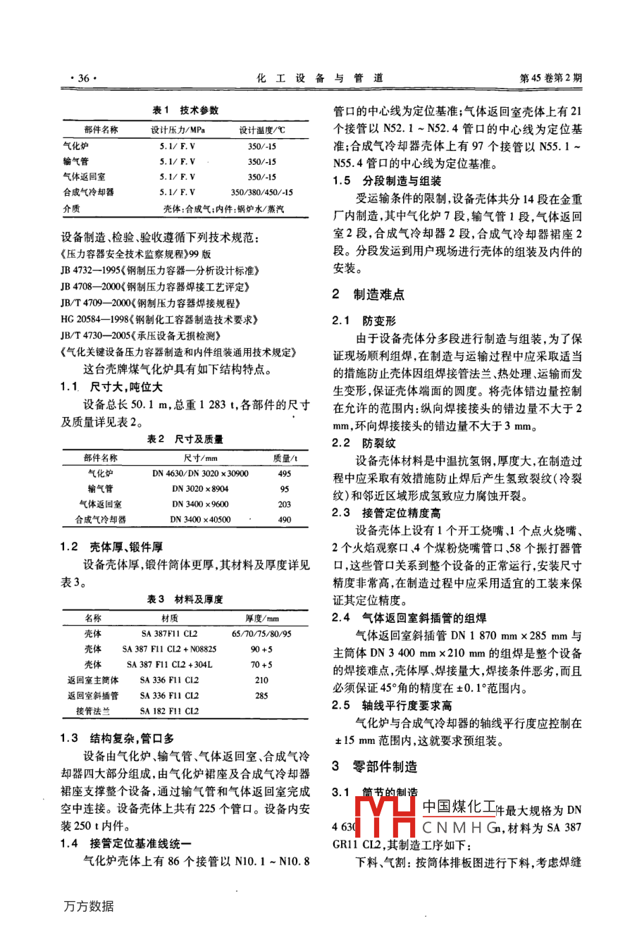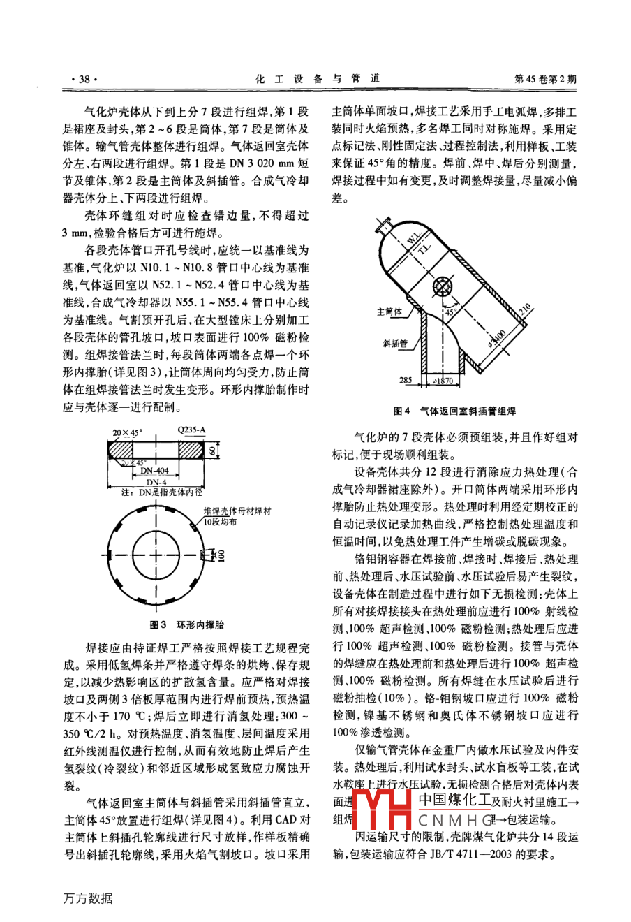 第45卷第2期化工設備與管道VoL.45 No.2008年4月PROCESS EQUIPMENT & PIPINGApr. 2008大型殼牌煤氣化爐的制造與組裝李濤都吉哲王青(大連冰山集團金州重型機器有限公司,大連116100)摘要: 介紹了大型殼牌煤氣化爐的結構特點、制造難點、霉部件制造、組焊工藝及現(xiàn)場組裝方案。針對結構特點和制造難點闡述了相應的有效措施,并討論了制造過程中的注意事項,供同類設備制造時參考。.關鍵詞:大型殼牌煤氣化爐;制造;組裝中圖分類號:TQ053.2文獻標識碼: A文章編號: 1009-3281(2008 )02-003506Manufacture and Assembling of Shell Brand Large Coal Gasifying FurnaceLi Tao Dou Jizhe Wang Qing(Jinzhou Heary Machinery Co. , Ld, Dalian Bingshan Group, Dalian 116100)Abstract In this article, the structure characteristics, the core points in fabrication, part fabrication, assembling and welding processand assembling scheme onsite of Shell brand large coal gasifying fumace were introduced. With respet to the structure charateristicsand the core points in fabrication, the ffective measures to deal with the problems were described and the notices in fabrication werediscussed. What presented in this article can be referenced in the fabrication of similar equipment.Keywords Shell brand large coal gasifying fumace; fabrication; assembling殼牌的煤氣化技術是當今世界煤技術發(fā)展的主流,具有超潔凈、超高效的特點,近年來在我國發(fā)展氣體返回章迅速,主要原理是將煤粉碎研磨成極細的干煤粉粒,p分兩段運輸噴入氣化爐,通過水蒸氣和氧氣氣化,經冷卻生產出合成氣。這種合成氣可用于城市煤氣、煉鋼還原劑,輸氣管|或用于聯(lián)合循環(huán)發(fā)電,也可作為生產化工產品和化起輸肥、運輸燃料、氫氣等的原料。此技術的應用和推廣將有助于我國解決能源緊張和環(huán)境污染問題。荊藍殼牌煤氣化技術的關鍵設備是殼牌煤氣化爐。合成氣冷卻馨,分兩段運輸大連冰山集團金州重型機器有限公司(以下簡稱金重)在殼牌煤氣化爐的制造上處于國內領先地位,運輸2003年成功地制造出國內第1臺殼牌煤氣化爐,現(xiàn)已制造出7臺。本文介紹其中某臺的制造與組裝工藝。1結構特點圖1 設備簡圉這臺殼牌煤氣化爐是國內某廠年產500 kt甲醇中國煤化工項目中的氣化關鍵設備,金重負責該設備壓力容器收稿CNMHG外殼的制造和內件的安裝(內件由BPE提供)。其作者簡小:子附(1,力,上住師。工女從事壓力容器設計、審結構簡圖如圖1所示,技術參數見表1。核及制造工藝編制工作。●36.化工設備與管道第45卷第2期表1技術參數管口的中心線為定位基準;氣體返回室殼體上有21部件名稱設計壓力/MPa設計溫度/心個接管以N52.1 ~ N52.4管口的中心線為定位基氣化爐s.1/F.V350/-15準;合成氣冷卻器殼體上有97個接管以N55. 1 ~輸氣管5.1/ F.VN55. 4管口的中心線為定位基準。氣體返回室5.1/F.V1.5 分段制造與組裝合成氣冷卻器350/380/450/-15受運輸條件的限制,設備殼體共分14段在金重介質殼體:合成氣;內件:鍋妒水/蒸汽廠內制造,其中氣化爐7段,輸氣管1段,氣體返回設備制造檢驗驗收遵循下列技術規(guī)范:室2段,合成氣冷卻器2段,合成氣冷卻器裙座2《壓力容器安全技術監(jiān)察規(guī)程>99版段。分段發(fā)運到用戶現(xiàn)場進行殼體的組裝及內件的JB 4732-1995<鋼制壓力容器一分 析設計標準》安裝。JB 4708- 2000< 鋼制壓力容器焊接工藝評定》2制造難點JB/T 4709- 2000<0 鋼制壓力容器焊接規(guī)程》HG 20584- -1998<《鋼制化工容器制造技術要求》2.1防變形JB/T 4730- -2005《承壓設備無損檢測》由于設備殼體分多段進行制造與組裝,為了保《氣化關鍵設備壓力容器制造和內件組裝通用技術規(guī)定》證現(xiàn)場順利組焊,在制造與運輸過程中應采取適當這臺殼牌煤氣化爐具有如下結構特點。的措施防止殼體因組焊接管法蘭、熱處理、運輸而發(fā)1.1尺寸大,噸位大生變形,保證殼體端面的圓度。將殼體錯邊量控制設備總長50.1 m,總重1 283 t, 各部件的尺寸在允許的范圍內:縱向焊接接頭的錯邊量不大于2及質量詳見表2。mm ,環(huán)向焊接接頭的錯邊量不大于3 mm。表2尺寸及質量2.2 防裂紋尺寸/mm質量/t設備殼體材料是中溫抗氫鋼,厚度大,在制造過DN 4630/ DN 3020 x 3090095程中應采取有效措施防止焊后產生氫致裂紋(冷裂DN 3020 x8904DN 3400 x960003紋)和鄰近區(qū)域形成氫致應力腐蝕開裂。2.3接管定位精度高DN 3400 x40500490設備殼體上設有1個開工燒嘴、1個點火燒嘴、1.2 殼體厚、 鍛件厚2個火焰觀察口.4個煤粉燒嘴管口.58個振打器管設備殼體厚,鍛件簡體更厚,其材料及厚度詳見口,這些管口關系到整個設備的正常運行,安裝尺寸表3。精度非常高,在制造過程中應采用適宜的工裝來保表3材料及厚度證其定位精度。名稱材質厚度/mm2.4氣體返回 室斜插管的組焊殼體SA 387F11 CL265/70/75/80/95氣體返回室斜插管DN 1 870 mm x285 mm與SA 387 FII CL2 + N0882590+5主簡體DN3400mmx210mm的組焊是整個設備SA 387 F11 CI2 +304L70+5的焊接難點,殼體厚、焊接量大,焊接條件惡劣,而且返回室主簡體SA 336 FII CI2210必須保證45°角的精度在+0.1°范圍內。返回室斜插管SA 336 FII CL22852.5軸線 平行度要求高接管法蘭SA 182 FII CL2氣化爐與合成氣冷卻器的軸線平行度應控制在1.3結構復雜,管口多土15mm范圍內,這就要求預組裝。設備由氣化爐、輸氣管、氣體返回室、合成氣冷3零部件制造卻器四大部分組成,由氣化爐裙座及合成氣冷卻器裙座支撐整個設備,通過輸氣管和氣體返回室完