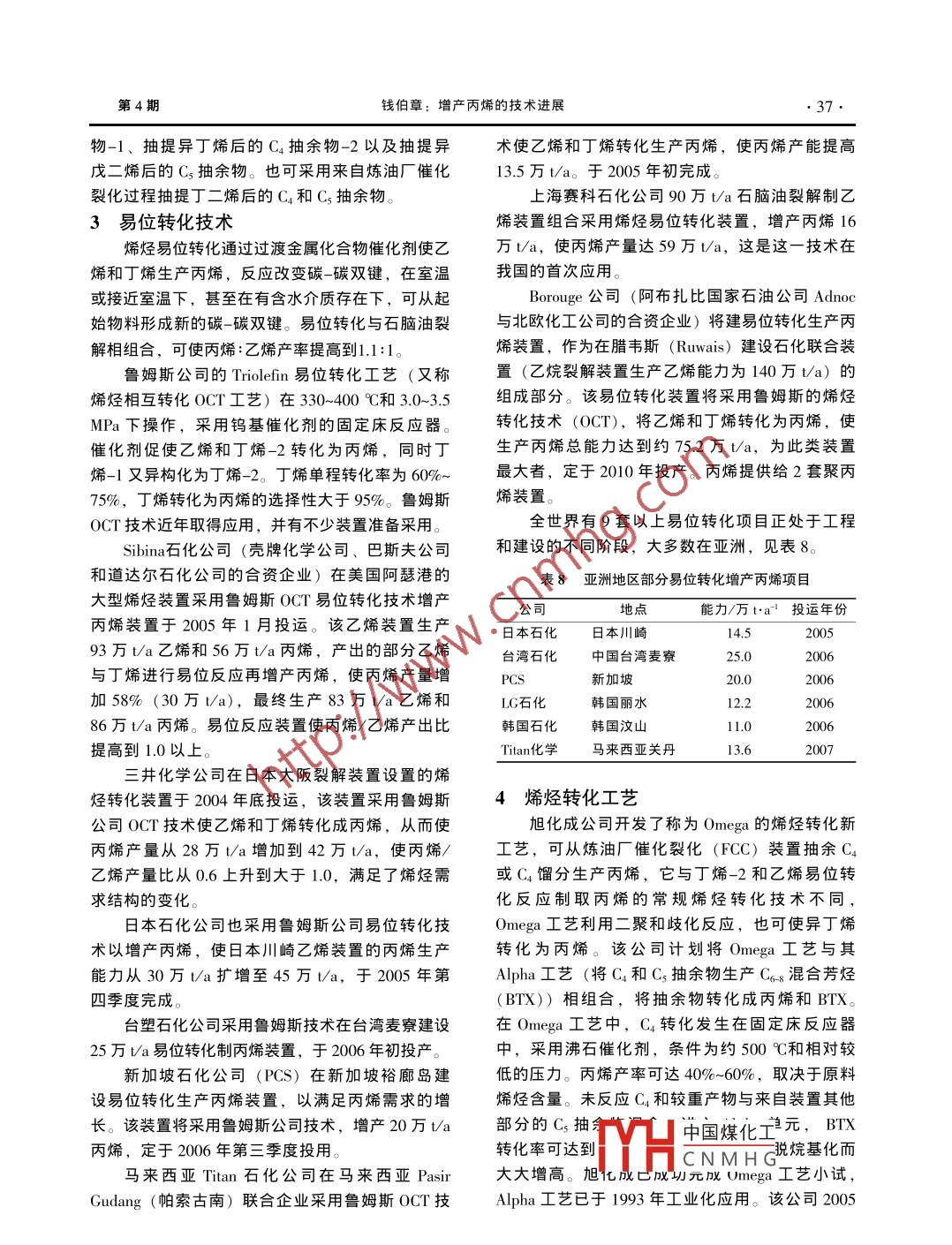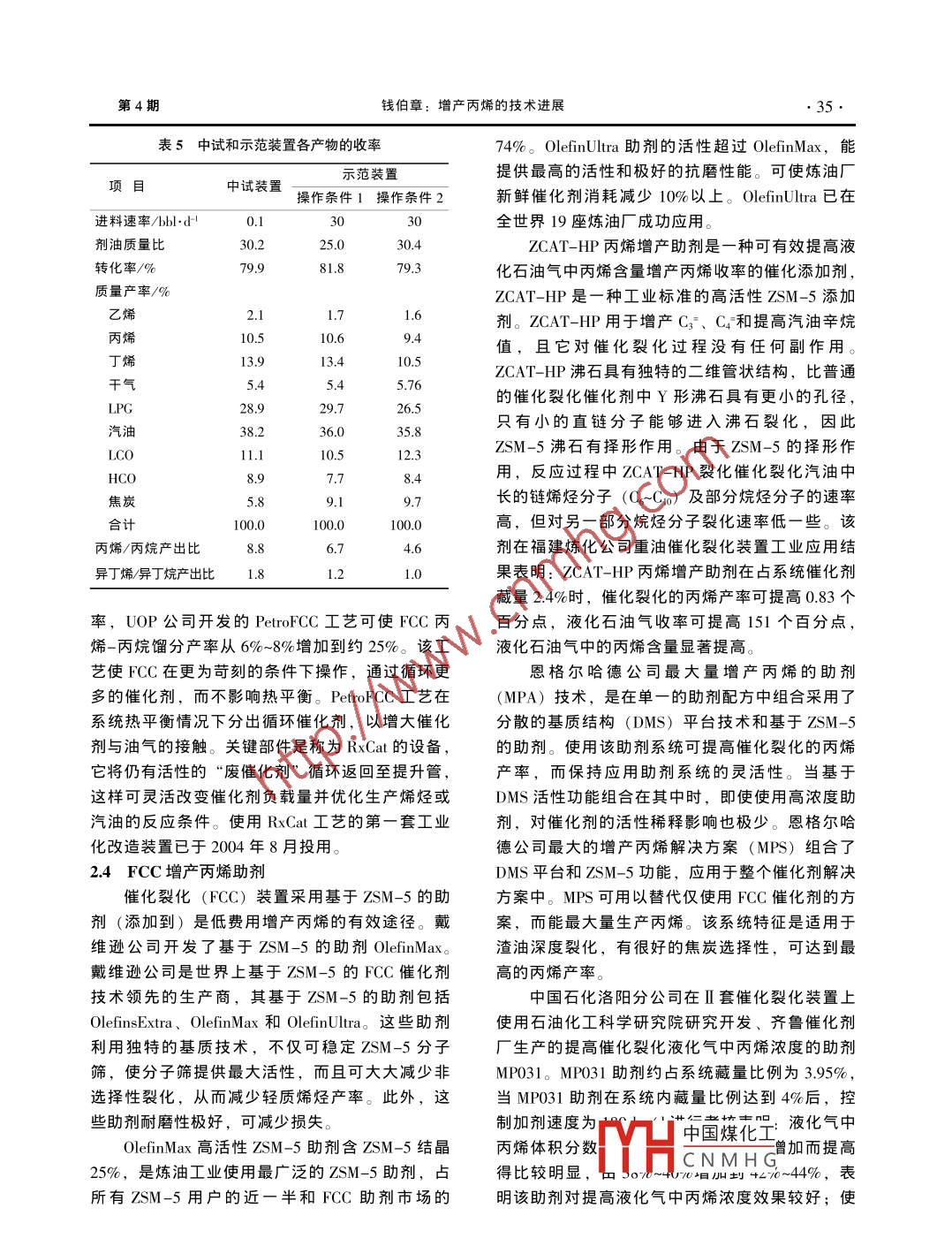 第24卷第4期化工技術(shù)經(jīng)濟(jì)2006年4月CHEMICAL TECHNO-ECONOMICS法起增產(chǎn)丙烯的技術(shù)進(jìn)展錢伯章(上海擎督信息科技公司金秋石化科技傳播工作室,上海200127摘要:闡述各國增產(chǎn)丙烯的技術(shù)。提出DCC、烯烴易位轉(zhuǎn)化、CψC5烴選擇裂解和MTO、MTP工藝可以推廣應(yīng)用,而丙烷脫氫工藝在我國受資源短缺制約,其工業(yè)應(yīng)用條件不具備。關(guān)鍵詞:丙烯;制備;技術(shù)經(jīng)濟(jì)對(duì)比;評(píng)論文章編號(hào):1006-253X(200)04-0033-08中圖分類號(hào):TQ22.21+2文獻(xiàn)標(biāo)識(shí)碼:A世界丙烯需求增長(zhǎng)率高于乙烯,丙烯/乙烯需2.1 DCC求比例呈不斷增高趨勢(shì),增產(chǎn)丙烯技術(shù)已成為石DCC工藝可看作是常規(guī)FCC操作與蒸汽裂解化技術(shù)重要的發(fā)展趨勢(shì)。據(jù)預(yù)測(cè),在2010年前的的組合。DCC裝置在538~582℃、10%-30%蒸汽后5年內(nèi),全球丙烯年需求量將增長(zhǎng)1400萬t,條件下操作,而FCC裝置在493~549℃、1%~3%而新的裂解裝置和現(xiàn)有裝置擴(kuò)建僅能增加500萬t蒸汽條件下操作。DCC操作采用分子篩催化劑選另有400萬t丙烯將通過丙烷脫氫和易位轉(zhuǎn)化得擇性地生產(chǎn)丙烯、乙烯和富芳烴石腦油。到。擬建的裂解裝置大多數(shù)以乙烷為原料,不能DCC可以加工各種重油。已經(jīng)用于國內(nèi)外大量生產(chǎn)丙烯。其他澘在的丙烯來源為煉油廠。DCC工業(yè)裝置的原料包括:蠟油、加氬處理蠟因此,增產(chǎn)丙烯的技術(shù)受到關(guān)注。油、脫瀝青油、焦化蠟油、常壓渣油、減壓渣油1蒸汽裂解增產(chǎn)丙烯技術(shù)加氫處理潤滑油抽岀油、潤滑油脫蠟蠟膏等等。為適應(yīng)石腦油裂解生產(chǎn)較多丙烯的需求,日211工業(yè)實(shí)踐本國家材料和化學(xué)研究院與四家石化公司聯(lián)合開中國石化濟(jì)南煉油廠一套閑置的FCC裝置改發(fā)了一種增產(chǎn)丙烯、節(jié)減能耗的石腦油裂解工藝造成6萬 ta dcc工業(yè)試驗(yàn)裝置。該裝置經(jīng)過擴(kuò)可使丙烯/乙烯產(chǎn)出比由傳統(tǒng)的06:1提高到07:1。能改造后處理能力達(dá)到15萬t/a。我國已有5個(gè)與常規(guī)的熱裂解相比,該工藝在固定床中采用分煉油廠和石化企業(yè)建設(shè)了5套DCC裝置,其中處子篩為載體的鑭催化劑。實(shí)驗(yàn)室驗(yàn)證試驗(yàn)表明,理能力最大的一套達(dá)到80萬t/a。在泰國TP公該工藝可使乙烯和丙烯產(chǎn)率達(dá)到61%,而常規(guī)的司建設(shè)了一套75萬t/a最大量丙烯生產(chǎn)的DCC裝蒸汽裂解為50%。3000t/d裝置的可行性研究指置現(xiàn)已擴(kuò)能到92萬Ua。表1列出了DCC工業(yè)裝出,操作可在約650℃和0.1-0.2MPa壓力下進(jìn)置一覽表。行,而傳統(tǒng)的裝置需在約820℃和0.1-02MPa下2.1.2DCC典型烯烴產(chǎn)率進(jìn)行。裝置費(fèi)用與常規(guī)裂解相似,但因在較低溫三個(gè)煉油廠的DCC輕烯烴產(chǎn)率列于表2。大度下操作,能耗減少約20%慶石蠟基原料顯示岀最高的丙烯和異丁烯質(zhì)量產(chǎn)2增產(chǎn)丙烯的催化裂化改進(jìn)技術(shù)率(均指質(zhì)量產(chǎn)率),分別達(dá)到23.0%和6.9%近年,FCC裝置發(fā)展了多種增產(chǎn)丙烯的工藝中間基原料在DCC-Ⅰ型操作時(shí)丙烯產(chǎn)率高于技術(shù),主要有:中國石化石油化工研究院(RP)18%。在DCC-Ⅱ型操作時(shí)丙烯產(chǎn)率為144%,而的深度催化裂化工藝(DCC),凱洛格-布朗路特汽油產(chǎn)率接近Q中國煤化工(KBR)公司的 Maxofin工藝、 Superflex工藝UOP公司的 PetroFAc工藝,魯姆斯公司的SCC收稿日期:2006-CNMHG作者簡(jiǎn)介:錢伯章(1939-),男,江蘇省人,教授級(jí)高工,從事工藝。石油化工技術(shù)及經(jīng)濟(jì)信息調(diào)研和傳播工作術(shù)經(jīng)濟(jì)34CHEMICAL TECHNO-ECONOMICS2006年第24卷表1已工業(yè)運(yùn)營的DCC裝置表3泰國TP公司DCC裝置產(chǎn)率地區(qū)能力萬ta開工日期操作模式原料油項(xiàng)目1998年2000年2004年中國濟(jì)南61999-11 DCC- VGO+DAO原料油阿拉伯加阿拉伯加阿拉伯加氫中國濟(jì)南擴(kuò)能為151994-06DCC-和ⅡVCO+DAO氫蠟油+氫蠟油+蠟油+25%中國安慶1995-03 DCC- VGo+CGO7%DAO 23 0ATB ATB+8%VTB中國大慶121995-05DCC-IVGO+ATB,催化劑CIP-3+MMC-2反應(yīng)溫度/℃565555550泰國TPI751997-05 DCC-I VGO+WAX+產(chǎn)品質(zhì)量分?jǐn)?shù)/%8.3HIC?11.637.5中國荊門1998-09DCC-ⅡⅤGO-VTB36.0中國沈陽1998-10DCC-ⅡATBC汽油35.7中國錦州30999-09DCC-Ⅰ和ⅢⅤGC,ATB汽油辛烷值注:VGO一減壓餾分油;DAO一脫瀝青油;CGO—焦化蠟油;RONATB—常壓渣油;WAX一蠟膏;VTB一減壓渣油。MON85.3烯烴質(zhì)量分?jǐn)?shù)/%表2國內(nèi)DCC裝置低碳烯烴產(chǎn)率乙烯頂目大慶石化安慶石化濟(jì)南煉油廠濟(jì)南煉油廠丙烯18.516.516.5操作模式DCC-IDCC-IDCC-IDCC-Ⅱ丁烯13.3原料油石蠟基中間基中間基中間基ⅤGO+ ATB VGOⅤCO+ DAO VGO+DAO表4大慶常壓渣油DCC工業(yè)試驗(yàn)產(chǎn)品分布反應(yīng)溫度^℃C545550530項(xiàng)目DCC-IDCC-Ⅱ烯烴質(zhì)量分原料油大慶常渣大慶常渣數(shù)/%反應(yīng)溫度/℃C乙烯產(chǎn)品質(zhì)量分?jǐn)?shù)/%丙烯23018.619.214.4干氣11.77丁烯17.3114液化氣其中,異695.24.8其中,丙烯24.8314.57汽油18.90柴油15,30泰國石油化工有限公司(TPI)的DCC裝置油漿5.42摻煉常壓渣油的比例最高達(dá)到35%,處理量也提焦炭691高到92萬ta,丙烯產(chǎn)率還能達(dá)到16.5%。該裝置損失l.00.30典型的操作條件、產(chǎn)品產(