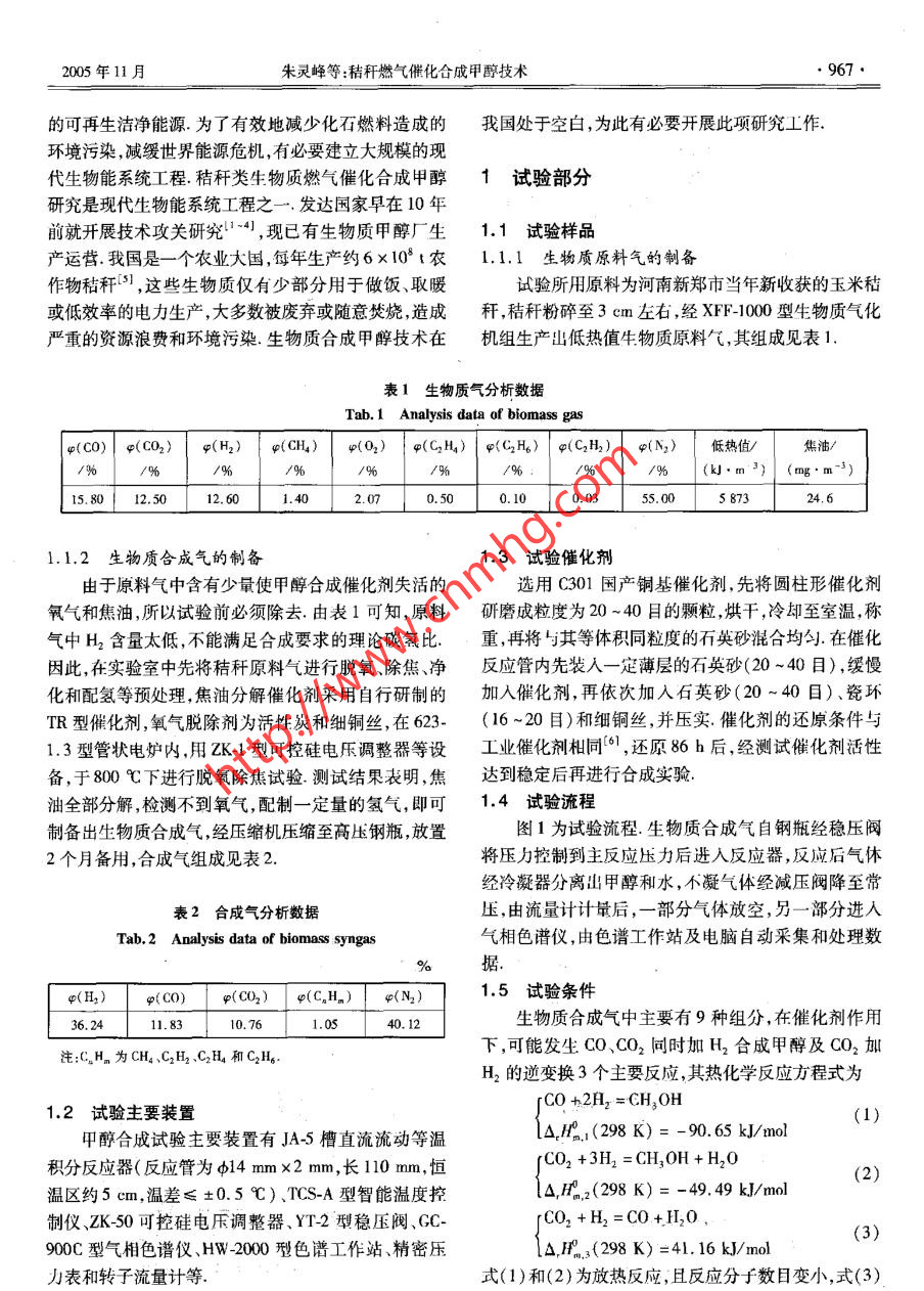 第38卷第11期天津大學(xué)學(xué)報(bào)Vol. 38 No. 112005年11月Journal of Tianjin UniversityNov. 2005秸稈燃?xì)獯呋铣杉状技夹g(shù)朱靈峰'2,梁庚白’,朱金梭”,張百良,劉德華”,雒廷亮’,劉國(guó)際(1.華北水利水電學(xué)院環(huán)境工程系,鄭州450008; 2.清華大學(xué)化工系,北京100084;3.中國(guó)石油化工股份有限公司河南油田分公司第二采油廠,南陽(yáng)473400;4.河南農(nóng)業(yè)大學(xué)機(jī)電工程學(xué)院,鄭州450002; s.鄭州大學(xué)化工學(xué)院,鄭州450002)摘要:生物質(zhì)能是一種可再生能源.為了實(shí)現(xiàn)秸稈類生物質(zhì)合成燃料甲醇的工業(yè)轉(zhuǎn)化,有效利用生物質(zhì)能,對(duì)下吸式固定床氣化爐產(chǎn)生的低熱值玉米秸稈燃?xì)膺M(jìn)行除氧、分解焦油和配氫等純化試驗(yàn),制備出合成甲醇的優(yōu)質(zhì)秸稈合成氣,在直流流動(dòng)等溫積分反應(yīng)器中,使用國(guó)產(chǎn)C301銅基催化劑,催化劑粒度為20 -40目(0. 833 mm x0. 351mm),在5 MPa反應(yīng)壓力下,對(duì)玉米秸稈合成氣進(jìn)行催化合成甲醇試驗(yàn)研究,獲得33套試驗(yàn)數(shù)據(jù).試驗(yàn)結(jié)果表明,低熱值秸稈燃?xì)馔ㄟ^(guò)適當(dāng)處理,可直接合咸甲醇,合成反應(yīng)的適宜溫度為230 ~250心,適宜流量為0.8-1. 0 mol/h,較佳的甲醇時(shí)空收率為0. 24 kg/(kgcat●h).關(guān)鍵詞:玉米秸稈;燃?xì)?合成氣;催化劑;甲醇;合成中圖分類號(hào): S216文獻(xiàn)標(biāo)志碼: A文章編號(hào): 0493- 2137(2005)11- 0966- 04Methanol Catalytic Synthesis from Cornstalk GasesZHU Ling-feng'2, LIANG Geng-bai' , ZHU Jin-suo ,ZHANG Bai-liang,LIU De-hua2 , L0U Ting liang' , IJU Cuo-ji'(1. Department of Environmental Engineering, North China Institute of Water Conservancy and Hydroelectric Power,Zhenghou 450008 , China; 2. Department of Chemical Engneering, Tsinghua University, Beijing 10084, China; 3. TheNo.2 Oil Recovery Company of Henan Oilfeld Company , China Petroleum and Chenical Corporalion, Nanyang 473400,China; 4. School of Mechanical and Electronic Engineering, Henan Agricultural University , Zhengzhou 450002 , China; 5. .Institute of Chemical Technology , Zhengzhou Univensity , Zhengz.hou 450002 , China)Abstract: Biomass energy is a renewable resource. Experiments on purification technologies for the conversionof cornstalk biomass into the industrial product ( synthesis of fuel methanol ) were made to produce cormnstalk gas .( low heat value) in the down-flow fixed by the gasifier. The experinent focused on the technical procedures fordeoxygenation, catalytie cracking of tar, hydrogenation, etc. Quality straw syngus was produced for methanolsynthesis. The catalysis of methanol synthesis for the production of cormstalk syngas was carried out in a tubular-flow integral and isothermal reactor under the pressure of 5 MPa over Cu-based catalyst C301 ( particle size:0. 833 mmx0.351 mm), a catalyst made in China. Thirty-three sets of test data were obtained. The test re-sults showed that the methanol could be synthesized directly from cornstalk gas( low heat value ) through propertreatment. The proper operation temperature of the synthetic reaction was 230- -250 C; the suitable flow ofsyngas was 0. 8-1.0 mol/h; and the better methanol time -space yield was 0.24 kg/(kgcat . h).Keywords: cornstalk; fuel gas; syngas; catalyst ; methanol ; synthesis近年來(lái)人們對(duì)生物質(zhì)日益增長(zhǎng)的可持續(xù)利用的興趣空 前高漲,生物質(zhì)有可能成為21世紀(jì)- -種全球最大收稿日期; 2003- 10-22;修回日期: 2005- 08-05.基金項(xiàng)目:河南省敦育科技攻關(guān)資助項(xiàng)日(2003150040).作者簡(jiǎn)介:朱滅峰( 1958-).男,博士,教授,lbhu yrvc@ yuhoo. com. cn.2005年11月朱靈峰等:秸稈燃?xì)獯呋铣杉状技夹g(shù)●967的可再生潔凈能源.為了有效地減少化石燃料造成的我國(guó)處于空白,為此有必要開(kāi)展此項(xiàng)研究工作.環(huán)境污染,減緩世界能源危機(jī),有必要建立大規(guī)模的現(xiàn)代生物能系統(tǒng)工程.秸稈類生物質(zhì)燃?xì)獯呋铣杉状?試驗(yàn)部分研究是現(xiàn)代生物能系統(tǒng)工程之-一.發(fā)達(dá)國(guó)家早在10年前就開(kāi)展技術(shù)攻關(guān)研究1-41 , 現(xiàn)已有生物質(zhì)甲醇廠生1.1 試驗(yàn)樣品產(chǎn)運(yùn)營(yíng).我國(guó)是一個(gè)農(nóng)業(yè)大國(guó),每年生產(chǎn)約6x108 t農(nóng)1.1.1 生物質(zhì)原料氣的制備作物秸稈[5] ,這些生物質(zhì)僅有少部分用于做飯、取暖試驗(yàn)所用原料為河南新鄭市當(dāng)年新收獲的玉米秸或低效率的電力生產(chǎn),大多數(shù)被廢棄或隨意焚燒,造成稈,秸稈粉碎至3 cm左右,經(jīng)XFF-1000型生物質(zhì)氣化嚴(yán)重的資源浪費(fèi)和環(huán)境污染.生物質(zhì)合成甲醇技術(shù)在機(jī)組生產(chǎn)出低熱值生物質(zhì)原料氣,其組成見(jiàn)表1.表1 生物質(zhì)氣分析數(shù)據(jù)Tab.1 Analysis data of biomass gas| 4(CO) | e(CO2)4(H2)φ(CH4)φ(02)中(G2H)| o(CH)| q(C2H2)φ(N2)低熱值/焦油//%/% :(kJ.m3) (mng.m-3)15.80| 12.5012. 601.402.070. 500.100.0355.005 8731.1.2生物質(zhì)合成氣的制備1.3試驗(yàn)催化劑由于原料氣中含有少量使甲醇合成催化劑失活的選用C301國(guó)產(chǎn)銅基催化劑,先將圓柱形催化劑氧氣和焦油,所以試驗(yàn)前必須除去由表1可知,原料研磨成粒度為20~40目的顆粒,烘干,冷卻至室溫,稱氣中H2含量太低,不能滿足合成要求的理論碳?xì)浔?重,再將5其等體積同粒度的石英砂混合均勻在催化因此,在實(shí)驗(yàn)室中先將秸稈原料氣進(jìn)行脫氧、除焦、