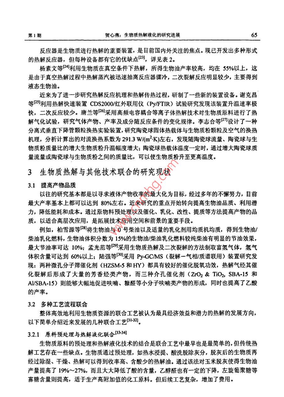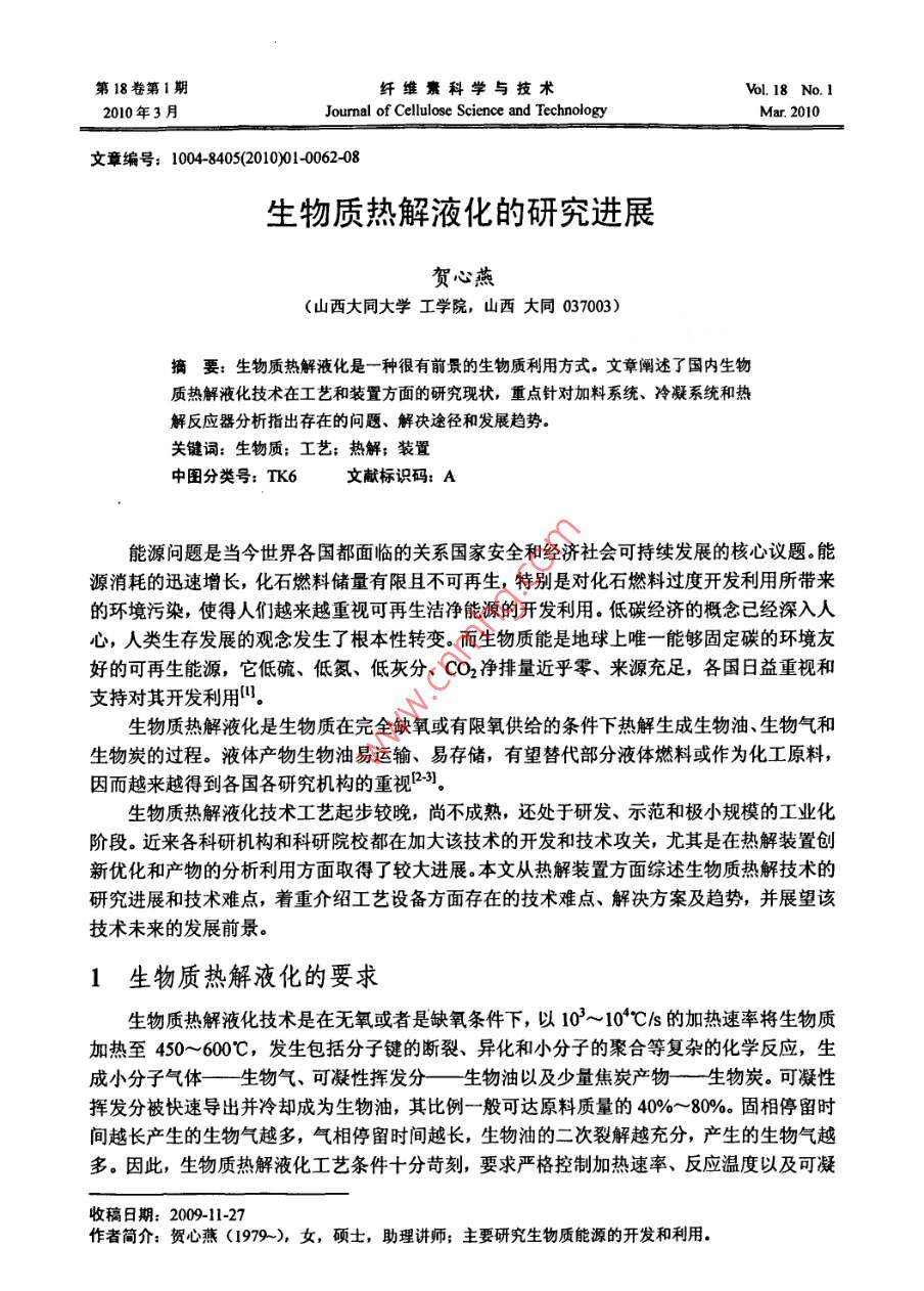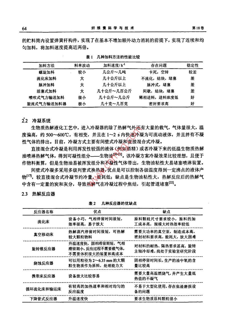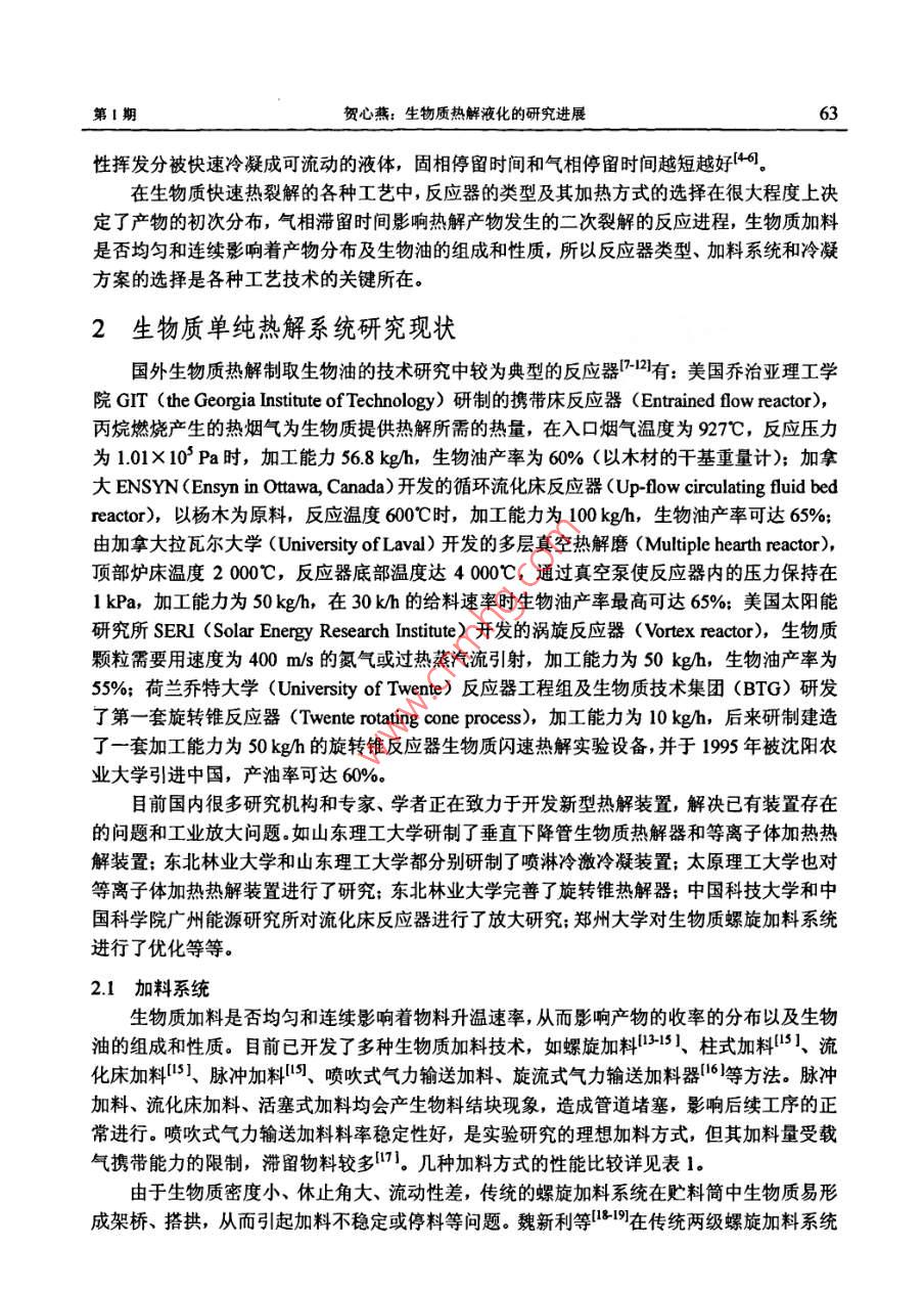 第18卷第1期纖維科學(xué)與技術(shù)Vol. 18 No. 12010年3月Journal of Cellulose Science and technologyMar.2010文章編號(hào):10048405(2010)01-006208生物質(zhì)熱解液化的研究進(jìn)展賀心燕(山西大同大學(xué)工學(xué)院,山西大同037003)搞要:生物質(zhì)熱解液化是一種很有前景的生物質(zhì)利用方式。文章闡述了國(guó)內(nèi)生物質(zhì)熱解液化技術(shù)在工藝和裝置方面的研究現(xiàn)狀,重點(diǎn)針對(duì)加料系統(tǒng)、冷凝系統(tǒng)和熱解反應(yīng)器分析指出存在的問題、解決途徑和發(fā)展趨勢(shì)關(guān)鍵詞:生物質(zhì);工藝;熱解;裝置中圖分類號(hào):TK6文獻(xiàn)標(biāo)識(shí)碼:A能源問題是當(dāng)今世界各國(guó)都面臨的關(guān)系國(guó)家安全和經(jīng)濟(jì)社會(huì)可持續(xù)發(fā)展的核心議題能源消耗的迅速增長(zhǎng),化石燃料儲(chǔ)量有限且不可再生,特別是對(duì)化石燃料過度開發(fā)利用所帶來(lái)的環(huán)境污染,使得人們?cè)絹?lái)越重視可再生潔凈能源的開發(fā)利用。低碳經(jīng)濟(jì)的概念已經(jīng)深入人心,人類生存發(fā)展的觀念發(fā)生了根本性轉(zhuǎn)變。而生物質(zhì)能是地球上唯一能夠固定碳的環(huán)境友好的可再生能源,它低硫、低氮、低灰分、CO2凈排量近乎零、來(lái)源充足,各國(guó)日益重視和支持對(duì)其開發(fā)利用嗎生物質(zhì)熱解液化是生物質(zhì)在完全缺氧或有限氧供給的條件下熱解生成生物油、生物氣和生物炭的過程。液體產(chǎn)物生物油易運(yùn)輸、易存儲(chǔ),有望替代部分液體燃料或作為化工原料,因而越來(lái)越得到各國(guó)各研究機(jī)構(gòu)的重視。生物質(zhì)熱解液化技術(shù)工藝起步較晚,尚不成熟,還處于研發(fā)、示范和極小規(guī)模的工業(yè)化階段。近來(lái)各科研機(jī)構(gòu)和科研院校都在加大該技術(shù)的開發(fā)和技術(shù)攻關(guān),尤其是在熱解裝置創(chuàng)新優(yōu)化和產(chǎn)物的分析利用方面取得了較大進(jìn)展。本文從熱解裝置方面綜述生物質(zhì)熱解技術(shù)的研究進(jìn)展和技術(shù)難點(diǎn),著重介紹工藝設(shè)備方面存在的技術(shù)難點(diǎn)、解決方案及趨勢(shì),并展望該技術(shù)未來(lái)的發(fā)展前景生物質(zhì)熱解液化的要求生物質(zhì)熱解液化技術(shù)是在無(wú)氧或者是缺氧條件下,以103~10℃/的加熱速率將生物質(zhì)加熱至450~600℃,發(fā)生包括分子鍵的斷裂、異化和小分子的聚合等復(fù)雜的化學(xué)反應(yīng),生成小分子氣體—生物氣、可凝性揮發(fā)分—生物油以及少量焦炭產(chǎn)物—生物炭。可凝性揮發(fā)分被快速導(dǎo)出并冷卻成為生物油,其比例一般可達(dá)原料質(zhì)量的40%~80%。固相停留時(shí)間越長(zhǎng)產(chǎn)生的生物氣越多,氣相停留時(shí)間越長(zhǎng),生物油的二次裂解越充分,產(chǎn)生的生物氣越多。因此,生物質(zhì)熱解液化工藝條件十分苛刻,要求嚴(yán)格控制加熱速率、反應(yīng)溫度以及可凝收稿日期:2009-1127作者簡(jiǎn)介:賀心燕(1979-),女,碩士,助理講師;主要研究生物質(zhì)能源的開發(fā)和利用第I期賀心燕:生物質(zhì)熱解液化的研究進(jìn)展性揮發(fā)分被快速冷凝成可流動(dòng)的液體,固相停留時(shí)間和氣相停留時(shí)間越短越好在生物質(zhì)快速熱裂解的各種工藝中,反應(yīng)器的類型及其加熱方式的選擇在很大程度上決定了產(chǎn)物的初次分布,氣相滯留時(shí)間影響熱解產(chǎn)物發(fā)生的二次裂解的反應(yīng)進(jìn)程,生物質(zhì)加料是否均勻和連續(xù)影響著產(chǎn)物分布及生物油的組成和性質(zhì),所以反應(yīng)器類型、加料系統(tǒng)和冷凝方案的選擇是各種工藝技術(shù)的關(guān)鍵所在2生物質(zhì)單純熱解系統(tǒng)研究現(xiàn)狀國(guó)外生物質(zhì)熱解制取生物油的技術(shù)研究中較為典型的反應(yīng)器1有:美國(guó)喬治亞理工學(xué)院GrTr( the Georgia Institute of Technology)研制的攜帶床反應(yīng)器( Entrained flow reactor),丙烷燃燒產(chǎn)生的熱煙氣為生物質(zhì)提供熱解所需的熱量,在入口煙氣溫度為927℃,反應(yīng)壓力為1.01×103Pa時(shí),加工能力568kgh,生物油產(chǎn)率為60%(以木材的干基重量計(jì));加拿大 ENSYN( Ensyn in Ottawa, Canada)開發(fā)的循環(huán)流化床反應(yīng)器(Up- flow circulating fluid bedreactor),以楊木為原料,反應(yīng)溫度600℃時(shí),加工能力為100kgh,生物油產(chǎn)率可達(dá)65%由加拿大拉瓦爾大學(xué)( University of Laval)開發(fā)的多層真空熱解磨( Multiple hearth reactor)頂部爐床溫度2000℃,反應(yīng)器底部溫度達(dá)4000℃,通過真空泵使反應(yīng)器內(nèi)的壓力保持在lkPa,加工能力為50kgh,在30k/h的給料速率時(shí)生物油產(chǎn)率最高可達(dá)65%;美國(guó)太陽(yáng)能研究所SERI( Solar Energy Research Institute)開發(fā)的渦旋反應(yīng)器( Vortex reactor),生物質(zhì)顆粒需要用速度為400m/s的氮?dú)饣蜻^熱蒸汽流引射,加工能力為50kgh,生物油產(chǎn)率為55%;荷蘭喬特大學(xué)( University of Twente)反應(yīng)器工程組及生物質(zhì)技術(shù)集團(tuán)(BTG)研發(fā)了第一套旋轉(zhuǎn)錐反應(yīng)器( Twente rotating cone process),加工能力為10kg/h,后來(lái)研制建造了一套加工能力為50kgh的旋轉(zhuǎn)錐反應(yīng)器生物質(zhì)閃速熱解實(shí)驗(yàn)設(shè)備,并于1995