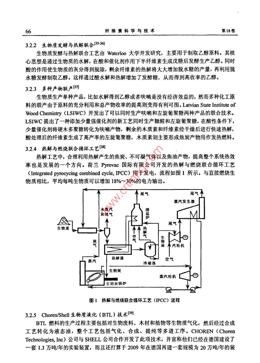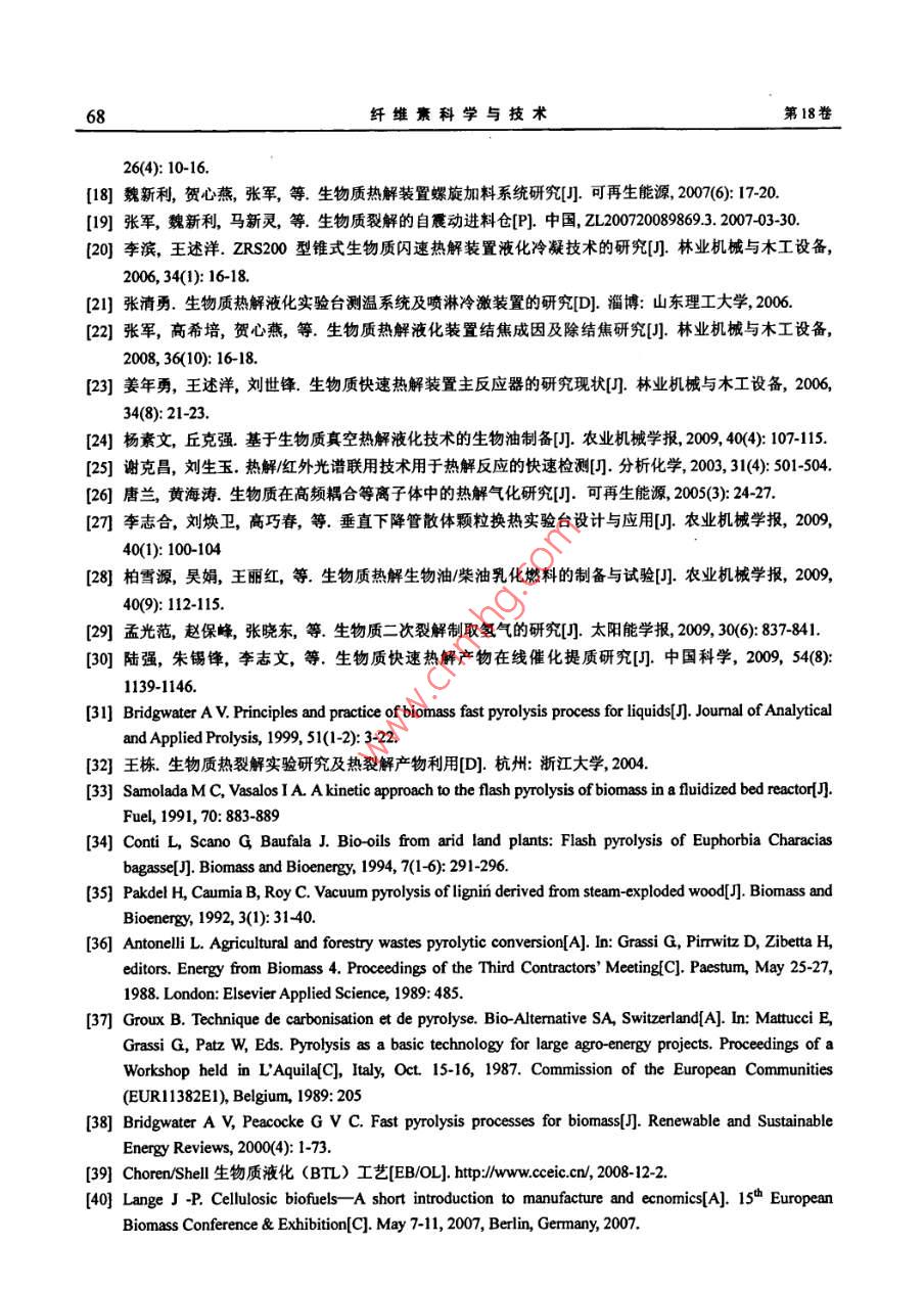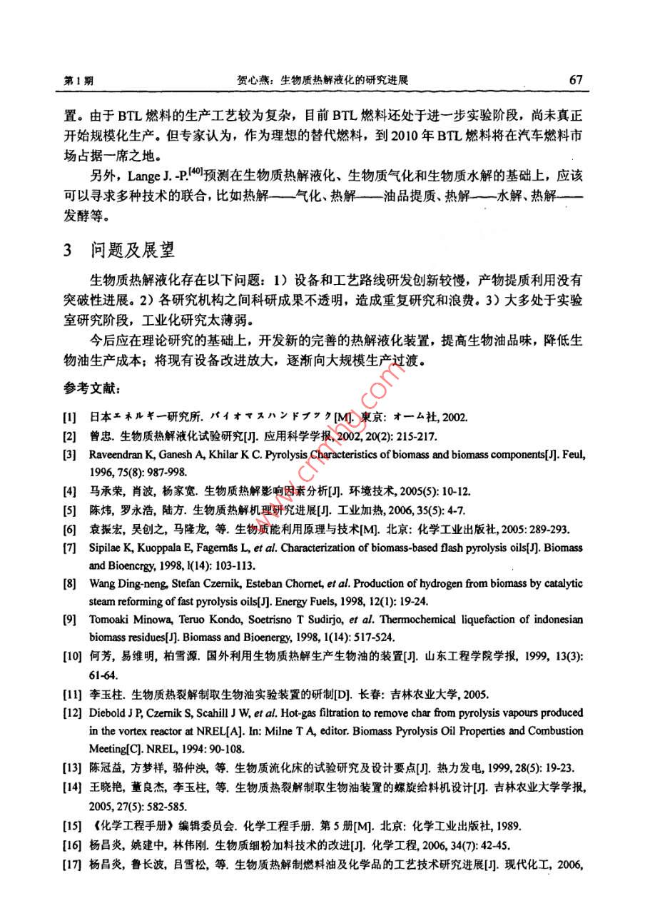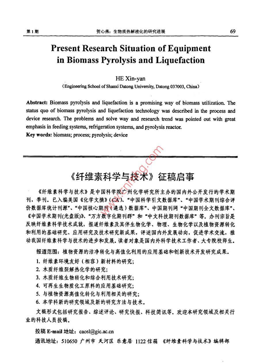 第18卷第1期纖維科學(xué)與技術(shù)Vol. 18 No. 12010年3月Journal of Cellulose Science and technologyMar.2010文章編號(hào):10048405(2010)01-006208生物質(zhì)熱解液化的研究進(jìn)展賀心燕(山西大同大學(xué)工學(xué)院,山西大同037003)搞要:生物質(zhì)熱解液化是一種很有前景的生物質(zhì)利用方式。文章闡述了國(guó)內(nèi)生物質(zhì)熱解液化技術(shù)在工藝和裝置方面的研究現(xiàn)狀,重點(diǎn)針對(duì)加料系統(tǒng)、冷凝系統(tǒng)和熱解反應(yīng)器分析指出存在的問題、解決途徑和發(fā)展趨勢(shì)關(guān)鍵詞:生物質(zhì);工藝;熱解;裝置中圖分類號(hào):TK6文獻(xiàn)標(biāo)識(shí)碼:A能源問題是當(dāng)今世界各國(guó)都面臨的關(guān)系國(guó)家安全和經(jīng)濟(jì)社會(huì)可持續(xù)發(fā)展的核心議題能源消耗的迅速增長(zhǎng),化石燃料儲(chǔ)量有限且不可再生,特別是對(duì)化石燃料過度開發(fā)利用所帶來(lái)的環(huán)境污染,使得人們?cè)絹?lái)越重視可再生潔凈能源的開發(fā)利用。低碳經(jīng)濟(jì)的概念已經(jīng)深入人心,人類生存發(fā)展的觀念發(fā)生了根本性轉(zhuǎn)變。而生物質(zhì)能是地球上唯一能夠固定碳的環(huán)境友好的可再生能源,它低硫、低氮、低灰分、CO2凈排量近乎零、來(lái)源充足,各國(guó)日益重視和支持對(duì)其開發(fā)利用嗎生物質(zhì)熱解液化是生物質(zhì)在完全缺氧或有限氧供給的條件下熱解生成生物油、生物氣和生物炭的過程。液體產(chǎn)物生物油易運(yùn)輸、易存儲(chǔ),有望替代部分液體燃料或作為化工原料,因而越來(lái)越得到各國(guó)各研究機(jī)構(gòu)的重視。生物質(zhì)熱解液化技術(shù)工藝起步較晚,尚不成熟,還處于研發(fā)、示范和極小規(guī)模的工業(yè)化階段。近來(lái)各科研機(jī)構(gòu)和科研院校都在加大該技術(shù)的開發(fā)和技術(shù)攻關(guān),尤其是在熱解裝置創(chuàng)新優(yōu)化和產(chǎn)物的分析利用方面取得了較大進(jìn)展。本文從熱解裝置方面綜述生物質(zhì)熱解技術(shù)的研究進(jìn)展和技術(shù)難點(diǎn),著重介紹工藝設(shè)備方面存在的技術(shù)難點(diǎn)、解決方案及趨勢(shì),并展望該技術(shù)未來(lái)的發(fā)展前景生物質(zhì)熱解液化的要求生物質(zhì)熱解液化技術(shù)是在無(wú)氧或者是缺氧條件下,以103~10℃/的加熱速率將生物質(zhì)加熱至450~600℃,發(fā)生包括分子鍵的斷裂、異化和小分子的聚合等復(fù)雜的化學(xué)反應(yīng),生成小分子氣體—生物氣、可凝性揮發(fā)分—生物油以及少量焦炭產(chǎn)物—生物炭。可凝性揮發(fā)分被快速導(dǎo)出并冷卻成為生物油,其比例一般可達(dá)原料質(zhì)量的40%~80%。固相停留時(shí)間越長(zhǎng)產(chǎn)生的生物氣越多,氣相停留時(shí)間越長(zhǎng),生物油的二次裂解越充分,產(chǎn)生的生物氣越多。因此,生物質(zhì)熱解液化工藝條件十分苛刻,要求嚴(yán)格控制加熱速率、反應(yīng)溫度以及可凝收稿日期:2009-1127作者簡(jiǎn)介:賀心燕(1979-),女,碩士,助理講師;主要研究生物質(zhì)能源的開發(fā)和利用第I期賀心燕:生物質(zhì)熱解液化的研究進(jìn)展性揮發(fā)分被快速冷凝成可流動(dòng)的液體,固相停留時(shí)間和氣相停留時(shí)間越短越好在生物質(zhì)快速熱裂解的各種工藝中,反應(yīng)器的類型及其加熱方式的選擇在很大程度上決定了產(chǎn)物的初次分布,氣相滯留時(shí)間影響熱解產(chǎn)物發(fā)生的二次裂解的反應(yīng)進(jìn)程,生物質(zhì)加料是否均勻和連續(xù)影響著產(chǎn)物分布及生物油的組成和性質(zhì),所以反應(yīng)器類型、加料系統(tǒng)和冷凝方案的選擇是各種工藝技術(shù)的關(guān)鍵所在2生物質(zhì)單純熱解系統(tǒng)研究現(xiàn)狀國(guó)外生物質(zhì)熱解制取生物油的技術(shù)研究中較為典型的反應(yīng)器1有:美國(guó)喬治亞理工學(xué)院GrTr( the Georgia Institute of Technology)研制的攜帶床反應(yīng)器( Entrained flow reactor),丙烷燃燒產(chǎn)生的熱煙氣為生物質(zhì)提供熱解所需的熱量,在入口煙氣溫度為927℃,反應(yīng)壓力為1.01×103Pa時(shí),加工能力568kgh,生物油產(chǎn)率為60%(以木材的干基重量計(jì));加拿大 ENSYN( Ensyn in Ottawa, Canada)開發(fā)的循環(huán)流化床反應(yīng)器(Up- flow circulating fluid bedreactor),以楊木為原料,反應(yīng)溫度600℃時(shí),加工能力為100kgh,生物油產(chǎn)率可達(dá)65%由加拿大拉瓦爾大學(xué)( University of Laval)開發(fā)的多層真空熱解磨( Multiple hearth reactor)頂部爐床溫度2000℃,反應(yīng)器底部溫度達(dá)4000℃,通過真空泵使反應(yīng)器內(nèi)的壓力保持在lkPa,加工能力為50kgh,在30k/h的給料速率時(shí)生物油產(chǎn)率最高可達(dá)65%;美國(guó)太陽(yáng)能研究所SERI( Solar Energy Research Institute)開發(fā)的渦旋反應(yīng)器( Vortex reactor),生物質(zhì)顆粒需要用速度為400m/s的氮?dú)饣蜻^熱蒸汽流引射,加工能力為50kgh,生物油產(chǎn)率為55%;荷蘭喬特大學(xué)( University of Twente)反應(yīng)器工程組及生物質(zhì)技術(shù)集團(tuán)(BTG)研發(fā)了第一套旋轉(zhuǎn)錐反應(yīng)器( Twente rotating cone process),加工能力為10kg/h,后來(lái)研制建造了一套加工能力為50kgh的旋轉(zhuǎn)錐反應(yīng)器生物質(zhì)閃速熱解實(shí)驗(yàn)設(shè)備,并于1995