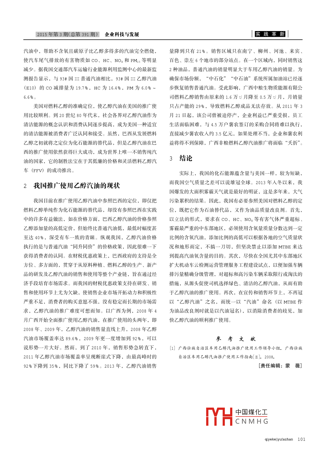 郾戰(zhàn)革新企業(yè)科技與發(fā)展2015年第3期(總第391期)重新定位燃料乙醇有助于我國乙醇汽油的推廣使用蔡慶麗(南寧地區(qū)教育學(xué)院公共管理系,廣西南寧530001)【摘要】燃料辶醇既可以作為車用燃料替代普通汽油,緩解化石能源短缺,也可以作為對環(huán)境友好的油品改良劑。由于宣傳普及不力,致使乙醇汽油在我國的推廣使用遇到很大困難。參照美國把汽油定位為油品改良劑的做法,在不同的地區(qū)以不同的混配比將燃料乙醇添加到組分汽油中配置成乙醇汽油,將更有助于乙醇汽油的推廣使用【關(guān)鍵詞】重新定位;燃料乙醇;乙醇汽油;推廣使用【中圖分類號】F426.22【文獻(xiàn)標(biāo)識碼】A【文章編號】674-0688(2015)03-0100-021巴西和美國推廣使用乙醇汽油的歷程回顧2.7號(質(zhì)量),相當(dāng)于在汽油中加入77號(體積)的乙醇。從1995年1月1日起,在臭氧嚴(yán)重超標(biāo)的九大城市,必須使用乙醇俗稱酒精,是以小麥、玉米、薯類、糖蜜或植物等生最小含氧量在2.0號的新配方汽油。1990年《空氣清潔法(修物質(zhì)作為原料經(jīng)發(fā)酵、蒸餾而制成,將乙醇進(jìn)一步脫水再經(jīng)過正案)》頒布后,美國國內(nèi)各煉油廠為了滿足含氧量的要求不同形式的變性處理后成為變性燃料乙醇,將燃料乙醇按一定在含氧汽油和新配方汽油中大量使用MTBE(甲基叔丁基醚)體積分?jǐn)?shù)添加到組分汽油中即變成乙醇汽油(E10)。這是一種辛烷值高、含氧的化工新產(chǎn)品。將MTBE按一定比20世紀(jì)70年代,為了擺脫對石油的過度依賴,保障國家例加入汽油中,與汽油的相容性較好,燃燒時(shí)排出的有害氣體能源安全及發(fā)展經(jīng)濟(jì),巴西根據(jù)自身資源稟賦,利用其豐富的少,可以有效減少大氣污染。但是,MBE對地下水及飲用水生物質(zhì)資源,生產(chǎn)燃料乙醇,并按一定比例添加到汽油中,添構(gòu)成了嚴(yán)重污染,容易使人致癌。199年7月26日,美國環(huán)加比例從45號(體積分?jǐn)?shù),下同)逐漸增加到25號。2014年境保護(hù)署(EPA)發(fā)表公告稱,美國EPA將與國會合作,盡4月,巴西農(nóng)業(yè)部宣布,今后巴西乙醇在汽油的混配比將增加快制定必要的法規(guī),在不犧牲清潔空氣方面已取得效益的前提到27.5告。除此之外,巴西境內(nèi)還有使用全乙醇的汽車和農(nóng)用下,幫助各州在當(dāng)前法律下減少使用MTEE,并使用含有其他飛機(jī)等。經(jīng)過多年的發(fā)展,巴西已成為世界上唯一不使用純汽含氧化合物(主要為乙醇)的清潔汽油。2001年1月,美國油的國家。美國也是世界上燃料乙醇的重要生產(chǎn)國和使用國之參議院審議并投票,決定在新配方汽油中有關(guān)MTEB的法律20世紀(jì)70年代,美國經(jīng)濟(jì)蓬勃發(fā)展,對石油的需求量迅議案,通過了在2004年禁止使用MTEB的決議。速增加,使得美國所需原油60號以上需要依賴進(jìn)口。世界第從美國和巴西兩國不遺余力地大力推廣使用乙醇汽油可以次石油危機(jī)爆發(fā),使美國經(jīng)濟(jì)遭受嚴(yán)重打擊。這次石油危機(jī)看出,如果說巴西僅僅是出于替代化石能源,促進(jìn)本國農(nóng)業(yè)發(fā)使美國政府認(rèn)識到過分依賴進(jìn)口石油將危及國家安全和國民經(jīng)展,增加農(nóng)民收入,縮小國內(nèi)貧富差距的目的。而美國則除了濟(jì)的發(fā)展。1979年,美國國會制定了聯(lián)邦政府的“乙醇發(fā)展將燃料乙醇作為化石能源的替代燃料外,還有一個(gè)更重要的目計(jì)劃”,開始大力推廣使用含10號乙醇的混合燃料,同時(shí)制定的,那就是利用乙醇優(yōu)良的理化特性逐步取代對環(huán)境不友好的使用燃料乙醇減免聯(lián)邦消費(fèi)稅等優(yōu)惠政策,使其乙醇工業(yè)得到MTEB成為油品質(zhì)量改良劑。這是因?yàn)橐掖甲鳛槠吞砑觿┛裳杆侔l(fā)展,乙醇產(chǎn)量從1979年的1000萬加侖(約3萬t)迅以提高汽油的辛烷值。通常,車用汽油的辛烷值一般要求為速增加到1990年的8.7億加侖(約合261萬t)。E10的銷售90或93,而乙醇的辛烷值高達(dá)111因此在汽油中加入燃料量從1978-1983年增加了35倍。乙醇可大大提高其辛烷值,且乙醇對烷烴類汽油組分(烷基化1990年,美國國會通過倥空氣清潔法(修正案)》,該法油、輕石腦油)辛烷值調(diào)和效果好于烯烴類汽油組分(催化裂案從保護(hù)環(huán)境的角度岀發(fā),強(qiáng)制機(jī)動(dòng)車使用含氧汽油及新配方化汽油)和芳烴類汽油組分(催化重整汽油),添加乙醇還可汽油,要求co排放未達(dá)標(biāo)地區(qū)在冬季至少有3個(gè)月使用含氧以較為有效地提高汽油的抗爆性。同時(shí),由于乙醇的氧含量高汽油,并規(guī)定從1992年11月起,含氧汽油的含氧量要達(dá)到達(dá)34.7號,可以較甲基叔丁基醚(MTEB)更少的添加量加入中國煤化工【基金項(xiàng)目】國家自然科學(xué)基金(41361022),廣西北部灣重大基礎(chǔ)專項(xiàng)子課題(2012GXNs區(qū)委員會2013年度重大決策調(diào)研課題(中共廣西壯族自治區(qū)委員會辦公廳桂函辦[2013]13)CNMHG【作者簡介】蔡慶麗,女,理學(xué)學(xué)士,南寧地區(qū)教育學(xué)院公共管理系副教授,從事農(nóng)業(yè)經(jīng)濟(jì)、區(qū)域經(jīng)濟(jì)的教學(xué)和研究工作100 qiyekejyufazhan2015年第3期(總第391期)企業(yè)科技與發(fā)展實(shí)踐革新汽油中,幫助不含氧且碳原子比乙醇多得多的汽