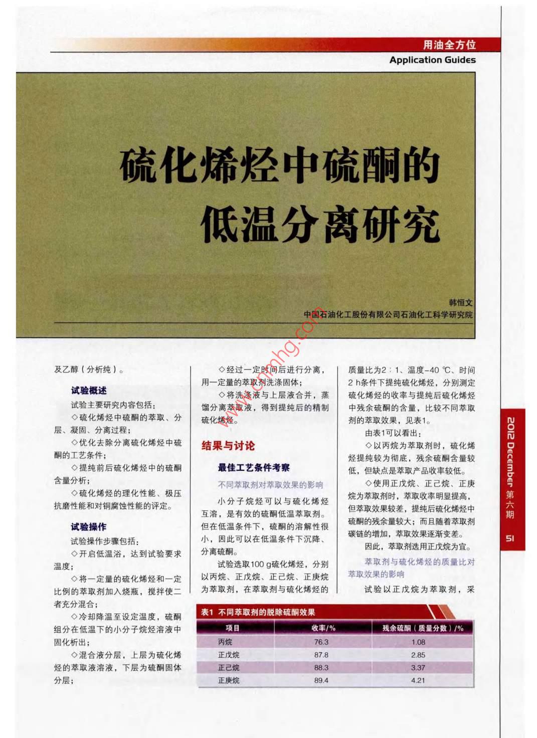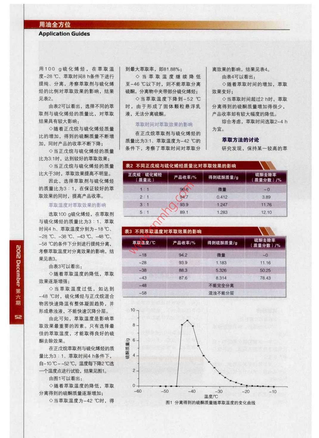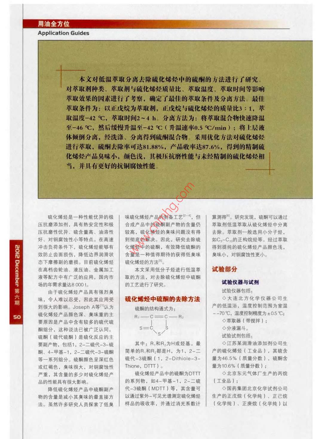 用油全方位Application Guides本文對(duì)低溫萃取分離去除硫化烯烴中的硫酮的方法進(jìn)行了研究對(duì)萃取劑種類、萃取劑與硫化烯烴質(zhì)量比、萃取溫度、萃取時(shí)間等影響萃取效果的因素進(jìn)行了考察,確定了最佳的萃取條件及分離方法。最佳萃取條件為:以正戊烷為萃取劑,正戊烷與硫化烯烴的質(zhì)量比3: 1,萃取溫度-42 °C,萃取時(shí)間2~4 h。分離方法為:將萃取混合物快速降溫至-46 °C,然后緩慢升溫至-42 9C (升溫速率0.5 °C/min) ;將上層液體傾倒分離,經(jīng)洗滌、分離得到硫酮混合物。采用優(yōu)化方法對(duì)硫化烯烴進(jìn)行萃取,硫酮去除率可達(dá)81.88%,產(chǎn)品收率達(dá)87.6%,得到的精制硫化烯烴產(chǎn)品臭味小,顏色淺,其極壓抗磨性能與未經(jīng)精制的硫化烯烴相當(dāng),并具有更好的抗銅腐蝕性能硫化烯烴是一種性能優(yōu)異的極味硫化烯烴產(chǎn)品的制備工藝-一4,但|算測(cè)得向。 研究發(fā)現(xiàn),硫酮可以通過(guò)壓抗磨添加劑,具有熱安定性和極合成產(chǎn)品中的硫酮副產(chǎn)物的含量仍萃取劑低溫萃取從硫化烯烴中分離壓抗磨性優(yōu)異、硫含量高、油溶性較高,硫化烯烴的臭味問(wèn)題沒(méi)有得去除。萃取劑一般選用小分子烴,好、對(duì)銅腐蝕性小等特點(diǎn)。在高速到徹底的解決。因此,研究去除硫如C3~Co的正構(gòu)烷烴等。經(jīng)過(guò)萃取沖擊負(fù)荷條件下,硫化烯烴能夠有化烯烴中的硫酮,有效降低硫酮的得 到提純的硫化烯烴產(chǎn)品顏色淺,效防止齒面損傷,降低邊界潤(rùn)滑狀含量是一種值得期待的獲得低臭味臭味小,對(duì)銅腐蝕性更小。態(tài)下摩擦副的磨損。目前硫化烯烴硫化烯烴的方法問(wèn)。在高檔齒輪油、液壓油、金屬加工本文采用低分子烴進(jìn)行低溫萃試驗(yàn)部分液等配方中有廣泛的應(yīng)用,國(guó)內(nèi)市取的方法,對(duì)去除硫化烯烴中硫酮試驗(yàn)儀器與試劑場(chǎng)的年需求量達(dá)8000 to的工藝進(jìn)行了研究。興由于硫化烯烴產(chǎn)品具有強(qiáng)烈臭試驗(yàn)儀器包括:期味,令人難以忍受,因此其應(yīng)用受硫化烯烴中硫酮的去除方法?大連北方化學(xué)儀器公司生到很大的影響。Joseph A等"認(rèn)為硫酮的結(jié)構(gòu)通式為:產(chǎn)的低溫浴,溫度控制范圍為室溫50硫化烯烴產(chǎn)品顏色深、臭味重的主R2--70C,溫度控制精度為+0.5C;要原因是產(chǎn)品中含有較多的硫代硫◆>萃取器(帶攪拌) ;酮組分,這種說(shuō)法已被廣泛認(rèn)同。S= C<分液漏斗。硫酮(硫代硫酮)是硫化反應(yīng)的主試驗(yàn)試劑包括:要副產(chǎn)物,包括1,2-二硫代-3-硫其中: R,和R2為H或烴基。最。江蘇某潤(rùn)滑油添加劑公司生酮、4-甲基-1, 2-二硫代-3-硫酮簡(jiǎn)單的R,和R2都是H,為1, 2-二產(chǎn)的硫化烯烴(工業(yè)品),其硫含等一系列組分。硫酮顏色呈深紅色硫代-3硫酮( 1, 2-Dithiole-3-量為46.5% (質(zhì)量分?jǐn)?shù)),硫酮含或紅褐色,臭味很大,對(duì)銅腐蝕性Thione, DTTT)。量為10.6% (質(zhì)量分?jǐn)?shù)) ;嚴(yán)重,其含量的多少對(duì)硫化烯烴產(chǎn)硫化烯烴產(chǎn)品中的硫酮為DTTT<>北京東元?dú)怏w廠生產(chǎn)的丙烷品的性能具有很大影響。的系列物,如4-甲基-1, 2-二硫(工業(yè)品);降低硫化烯烴產(chǎn)品中硫酮副產(chǎn)代-3硫酮(MDTT)等,其含量可<國(guó)藥集團(tuán)北京化學(xué)試劑公司物的含量是減小其臭味的最直接方以通過(guò)紫外-可見(jiàn)光譜測(cè)定硫化烯烴生產(chǎn)的正戊烷(化學(xué)純)、正己烷法。雖然許多研究人員探索了低臭樣品的吸收率,并通過(guò)消光系數(shù)計(jì)(化學(xué)純)、 正庚烷(化學(xué)純)以用油全方位Application Guides硫化烯烴中硫酮的低溫分離研究韓恒文中國(guó)石油化工股份有限公司石油化工科學(xué)研究院及乙醇(分析純)。<>經(jīng)過(guò)一定時(shí)間后進(jìn)行分離,質(zhì)量比為2: 1、溫度-40 C、時(shí)間;用一定量的萃取劑洗滌固體;2 h條件下提純硫化烯烴,分別測(cè)定試驗(yàn)概述<將洗滌液與上層液合并,蒸硫化烯烴的收率與提純后硫化烯烴試驗(yàn)主要研究?jī)?nèi)容包括:餾分離萃取液,得到提純后的精制中殘余硫酮的含量,比較不同萃取<硫化烯烴中硫酮的萃取、分硫化烯烴。劑的萃取效果,見(jiàn)表1。層、凝固、分離過(guò)程;由表1可以看出:<優(yōu)化去除分離硫化烯烴中硫結(jié)果與討論>以丙烷為萃取劑時(shí),硫化烯酮的工藝條件;烴提純較為徹底,殘余硫酮含量較。提純前后硫化烯烴中的硫酮最佳工藝條件考察低,但缺點(diǎn)是萃取產(chǎn)品收率較低。含量分析;不同萃取劑對(duì)萃取效果的影響◆使用正戊烷、正已烷、正庚◆硫化烯烴的理化性能、極壓烷為萃取劑時(shí),萃取收率明顯提高,第抗磨性能和對(duì)銅腐蝕性能的評(píng)定。小分子烷烴可以與硫化烯烴但萃取效果較差,提純后硫化烯烴中六互溶,是有效的硫酮低溫萃取劑。硫酮的殘余量較大;而且隨著萃取劑期試驗(yàn)操作但在低溫條件下,硫酮的溶解性很碳鏈的增加,萃取效果逐漸變差。試驗(yàn)操作步驟包括:小,因此可以在低溫條件下沉降、51因此,萃取劑選用正戊烷為宜。◆開(kāi)啟低溫浴,達(dá)到試驗(yàn)要求分離硫酮。溫度;試驗(yàn)選取100 g硫化烯烴,分別萃取劑與硫化烯烴的質(zhì)量比對(duì)。將一定量的硫化烯烴和一定以