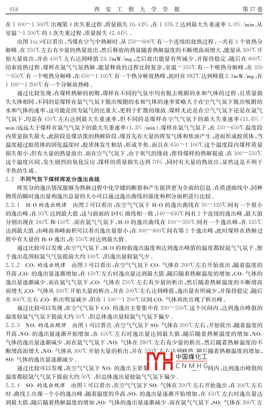 西安工程大學學報Journal of Xi'an Poly technic U niversity第27卷第5期(總123期)2013年10月Vol 27. No 5(Sum. No 123)文章編號:1674-649X(2013)05-0616-06熱解氣氛對煤熱解行為的影響李超,鄭長征,王曉紅(1.西安工程大學環(huán)境與化學工程學院陜西西安710048:;西安近代化學研究所,陜西西安710065)摘要:利用DSC/TG-MS同步熱分析-質譜聯(lián)用技術對新疆哈密煤進行研究,考察了氬氣、空氣為熱解氣氛時,煤樣的熱分解過程,熱解氣相產物HaO,CO,NO,O的逸岀規(guī)律,并從微觀的角度提出了其熱解機理.實驗表明,由于空氣中氧氣的高反應活性,使得煤樣熱解氣相產物逸出的溫度區(qū)間縮短,出現(xiàn)逸出峰的溫度提前,同時有大量的熱量放出,但熱解氣相產物HO,CO,NO,SO2的逸出量比氳氣氣氛下少.另外,煤樣灰分中CaO,FeO3的含量很高,這也是影響煤樣熱解氣相產物形成的原因之關鍵詞:新疆煤;熱解;熱解氣氛;DSC/TG-MS中圖分類號:TQ530文獻標識碼:A我國是煤炭資源大國,煤炭廣泛應用于電力、建材、城市供暖、煉焦、化工等行業(yè).同時煤炭也是我國主要的污染源,約有90%的SO2,67%的NO-,82%的酸雨和60%的大氣粉塵都來源于煤的直接燃燒口.因此,提高煤資源轉化率和發(fā)展?jié)崈裘杭夹g,便成為當前十分迫切的需求熱解作為煤熱轉化利用過程的第一步,同時也是簡單有效的潔凈煤技術之一影響煤熱解的因素有很多,大致可以分為兩類:一是原料煤性質,如煤階、煤的粒度、煤的巖相組成和煤中礦物質組成及含量等;二是熱解工藝條件,如反應氣氛、熱解壓力、加熱速率、停留時間、熱解終溫等目前許多學者研究不同氣氛對煤熱解行為的影響,多采用在不同的純氣氛或以兩種不同的純氣氛按不同比例制成的混合氣氛下研究不同氣氛對煤的熱解行為的影響,并得到了很多有益的結論.但是在空氣(N278%,O221%,稀有氣體0.94%,C020.03%、其他氣體0.03%)這樣的混合氣氛下的,特別是本文采用的新疆煤,未見報道.為此,本文應用同步熱分析法比較了氬氣和空氣兩種氣氛對煤熱分解行為的影響,并通過質譜分析硏究了煤在熱解過程中H2O,CO,NO2,SO2的逸出情況1實驗1.1樣品實驗所用煤樣取自新疆哈密三道口煤礦,其工業(yè)分析、中國煤化工1.2儀器CNMHG(1)同步熱分析儀德國 netzsch公司44C型TG-D向步熱分析儀,溢度氾圍:35~1450℃,分辨收稿日期:2013-07-01通訊作者:鄭長征(1959-),男陜西省橫山縣人,西安工程大學教授,博士.主要從事煤化工工藝及技術,電化學及儀器分析和生物活性配合物的研究E-mal: zhchangzhend126com第5期熱解氣氛對煤熱解行為的影響率:0.1g,升溫速率:10℃/min,真空度:10mBar表1實驗用煤樣的工業(yè)分析和元素分析工業(yè)分析元素分析樣品Mad哈密煤7.494.6424.573.283.430.770.3112.21Note: ad, air-dried basis d, dry basis daf dry and ash-free basis; by difference表2煤樣的灰分組成分析樣品SO2Ak2O3Fe2O3TiO2 Cao MgO SO3K20Na0P2O5哈密煤13.2810.5327.410.4132.541.988.770.081.120.7(2)質譜儀德國 Netzsch公司QMS403四級杠質譜儀質量范圍:1~300amu,質量分辨率:≤0.5amu,檢測極限:>1×10。,質譜連接管溫度:180℃,接口溫度:190℃.氣體原位池溫度:190℃,聯(lián)用傳輸管線溫度:180℃1.3條件熱分析儀坩堝類型:三氧化二鋁池,載氣:高純度氬氣(純度99.999%),25℃室溫下的空氣,吹掃氣流量:50mL/min,保護氣流量:25mL/min,溫度范圍:35~1450℃2結果與討論2.1對煤熱解行為的影響圖1是煤樣在不同的氣氛下以10℃/min的升溫速率得到的TG,DTG,DSC圖譜1.5求爾鏤上90求020040060080002014000聯(lián)上系了了后02004006008001000120014001600溫度/℃熱解氣氛對煤熱解失重及熱解失重速率的影響2日f千欲Dr(a)tg如圖1(a),(b)所示.可以發(fā)現(xiàn),當煤在空氣中熱解時,在室溫~300℃有一個失重過程,但是失重速率烘·日較小,大約是0.1%/min,在300~550℃有一個失重過程,在463.7℃時達到最大失重速率6.46/min;91.0整個熱解過程質量減少70%.而煤樣在氬氣中熱解上時,出現(xiàn)4次失重過程,室溫~350℃出現(xiàn)第1次質了R8量損失的過程,質量損失1.13%,在93.0℃時達到最大失重速率0.3%6/min;在350~650℃出現(xiàn)第2II中國煤化工CNMH√0120014001600次失重過程,在447.0℃最大失重速率為溫度/℃1.3%/min;在650~1100℃出現(xiàn)第3次失重過程(c)Dsc圖1煤樣在不同氣氛下的TGDT-DSC譜圖但從DTG曲線看,本階段失重速率相對較小(<空氣;氬氣0.1%/min).前3次失重過程,質量共損失25.4%618西安工程大學學報第27卷在1100~1500℃出現(xiàn)第4次失重過程質量損失16.43%,在1378.2達到最大失重速率1.0%/min.從室溫~1500℃的4次失重過程,質量損失42.61%由圖1(c)可以看出,當煤在空氣中熱解時,從250~600℃有一個連續(xù)的放熱過程,一共有3個放熱分解峰.在250℃左右有少量的熱量放岀,然后釋放的熱量隨著熱解溫度的不斷増高而増大,能量從300℃開始大量放岀,并在450℃左右達到峰值23.3mW/mg,之后放出能量有所減少,并保持穩(wěn)定,隨后在600℃結朿放熱過程煤樣在氬氣氣氛熱解,能量釋放的過程比較復雜,室溫~350℃有一個吸熱分解峰,在350650℃有一個吸熱分解峰,在650~1100℃有一個熱分解放熱峰,此時在982℃達到峰值2.3mW/mg,在1100~1200℃有一個分解放熱峰通過比較發(fā)現(xiàn),在煤樣熱解的初期,煤樣在不同的氣氛中均有脫去吸附的水和氣體的過程,且質量損失大體相同,不同的是煤樣在氬氣氣氛下脫岀吸附的水和氣體的速率要略大于在空氣氣氛下脫出吸附的水和氣體的速率,這可能是因為氬氣的比重大,更利于擴散的緣故.