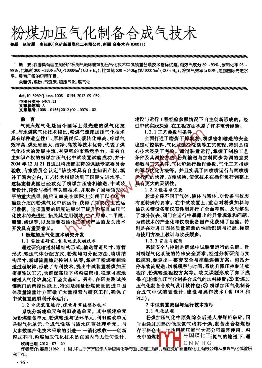 粉煤加壓氣化制備合成氣技術(shù)姜趙旨厚李超聯(lián)(兗礦新疆煤化工有限公司新烏魯木齊830011)摘要:我國具有自主知識嚴權(quán)的氣流床粉煤加壓氣化技術(shù)中試裝置各項技術(shù)指標優(yōu)越有效氣成分89-93%,碳轉(zhuǎn)化率9899%,比氟耗300-320Nm'O2/100Nm3(C0+H2),比煤耗530-540kg煤/1000Nm3(CO+H2)冷煤氣效率≥84%,達到國際先進水平。與有廣闊的應(yīng)用前景。關(guān)鍵調(diào):煤粉;氣流床;加壓氣化;煤媒氣化doi:10.3969j.issn.1008-0155.2012.09.039日分類號:F407.21文獻標志碼:A文章編號:1008-0155(2012)09-0076-02前言建設(shè)與運行工程經(jīng)驗參照情況下自主創(chuàng)新形成的。經(jīng)氣流床煤氣化是當(dāng)今國際上最先進的煤氣化技過中試實踐探索,在工程方面積累了許多寶貴經(jīng)驗。術(shù),與水煤漿氣化技術(shù)相比,粉煤氣流床加壓氣化技術(shù)1.2.1工藝參數(shù)與條件具有煤種適應(yīng)性廣、原料消耗低、碳轉(zhuǎn)化率高、冷煤氣全面打通了磨煤干燥制粉、粉煤密相輸送的安全效率高煤處理量大、潔凈、高效等技術(shù)優(yōu)勢,代表了煤穩(wěn)定可控供料、氣化及激冷洗滌等工藝流程,特別是核氣化技術(shù)的發(fā)展主流,有更強的市場競爭力。具有自心技術(shù)經(jīng)受了考驗。通過裝置運行,掌握了制粉工藝主知識產(chǎn)權(quán)的粉煤加壓氣化中試裝置試驗成功,并于條件及其調(diào)控方法、粉煤輸送與加料同步協(xié)調(diào)的重要2004年12月21日通過科技部主持的課題專家委員會參數(shù)與工藝條件、氣化爐運行操作參數(shù)、氣化工藝指標驗收,專家委員會認定“該技術(shù)具有自主知識產(chǎn)權(quán),填的調(diào)節(jié)優(yōu)化方法等。并且實現(xiàn)了四噴嘴運行與兩噴嘴補了國內(nèi)空白,工藝技術(shù)指標達到了國際先進水平?!边\行間的快速、方便切換,使該技術(shù)在操作負荷調(diào)整上這標志著我國已經(jīng)攻克了粉煤加壓密相輸送、中試裝具有更大的靈活性。置設(shè)計建設(shè)與操作等關(guān)鍵技術(shù),并取得了國際領(lǐng)先水1.22設(shè)備與儀表平的重大成果,隨后又率先在國際上實現(xiàn)了以CO2為粉煤介質(zhì)不同于氣體、液體與漿體,對設(shè)備與儀表輸送介質(zhì)的粉煤氣化中試運行,獲得了重要的工藝運有更特殊的要求。在中試裝置上,重點對粉煤加料與行數(shù)據(jù)。這項重要的研究進展對于提升粉煤具加壓氣輸送關(guān)鍵設(shè)備和儀表性能進行了全面考察。及時解決化技術(shù)的先進性,拓展其應(yīng)用領(lǐng)域生產(chǎn)甲醇、二甲醚、了部分儀表閥門在運行中暴露出的異?,F(xiàn)象和問題,醋酸、烯烴等,以及重要石油化工替代產(chǎn)品的龍頭技術(shù)為該技術(shù)的產(chǎn)業(yè)化和儀表設(shè)備國產(chǎn)化獲得了經(jīng)驗。特開發(fā)具有重要意義。別是在對進口固體質(zhì)量流量的性能識別與把握、標定1粉煤加壓氣化技術(shù)研究開發(fā)與使用方法上教訓(xùn)與收獲頗多。1實驗室研究,重點攻克關(guān)鍵技術(shù)1.2.3安全與控制通過研究輸送料罐結(jié)構(gòu)形式、輸送管道尺寸、彎管系統(tǒng)安全與控制是確保中試裝置運行的關(guān)鍵。針形式輸送氣體分配方式、粉煤均勻分配方法、噴嘴結(jié)對粉煤氣化系統(tǒng)的特殊安全要求,經(jīng)過分析研究與實構(gòu)尺寸粉煤流量穩(wěn)定控制方法等掌握了粉煤密相輸踐探索制定出一整套安全與控制連鎖方案。包括開送過程規(guī)律,形成了專利技術(shù),提出中試裝置粉煤加壓停車物流配送切斷順序與時間、系統(tǒng)升降壓控制連鎖密相輸送工藝,為確保高壓下將粉煤密相、穩(wěn)定可控地程序、粉煤輸送程控方案等。攻關(guān)課題形成了如下成輸送人氣化爐奠定了堅實基礎(chǔ)。另外,在研究測試關(guān)果①粉煤加壓氣化制備合成氣的加料裝置;②粉煤加鍵閥門的調(diào)控性能上,特別是測量粉煤流量的進口固壓氣化制備合成氣設(shè)計軟件包;③粉煤加壓氣化制備體質(zhì)量流量計方面做了大量摸索與研究工作,確保了合成氣中試裝置設(shè)計、建設(shè)與操作技術(shù)(含DCS和中試裝置的順利開車運行。PLC)。1.2中試裝置運行,探索并掌握整體技術(shù)2中試裝置流程與運行技術(shù)指標系統(tǒng)分新建單元和利舊改造單元。其中新建單元2.1氣化流程為粉煤制備單元、粉煤輸送與循環(huán)單元;利舊整改單元粉煤加壓氣化中原煤除雜后送人磨煤機破碎,同是指氣化單元、合成氣洗滌與渣水閃蒸處理單元。與時由經(jīng)過加熱的低壓氮氣將其干燥,制備出合格煤粉大多數(shù)國產(chǎn)化技術(shù)采取的引進一一消化吸收—創(chuàng)新存于料倉中加熱甲任壓短氣大部分可循環(huán)使用。料模式不同,粉煤加壓氣化技術(shù)是在國內(nèi)尚無任何設(shè)計、倉中的煤粉中國煤化玉氮氣的輸送下,通收稿日期:2012-07-20CNMHG作者筒介:姜磊(1982-),男畢業(yè)于齊齊哈爾大學(xué)應(yīng)用化學(xué)專業(yè),助理工程師現(xiàn)在充礦新疆煤化工有限公司從事煤氣化試驗研究工作。76過氣化噴嘴進入氣化爐。汽化劑氧氣、蒸汽也通過氣2.2技術(shù)指標與特點化噴嘴進入氣化爐,并在高溫、高壓下與粉煤進行氣化為便于比較,中試裝置氣化用煤為兗礦魯南化肥反應(yīng)。出氣化爐的高溫合成氣經(jīng)激冷