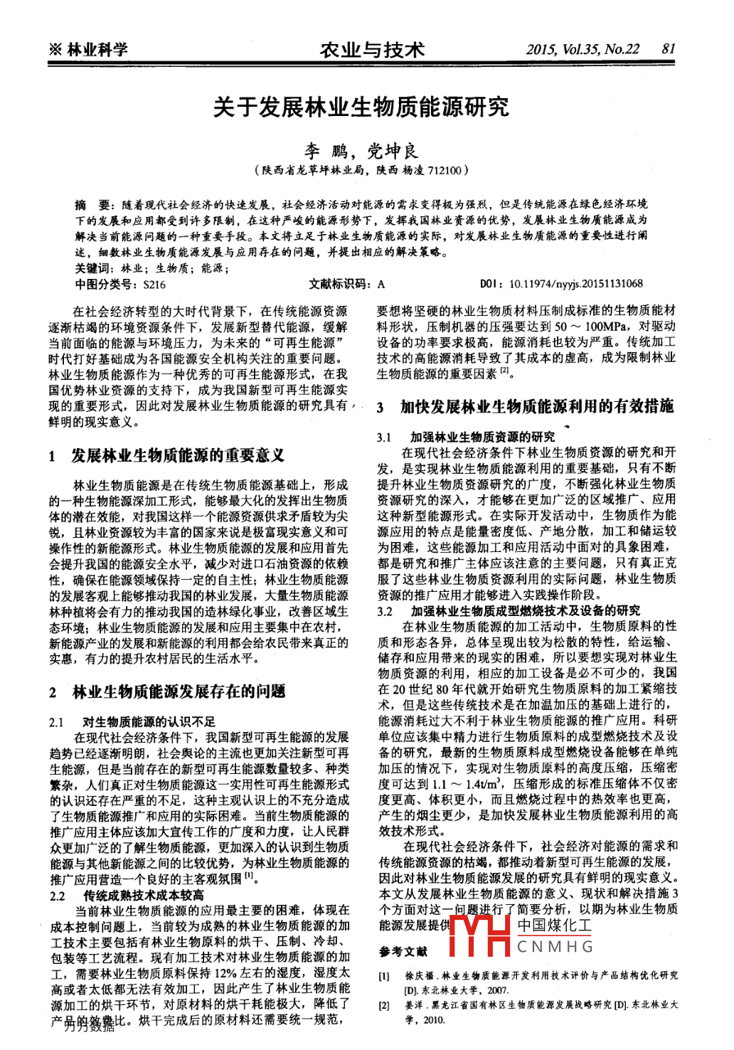 ※林業(yè)科學(xué)農(nóng)業(yè)與技術(shù)2015,Wl.35,No.228i關(guān)于發(fā)展林業(yè)生物質(zhì)能源研究李鵬,黨坤良(陜西省龍草坪林業(yè)局,陜西楊凌712100)摘要:隨著現(xiàn)代社會經(jīng)濟(jì)的快速發(fā)展,社會經(jīng)濟(jì)活動對能源的需求變得極為強(qiáng)烈,但是傳統(tǒng)能源在綠色經(jīng)濟(jì)環(huán)境下的發(fā)展和應(yīng)用都受到許多限制,在這種嚴(yán)峻的能源形勢下,發(fā)揮我國林業(yè)資源的優(yōu)勢,發(fā)展林業(yè)生物質(zhì)能源成為解決當(dāng)前能源問題的一種重要手段。本文將立足于林業(yè)生物質(zhì)能源的實(shí)際,對發(fā)展林業(yè)生物質(zhì)能源的重要性進(jìn)行闡述,細(xì)數(shù)林業(yè)生物質(zhì)能源發(fā)展與應(yīng)用存在的問題,并提出相應(yīng)的解決策略關(guān)鍵詞:林業(yè);生物質(zhì);能源中圖分類號:S216文獻(xiàn)標(biāo)識碼:AD0:10.11974/ nyyjs.20151131068在社會經(jīng)濟(jì)轉(zhuǎn)型的大時(shí)代背景下,在傳統(tǒng)能源資源要想將堅(jiān)硬的林業(yè)生物質(zhì)材料壓制成標(biāo)準(zhǔn)的生物質(zhì)能材逐漸枯竭的環(huán)境資源條件下,發(fā)展新型替代能源,緩解料形狀,壓制機(jī)器的壓強(qiáng)要達(dá)到50~100MPa,對驅(qū)動當(dāng)前面臨的能源與環(huán)境壓力,為未來的“可再生能源”設(shè)備的功率要求極高,能源消耗也較為嚴(yán)重。傳統(tǒng)加工時(shí)代打好基礎(chǔ)成為各國能源安全機(jī)構(gòu)關(guān)注的重要問題技術(shù)的高能源消耗導(dǎo)致了其成本的虛高,成為限制林業(yè)林業(yè)生物質(zhì)能源作為一種優(yōu)秀的可再生能源形式,在我生物質(zhì)能源的重要因素。國優(yōu)勢林業(yè)資源的支持下,成為我國新型可再生能源實(shí)現(xiàn)的重要形式,因此對發(fā)展林業(yè)生物質(zhì)能源的研究具有3加快發(fā)展林業(yè)生物質(zhì)能源利用的有效措施鮮明的現(xiàn)實(shí)意義。31加強(qiáng)林業(yè)生物質(zhì)資源的研究1發(fā)展林業(yè)生物質(zhì)能源的重要意義在現(xiàn)代社會經(jīng)濟(jì)條件下林業(yè)生物質(zhì)資源的研究和開發(fā),是實(shí)現(xiàn)林業(yè)生物質(zhì)能源利用的重要基礎(chǔ),只有不斷林業(yè)生物質(zhì)能源是在傳統(tǒng)生物質(zhì)能源基礎(chǔ)上,形成提升林業(yè)生物質(zhì)資源研究的廣度,不斷強(qiáng)化林業(yè)生物質(zhì)的一種生物能源深加工形式,能夠最大化的發(fā)揮出生物質(zhì)資源研究的深入,才能夠在更加廣泛的區(qū)域推廣、應(yīng)用體的潛在效能,對我國這樣一個(gè)能源資源供求矛盾較為尖這種新型能源形式。在實(shí)際開發(fā)活動中,生物質(zhì)作為能銳,且林業(yè)資源較為豐富的國家來說是極富現(xiàn)實(shí)意義和可源應(yīng)用的特點(diǎn)是能量密度低、產(chǎn)地分散,加工和儲運(yùn)較操作性的新能源形式。林業(yè)生物質(zhì)能源的發(fā)展和應(yīng)用首先為困難,這些能源加工和應(yīng)用活動中面對的具象困難,會提升我國的能源安全水平,減少對進(jìn)口石油資源的依賴都是研究和推廣主體應(yīng)該注意的主要問題,只有真正克性,確保在能源領(lǐng)域保持一定的自主性;林業(yè)生物質(zhì)能源服了這些林業(yè)生物質(zhì)資源利用的實(shí)際問題,林業(yè)生物質(zhì)的發(fā)展客觀上能夠推動我國的林業(yè)發(fā)展,大量生物質(zhì)能源資源的推廣應(yīng)用才能夠進(jìn)入實(shí)踐操作階段。林種植將會有力的推動我國的造林綠化事業(yè),改善區(qū)域生32加強(qiáng)林業(yè)生物質(zhì)成型燃燒技術(shù)及設(shè)備的研究態(tài)環(huán)境;林業(yè)生物質(zhì)能源的發(fā)展和應(yīng)用主要集中在農(nóng)村在林業(yè)生物質(zhì)能源的加工活動中,生物質(zhì)原料的性新能源產(chǎn)業(yè)的發(fā)展和新能源的利用都會給農(nóng)民帶來真正的質(zhì)和形態(tài)各異,總體呈現(xiàn)出較為松散的特性,給運(yùn)輸、實(shí)惠,有力的提升農(nóng)村居民的生活水平。儲存和應(yīng)用帶來的現(xiàn)實(shí)的困難,所以要想實(shí)現(xiàn)對林業(yè)生物質(zhì)資源的利用,相應(yīng)的加工設(shè)備是必不可少的,我國2林業(yè)生物質(zhì)能源發(fā)展存在的問題在20世紀(jì)80年代就開始研究生物質(zhì)原料的加工緊縮技術(shù),但是這些傳統(tǒng)技術(shù)是在加溫加壓的基礎(chǔ)上進(jìn)行的,21對生物質(zhì)能源的認(rèn)識不足能源消耗過大不利于林業(yè)生物質(zhì)能源的推廣應(yīng)用??蒲性诂F(xiàn)代社會經(jīng)濟(jì)條件下,我國新型可再生能源的發(fā)展單位應(yīng)該集中精力進(jìn)行生物質(zhì)原料的成型燃燒技術(shù)及設(shè)趨勢已經(jīng)逐漸明朗,社會輿論的主流也更加關(guān)注新型可再備的研究,最新的生物質(zhì)原料成型燃燒設(shè)備能夠在單純生能源,但是當(dāng)前存在的新型可再生能源數(shù)量較多、種類加壓的情況下,實(shí)現(xiàn)對生物質(zhì)原料的高度壓縮,壓縮密繁雜,人們真正對生物質(zhì)能源這一實(shí)用性可再生能源形式度可達(dá)到11~14m3,壓縮形成的標(biāo)準(zhǔn)壓縮體不僅密的認(rèn)識還存在嚴(yán)重的不足,這種主觀認(rèn)識上的不充分造成度更高、體積更小,而且燃燒過程中的熱效率也更高,了生物質(zhì)能源