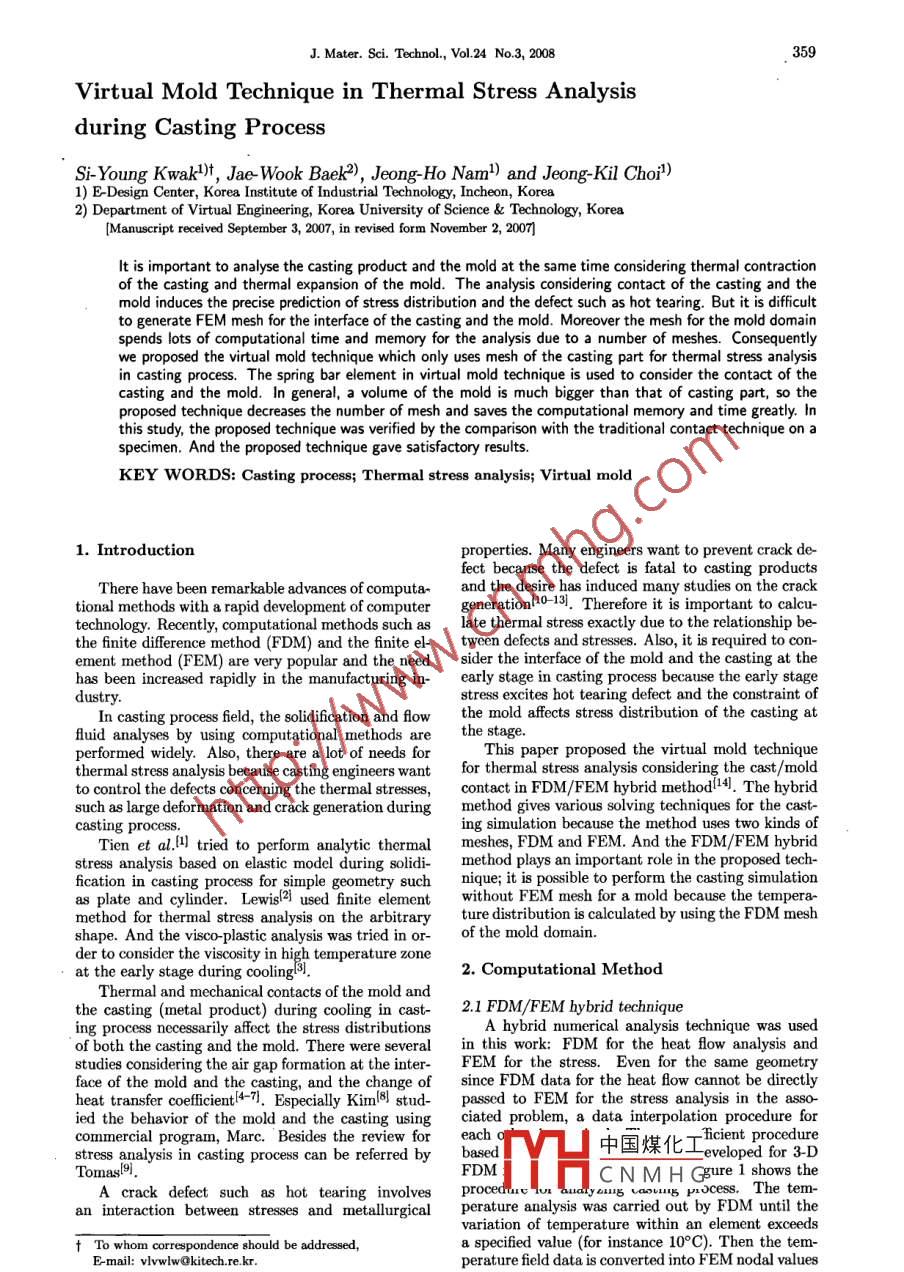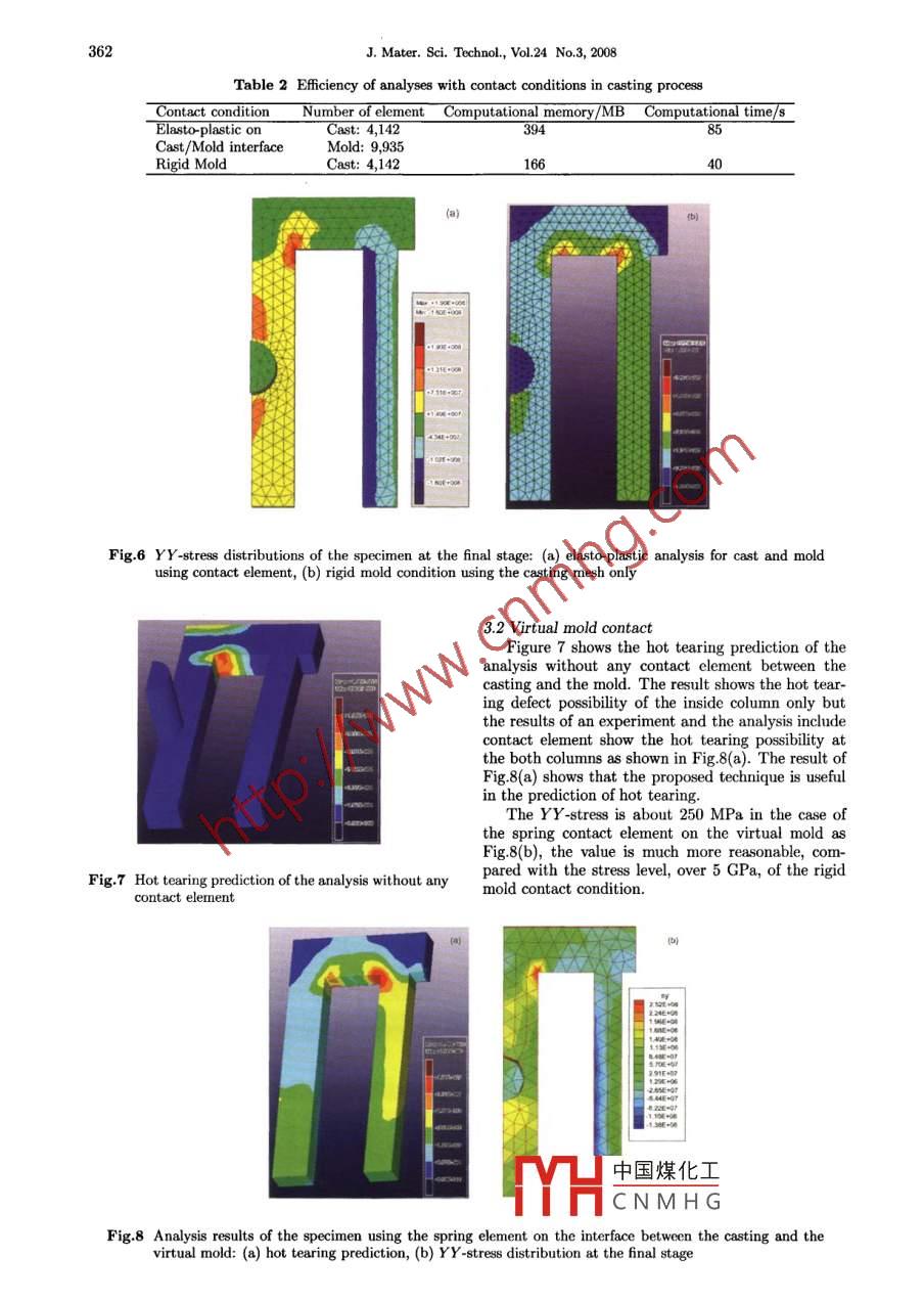 360J. Mater. Sci. Technol, Vol.24 No.3, 2008of friction and gap element has two status, open andclosed & sliding mode. Elasto-plastic-thermal stressanalysis is performed for the casting and the moldModelingparts. The node-to-node contact technique is requiredboth meshes for the casting and the mold, thus theFOM methFEM metmethod supplies a reliable solution. But the largegenerabongeneratonnumber of meshes cause ineffectiveness in the compu-FOMFEtational time and mesh generation work.(2) Rigid mold contactThe contact problem can be classified as the con-TemperatunThemal too。tact element type: node-to-node, surface-to-node,mnalyidsanalyadtsurface-to- surface. In general, the node to-node con-tact element gives good solution but requires dificultFeld data interdacework in FE mesh generation for a complicate shape|Nproduct. The volume of mold is two or three timesHST>Speciledbigger than that of casting, so the mold mesh needslots of computational time and memory.RatumComvege?The mold is more rigid than the casting in diecasting process, s0 it is possible to assumne the mold isrigid. The rigid means that the relative deformationAnlyisreulsis zero in the mold. The rigid mold contact methoddoes not need mesh for mold, so the computationalFig.1 Procedure of FDM/FEM hybrid analysis for cast-time and memory can be saved. However the rigiding processmold induces high stress in casting domain.(3) Virtual mold contactThe rigid mold contact technique is eficient, butInitial gap widththe accuracy is low. Therefore we proposed the vir-tual mold technique. The technique adopts a springt(angential drection)bar element instead of a contact element on the in-terface of the mold and the casting as Fig.3(b). Thewwvn(normal vector)間Fig.2 Configuration of 2-D gap elementto perform non-linear FEM stress analysis.2.2 Contact problem on casting processThe contact of the casting and the mold is commonCastand important phenomena in casting process. ThereContact elementare a couple of algorithms such as penalty method andlagrange method for resolving a contact problem.Mold(1) Cast/mold elasto plastic contactGap element is a 2-node nonlinear element which isused to model node- to-node contact between two bod-ies with or without friction as penalty method. Thegap element configuration of 2-D is shown in Fig.2.We use the gap function as Eq.(1) to determinethe status of a gap element: open or closed.g=(u2 -1)+go1)where (u2 -u1) is the relative displacement in the nor-mal direction of gap and 9o is the initial gap width.The gap condition is represented by the following in-equality equationsSpring elementg> 0 (open status)中國煤化工g≤0 (close status)2)Fig.YHCNM H Gragration for contactGap element has three degrees of freedom (u,U,w) atn the inter-each node and normal compressive force and tangen-face between the casting and the mold, (b) usingtial shear force. In this study, the friction between thespring element on the interface between the cast-casting and the mold was ignored. Frictionless con-ing and the moldtact may be modeled by specifying a zero coefficientJ. Mater. Sci. Technol, Vol.24 No.3, 2008361Table 1 Material, chemical composition and casting condition of the specimenMaterialChemical composition/wt pctCasting conditionCrMo alloy steel 0.22C, 0.42Si, 0.7Mn, 0.93Cr, 0.2Mo_ Pouring termperature: 1600°C permanent moldcomputational efficiency of the technique is high dueto no FEM mold mesh and the accuracy of stress can↑Ybe approved by the elasto-plastic spring element in-stead of a rigid property of mold.Figure 4 is the configuration of the spring bar el-ement arbitrarily oriented, 0, in ry planel6.The relationship between displacement vector andexternal force vector for the spring bar element canbe expressed as(3)→x{詹}=誓[_ 1]{出}Fig.4 Configuration of a spring bar elementThe local stifness matrix, h, is written by(4)4[1]a)where A, E, L are area, elasticity and length of theelement, respectively.And the local stifness matrix, k, in case of arbi-trarily oriented element isC2CS-C2-CS.人k=AE|-CSCS(5)LCs2Mold: elasto-plasticwhere C and S are cos0 and sin0, respectively.3. Results and Discussion3.1 Cast/ mold elasto plastic contact and rigid moldCast olasto-plasticcontactFigure 5(a) is the shape of the specimen which isused for the simulation in this study and the analysisdomain is a quarter part only due to the symmetrygeometry. The chemical composition of the specimenis listed in Table 17,18. Figure 5(b) and (c) show theelasto-plastic contact for the cast/ mold interface andrigid mold contact condition, respectively. Both themeshes of the casting and the mold are required incase of the elasto-plastic cast/ mold interface contactas shown at Fig.5(b). And the rigid mold contact con-dition needs the mesh for the casting only as shownat Fig.5(c).Table 2 shows the efficiency of the analyses withCast elasto-plasticabove contact conditions in casting process. Com-pared with the elasto-plastic contact condition, thecomputational memory and time of the rigid moldconte中國煤化工two times. Fig-ure 6inal (YY) residualstressMH.CNMHGumstressisabout190 Mra under the elasto-plastic contact condition.Fig.5 Cast and mold models used for the simulation inHowever the maximum stress is over 5 GPa under thecontact problem: (a) casting shape for contactrigid mold condition because the rigid contact is theanalysis, (b) meshes for the casting and the mold,very strong constraint.(c) mesh for the casting only362J. Mater. Sci. Technol, Vol.24 No.3, 2008Table 2 Eficiency of analyses with contact conditions in casting processContact conditionNumber of element Computational memory/MB Computational time/s_Elasto-plastic onCast: 4,14239485Cast/Mold interfaceMold: 9,935Rigid Mold1664(434+0Fig.6 YY-stress distributions of the specimen at the final stage: (a) elasto plastic analysis for cast and moldusing contact element, (b) rigid mold condition using the casting mesh only3.2 Virtual mold contactFigure 7 shows the hot teari