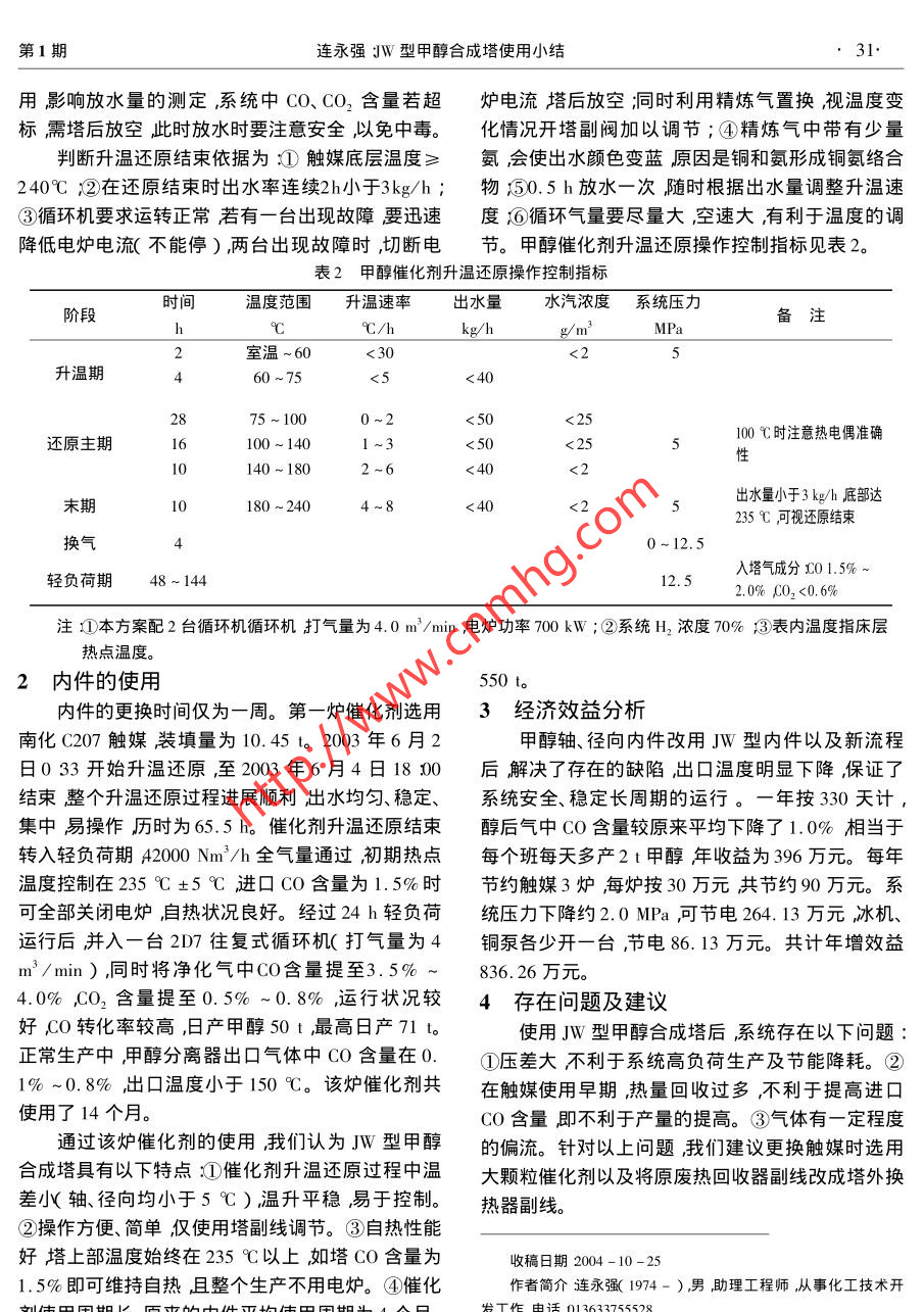 河南化工30-HENAN CHEMICAL INDUSTRY2005年第22卷JW型甲醇合成塔使用小結(jié)連永強(qiáng)(平頂山飛行化工(集團(tuán))有限公司,河南平頂山46700 )摘要針對(duì)合成氨聯(lián)產(chǎn)甲醇時(shí)合成塔內(nèi)件存在的缺陷采用JW型內(nèi)件。詳細(xì)介紹了催化劑的升溫還原方案及內(nèi)件的使用情況保證了系統(tǒng)安全、穩(wěn)定、長(zhǎng)周期的運(yùn)行。關(guān)鍵詞:甲醇合成塔;聯(lián)醇;催化劑中圖分類號(hào):TQ052. 5文獻(xiàn)標(biāo)識(shí)碼:B文章編號(hào):1003 - 3467( 2005 )01 -0030 -02平頂山飛行化工(集團(tuán))有限公司合成氨裝置三不準(zhǔn)提溫、提壓不準(zhǔn)同時(shí)進(jìn)行高溫出水時(shí)間不生產(chǎn)能力為10萬t/a ,1994年投建聯(lián)醇裝置,設(shè)計(jì)準(zhǔn)加長(zhǎng)局部觸媒不準(zhǔn)超溫。能力為2萬t/a。甲醇塔選用φ1000軸、徑向塔內(nèi)具體操作要求:①觸媒層熱點(diǎn)溫度升至60 °C時(shí)件。該裝置自1994年投入運(yùn)行,由于甲醇塔內(nèi)件設(shè)開始放水,以后每半小時(shí)放水一次,計(jì)量并做好記計(jì)上存在一定缺陷致使操作彈性小、難度大CO轉(zhuǎn)錄,出水量是控制整個(gè)還原過程的主要參數(shù)出水量化率低,產(chǎn)量低,觸媒使用壽命短(平均每爐三個(gè)過高則恒溫過低則要緩慢提溫,同時(shí)根據(jù)上一次月),造成甲醇的制造成本非常高塔出口嚴(yán)重超出水量的多少控制提溫的速度。②65 ~120 9C是整溫存在重大安全隱患。因此我公司對(duì)甲醇塔內(nèi)件個(gè)升溫還原的關(guān)鍵期控制此時(shí)每小時(shí)的出水量至進(jìn)行了更換將1000軸、徑向塔內(nèi)件改成JW型內(nèi)關(guān)重要,同時(shí)也應(yīng)密切注意觸媒層溫度的變化,以防件。第一爐催化劑的使用效果表明改造是成功的。超溫和局部過熱提溫速度要緩慢此時(shí)不應(yīng)調(diào)節(jié)進(jìn)1催化劑的充裝及升溫還原方案氣量的大小。③在80~100C左右時(shí)應(yīng)注意觸媒1.1觸媒粒度分布及裝填高度( 見表1 )層各點(diǎn)溫度變化情況,若出現(xiàn)某--點(diǎn)溫度停滯不漲表1觸媒粒度分布及 裝填高度或其它情況應(yīng)進(jìn)行處理這時(shí)操作主要依據(jù)每小時(shí)粒度數(shù)量/kg高度/mm的出水量。④當(dāng)床層溫度升至140 C時(shí)塔后氣體φ6 x8耐火球150CO2含量應(yīng)在1%以下。因觸媒在制造過程中含有φ9 x6觸媒312100少量的碳酸鹽,分解產(chǎn)生二氧化碳同時(shí)在140 C以φ5 x5觸媒10 138.13 100后二氧化碳含量高時(shí)會(huì)合成甲醇生成的甲醇對(duì)催1.2觸媒升溫還原方案化劑有影響放出大量的熱不利于溫度的控制二氧整個(gè)觸媒還原遵循三低、三穩(wěn)、三控制、三不化碳與氫反應(yīng)生成甲醇和水,難以根據(jù)出水量控制準(zhǔn)”原則。三低:低溫出水,低水汽濃度和低溫還升溫速率。⑤溫度升至180 °C進(jìn)行深度的還原反原;三穩(wěn)提溫穩(wěn)壓力穩(wěn)出水穩(wěn);三控制:用高空速應(yīng),同時(shí)伴有甲醇合成反應(yīng)發(fā)生這時(shí)應(yīng)嚴(yán)格控制精控制觸媒溫度控制提溫速度控制每小時(shí)出水量;煉氣中CO、CO2含量否則生成的甲醇阻礙還原作上一自制漏斗漏斗壓蓋做成絲扣式在漏斗內(nèi)注滿3結(jié)論.干油轉(zhuǎn)動(dòng)壓蓋強(qiáng)制擠壓漏斗內(nèi)的干油注入特富隆我公司實(shí)際運(yùn)行的結(jié)果證明了B- F240增稠軸承內(nèi)直至排油口有新鮮干油排出為止。技改后器采用三支撐結(jié)構(gòu)是可行的而三支撐結(jié)構(gòu)的正確操作簡(jiǎn)單省時(shí)省力每天注-次油從根本上解決安裝是檢修的關(guān)鍵所在。軸端特富隆滑動(dòng)軸承潤(rùn)滑了酸性環(huán)境下特富隆軸承的潤(rùn)滑問題。自改造以來改造為壓入式強(qiáng)制干油潤(rùn)滑完全解決了潤(rùn)滑失效未發(fā)生因過負(fù)荷燒毀電機(jī)現(xiàn)象。的問題。通過以上改造,該增稠器長(zhǎng)周期穩(wěn)定運(yùn)行,以上改造措施實(shí)施后增稠器運(yùn)行穩(wěn)定檢修次取得了明顯的經(jīng)濟(jì)效益。數(shù)由改造前舸數(shù)搪/a減少為目前的0.5次/ao第1期連永強(qiáng):JW型甲醇合成塔使用小結(jié)31.用影響放水量的測(cè)定,系統(tǒng)中CO、CO2含量若超爐電流塔后放空;同時(shí)利用精煉氣置換,視溫度變標(biāo)需塔后放空此時(shí)放水時(shí)要注意安全,以免中毒?;闆r開塔副閥加以調(diào)節(jié);④精煉氣中帶有少量判斷升溫還原結(jié)束依據(jù)為:①觸媒底層溫度≥氨會(huì)使出水顏色變藍(lán)原因是銅和氨形成銅氨絡(luò)合240C②在還原結(jié)束時(shí)出水率連續(xù)2h小于3kg/h;物⑤0.5h放水一次隨時(shí)根據(jù)出水量調(diào)整升溫速③循環(huán)機(jī)要求運(yùn)轉(zhuǎn)正常若有一臺(tái)出現(xiàn)故障要迅速度⑥循環(huán)氣量要盡量大空速大,有利于溫度的調(diào)降低電爐電流(不能停),兩臺(tái)出現(xiàn)故障時(shí),切斷電節(jié)。 甲醇催化劑升溫還原操作控制指標(biāo)見表2。表2甲醇催化劑升溫還原操作控制指標(biāo)階段時(shí)間溫度范圍升溫速率出水量水汽濃度系統(tǒng)壓力備注hC/hkg/hg/m3MPa室溫~60< 30<25升溫期60~75<:<402875 ~ 1000~2< 50<25100 C時(shí)注意熱電偶準(zhǔn)確還原主期16100 ~ 140. 1~3<50性10140~ 1802~6出水量小于3 kg/h底部達(dá)末期180 ~ 2404~8235 C可視還原結(jié)束換氣0