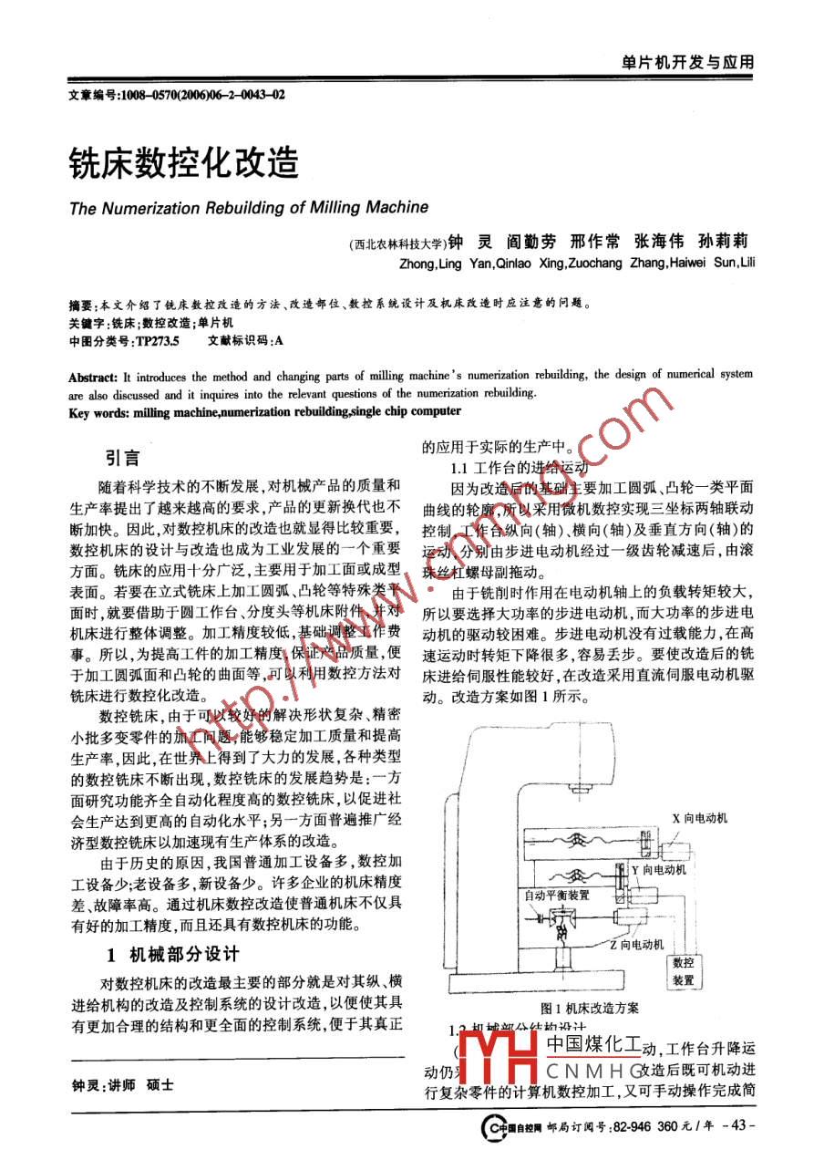 單片機(jī)開發(fā)與應(yīng)用文章編號(hào):1008-05700200606-2004302銑床數(shù)控化改造The Numerization Rebuilding of Milling Machine(西北農(nóng)林科技大學(xué)鐘靈閻勤勞邢作常張海偉孫莉莉Zhong, Ling Yan, Qinlao Xing, Zuochang Zhang, Haiwei Sun, Lil摘要;本文介紹了銑床教控改造的方法、改造部位、數(shù)控系統(tǒng)設(shè)計(jì)及機(jī)床改造時(shí)應(yīng)注意的問(wèn)題關(guān)鍵字銑床;數(shù)控改造;單片機(jī)中圖分類號(hào):TP2735文獻(xiàn)標(biāo)識(shí)碼:AAbstract: It introduces the method and changing parts of milling machine's numerization rebuilding, the design of numerical systemare also discussed and it inquires into the relevant questions of the numerization rebuildingKey words: milling machine, numerization rebuilding single chip computer引言的應(yīng)用于實(shí)際的生產(chǎn)中。11工作臺(tái)的進(jìn)給運(yùn)動(dòng)隨著科學(xué)技術(shù)的不斷發(fā)展,對(duì)機(jī)械產(chǎn)品的質(zhì)量和因?yàn)楦脑旌蟮幕A(chǔ)主要加工圓弧、凸輪一類平面生產(chǎn)率提出了越來(lái)越高的要求,產(chǎn)品的更新?lián)Q代也不曲線的輪廓所以采用微機(jī)數(shù)控實(shí)現(xiàn)三坐標(biāo)兩軸聯(lián)動(dòng)斷加快。因此,對(duì)數(shù)控機(jī)床的改造也就顯得比較重要,控制,工作臺(tái)縱向(軸)橫向(軸)及垂直方向(軸)的數(shù)控機(jī)床的設(shè)計(jì)與改造也成為工業(yè)發(fā)展的一個(gè)重要運(yùn)動(dòng),分別由步進(jìn)電動(dòng)機(jī)經(jīng)過(guò)一級(jí)齒輪減速后,由滾方面。銑床的應(yīng)用十分廣泛,主要用于加工面或成型珠絲杠螺母副拖動(dòng)表面。若要在立式銑床上加工圓弧、凸輪等特殊類平由于銑削時(shí)作用在電動(dòng)機(jī)軸上的負(fù)載轉(zhuǎn)矩較大,面時(shí)就要借助于圓工作臺(tái)、分度頭等機(jī)床附件,并對(duì)所以要選擇大功率的步進(jìn)電動(dòng)機(jī),而大功率的步進(jìn)電機(jī)床進(jìn)行整體調(diào)整。加工精度較低,基礎(chǔ)調(diào)整工作費(fèi)動(dòng)機(jī)的驅(qū)動(dòng)較困難。步進(jìn)電動(dòng)機(jī)沒(méi)有過(guò)載能力在高事。所以,為提高工件的加工精度保證產(chǎn)品質(zhì)量便速運(yùn)動(dòng)時(shí)轉(zhuǎn)矩下降很多,容易丟步。要使改造后的銑于加工圓弧面和凸輪的曲面等,可以利用數(shù)控方法對(duì)床進(jìn)給伺服性能較好,在改造采用直流伺服電動(dòng)機(jī)驅(qū)銑床進(jìn)行數(shù)控化改造。動(dòng)。改造方案如圖1所示數(shù)控銑床,由于可以較好的解決形狀復(fù)雜、精密小批多變零件的加工問(wèn)題能夠穩(wěn)定加工質(zhì)量和提高生產(chǎn)率,因此,在世界上得到了大力的發(fā)展,各種類型的數(shù)控銑床不斷出現(xiàn),數(shù)控銑床的發(fā)展趨勢(shì)是:一方面研究功能齊全自動(dòng)化程度高的數(shù)控銑床,以促進(jìn)社會(huì)生產(chǎn)達(dá)到更高的自動(dòng)化水平;另一方面普遍推廣經(jīng)X向電動(dòng)機(jī)濟(jì)型數(shù)控銑床以加速現(xiàn)有生產(chǎn)體系的改造。由于歷史的原因,我國(guó)普通加工設(shè)備多,數(shù)控加Y向電動(dòng)機(jī)工設(shè)備少老設(shè)備多,新設(shè)備少。許多企業(yè)的機(jī)床精度差、故障率高。通過(guò)機(jī)床數(shù)控改造使普通機(jī)床不僅具自動(dòng)平衡裝置爸有好的加工精度,而且還具有數(shù)控機(jī)床的功能。1機(jī)械部分設(shè)計(jì)Z向電動(dòng)機(jī)對(duì)數(shù)控機(jī)床的改造最主要的部分就是對(duì)其縱、橫裝置進(jìn)給機(jī)構(gòu)的改造及控制系統(tǒng)的設(shè)計(jì)改造,以便使其具圖1機(jī)床改造方案有更加合理的結(jié)構(gòu)和更全面的控制系統(tǒng),便于其真正城部公生鹽設(shè)計(jì)中國(guó)煤化工動(dòng),工作臺(tái)升降運(yùn)動(dòng)仍CNMH&造后既可機(jī)動(dòng)進(jìn)鐘靈:講師碩士行復(fù)雜零件的計(jì)算機(jī)數(shù)控加工,又可手動(dòng)操作完成簡(jiǎn)國(guó)自控網(wǎng)郵局訂閱號(hào):82946360元|年-43單片機(jī)開發(fā)與應(yīng)用中文核心期刊《微計(jì)算機(jī)信息》嵌入式與Soc)2006年第22卷第62期單零件的加工或用于數(shù)控加工前的對(duì)刀工作。度、最大背刀吃刀量等,作為編程時(shí)參考依據(jù)。(2)保留原機(jī)床縱向進(jìn)給的機(jī)動(dòng)部分,將離合器3)應(yīng)盡量消除齒輪副和絲桿副的間隙,齒輪全脫開,去掉手輪。將手輪軸通過(guò)一對(duì)齒輪與步進(jìn)電機(jī)部釆用雙片薄齒輪錯(cuò)齒法消除嚙合間隙。也可采用軟相聯(lián),用徹機(jī)數(shù)控系統(tǒng)控制縱向進(jìn)給運(yùn)動(dòng)。加工時(shí),將件補(bǔ)償進(jìn)給量的方法消除。離合器脫開,使原來(lái)的機(jī)動(dòng)進(jìn)給停止工作(4)銑床工作臺(tái)重,而且銑削力也較大,垂直絲桿(3)工作臺(tái)橫向運(yùn)動(dòng)方面,在原手輪安裝位置,安要配備較大功率的驅(qū)動(dòng)電動(dòng)機(jī),要在工作臺(tái)上加配重裝減速齒輪及步進(jìn)電機(jī),用微機(jī)數(shù)控系統(tǒng)控制橫向進(jìn)給運(yùn)動(dòng)。或平衡液壓缸來(lái)平衡。(4)采用直流伺服電動(dòng)機(jī)作驅(qū)動(dòng)元件,伺服電動(dòng)(5)滾動(dòng)絲桿沒(méi)有自鎖能力,垂直坐標(biāo)不能鎖住,機(jī)的軸端為光軸,齒輪與電動(dòng)機(jī)軸,