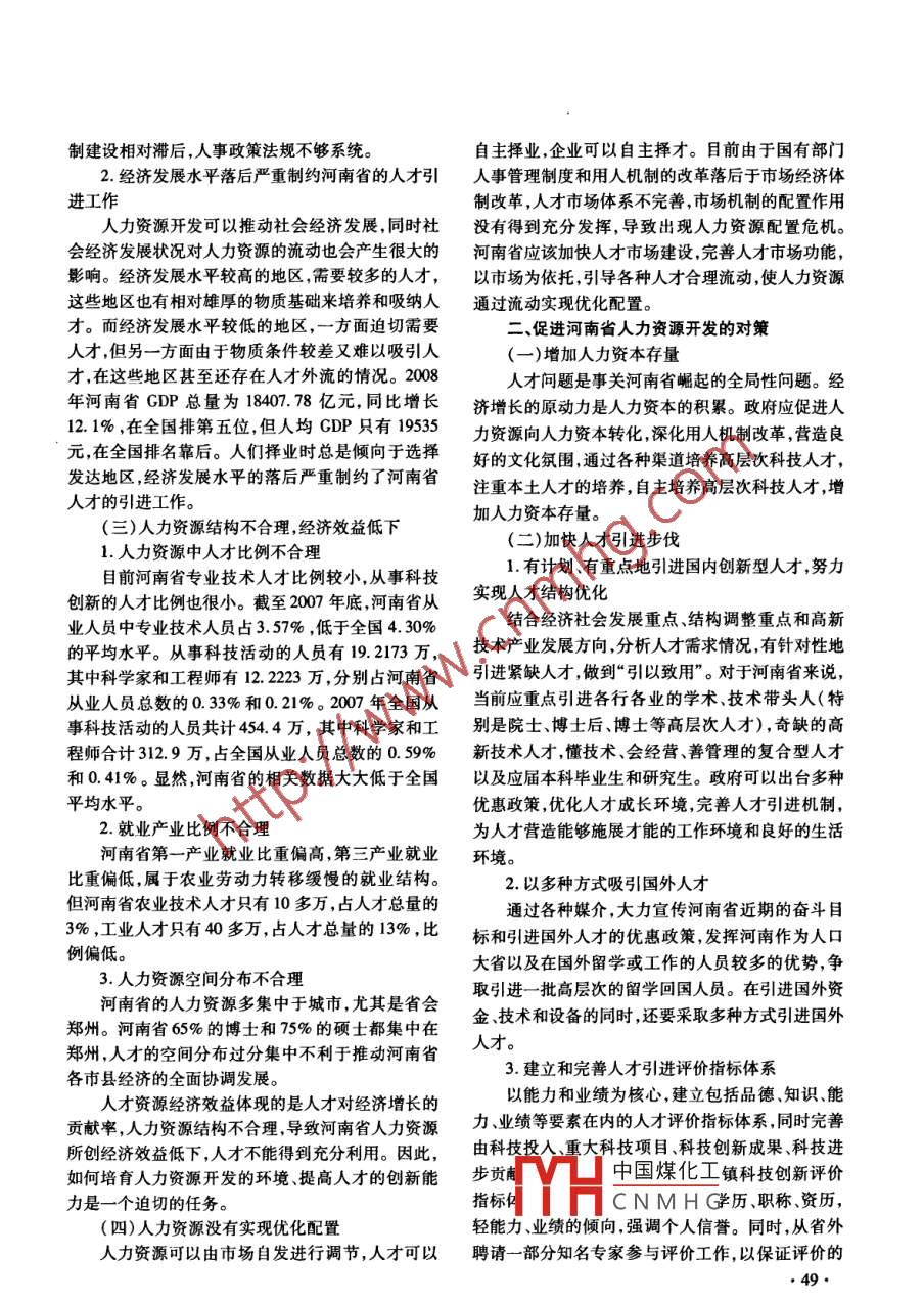 2010年4月管理焉刊Apr. 2010第23卷第2期Journal of ManagemerementVol.23 No.2河南省人力資源開發(fā)中存在的問題及對策李雪苑(商丘師范學(xué)院經(jīng)濟(jì)學(xué)與管理學(xué)系,河南商丘476000)摘要:河南省是人口大省,人力資源很豐富,但要把人力資源轉(zhuǎn)化為人力資本并非易事。近年來河南省人力資源的開發(fā)取得了很大的進(jìn)步,但也存在一些突出的問題,比如人才資源相對貧乏,人才引進(jìn)困難,人力資源結(jié)構(gòu)不合理,人力資源沒有實(shí)現(xiàn)優(yōu)化配置等。要解決上述問題,需要充分發(fā)揮市場資源配置和政府宏觀調(diào)控的優(yōu)勢,重視教育,加快人才引進(jìn),增加人力資本存量。關(guān)鍵詞:人力資源;河南省;對策中圖分類號:C96文獻(xiàn)標(biāo)志碼:A文章編號:1674 - 6511(2010)02 -0048 -03相對于物質(zhì)資源來講,人力資源具有能動性、加快河南省經(jīng)濟(jì)建設(shè)具有極其重要的意義。 雖然目時效性和社會性,與經(jīng)濟(jì)發(fā)展有密切關(guān)系。經(jīng)濟(jì)學(xué)前河南省人力資源開發(fā)狀況有了很大的改善,但隨家丹尼森和庫茲涅茨在分析影響經(jīng)濟(jì)增長的因素時著經(jīng)濟(jì)和社會的發(fā)展,以及社會對人才資源的總量、都強(qiáng)調(diào)了知識的重要性。丹尼森認(rèn)為,在促進(jìn)經(jīng)濟(jì)層次、結(jié)構(gòu)的新要求,河南省人力資源開發(fā)過程中還增長的因素中,知識占2/3,讓知識成為生產(chǎn)力就要存在一些亟待解決的問題。通過人力資本發(fā)揮作用。庫茲涅茨也認(rèn)為在促進(jìn)經(jīng)(一)人才資源相對貧乏濟(jì)增長的因素中知識技術(shù)占據(jù)首要地位。20世紀(jì)河南省人口總量較大。截至2008年末,河南省80年代中后期以來,新經(jīng)濟(jì)增長理論的代表人物羅人口共計(jì)9423萬,其中具有經(jīng)濟(jì)活動能力年齡段的默和盧卡斯分別創(chuàng)立了知識溢出模型和人力資本溢人口是6606.091萬。人口數(shù)量多并不等于人力資出模型。給人的能力賦予了經(jīng)濟(jì)學(xué)的含義,使人力源水平高。全省人才總量為358萬,占人口總數(shù)的資本進(jìn)一步成為促進(jìn)經(jīng)濟(jì)增長的重要因素。新經(jīng)濟(jì)3.66% ,因此河南省人才資源相對貧乏,人口整體素增長理論從知識進(jìn)展的角度,強(qiáng)調(diào)知識積累、技術(shù)創(chuàng)質(zhì)不高,經(jīng)濟(jì)發(fā)展負(fù)擔(dān)大。目前河南省還存在人力新及專業(yè)化人力資本作為決定性的投人要素在促進(jìn)資源勞動生產(chǎn)率偏低的問題。2007 年河南省全員經(jīng)濟(jì)發(fā)展過程中不僅自身收益遞增,而且還可使其勞動生產(chǎn)率為26127元人年, 2000年為9377元他投入要素產(chǎn)生收益遞增效應(yīng),從而使經(jīng)濟(jì)增長動人年。從表面上看,七年間增長了2.8倍,但是與態(tài)化,使經(jīng)濟(jì)增長率提高期得以延長。經(jīng)濟(jì)活動的2007年32411元人年的全國平均水平相比,還有-切競爭都離不開人力資本內(nèi)在的積累。把人力資很大差距。源轉(zhuǎn)化為人力資本以后就可以充分發(fā)揮促進(jìn)經(jīng)濟(jì)發(fā)(二)人才引進(jìn)困難展的作用。1.人才引進(jìn)存在- - 些問題一、河南省人力資源開發(fā)中存在的問題近幾年,河南省人才引進(jìn)工作取得了很大的成在知識經(jīng)濟(jì)時代,要實(shí)現(xiàn)中部地區(qū)崛起尤其是績,但與形勢發(fā)展的要求相比還存在一-定差距。主加快河南省的經(jīng)濟(jì)發(fā)展,就要確立人力資源的核心要表現(xiàn)為:人才資源結(jié)構(gòu)還不能適應(yīng)產(chǎn)業(yè)結(jié)構(gòu)調(diào)整地位,充分重視人力資源開發(fā)。人力資源是一種特的要求,配套能力不強(qiáng);人才資源開發(fā)投人不足,存殊的資本性資源,對它的開發(fā)和充分有效利用可以在重物質(zhì)資源投人,輕人才資源投人的現(xiàn)象;人才流增加社會財(cái)富,也可以保證社會良性運(yùn)行。認(rèn)真研動的體制性和結(jié)構(gòu)性矛盾沒有得到根本解決,社會究人力資源投資對于優(yōu)化河南省人力資源的配置,保障制度有待完善 ,人才流動法規(guī)有待健全;人事法中國煤化工收稿日期:2010-01- 19基金項(xiàng)目:河甫省政府決策研兗招標(biāo)課題( B375)MYHCNMHG作者簡介:李雪苑(1978-),女,河南商丘人,離丘師范學(xué)院經(jīng)濟(jì)學(xué)與管理學(xué)系講師,經(jīng)濟(jì)學(xué)碩士。研究方向:西方經(jīng)濟(jì)學(xué)、區(qū)域經(jīng)濟(jì)理論與規(guī)劃。制建設(shè)相對滯后,人事政策法規(guī)不夠系統(tǒng)。自主擇業(yè),企業(yè)可以自主擇才。目前由于國有部門2.經(jīng)濟(jì)發(fā)展水平落后嚴(yán)重制約河南省的人才引人事管理制度和用人機(jī)制的改革落后于市場經(jīng)濟(jì)體進(jìn)工作制改革,人才市場體系不完善,市場機(jī)制的配置作用人力資源開發(fā)可以推動社會經(jīng)濟(jì)發(fā)展,同時社沒有得到充分發(fā)揮,導(dǎo)致出現(xiàn)人力資源配置危機(jī)。會經(jīng)濟(jì)發(fā)展?fàn)顩r對人力資源的流動也會產(chǎn)生很大的河南省應(yīng)該加快人才市場建設(shè),完善人才市場功能,影響。經(jīng)濟(jì)發(fā)展水平較高的地區(qū),需要較多的人才, .以市場為依托,引導(dǎo)各種人才合理流動,使人力資源這些