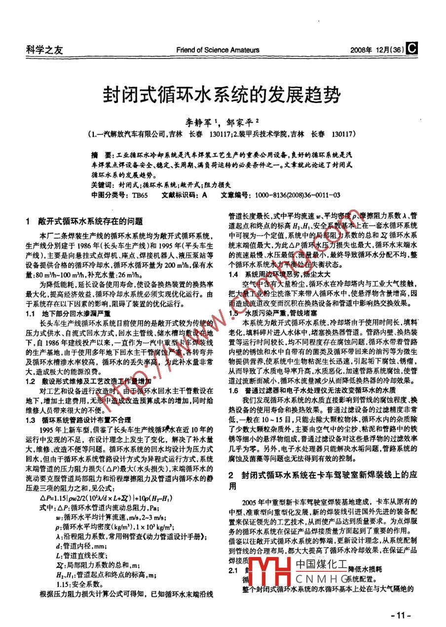科學(xué)之友Friend of Science Amateurs2008年12月(36)封閉式循環(huán)水系統(tǒng)的發(fā)展趨勢李靜軍',鄒家平2(1.-汽解放汽車有限公司,吉林長春130117;2.裝甲 兵技術(shù)學(xué)院,吉林長春130117)商要:工業(yè)循環(huán)水冷卻系統(tǒng)是汽車焊裝工藝生產(chǎn)的重要公用設(shè)備,良好的循環(huán)系統(tǒng)是汽車焊裝點(diǎn)焊設(shè)備安全、穩(wěn)定、長周期、滿負(fù)荷運(yùn)轉(zhuǎn)的必要條件之一。文章就此論述了封閉式循環(huán)水系的發(fā)展趨勢。關(guān)鍵詞:封閉式;循環(huán)水系統(tǒng);敞開式;阻力損失中圖分類號: TB65文獻(xiàn)標(biāo)識碼: A文章編號: 1000-8136(2008)36- 0011-03管道長度最長,式中平均流速w、平均密度p.摩擦阻力系數(shù)入、管1敞開式循環(huán)水系統(tǒng)存在的問題道起點(diǎn)和終點(diǎn)的標(biāo)高H2、H、安全系數(shù)基本上在-套水循環(huán)系統(tǒng)本廠二條焊裝生產(chǎn)線的循環(huán)水系統(tǒng)均為敞開式循環(huán)系統(tǒng),中可視為一個定值,系統(tǒng)中的局部阻力系數(shù)的總和馬循環(huán)水系生產(chǎn)線分別建于1986 年(長頭車生產(chǎn)線)和1995年(平頭車生統(tǒng)末端值最大,為此OP循環(huán)水壓力損失也最大,循環(huán)水末端水產(chǎn)線),主要是向懸掛式點(diǎn)焊機(jī)、座點(diǎn).焊接機(jī)器人、液壓泵站等的流速嚴(yán)慢、水壓最低流量最小,最終導(dǎo)致循環(huán)水分配不均,整設(shè)備提供合格的循環(huán)冷卻水,循環(huán)水循環(huán)量為200 m'hn,保有水個循環(huán)水系統(tǒng)水力平衡處在失衡狀態(tài)。量:80 m?h-~100 mMh,補(bǔ)充水量:26 m/h。1.4 系統(tǒng)周邊環(huán)境惡劣,揚(yáng)塵太大為降低能耗,延長設(shè)備使用壽命,使設(shè)備換熱裝置的換熱率空氣中含有大量粉塵,循環(huán)水在冷卻塔內(nèi)與工業(yè)大氣接觸,最大化.提高經(jīng)濟(jì)效益.循環(huán)冷卻水系統(tǒng)必須實(shí)現(xiàn)優(yōu)化運(yùn)行。由把大量工業(yè)粉塵洗滌下來帶人循環(huán)水中.使懸浮物含量增高,因于系統(tǒng)存在以下因素的影響,阻礙了裝置的優(yōu)化運(yùn)行。而造成流道改變而沉積在換熱設(shè)備和管道中影響熱交換效果。1.1 地下部分回水滲漏嚴(yán)重1.5水質(zhì)污染嚴(yán)重, 管線堵塞長頭車生產(chǎn)線循環(huán)水系統(tǒng)目前使用的是敞開式較為傳統(tǒng)的本系統(tǒng)為敞開式循環(huán)水系統(tǒng),冷卻塔由于使用時間長,填料壓力式供水、自流式回水方式,回水主管線、儲水槽均敷設(shè)在地老化,填料碎片進(jìn)入水體中堵塞換熱器管道。管路內(nèi)壁、換熱裝下,自1986年建線投產(chǎn)以來,一直作為- -汽中重型卡車焊裝線置等運(yùn)行時間較長.均不同程度存在腐蝕問題.循環(huán)水帶著管路的生產(chǎn)基地,由于使用多年地下回水主干管腐蝕嚴(yán)重.各轉(zhuǎn)彎井內(nèi)壁的銹蝕和水中自帶有的菌類及循環(huán)帶回來的油污等為微生及循環(huán)水槽滲水率較高,循環(huán)水的丟失率高,為此補(bǔ)水量非常物提供營養(yǎng),使系統(tǒng)中生物粘泥生長迅速,引起垢下腐蝕、銹瘤,大,造成極大的能源浪費(fèi)。從而導(dǎo)致了水質(zhì)電導(dǎo)率升高,水質(zhì)惡化,加速管路系統(tǒng)腐蝕,使管1.2 敷設(shè)形式維修及工藝改造工作量增加道過流斷面減小.循環(huán)水流量減少從而降低換熱器的冷卻效果。對工藝和設(shè)備進(jìn)行改造時,由于循環(huán)水回水主干管敷設(shè)在1.6 普通過濾器和電子水處理儀無法改變循環(huán)水的水質(zhì)地下,增加土建費(fèi)用,無形中造成改造預(yù)算成本的增加,同時給我們發(fā)現(xiàn)循環(huán)水系統(tǒng)的水質(zhì)直接影響到管線的魔蝕程度換維修人員帶來很大的不便。熱設(shè)備的使用壽命和換熱效果。普通過濾設(shè)備的過濾精度非常1.3 循環(huán)系統(tǒng)管路設(shè)計布環(huán)合理低,-般在10~ 15目,只能去除大顆粒物體.循環(huán)水內(nèi)的雜質(zhì)除1995年上新車型,借鑒了長頭車生產(chǎn)線循環(huán)水在近10年的了少數(shù)大顆粒雜質(zhì)外,主要由空氣中的塵沙、粘泥和管路中的鐵運(yùn)行中發(fā)現(xiàn)的不足,在設(shè)計理念上發(fā)生了變化,解決了補(bǔ)水量銹等細(xì)小的懸浮物組成.普通過濾設(shè)備對這些懸浮物的過濾效率大,維修、改造不便等問題。循環(huán)水系統(tǒng)的回水均設(shè)計為壓力式幾乎為零。另外,電子水處理器只能解決水垢問題,管路系統(tǒng)的回水,但由于循環(huán)水系統(tǒng)管路設(shè)計方式為異程式運(yùn)行方式,系統(tǒng)腐蝕及菌藻等問題也無法得到有效的控制。末端管道的壓力阻力損失( OP)最大(水頭損失),末端循環(huán)水的2封閉式循環(huán)水系統(tǒng)在卡車駕駛室新焊裝線上的應(yīng)流動要克服管道局部阻力和沿程摩擦阻力及管道內(nèi)循環(huán)水的靜壓差三項(xiàng)的阻力之和,見公式: .用OP-1.15{pw22( I0)Vd x L+Z5) }+10p(Hr-H)2005年中重型新卡車駕駛室焊裝基地建成,卡車從原有的式中: OP:循環(huán)水管道內(nèi)流動總阻力,Pa;中型、準(zhǔn)重型向重型化發(fā)展.新的焊裝線引進(jìn)國外先進(jìn)的裝備配w:循環(huán)水平均計算流速,m/e,2~3 m/s;置來保證領(lǐng)先的工藝技術(shù),從而使產(chǎn)品達(dá)到質(zhì)量要求。為點(diǎn)焊服p:循環(h