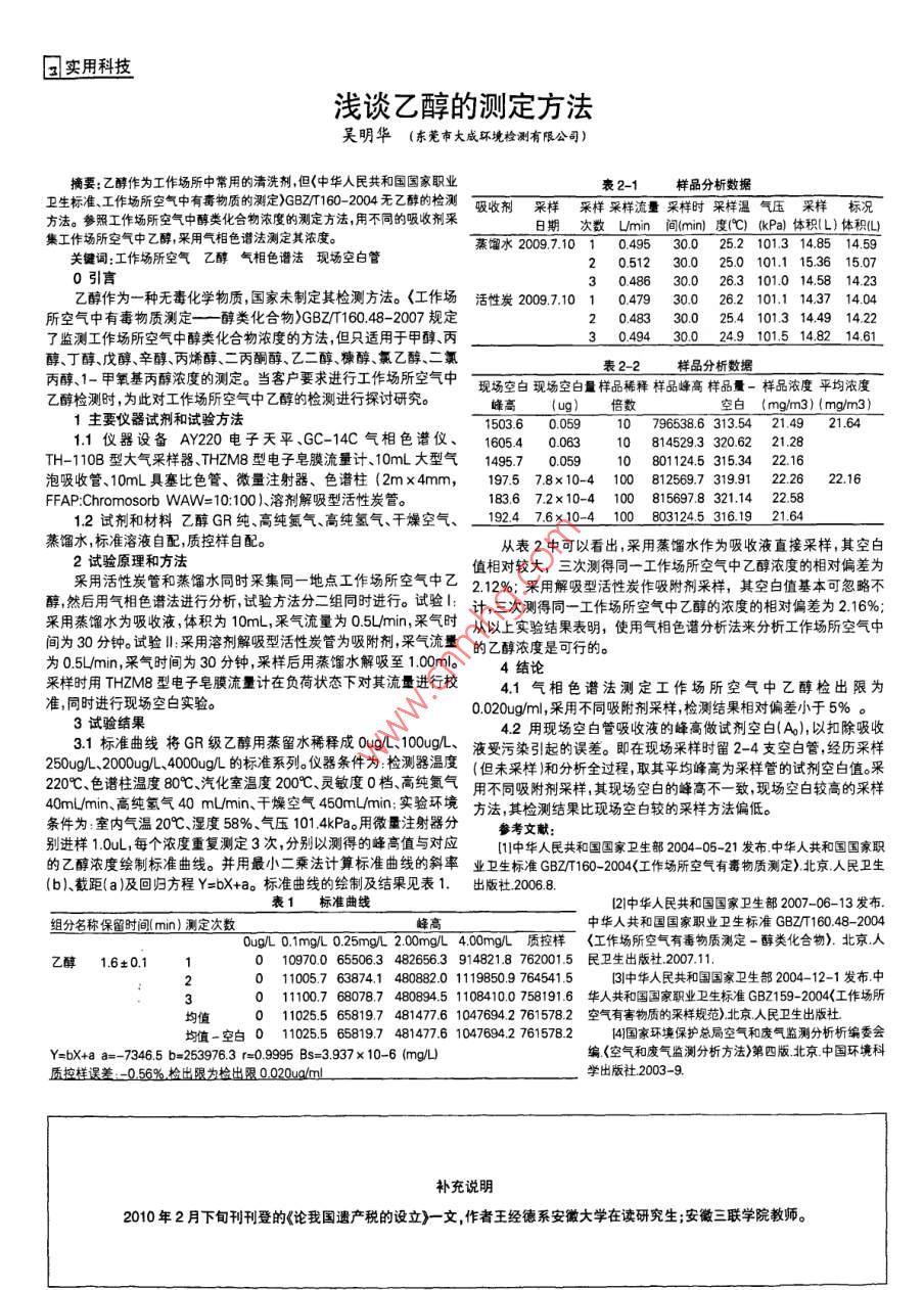 實(shí)用科技淺談乙醇的測(cè)定方法吳明華(東莞市大成環(huán)境檢測(cè)有限公司)摘要:乙醇作為工作場(chǎng)所中常用的清洗劑,但中華人民共和國(guó)國(guó)家職業(yè)表2-1樣品分析數(shù)據(jù)衛(wèi)生標(biāo)準(zhǔn)工作場(chǎng)所空氣中有毒物質(zhì)的測(cè)定BZ60-2004乙醇的檢測(cè)吸收劑采樣采樣采樣流量采樣時(shí)采樣溫氣壓采樣標(biāo)況方法。參照工作場(chǎng)所空氣中醇類化合物濃度的測(cè)定方法,用不同的吸收劑采日期次數(shù)min間min)度(℃)kpa)體積L體積集工作場(chǎng)所空氣中乙醇,采用氣相色譜法測(cè)定其濃度。蒸餾水2009.7.1010.49530.025.2101.314.8514.59關(guān)鍵詞:工作場(chǎng)所空氣乙醇?xì)庀嗌V法現(xiàn)場(chǎng)空白管20.51230.025.0101.115.3615.070引為一種無(wú)毒化學(xué)物質(zhì),國(guó)家未制定其檢測(cè)方法。《工作場(chǎng)活性炭2009.7.1010.47930.026.2101.114314.030.48630.026.3101.014.5814.23所空氣中有毒物質(zhì)測(cè)定醇類化合物GBZT160.48-2007規(guī)定20.48330.025.4101.314.4914.22了監(jiān)測(cè)工作場(chǎng)所空氣中醇類化合物濃度的方法,但只適用于甲醇、30.49430.0249101.514.8214.61醇、丁醇、戊醇、辛醇、丙烯醇、二丙酮醇、乙二醇、糠醇、氯乙醇、二氯基丙濃度的測(cè)定當(dāng)客戶要求進(jìn)行工作場(chǎng)所空氣表2-2樣品分析數(shù)據(jù)丙醇、1-甲氧基丙醇濃度的測(cè)定。當(dāng)客戶要求進(jìn)行工作場(chǎng)所空氣中現(xiàn)場(chǎng)空白現(xiàn)場(chǎng)空白量樣品稀釋樣品峰高樣品量一樣品濃度平均濃度乙醇檢測(cè)時(shí),為此對(duì)工作場(chǎng)所空氣中乙醇的檢測(cè)進(jìn)行探討研究。倍數(shù)空白(mgm3)(mg/m3)1主要儀器試劑和試驗(yàn)方法1503.60.05910796538.6313.5421.4921.641.1儀器設(shè)備AY220電子天平、GC-14C氣相色譜儀、1605.40.06310814529.3320.6221.2Th-110型大氣采樣器、THZM8型電子皂膜流量計(jì)、10mL大型氣1495.70.059108011245315.3422.16泡吸收管、10mL具塞比色管、微量注射器、色柱(2m×4m,19757.10m47578X0《8I2973236.7399122.2622.16ffap Chromosorb WAW10:100溶劑解吸型活性炭管。1.2試劑和材料乙醇GR純高純氣高純氫氣、干燥空氣、192.2GR192476X0-410《8031245316J921J645316.1921.64蒸餾水,標(biāo)準(zhǔn)溶液自配,質(zhì)控樣自配。從表2中可以看出,采用蒸餾水作為吸收液直接采樣,其空白2試驗(yàn)原理和方法相對(duì)較大,三次測(cè)得同一工作場(chǎng)所空氣中乙醇濃度的相對(duì)偏差采用活性炭管和蒸餾水同時(shí)采集同一地點(diǎn)工作場(chǎng)所空氣中乙2.12%;采用解吸型活性炭作吸附劑采樣,其空白值基本可忽略不醇,然后用氣相色譜法進(jìn)行分析,試驗(yàn)方法分二組同時(shí)進(jìn)行。試驗(yàn):計(jì),三次測(cè)得同一工作場(chǎng)所空氣中乙醇的濃度的相對(duì)偏差為2.16%;采用蒸餾水為吸收液,體積為10mL,采氣流量為0.5Lmin,采時(shí)從以上實(shí)驗(yàn)結(jié)果表明,使用氣相色譜分析法來(lái)分析工作場(chǎng)所空氣中間為30分鐘試驗(yàn):采用溶劑解吸型活性炭管為吸附劑,采氣流量的乙醇濃度是可行的。為0.5L/min,采氣時(shí)間為30分鐘,采樣后用蒸餾水解吸至1.00ml4結(jié)論采樣時(shí)用THZM型電子皂膜流量計(jì)在負(fù)荷狀態(tài)下對(duì)其流量進(jìn)行校4.1氣相色譜法測(cè)定工作場(chǎng)所空氣中乙醇檢出限為準(zhǔn),同時(shí)進(jìn)行現(xiàn)場(chǎng)空白實(shí)驗(yàn)。0.00u/用不同吸附劑采樣,檢測(cè)結(jié)果相對(duì)偏差小于5%。3試驗(yàn)結(jié)果4.2用現(xiàn)場(chǎng)空白管吸收液的峰高做試劑空白(A),以扣除吸收3.1標(biāo)準(zhǔn)曲線將GR級(jí)乙醇用蒸留水稀釋成0ug0ug/液受污染引起的誤差。即在現(xiàn)場(chǎng)采樣時(shí)留2-4支空白管,經(jīng)歷采樣250ugg標(biāo)準(zhǔn)系列儀器條件為:檢測(cè)器溫度(但未采樣)和分析全過(guò)程,取其平均峰高為采樣管的試劑空白值。采220℃、色譜柱溫度80℃、汽化室溫度200℃、靈敏度0檔、高純氮?dú)庥貌煌絼┎蓸?其現(xiàn)場(chǎng)空白的峰高不一致現(xiàn)場(chǎng)空白較高的采樣40 0mmin、高純氫氣400 mLmin、干燥空氣450m/min:實(shí)驗(yàn)環(huán)境方法其檢測(cè)結(jié)果比現(xiàn)場(chǎng)空白較的采樣方法偏低。條件為:室內(nèi)氣溫20℃、濕度58%、氣壓101.4Pa用微量注射器分華人民共和國(guó)國(guó)家衛(wèi)生部2004-05-21發(fā)布中華人共和國(guó)國(guó)家職別進(jìn)樣10uL,每個(gè)濃度重復(fù)測(cè)定3次,分別以測(cè)得的峰高值與對(duì)應(yīng)1的乙醇濃度繪制標(biāo)準(zhǔn)曲線。并用最小二乘法計(jì)算標(biāo)準(zhǔn)曲線的斜率業(yè)衛(wèi)生標(biāo)準(zhǔn)GBZ/T160-2004工作場(chǎng)所空氣有毒物質(zhì)測(cè)定北京人民衛(wèi)生(b)、截距(a)及回歸方程Y=bx+a。標(biāo)準(zhǔn)曲線的繪制及結(jié)果見(jiàn)表1.出版社2006.8繪制表1標(biāo)準(zhǔn)曲線【2中華人民共和國(guó)國(guó)家衛(wèi)生部2007-06-13發(fā)布組分名稱保留時(shí)間(min)測(cè)定次數(shù)峰高中華人共和國(guó)國(guó)家職業(yè)衛(wèi)生標(biāo)準(zhǔn)GBZ/T160.48-2004ug/0.1mg/0.25mg/2.00mg/L4.00mg/L質(zhì)控樣工作場(chǎng)所空氣有毒物質(zhì)測(cè)定醇類化合物).北京人乙醇1.6±0.11010970.60009700《6550634826563914821876200120071.394821.8762001.5民衛(wèi)生出版社2007.1120076819809764153中華民共和國(guó)國(guó)家衛(wèi)生部00