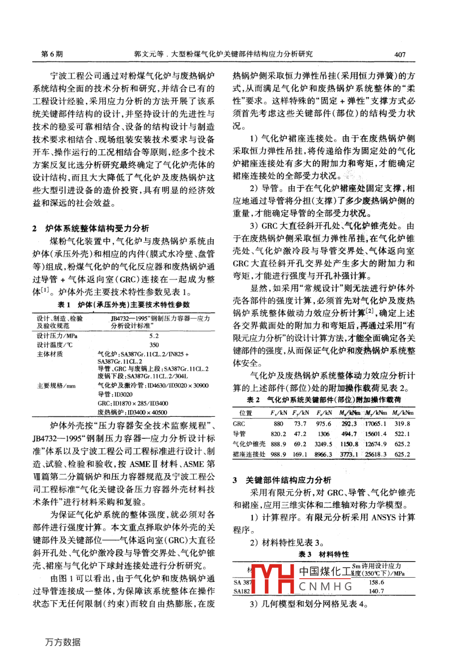 2009年12月...Dec.2009第32卷第6期Large Scale Nitrogenous Fertilizer IndustryVol.32 No.6大型粉煤氣化爐關(guān)鍵部件結(jié)構(gòu)應(yīng)力分析研究郭文元段新群? 蔣自平2(1.中國石化集團(tuán)寧波技術(shù)研究院,浙江寧波,315103;2.中國石化集團(tuán)寧波工程有限公司.浙江寧波,315103)摘要通過對大型干煤粉 氣化爐及廢熱鍋爐系統(tǒng)的結(jié)構(gòu)受力分析,進(jìn)行了爐體大直徑斜開孔、導(dǎo)管、氣化爐錐殼和裙座等關(guān)鍵部件(部位)的結(jié)構(gòu)應(yīng)力分析研究,并將研究結(jié)果用于指導(dǎo)爐體的設(shè)計、制造檢驗驗收.組裝等,經(jīng)過煤氣化裝置氣化爐和廢熱鍋爐的操作運(yùn)行實踐表明完全滿足裝置操作要求。關(guān)鍵詞氣化爐應(yīng)力分析 結(jié)構(gòu)粉煤1概述保證整個系統(tǒng)處于安全狀態(tài)。這樣特殊的“固定日投煤量2000t SCGP煤氣化工藝干煤粉氣+彈性”支撐方式,在進(jìn)行結(jié)構(gòu)設(shè)計時必須進(jìn)行系化爐作為以固態(tài)原料采用非催化部分氧化制合成統(tǒng)承壓外殼的強(qiáng)度計算,從而保證其安全性。氣,在國內(nèi)已建成或正在建設(shè)的裝置有20套以氣體源劇室上,中國石化集團(tuán)寧波工程有限公司(以下簡稱寧波工程公司)承建了其中4套裝置用于合成氨“煤代油”技術(shù)改造的氣化裝置,已分別于2006年底、2007年初相繼開車投人工業(yè)化運(yùn)行。粉煤氣化裝置的核心設(shè)備是氣化爐及其廢熱鍋爐系統(tǒng)。干煤粉氣化爐中發(fā)生部分氧化氣化反魅7段應(yīng),工藝選擇必須使氣流以接近45°角度進(jìn)人廢熱鍋爐中進(jìn)行余熱回收。氣化反應(yīng)生成主要成分為2CO+ H2、溫度為1400~ 1600C的粗合成氣,經(jīng)激冷至900C后通過導(dǎo)管、氣體返向室進(jìn)人廢熱鍋爐,粗合成氣的余熱回收在廢熱鍋爐(合成氣冷卻氣化護(hù)器)中完成。就氣化爐及廢熱鍋爐系統(tǒng)機(jī)械結(jié)構(gòu)方面而言,與常規(guī)大型設(shè)備的結(jié)構(gòu)、安裝方式不同,該氣化爐、導(dǎo)管、氣體返向室、廢熱鍋爐組成了一個整一部分第二部分體結(jié)構(gòu)安裝在氣化島內(nèi)的開放式剛性框架中,如圖1所示。裝置第一部分氣化爐側(cè)高度約40m,圖1氣化爐及廢鍋系統(tǒng)布置其支撐方式為底部固定在35 m混凝土框架上;裝1--氣化爐裙座與下球封連接處;2-氣化爐錐殼;置第二部分廢熱鍋爐側(cè)高度約50m,采用恒力彈3一激冷段與導(dǎo)管連接處;4- GRC大直徑斜開孔處簧吊架吊掛支承;該兩部分軸線間距為10m,通過導(dǎo)管+氣體返向室連為一體。這樣的“固定+彈中國煤化工E程師,1988年畢業(yè)于華性"支撐方式的優(yōu)點是使整個系統(tǒng)無論在冷態(tài)(安東化fYHC N M H G集團(tuán)寧波技術(shù)研究院副裝、停車期間),還是在熱態(tài)(操作運(yùn)行期間)都能院長,獲12項中國專利。聯(lián)系電話:0574.87975205; E-mail: guowy夠保證不會因為熱脹冷縮產(chǎn)生過大的結(jié)構(gòu)應(yīng)力,@ snee . com。第6期郭文元等.大型粉煤氣化爐關(guān)鍵部件結(jié)構(gòu)應(yīng)力分析研究407寧波工程公司通過對粉煤氣化爐與廢熱鍋爐熱鍋爐側(cè)采取恒力彈性吊掛(采用恒力彈簧)的方系統(tǒng)結(jié)構(gòu)全面的技術(shù)分析和研究,并結(jié)合已有的式,從而滿足氣化爐和廢熱鍋爐系統(tǒng)整體的“柔工程設(shè)計經(jīng)驗,采用應(yīng)力分析的方法開展了該系性"要求。這樣特殊的“固定+彈性”支撐方式必統(tǒng)關(guān)鍵部件結(jié)構(gòu)的設(shè)計,并堅持設(shè)計的先進(jìn)性與須首先考慮這些關(guān)鍵部件(部位)的結(jié)構(gòu)受力狀技術(shù)的穩(wěn)妥可靠相結(jié)合、設(shè)備的結(jié)構(gòu)設(shè)計與制造技術(shù)要求相結(jié)合、現(xiàn)場組裝安裝技術(shù)要求與設(shè)備1)氣化爐裙座連接處。由于在廢熱鍋爐側(cè)開車操作運(yùn)行的工況相結(jié)合等原則,經(jīng)多個技術(shù)采取恒力彈性吊掛,將傳遞給作為固定處的氣化方案反復(fù)比選分析研究最終確定了氣化爐殼體的爐裙座連接處有多大的附加力和彎矩,才能確定設(shè)計結(jié)構(gòu),而且大大降低了氣化爐及廢熱鍋爐這裙座連接處的全部受力狀況。些大型引進(jìn)設(shè)備的造價投資,具有明顯的經(jīng)濟(jì)效2)導(dǎo)管。由于在氣化爐裙座處固定支撐,相益和深遠(yuǎn)的社會效益。應(yīng)地通過導(dǎo)管將分擔(dān)(支撐)了多少廢熱鍋爐側(cè)的重量,才能確定導(dǎo)管的全部受力狀況。2爐體 系統(tǒng)整體結(jié)構(gòu)受力分析3) GRC大直徑斜開孔處、氣化爐錐殼處。由煤粉氣化裝置中,氣化爐與廢熱鍋爐系統(tǒng)由于在廢熱鍋爐側(cè)采取恒力彈性吊掛,在氣化爐錐爐體(承壓外殼)和相應(yīng)的內(nèi)件(膜式水冷壁、盤管殼處.氣化爐激冷段與導(dǎo)管交界處、氣體返向室等)組成,粉煤氣化爐的氣化反應(yīng)器和廢熱鍋爐通GRC大直徑斜開孔交界處產(chǎn)生多大的附加力和過導(dǎo)管+氣體返向室(GRC)連接在一起成為整彎矩,才能進(jìn)行強(qiáng)度與開孔補(bǔ)強(qiáng)計算。顯然,如采用“常規(guī)設(shè)計”則無法進(jìn)行爐體外體[1。爐體外殼主要技術(shù)特性參數(shù)見表1。殼各部件的強(qiáng)度計算,必須首先對氣化爐及廢熱表1爐體(承壓外殼)主要 技術(shù)特性參數(shù)設(shè)計、制