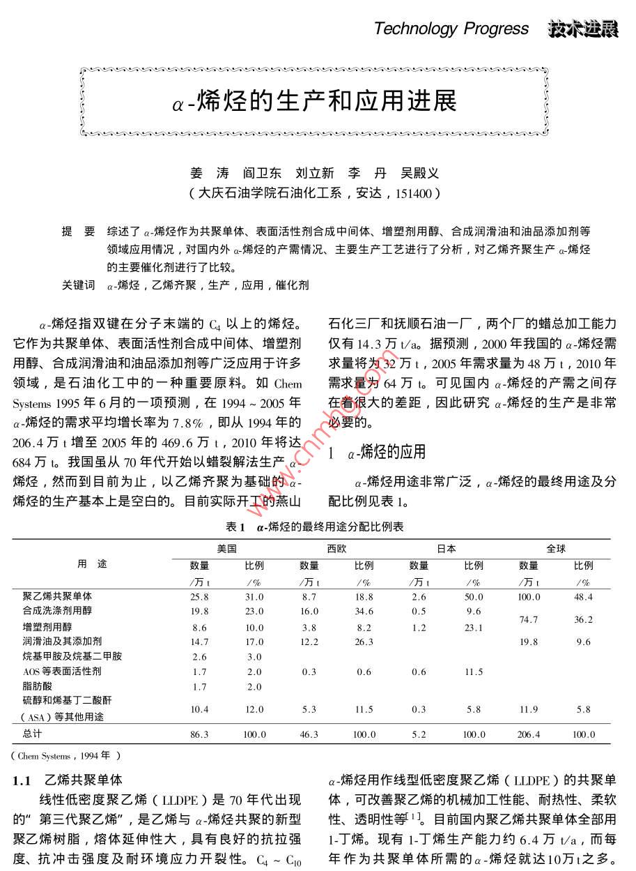 Technology Progress技術(shù)進展a.烯烴的生產(chǎn)和應(yīng)用進展姜濤閻衛(wèi)東劉立新李丹吳殿義(大慶石油學(xué)院石油化工系,安達, 151400 )提要綜述了a-烯烴作為共聚單體、表面活性劑合成中間體、增塑劑用醇、合成潤滑油和油品添加劑等領(lǐng)域應(yīng)用情況,對國內(nèi)外a-烯烴的產(chǎn)需情況、主要生產(chǎn)工藝進行了分析,對乙烯齊聚生產(chǎn)a~烯烴.的主要催化劑進行了比較。關(guān)鍵詞a-烯烴,乙烯齊聚,生產(chǎn),應(yīng)用,催化劑a-烯烴指雙鍵在分子末端的C4以,上的烯烴。石化三廠和撫順石油一廠,兩個廠的蠟總加工能力它作為共聚單體、表面活性劑合成中間體、增塑劑僅有14.3萬t/ao據(jù)預(yù)測, 2000年我國的a-烯烴需用醇、合成潤滑油和油品添加劑等廣泛應(yīng)用于許多求量將為32萬t, 2005年需求量為48萬t, 2010年領(lǐng)域,是石油化工中的一種重要原料。如Chem需求量為64萬t??梢妵鴥?nèi)a-烯烴的產(chǎn)需之間存Systems 1995年6月的一項預(yù)測,在1994~ 2005年在著很大的差距,因此研究a-烯烴的生產(chǎn)是非常a-烯烴的需求平均增長率為7.8% ,即從1994年的必要的。206.4萬t增至2005年的469.6萬t, 2010年將達.1 a-烯烴的應(yīng)用684萬t。我國雖從70年代開始以蠟裂解法生產(chǎn)a-烯烴,然而到目前為止,以乙烯齊聚為基礎(chǔ)的a-a-烯烴用途非常廣泛, a-烯烴的最終用途及分烯烴的生產(chǎn)基本.上是空白的。目前實際開工的燕山配比例見表1。表1 a-烯烴的 最終用途分配比例表美國日本全球用途數(shù)量比例/萬/%/萬:%/萬!/萬1聚乙烯共聚單體25.831.08.718.82.650.0100.048.4合成洗滌劑用醇19. 823.016.034.0.59.64.736.2增塑劑用醇8.610.03.88.2.223.1潤滑油及其添加劑14.717.012.226..9.8烷基甲胺及烷基二甲胺AOS等表面活性劑2.00.3).60.611.5脂肪酸1.7硫醇和烯基丁二酸酐10.412.05.31.55.811.9( ASA)等其他用途總計86.346.3100.0 .5.2206.4( Chem Systems, 1994年)1.1 乙烯共聚單體a-烯烴用作線型低密度聚乙烯( LLDPE)的共聚單線性低密度聚乙烯( LLDPE)是70年代出現(xiàn)體,可改善聚乙烯的機械加工性能、耐熱性、柔軟的”第三代聚乙烯”,是乙烯與a~烯烴共聚的新型性、透明性等1。目前國內(nèi)聚乙烯共聚單體全部用聚乙烯樹脂,熔體延伸性大,具有良好的抗拉強1-丁烯?,F(xiàn)有1-丁烯生產(chǎn)能力約6.4萬t/a,而每度、抗沖擊強度及耐環(huán)境應(yīng)力開裂性。Ca~ Cro年作為共聚單體所需的a-烯烴就達10萬i之多。化工進展2001 年第3期171995年國內(nèi)LLDPE 生產(chǎn)能力為56.5萬t/a,實際歐、日本等發(fā)達國家生產(chǎn)高碳增塑劑醇的技術(shù)不斷產(chǎn)量17.8萬t ,大部分設(shè)備用來生產(chǎn)HDPE.除了發(fā)展,產(chǎn)量不斷增加,高碳增塑劑醇的生產(chǎn)量都在后加工應(yīng)用未能配套外,缺乏1-己烯、1-辛烯作共幾萬t到幾十萬t左右,其消費的比例也較大。我聚單體也是重要原因之一。此外,在改善LLDPE國對直鏈醇增塑劑的需求將達到4~5萬t/a,目前抗撕裂強度和破壞強度等性能方面,1-丁烯不及1-仍以生產(chǎn)C4醇和Cg醇為主,Cg以上高碳增塑劑醇己烯和1-辛烯。在1997年以前全部需要進口。吉林化學(xué)工業(yè)公司1.2 表面活性劑合成中間體10萬t/a的高碳醇裝置提供Cg~ Cro混合直鏈偶碳以a-烯烴為原料,通過羰基化合成反應(yīng)可以醇用于高碳增塑劑的生產(chǎn),可以部分緩解高碳增塑制得醇。碳數(shù)大于11的醇主要用于合成洗滌劑2]。劑醇酯和原料醇依賴進口的局面。然而,仍然難以洗滌劑醇的原料既可用直鏈a-烯烴,也可用內(nèi)烯完全滿足多功能增塑劑品種和數(shù)量的需求5。烴。前者制得的洗滌劑醇直鏈度可高達87%,且1.4合成潤滑油和油品添加劑生物降解性好,后者制得的洗滌劑醇的直鏈度僅a-烯烴可以氧化合成脂肪酸,特別是奇碳數(shù)脂76%~80%,生物降解性能相對差-些。直接磺化肪酸,是生產(chǎn)潤滑劑的最好原料6。由1-癸烯或1-線性a-烯烴得到線性a-烯烴的磺酸鹽、異構(gòu)的烯辛烯齊聚而得聚a~烯烴( polyalphaolefin , PAO),是烴磺酸和烷烴砜的混合物,它在硬水或低濃度中是一種低粘度、低傾點、高粘度指數(shù)、化學(xué)和熱穩(wěn)定良好的洗滌劑,具有良好的生物降解性、溶解性和性好的優(yōu)質(zhì)合成潤滑油。以PAO為基礎(chǔ)油能生起泡性,是優(yōu)良的陰離子合成洗滌劑。通過苯與磺產(chǎn)出國際標(biāo)準(zhǔn)化組織( ISO)確定的各種粘度等級化線性a_烯烴的Friedel-Crafts反應(yīng)合成--種重要的的工業(yè)潤滑油。由于其粘度指數(shù)較高,可以減少聚家用洗滌劑-烷基苯磺酸鹽$3]。由Co~ Ciga-烯合物或高粘度級別礦物油的使用,這些物質(zhì)在高溫?zé)N制得的氫化脂肪胺(一種非離子表面活性劑)對時也易于降解。聚a-_烯烴合成潤滑油具有傾點低、皮膚作用柔和、泡沫穩(wěn)定性好。Co~ C,的a-烯烴低溫性能好、粘度指數(shù)高、對添加劑感受性好、高合成的Cio~ Cx脂肪酸,是生產(chǎn)陽離子表面活性劑溫下安定性好等優(yōu)點,多用于苛刻的使用環(huán)境中。和肥皂的原料6。其次,C14~ Ci6a-烯烴經(jīng)SO,磺目前國內(nèi)合成潤滑油生產(chǎn)能力約3.7~4.4萬t/ao化,再與氫氧化鈉反應(yīng)生成a烯烴磺酸鈉( AOS),由于采用蠟裂解路線,合成原料線性a-烯烴中異.是優(yōu)良的陰離子表面活性劑。由于目前環(huán)境污染問構(gòu)烯烴含量較高,因而合成潤滑油的粘度指數(shù)和溴題