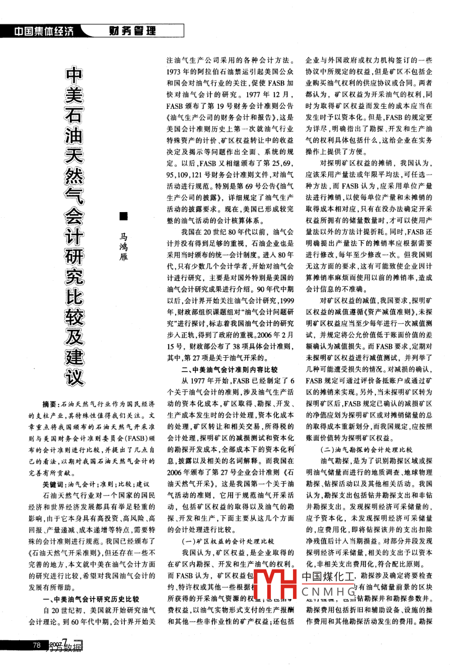 血集值經(jīng)濟(jì)飛財(cái)藥理注油氣生產(chǎn)公司采用的各種會(huì)計(jì)方法。企業(yè)與外國(guó)政府或權(quán)力機(jī)構(gòu)簽訂的一些1973年的阿拉伯石油禁運(yùn)引起美國(guó)公眾協(xié)議中所規(guī)定的權(quán)益,但是礦區(qū)不包括企和國(guó)會(huì)對(duì)油氣行業(yè)的關(guān)注,促使FASB加業(yè)購(gòu)買(mǎi)油氣權(quán)利的供應(yīng)協(xié)議或合同。兩者快對(duì)油氣會(huì)計(jì)的研究。1977年12月,都認(rèn)為,礦區(qū)權(quán)益為開(kāi)采油氣的權(quán)利,同F(xiàn)ASB頒布了第19號(hào)財(cái)務(wù)會(huì)計(jì)準(zhǔn)則公告時(shí)為取得礦區(qū)權(quán)益而發(fā)生的成本應(yīng)當(dāng)在《油氣生產(chǎn)公司的財(cái)務(wù)會(huì)計(jì)和報(bào)告》,這是發(fā)生時(shí)予以資本化。但是,FASB的規(guī)定更美國(guó)會(huì)計(jì)準(zhǔn)則歷史上第一次就油氣行業(yè)為詳盡,明確指出了勘探、開(kāi)發(fā)和生產(chǎn)油特殊資產(chǎn)的計(jì)價(jià)、礦區(qū)權(quán)益轉(zhuǎn)讓中的收益氣的權(quán)利具體包括什么,這給企業(yè)在實(shí)務(wù)決定及揭示等問(wèn)題作出全面、系統(tǒng)的規(guī)操作上提供了方便定。以后,FASB又相繼頒布了第25,69,對(duì)探明礦區(qū)權(quán)益的攤銷(xiāo),我國(guó)認(rèn)為天然氣會(huì)計(jì)研究比95,109,121號(hào)財(cái)務(wù)會(huì)計(jì)準(zhǔn)則文件,對(duì)油氣應(yīng)該采用產(chǎn)量法或年限平均法,可任選活動(dòng)進(jìn)行規(guī)范。特別是第69號(hào)公告《油氣種方法,而FASB認(rèn)為,應(yīng)采用單位產(chǎn)量生產(chǎn)公司的披露》,詳細(xì)規(guī)定了油氣生產(chǎn)法進(jìn)行攤銷(xiāo),以使每單位產(chǎn)量和未攤銷(xiāo)的活動(dòng)的披露要求?,F(xiàn)在,美國(guó)已形成較完取得成本相對(duì)應(yīng),只有在沒(méi)辦法確定開(kāi)采整的油氣活動(dòng)的會(huì)計(jì)核算體系。權(quán)益所擁有的儲(chǔ)量數(shù)量時(shí),才可以使用產(chǎn)我國(guó)在20世紀(jì)80年代以前,油氣會(huì)量法以外的方法計(jì)提折耗。同時(shí)FASB還計(jì)并沒(méi)有得到足夠的重視,石油企業(yè)也是明確提出產(chǎn)量法下的攤銷(xiāo)率應(yīng)根據(jù)需要采用當(dāng)時(shí)頒布的統(tǒng)一會(huì)計(jì)制度。進(jìn)入80年進(jìn)行修改,每年至少修改一次。但我國(guó)則代,只有少數(shù)幾個(gè)會(huì)計(jì)學(xué)者,開(kāi)始對(duì)油氣會(huì)無(wú)這方面的要求,這有可能致使企業(yè)因計(jì)計(jì)進(jìn)行研究,主要是對(duì)國(guó)外特別是美國(guó)的算攤銷(xiāo)率麻煩而使用以前的攤銷(xiāo)率,造成油氣會(huì)計(jì)研究成果進(jìn)行介紹。90年代中期會(huì)計(jì)信息的不準(zhǔn)確以后,會(huì)計(jì)界開(kāi)始關(guān)注油氣會(huì)計(jì)研究,1999對(duì)礦區(qū)權(quán)益的減值,我國(guó)要求,探明礦比較及建議年,財(cái)政部組織課題組對(duì)“油氣會(huì)計(jì)問(wèn)題研區(qū)權(quán)益的減值遵循《資產(chǎn)減值準(zhǔn)則》,未探究”進(jìn)行探討標(biāo)志著我國(guó)油氣會(huì)計(jì)的研究明礦區(qū)權(quán)益應(yīng)當(dāng)至少每年進(jìn)行一次減值測(cè)步入正軌,得到了政府的重視。2006年2月試,并規(guī)定將公允價(jià)值低于賬面價(jià)值的差15號(hào),財(cái)政部公布了38項(xiàng)具體會(huì)計(jì)準(zhǔn)則,額確認(rèn)為減值損失。而FASB要求,定期對(duì)其中第27項(xiàng)是關(guān)于油氣開(kāi)采的未探明礦區(qū)權(quán)益進(jìn)行減值測(cè)試,并列舉了二、中美油氣會(huì)計(jì)準(zhǔn)則內(nèi)容比較幾種可能遭受損失的情況。對(duì)減損的確認(rèn)從1977年開(kāi)始,FASB已經(jīng)制定了6FASB規(guī)定可通過(guò)評(píng)價(jià)備抵賬戶(hù)或通過(guò)礦個(gè)關(guān)于油氣會(huì)計(jì)的準(zhǔn)則,涉及油氣生產(chǎn)活區(qū)的攤銷(xiāo)來(lái)實(shí)現(xiàn)。另外,當(dāng)未探明礦區(qū)轉(zhuǎn)為要:石油天然氣行業(yè)作為國(guó)民經(jīng)濟(jì)動(dòng)的資本化成本,礦區(qū)取得、勘探、開(kāi)發(fā)、探明礦區(qū)后,FASB規(guī)定已確認(rèn)的減損礦區(qū)的支柱產(chǎn)業(yè),其特殊性值得我們關(guān)注。文生產(chǎn)成本發(fā)生時(shí)的會(huì)計(jì)處理,資本化成本的凈值應(yīng)劃為探明礦區(qū)或?qū)備N(xiāo)儲(chǔ)量的總章重點(diǎn)將我國(guó)頒布的石油天然氣開(kāi)采準(zhǔn)的處理,礦區(qū)轉(zhuǎn)讓和相關(guān)交易,所得稅的的取得成本重新劃分,而我國(guó)規(guī)定,應(yīng)按照則與美國(guó)財(cái)務(wù)會(huì)計(jì)準(zhǔn)則委員會(huì)(FASB)頒會(huì)計(jì)處理,探明礦區(qū)的減損測(cè)試和資本化賬面價(jià)值轉(zhuǎn)為探明礦區(qū)權(quán)益。布的會(huì)計(jì)準(zhǔn)則進(jìn)行比較,并提出了幾點(diǎn)自的勘探開(kāi)發(fā)成本,全部成本下的資本化利(二)油氣勘探的會(huì)計(jì)處理比較己的看法,以期對(duì)我國(guó)石油天然氣會(huì)計(jì)的息,披露以及相關(guān)的名詞解釋。而我國(guó)在油氣勘探,是為了識(shí)別勘探區(qū)域或探完善有所貢獻(xiàn)。006年頒布了第27號(hào)企業(yè)會(huì)計(jì)準(zhǔn)則《石明油氣儲(chǔ)量而進(jìn)行的地質(zhì)調(diào)查、地球物理關(guān)鍵詞:油氣會(huì