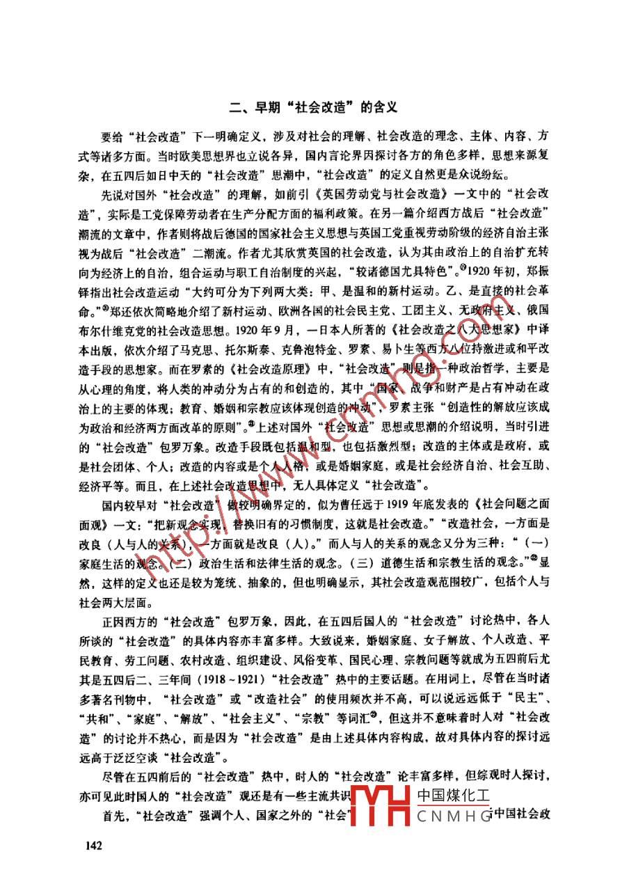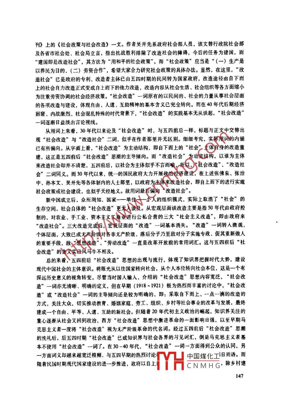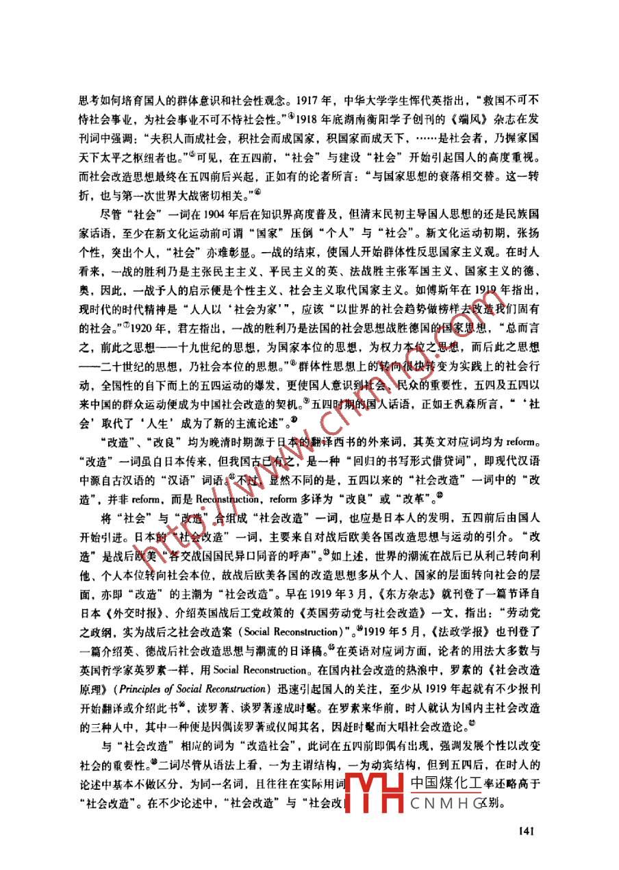 廣東社會科學2012年第4期“社會改造”與“改造社會”劉集林[提要]“社會改連”為五四前后(198-1921)出現的新詞匯。盡管五四前后的“社會改造論眾說紛紜,但將眼光從政治、個人層面轉向社會、集體層面,注重自下而上的緩進方式,以勞工平民為改造對象,致力于社會事業(yè),建設人道、互助的新社會,則是當時知識界的主流共識。隨著20年代初主義政治的興起,“社會改造”一度被馬克思主義者視為無產階級革命的專稱。后五四時期,“社會改造”已威常用詞匯,但詞又寬泛,范圍縮小,主流傾向已演變?yōu)樽陨隙碌摹案脑於艜?0年代后期又威為政府“社會政策”的代稱,已與早期的含義相去甚遠[關鍵詞]社會改逢改造社會杜會改葦社會政[中圖分類號]K257[文獻標識碼]A[文章編號]100-14x(2012)04-0140-10從社會思潮的角度來看,五四前后可以說是中國社會的一個“社會改造”的時代,到1920年時,國人紛紛撰文,認為社會改造的聲浪“日高一日”:“夫社會改造之聲浪,在今日新思潮中,已占全體十之七八?!薄案脑焐鐣暮袈?日高一日”。在五四前后的數百種新老刊物中,幾乎無不涉及到社會改造的話題,不少刊物還明確宣示刊物的宗旨就是“社會改造”。“社會改造逐漸成為知識界及社會各界的一個常用詞匯。但到底何謂“社會改造”?卻并不容易回答。實際上,五四時期國內各階層、各群體眾口一詞談論的“社會改造”,可謂五花八門乃至相互對立。在后五四時期,“社會改造”的詞義及運用也有明顯的變化??疾?949年以前“社會改造”詞的由來及詞義演變,可從一個側面體現現代中國社會思想變遷的重要方向。杜社會改造”與“改造社會”的由來社會改造”由“社會”與“改造”二詞合成,這二詞雖然我國古已有之,但就其所蘊的現代意義而言,均為晚清自日本輸入的外來詞。“社會”(sciy)一詞自戊戌前后傳入中國,1904年后在國內已“高度普及”,到五四前幾年更是成了“最時髦的口頭禪”。2用詞的普及使不中國煤化工設“社會的重要性。不少青年學子也開始認真反思近代西方傳eyHCNMH”的批評思考如何培育國人的群體意識和社會性觀念。1917年,中華大學學生惲代英指出,“救國不可不恃社會事業(yè),為社會事業(yè)不可不恃社會性?!雹?98年底湖南衡陽學子創(chuàng)刊的《端風》雜志在發(fā)刊詞中強調:“夫積人而成社會,積社會而成國家,積國家而成天下,……是杜會者,乃握家國天下太平之樞紐者也?!笨梢?在五四前,“社會”與建設“社會”開始引起國人的高度重視。而社會改造思想最終在五四前后興起,正如有的論者所言:“與國家思想的衰落相交替。這一轉折,也與第一次世界大戰(zhàn)密切相關。”°盡管“社會”一詞在1904年后在知識界高度普及,但清末民初主導國人思想的還是民族國家話語,至少在新文化運動前可謂“國家”壓倒“個人”與“社會”。新文化運動初期,張揚個性,突出個人,“社會”亦難彰顯。一戰(zhàn)的結束,使國人開始群體性反思國家主義觀。在時人看來,一戰(zhàn)的勝利乃是主張民主主義、平民主義的英、法戰(zhàn)勝主張軍國主義、國家主義的德、奧,因此,一戰(zhàn)予人的啟示便是個性主義、社會主義取代國家主義。如傅斯年在1919年指出,現時代的時代精神是“人人以‘社會為家”,應該“以世界的社會趨勢做榜樣去改造我們固有的社會?!?920年,君左指出,一戰(zhàn)的勝利乃是法國的社會思想戰(zhàn)勝德國的國家思想,“總而言之,前此之思想——十九世紀的思想,為國家本位的思想,為權力本位之思想,而后此之思想二十世紀的思想,乃社會本位的思想?!比后w性思想上的轉向很快轉變?yōu)閷嵺`上的社會行動,全國性的自下而上的五四運動的爆發(fā),更使國人意識到社會、民眾的重要性,五四及五四以來中國的群眾運動便成為中國社會改造的契機。五四時期的國人話語,正如王汎森所言,“‘社會’取代了‘人生’成為了新的主流論述“改造”、“改良”均為晚清時期源于日本的翻譯西書的外來詞,其英文對應詞均為reom“改造”一詞雖自日本傳來,但我國古已有之,是一種“回歸的書寫形式借貸詞”,即現代漢語中源自古漢語的“漢語”詞語。不過,顯然不同的是,五四以來的“社會改造”一詞中的“改造”,并非rorm,而是 Reconstruction, reform多譯為“改良”或“改革"。將“社會”與“改造”合組成“社會改造”一詞,也應是日本人的發(fā)明,五四前后由國人開始引進。日本的“社會改造”一詞,主要來自對戰(zhàn)后歐美各國改造思想與運動的引介?!案脑臁笔菓?zhàn)后歐美“各交戰(zhàn)國國民異口同音的呼聲”。如上述,世界的潮流在戰(zhàn)后已從利己轉向利他、個人本位轉向社會本位,故戰(zhàn)后歐美各國的改造思想多從個人、國家的層面轉向社會的層面,亦即“改造”的主潮為“社會改造”。早在1919年3月,《東方雜志》就刊登了一篇節(jié)譯自日本《外交時報》、介紹英國戰(zhàn)后工黨政策的《英國勞動黨與社會改造》一文,指出:“勞動黨之政綱,實為戰(zhàn)后之社會改造案( Social Reconstruction)"。1919年5月,《法政學報》也刊登了篇介紹英、德戰(zhàn)后社會改造思想與潮流的日譯稿?!霸谟⒄Z對應詞方面,論者的用法大多數與英國哲學家英羅素一樣,用 Social Reconstruction。在國內社會改造的熱浪中,羅素的《社會改造原理》( Princip