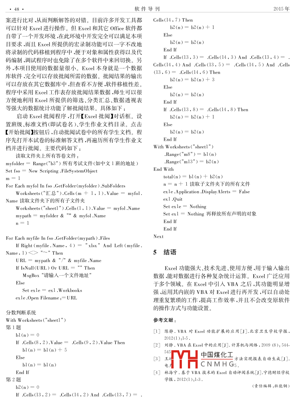 第14卷第42015年4月Software guideApr.2015VBA在Exce中的應(yīng)用朱儉,馬敬賢2,宋玉3,廖志融(1.中國青年政治學(xué)院計算機(jī)教學(xué)及應(yīng)用中心;2中國青年政治學(xué)院社工學(xué)院中國青年政治學(xué)院經(jīng)管學(xué)院,北京100089)摘要: Excel是微軟公司 Office集成辦公軟件重要組件之一,應(yīng)用廣泛。在Exel中引入ⅤBA,運用其內(nèi)嵌的ⅤBA對 Excel進(jìn)行再開發(fā),不僅可以提高工作效率,自動處理重復(fù)繁瑣的工作,并且不會改變原軟件的操作方式與功能,介紹了ⅤBA在 Excel中的開發(fā)優(yōu)勢、開發(fā)環(huán)境、開發(fā)過程及應(yīng)用領(lǐng)域。關(guān)鍵詞: Excel-VBA; Excel開發(fā);VBA應(yīng)用DOI:10.11907/rjdk1431087中圖分類號:TP301文獻(xiàn)標(biāo)識碼:A文章編號:1672-7800(2015)004-0046-03Excel在財務(wù)處理中廣泛應(yīng)用,其人性化的功能設(shè)計與靈0引言活的操作填補(bǔ)了普通會計軟件的不足。然而,Excl也有其自身缺點:由于每個操作都要人工完成,對于重復(fù)性財務(wù)軟件的應(yīng)用顯著提高了工作效率,大大減輕了財?shù)墓ぷ?難免會造成繁重的工作與冗余務(wù)人員的工作強(qiáng)度,這得益于財務(wù)軟件實現(xiàn)了數(shù)據(jù)錄入利用ⅤBA對 Excel進(jìn)行二次開發(fā),即將重復(fù)操作編處理與輸出一體化。然而,在詳細(xì)處理數(shù)據(jù)方面,財務(wù)軟程運行,可以有效避免多次人為操作帶來的失誤,顯著提件的部分功能與當(dāng)下的管理工作要求依舊脫節(jié)。基于此,高工作效率與質(zhì)量用戶所接受。兩款殺毒軟件使用情況對比如表3所示。特定需求是否能得到解決。其中,用戶體驗需要首先考表3卡巴斯基和奇虎360使用對比慮,簡潔的使用界面、無歧義的文字解釋,以及可靠的設(shè)置對比內(nèi)容卡巴斯基奇虎360與運行就是優(yōu)秀的企業(yè)殺毒軟件必備特征之一。就殺毒占用電腦資源多強(qiáng)強(qiáng)防護(hù)功能而言,卡巴斯基相對較強(qiáng),但是在設(shè)置和使用上殺毒能力比卡巴斯基弱實時監(jiān)控比卡巴斯基弱較為復(fù)雜,功能單一,占用大量計算機(jī)硬件性能,讓用戶無殺毒準(zhǔn)確度比卡巴斯基誤判率高法接受。奇虎360雖然很注重用戶體驗,涵蓋一些適用于用戶體驗不易上手較為順手企業(yè)內(nèi)部需求的附屬功能,讓信息人員及員工用戶愛不釋推送軟件手,但是強(qiáng)制推送、默認(rèn)安裝、捆綁安裝等霸道行為也著實捆綁軟件捆綁360軟件管家統(tǒng)一部署能力令用戶難以接受。因此,企業(yè)需結(jié)合自身實際,綜合考慮遠(yuǎn)程桌面無選擇合適的殺毒軟件,最大程度地保障企業(yè)信息安全,更硬件臺帳有有好地促進(jìn)企業(yè)發(fā)展統(tǒng)一發(fā)布信息平臺殺毒策略定制精細(xì)精細(xì)度不如卡巴斯基參考文獻(xiàn)歷史報表有有[1]金燁.產(chǎn)品與服務(wù)并重[N].中國計算機(jī)用戶,2009-10-23系統(tǒng)修復(fù)有[2]胡斌昀,企業(yè)防毒軟件發(fā)展趨勢分析[J].中山大學(xué)學(xué)報:自然科學(xué)包腦清理版,204,43(6):142-144優(yōu)化加速無有[3]扶蘇抓住要點,兩招搞定中小企業(yè)信息安全[N].電腦報,2014軟件管理有中國煤化工[4]董CNMHG即產(chǎn)品到安全即服務(wù)[N].中結(jié)合上述實踐,得出選擇殺毒軟件需重點考慮如下方國面:①用戶體驗;②計算機(jī)硬件性能優(yōu)劣;③殺毒能力,漏[5]劉宏偉,企業(yè)殺毒需變招[N]計算機(jī)世界,2008-12-22洞掃描④管理、安裝方式,體系架構(gòu);⑤企業(yè)注重的一些(責(zé)任編輯:孫娟)作者簡介:朱儉(1981—),男,江蘇徐州人,博士,中囯青年政治學(xué)院計算機(jī)教學(xué)與應(yīng)用中心講師,硏究方向為自然語言理解、搜索技術(shù)。儉,馬敬賢,宋玉,等:VBA在Excl中的應(yīng)用47·利于數(shù)據(jù)的溝通與交流。同時,VBA簡單的操作方法容1VBA應(yīng)用易掌握,利于推廣普及。如果利用其它程序編寫語言,通常都需要搭建好基本的功能操作例如數(shù)據(jù)的導(dǎo)入、處理與11VBA介紹導(dǎo)出等,而以 Excel為載體的ⅤBA開發(fā),則因為Exce本VBA全稱 Visual Basic For Applications,是Ⅴ isual身已經(jīng)具備的基本操作,大大節(jié)省了開發(fā)時間,提高了工Basic的一部分,是在某些應(yīng)用程序中內(nèi)置的編程語言。作效率與Ⅴ isual Basic不同的是,VBA需要一個應(yīng)用程序作為載體才能運行,而VB則可以創(chuàng)建獨立的應(yīng)用程序。VBA3 Excel-VBA開發(fā)通過自定義程序,將宿主應(yīng)用程序的某些操作自動化,為解決重復(fù)操作問題提供了一個良好方案。3.1開發(fā)環(huán)境1. 2 Excel vBA在 Office按鈕中,選擇 Excel選項,在常用選項下選般來說,VBA是內(nèi)嵌在 Office中,增強(qiáng) Office軟件中“在功能中顯示·開發(fā)工具’選項卡”,或者按快捷鍵Alt使用功能的程序語言。如今,VBA應(yīng)用已經(jīng)逐步涉及到F11即可進(jìn)入。Word(WordBasic), Excel( ExcelBasic) Access(AccessBa安全性設(shè)置:在信任中心中,選擇信任中心設(shè)置,啟用sic)和 Power Point( Power Point basic),并且在ouok中所有宏。也開發(fā)了 Visual Basic Scripting Edition語言,這些語言統(tǒng)32BE應(yīng)用稱為Ⅴ 3 for A pplication進(jìn)入ⅤBE編輯器后,就能編寫有關(guān)低界面后程序。利用ⅤBA在 Excel中編寫相應(yīng)的語言,可創(chuàng)建數(shù)據(jù)VBE編輯器主要包括以下內(nèi)容:①