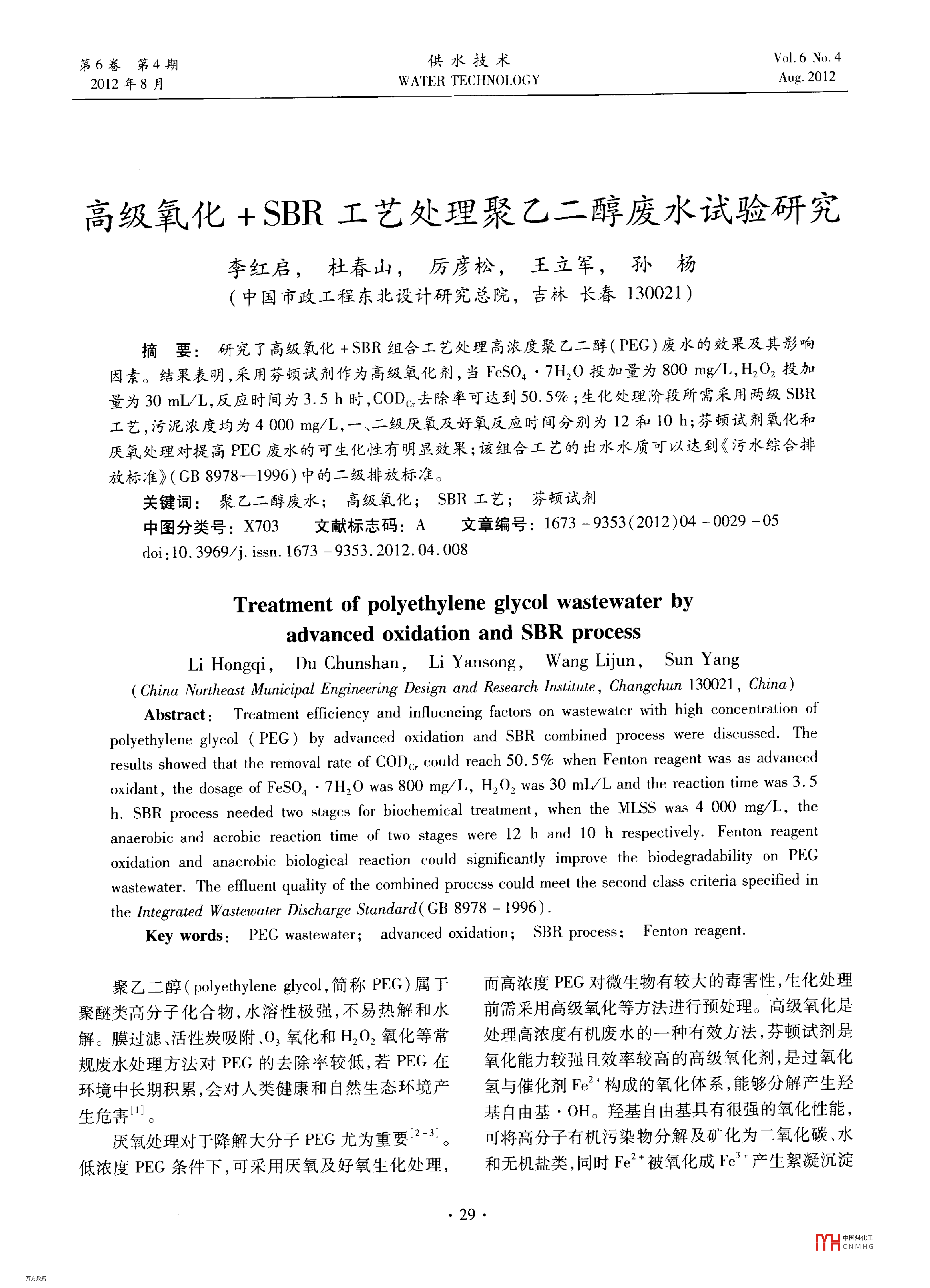 高級(jí)氧化+SBR工藝處理聚乙二醇廢水試驗(yàn)研究 高級(jí)氧化+SBR工藝處理聚乙二醇廢水試驗(yàn)研究