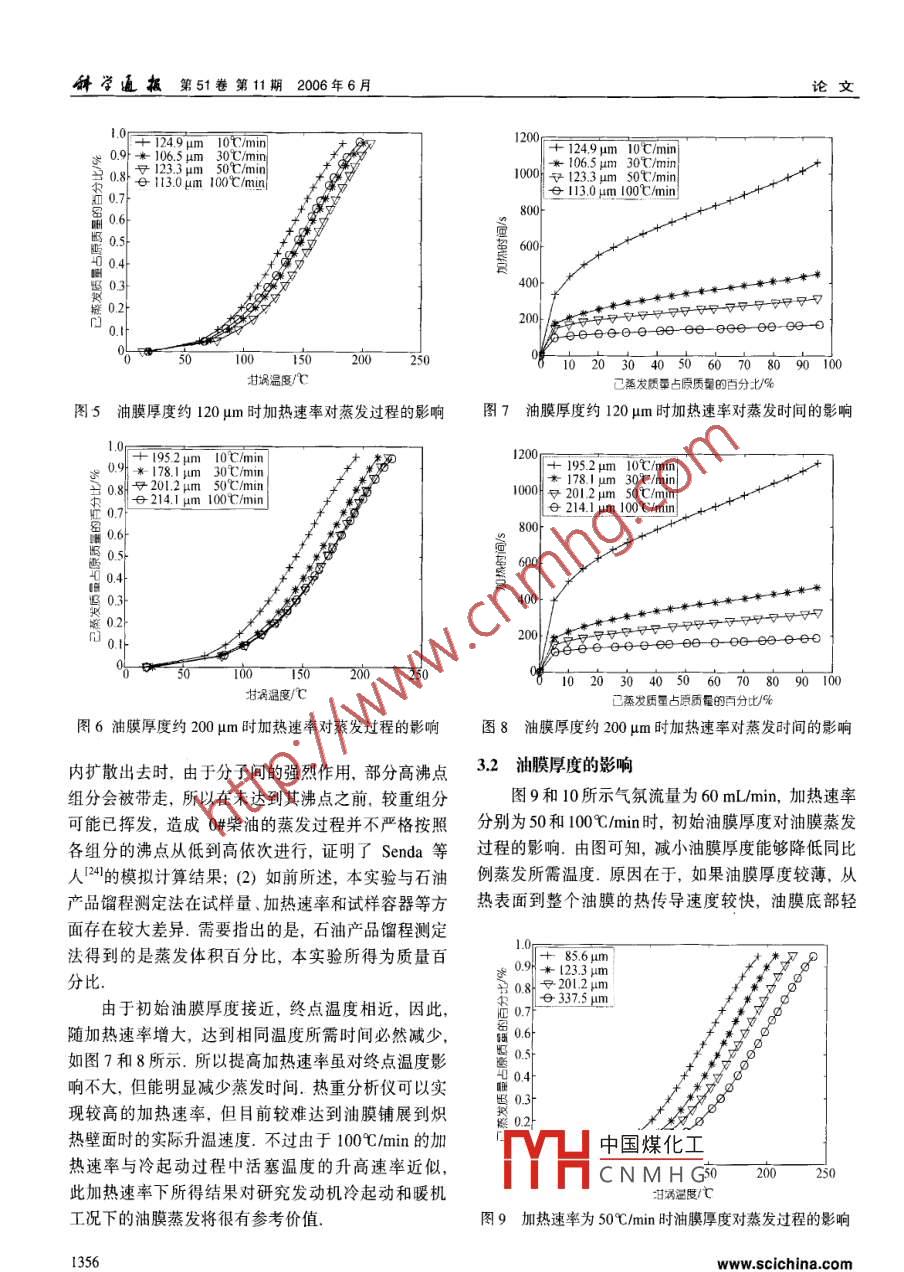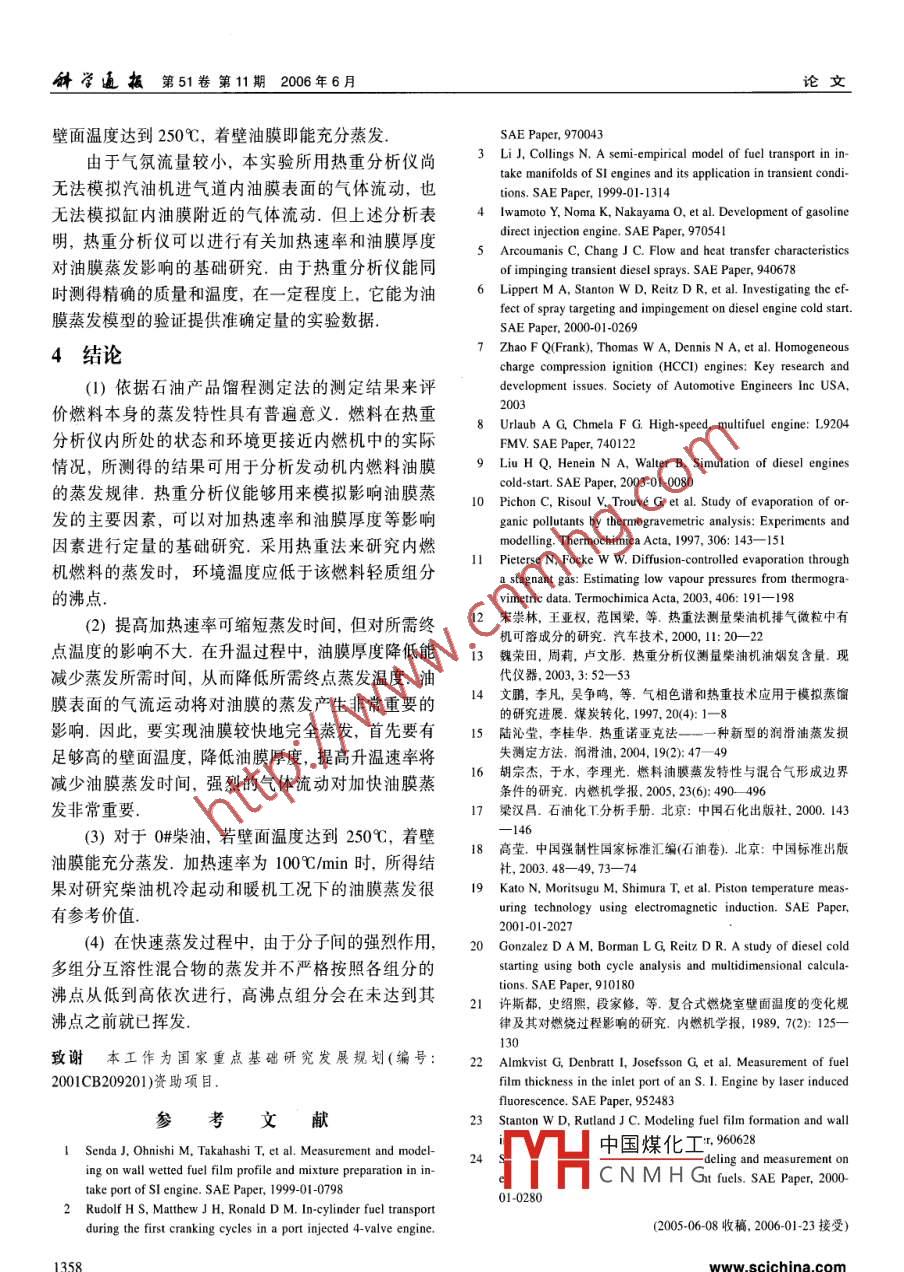 第51卷第11期2006年6月學(xué)通扳燃料油膜蒸發(fā)的熱重分析法硏究胡宗杰①李理光于水①①上海交通大學(xué)動力機(jī)械與工程教育部重點(diǎn)實驗室,上海2000②同濟(jì)大學(xué)汽車學(xué)院,上海201804E-mail:zongjie-hu@sjtu.edu.cn)摘要為深入理解不同壁面溫度下的燃料油膜蒸發(fā)特性,對熱重分析法和石油產(chǎn)品餾程測定法進(jìn)行了比較.采用熱重分析法在不同氣氛流量和不同升溫速率下,研究了不同初始厚度的90#汽油、93#汽油和O排#柴油油膜的蒸發(fā)特性,分析了加熱速率、油膜厚度和氣氛流量等對油膜蒸發(fā)的影響.結(jié)果表明,燃料在熱重分析儀中所處的狀態(tài)和環(huán)境接近內(nèi)燃機(jī)中油膜的實際情況,所得結(jié)果可用于分析發(fā)動機(jī)內(nèi)燃料油膜的蒸發(fā)規(guī)律;熱重分析儀能用來模擬影響油膜蒸發(fā)的主要因素,可以對加熱速率和油膜厚度等影喲因素進(jìn)行定量的基礎(chǔ)研究;要實現(xiàn)油膜較快地完全蒸發(fā),首先要有足夠高的壁面溫度;提高升溫速率和減小油膜厚度將縮短油膜蒸發(fā)時間;強(qiáng)烈的氣流運(yùn)動對加快油膜蒸發(fā)非常重要.加熱速率為100℃/min時所得的結(jié)果,對研究柴油機(jī)冷起動和暖機(jī)工況下的油膜蒸發(fā)很有參考價值;在快速蒸發(fā)過程中,分子間強(qiáng)烈的相互作用使多組分互溶性混合物的蒸發(fā)并不嚴(yán)格按照各組分的沸點(diǎn)從低到高依次進(jìn)行,高沸點(diǎn)組分會在未達(dá)到其沸點(diǎn)之前就已禪發(fā);對0辯柴油,若壁面溫度達(dá)到250℃,著壁油膜即能充分蒸發(fā)關(guān)鍵詞熱重分析法油膜蒸發(fā)壁面溫度由于油束或混合氣與壁面的相互作用,通常內(nèi)優(yōu)點(diǎn).然而,均質(zhì)壓燃發(fā)動機(jī)對混合氣的均質(zhì)程度要燃機(jī)里都存在壁面燃料油膜.對于進(jìn)氣道噴射汽油求較高,釆用液體燃料時,如何制備均質(zhì)混合氣和減機(jī),油束會撞擊進(jìn)氣道壁面和進(jìn)氣閥背面形成油少濕壁是主要難點(diǎn)之一膜口2,造成進(jìn)入缸內(nèi)的混合氣不均勻,燃油輸運(yùn)滯多數(shù)情況下,設(shè)計人員盡量減少燃油碰壁的發(fā)后和空燃比的瞬態(tài)漂移等例.研究證明液態(tài)油膜的存生,也有學(xué)者嘗試?yán)糜褪霰诂F(xiàn)象來改善燃油分在是造成進(jìn)氣道噴射汽油機(jī)未燃碳?xì)渑欧诺闹匾技芭c空氣的混合無論采取何種技術(shù)路線,都需因之一,在冷起動和暖機(jī)工況下,油膜對有害排放的要深入研究燃料油膜蒸發(fā)的規(guī)律和特性.如前所述影響將更加突出2.與進(jìn)氣道噴射汽油機(jī)相比,直進(jìn)氣道、進(jìn)氣閥、活塞頂和缸套等表面都可能出現(xiàn)油噴汽油杋可提高約10%的轉(zhuǎn)矩并降低約20%的油耗,膜,而不同濕壁位置的壁面溫度相差甚大,油膜表面但直噴汽油機(jī)將產(chǎn)生更多的總碳?xì)浜皖w粒物排放.的氣流擾動各不相同,且壁面溫度和氣流擾動隨時研究表明,在推遲噴射模式下運(yùn)行時,活塞頂上存在間變化明顯.因此,內(nèi)燃機(jī)內(nèi)燃料油膜的蒸發(fā)環(huán)境復(fù)油膜是總碳?xì)渑欧鸥叩闹饕?排氣閥下方缸套雜多變,對其進(jìn)行模擬實驗研究是非常困難的.根據(jù)和活塞頂上的油膜將成為提前噴射模式下總碳?xì)渑艧釋W(xué)原理,建立油膜蒸發(fā)的數(shù)學(xué)模型是人們分析燃放高的主要原因;油膜的存在也被認(rèn)為是顆粒物排料油膜蒸發(fā)規(guī)律和特性的有效途徑之一,但模型驗放增加的主要原因.對小缸徑直噴柴油機(jī),油束碰證往往缺乏直接可靠的實驗數(shù)據(jù).在中央噴射和進(jìn)壁是常見現(xiàn)象,在燃燒室表面,尤其在活塞頂凹坑內(nèi),氣道噴射汽油機(jī)中,廣泛采用τⅩ經(jīng)驗?zāi)P蛠砻枋鋈己苋菀仔纬捎湍?當(dāng)負(fù)荷提高、供油量增加時,油束油分布,其中τ與油膜蒸發(fā)有關(guān),對每種型號的產(chǎn)品碰壁現(xiàn)象更是不可避免.而研究表明缸內(nèi)油膜是未發(fā)動機(jī),τ值都需按發(fā)動機(jī)轉(zhuǎn)速和冷卻水溫度進(jìn)行標(biāo)燃碳?xì)浜吞紵煹闹匾獊碓?在冷起動工況下,缸內(nèi)定積聚的液態(tài)燃油被認(rèn)為是造成白煙的主要原因.均中國煤化工續(xù)的質(zhì)量時間曲線質(zhì)壓燃燃燒可以同時降低氮氧化合物和顆粒物排放,溫度CNMHG人員已經(jīng)嘗試采用并提高發(fā)動機(jī)的熱效率,還具有燃燒多種燃料的能熱重分析法來確定易揮發(fā)物質(zhì)的蒸氣壓,并顯示出力,在一定程度上,它綜合了傳統(tǒng)汽油機(jī)和柴油機(jī)的這種方法的優(yōu)越性.熱重分析法也被用來測量顆www.scichina.com1353通報第51卷第11期月2006年6月論文粒物排放中可溶性有機(jī)物的比例12,測量柴油機(jī)潤氮?dú)饩芊Q更滑油中的碳煙含量13熱重分析法的原理還被用來模擬燃油、原油和煤液化產(chǎn)品的蒸餾過程4.采用熱重分析法原理的熱重諾亞克法已顯示出其在測定潤滑油蒸發(fā)損失應(yīng)用中的優(yōu)勢.作者曾嘗試采用熱重分析法來分析燃料油膜的蒸發(fā)特性6,本文采用ooooo該方法對內(nèi)燃機(jī)內(nèi)的燃料油膜蒸發(fā)開展進(jìn)一步研究,熱電偶1熱重分析法與石油產(chǎn)品餾程測定法比較燃料通常,依據(jù)其蒸餾溫度值分析內(nèi)燃機(jī)內(nèi)燃料的蒸發(fā)情況。根據(jù)國家